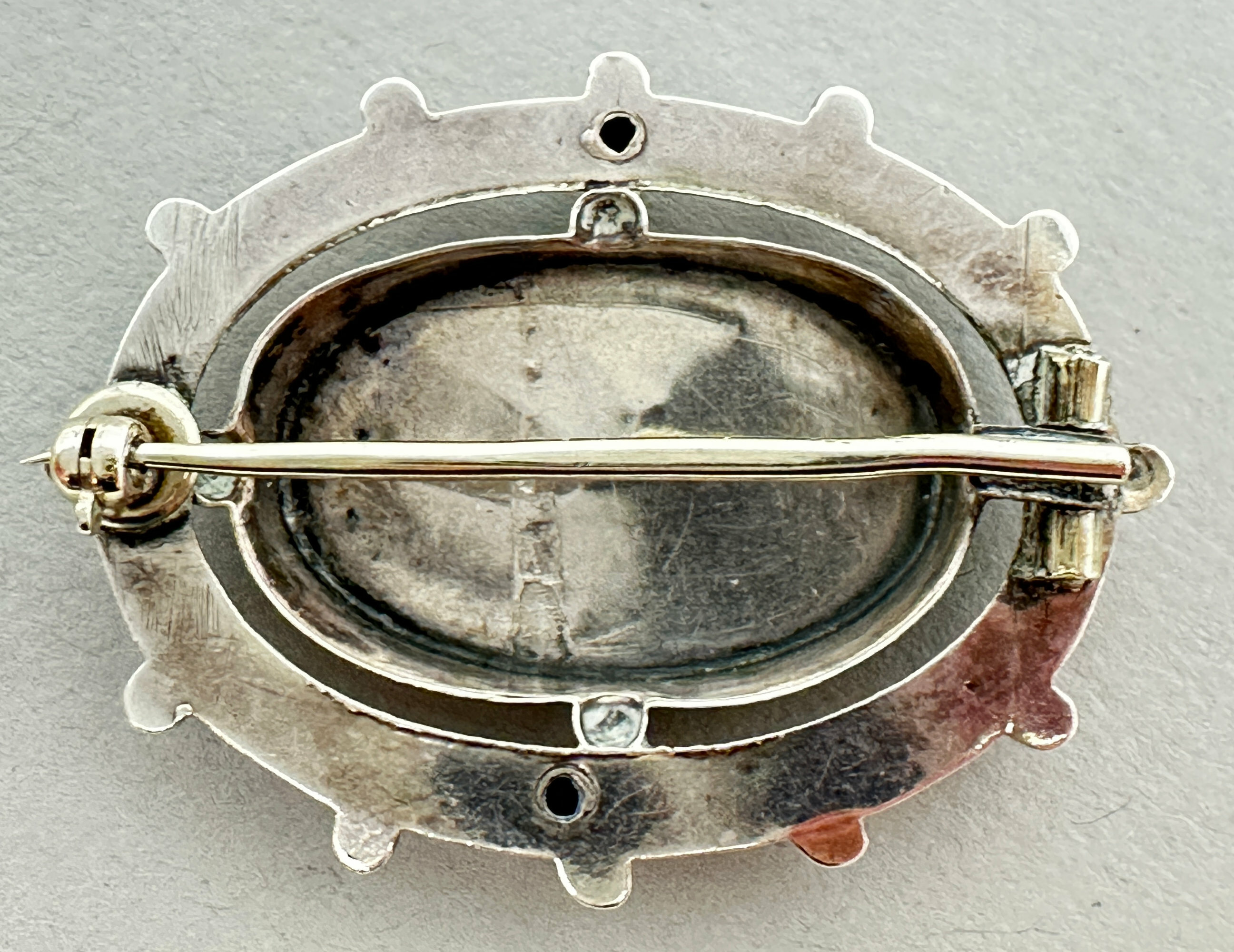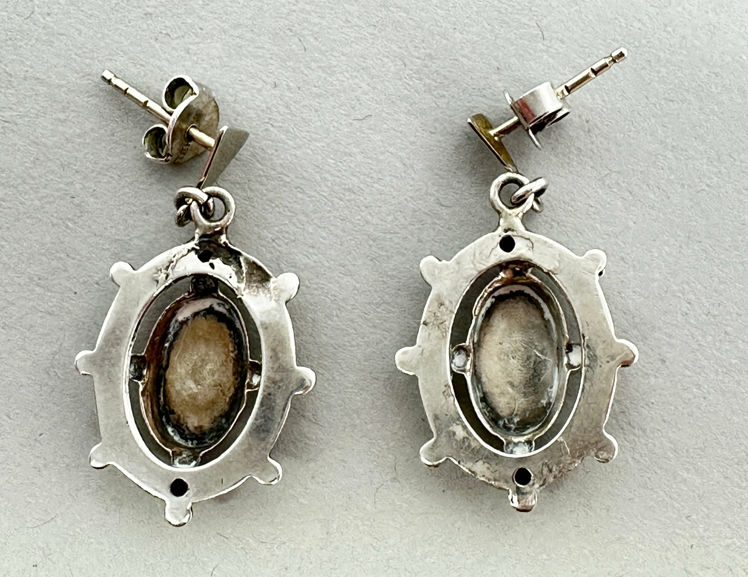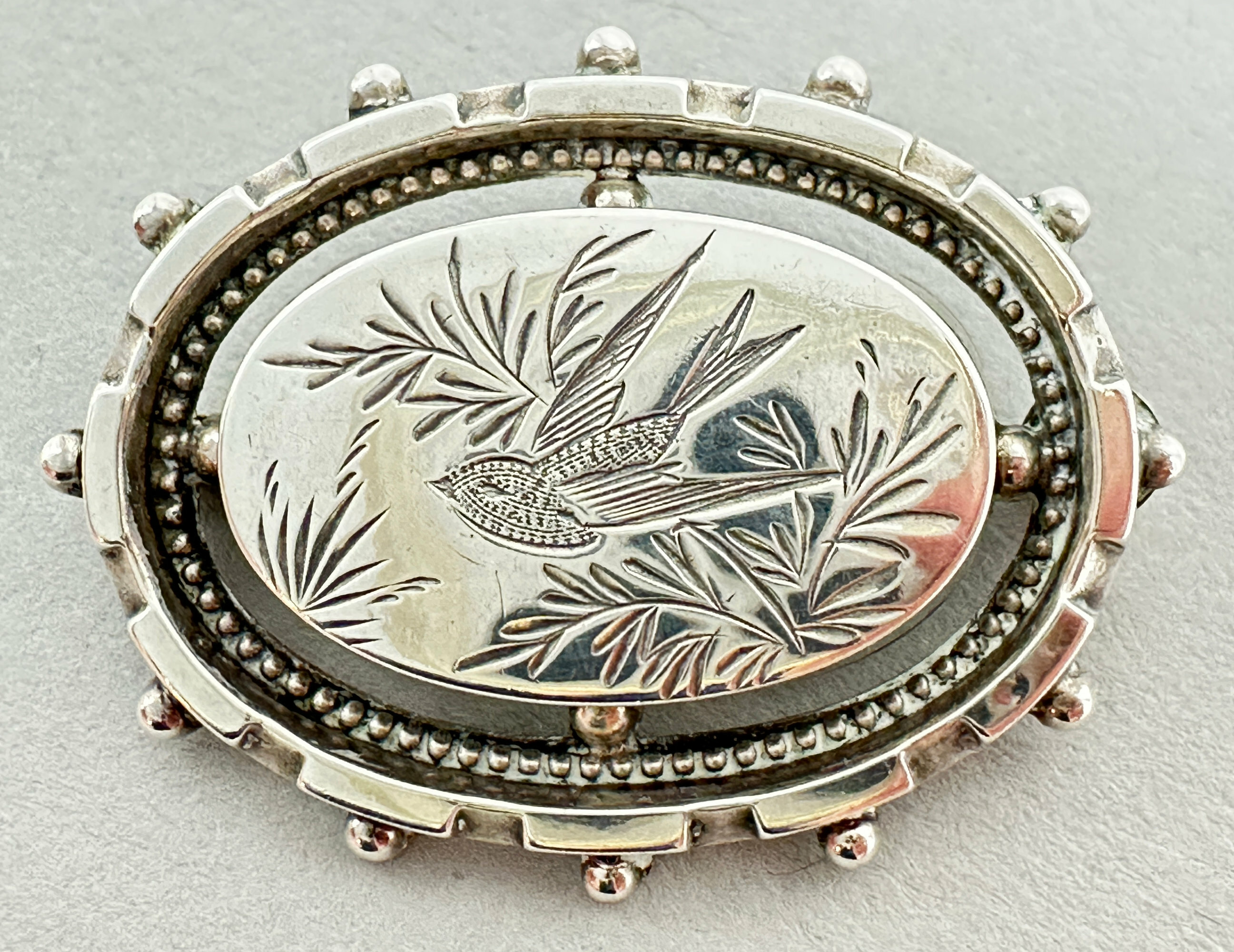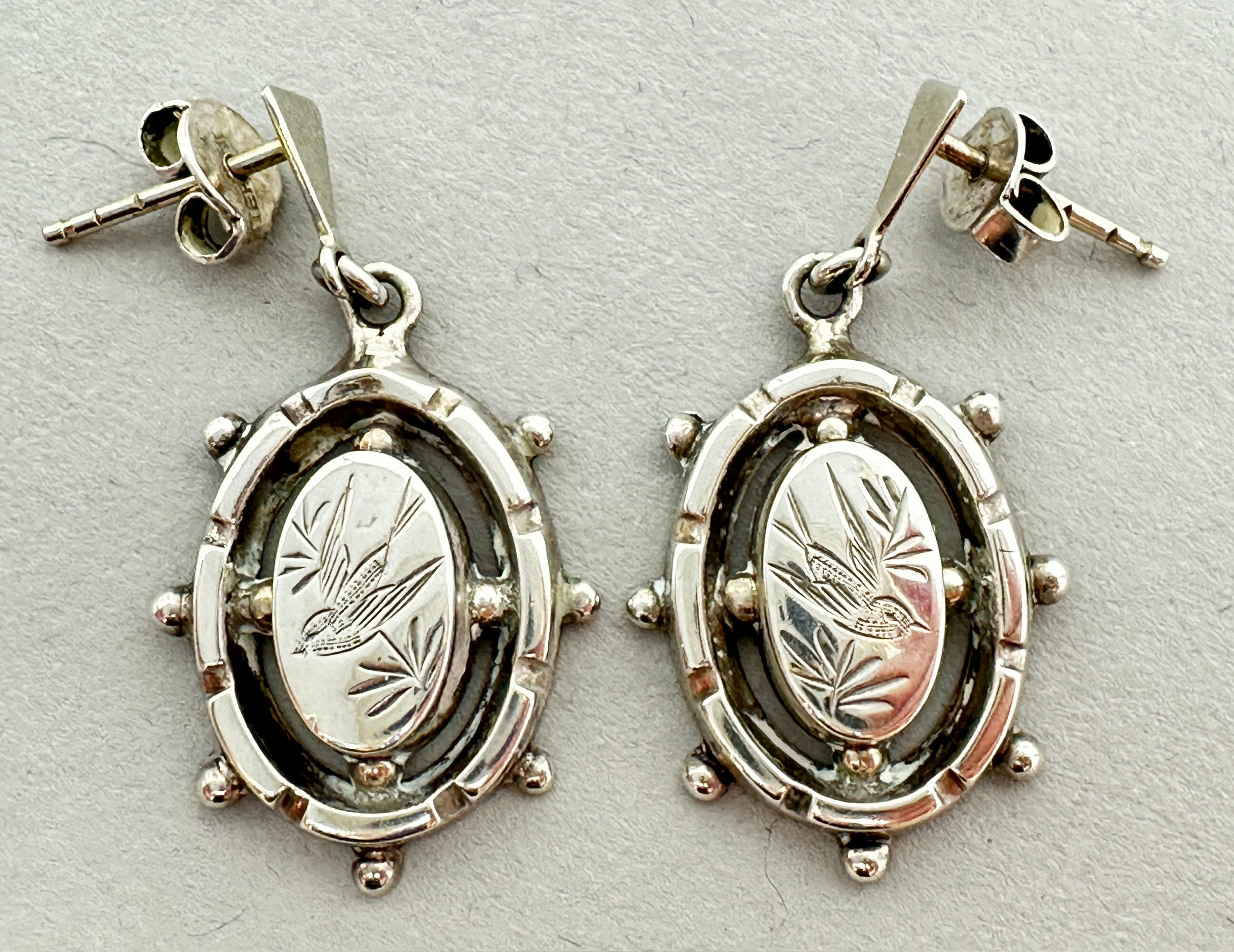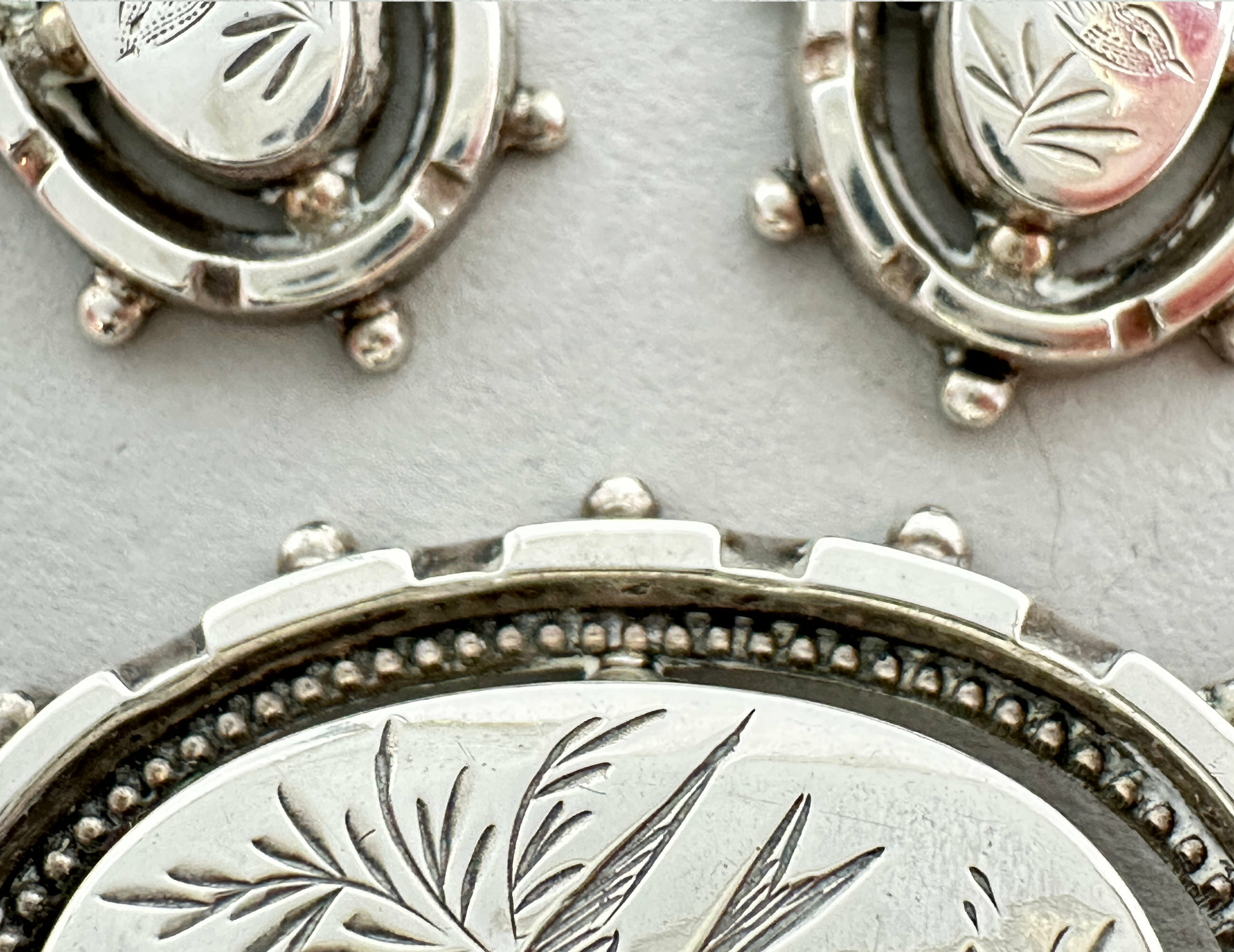 This is a very rare set of a silver brooch and earrings that reflect Aesthetic Movement design, the stylistic revolution of the late 19th century which promoted decorative designs over more utilitarian or mass produced objects. One of the key elements was the influence of Japan which can be seen very clearly in the decoration of this set with its oriental inspired central design of birds and flowers. The earrings have post and butterfly fittings and the pieces are not marked.| Size: | Brooch 35 x 26 mm, Earrings 23 x 15 mm |
