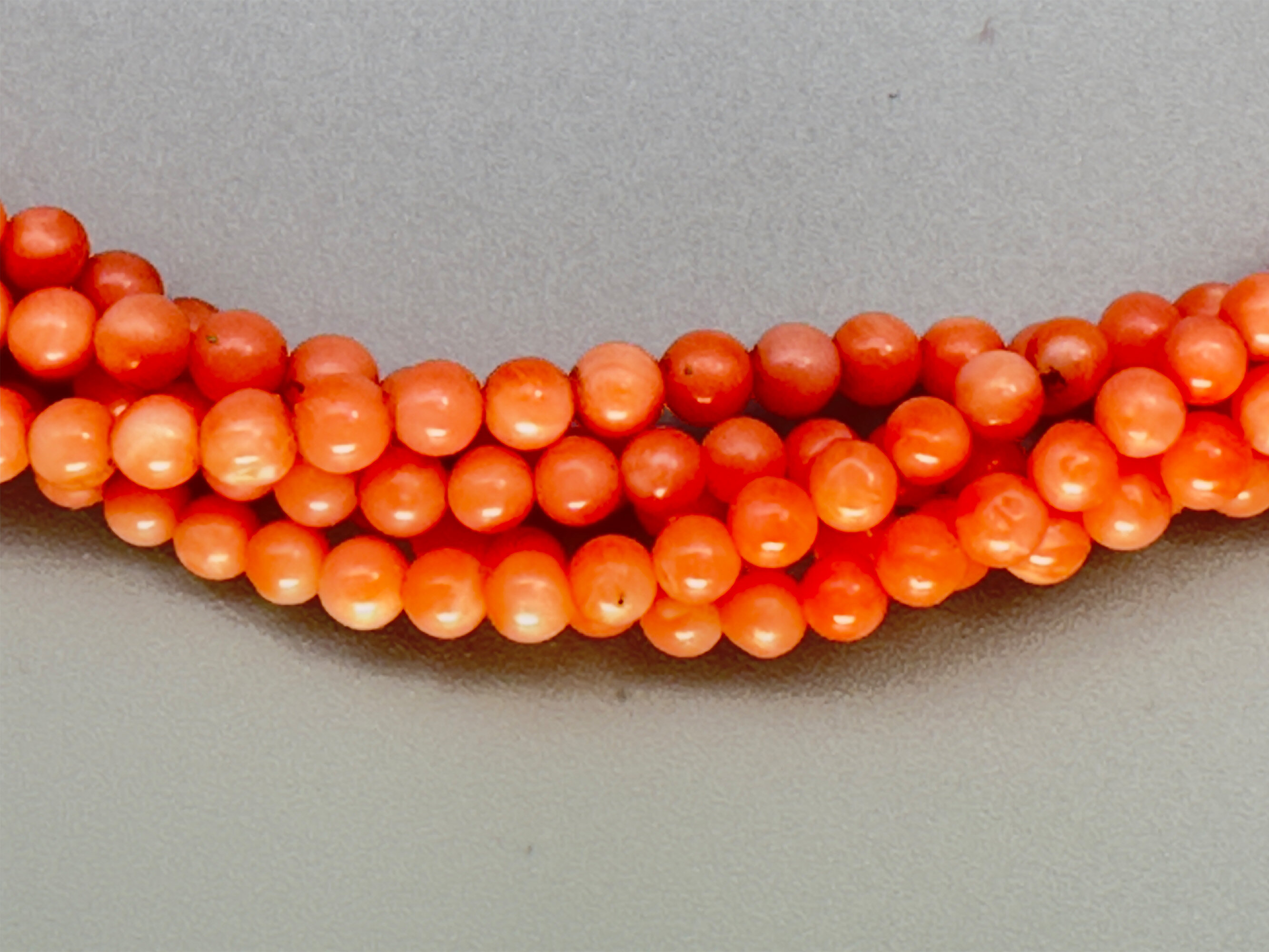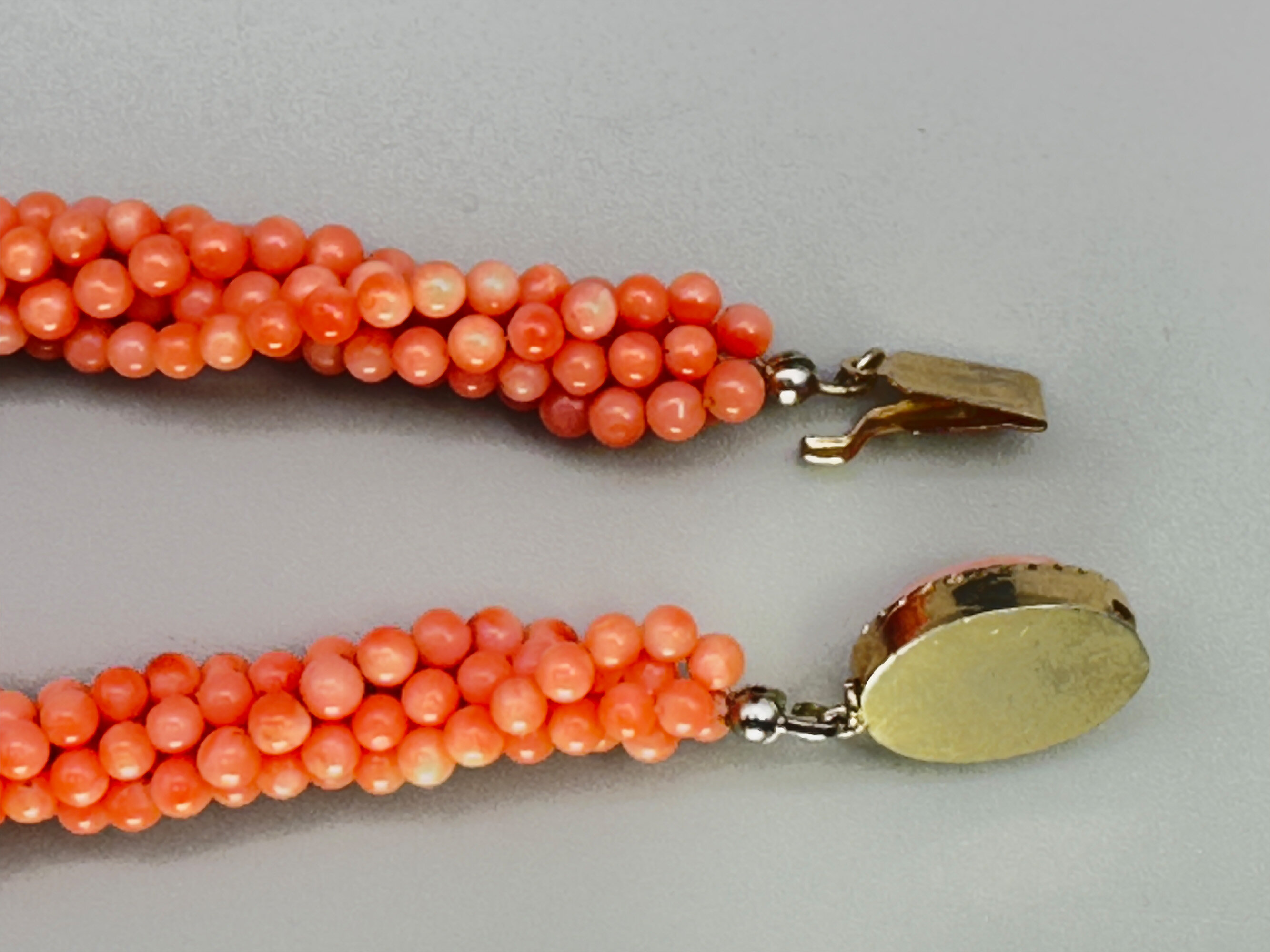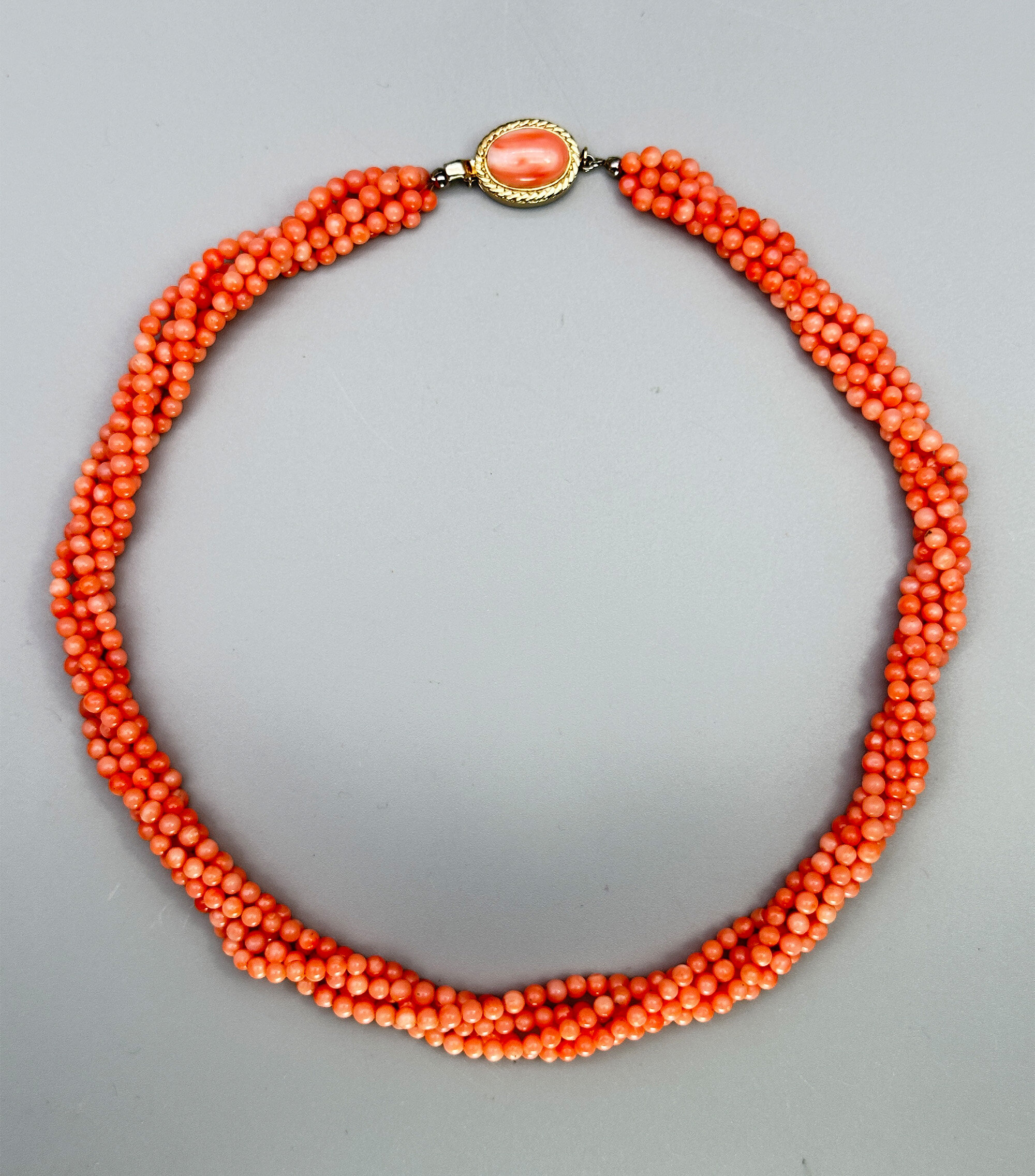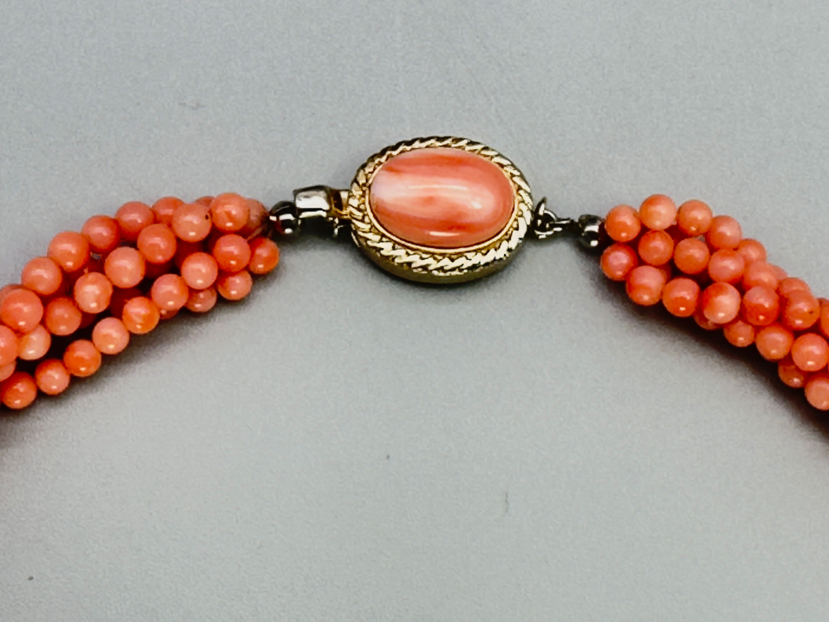 This is quite an unusual necklace comprising five strands of small coral beads that are twisted together. It has a matching clasp that is set with a coral stone. The beads are angel skin coral which comes from mainly Japan and Taiwan. The clasp is gold tone. The beads are most likely colour enhanced due to the uniformity. This is very common but it does effect the value somewhat.| Size: | Beads are 3.6 mm, Length is 44 cm |