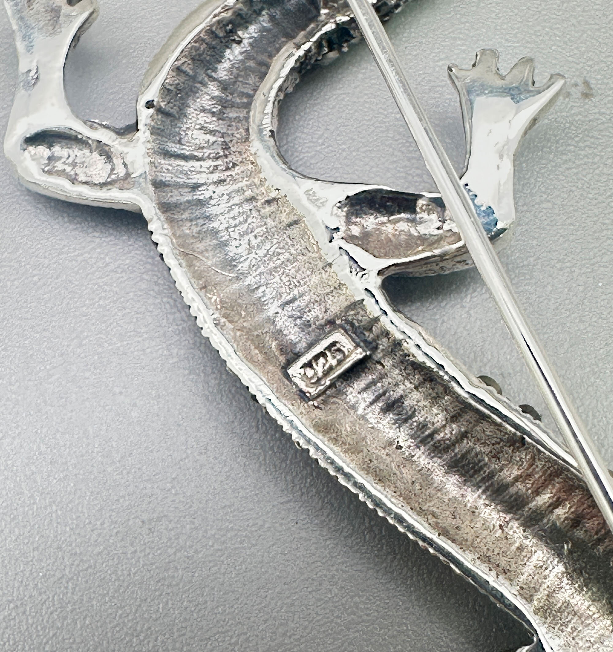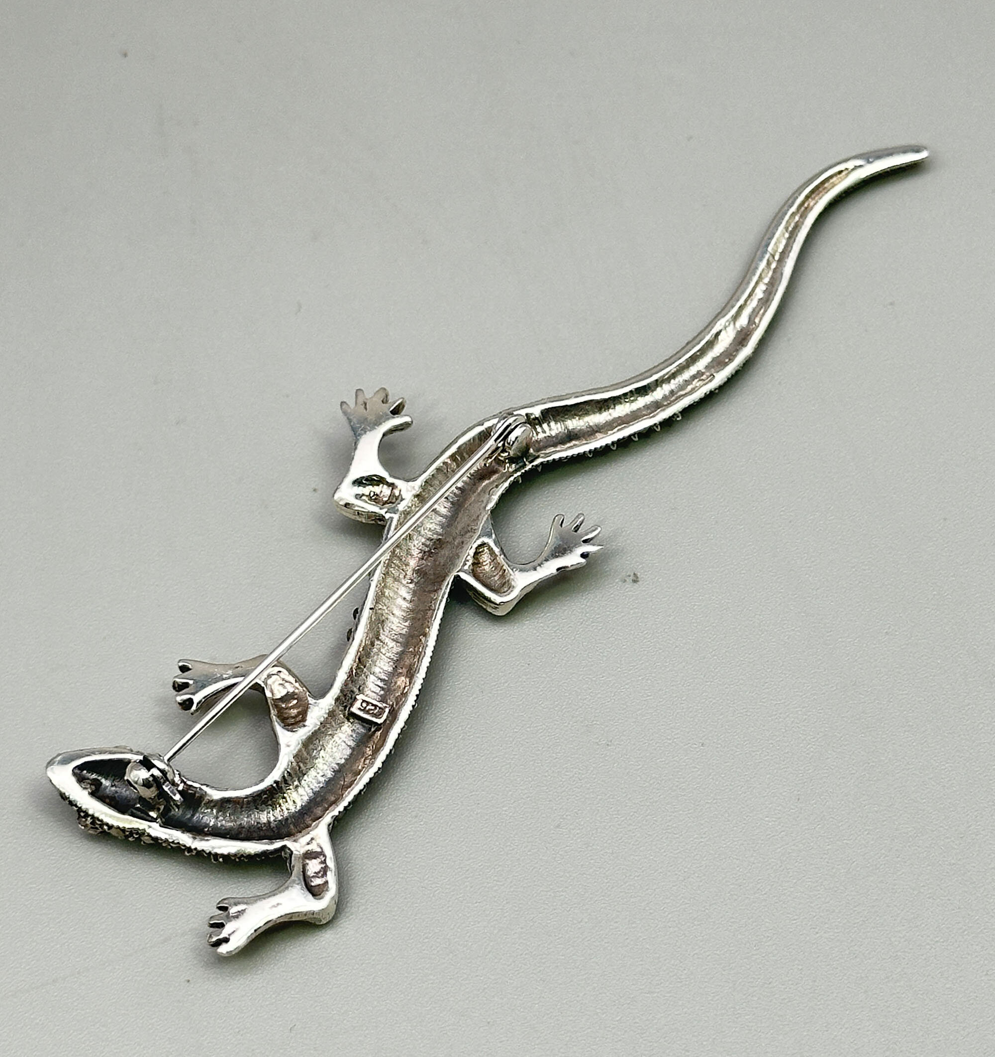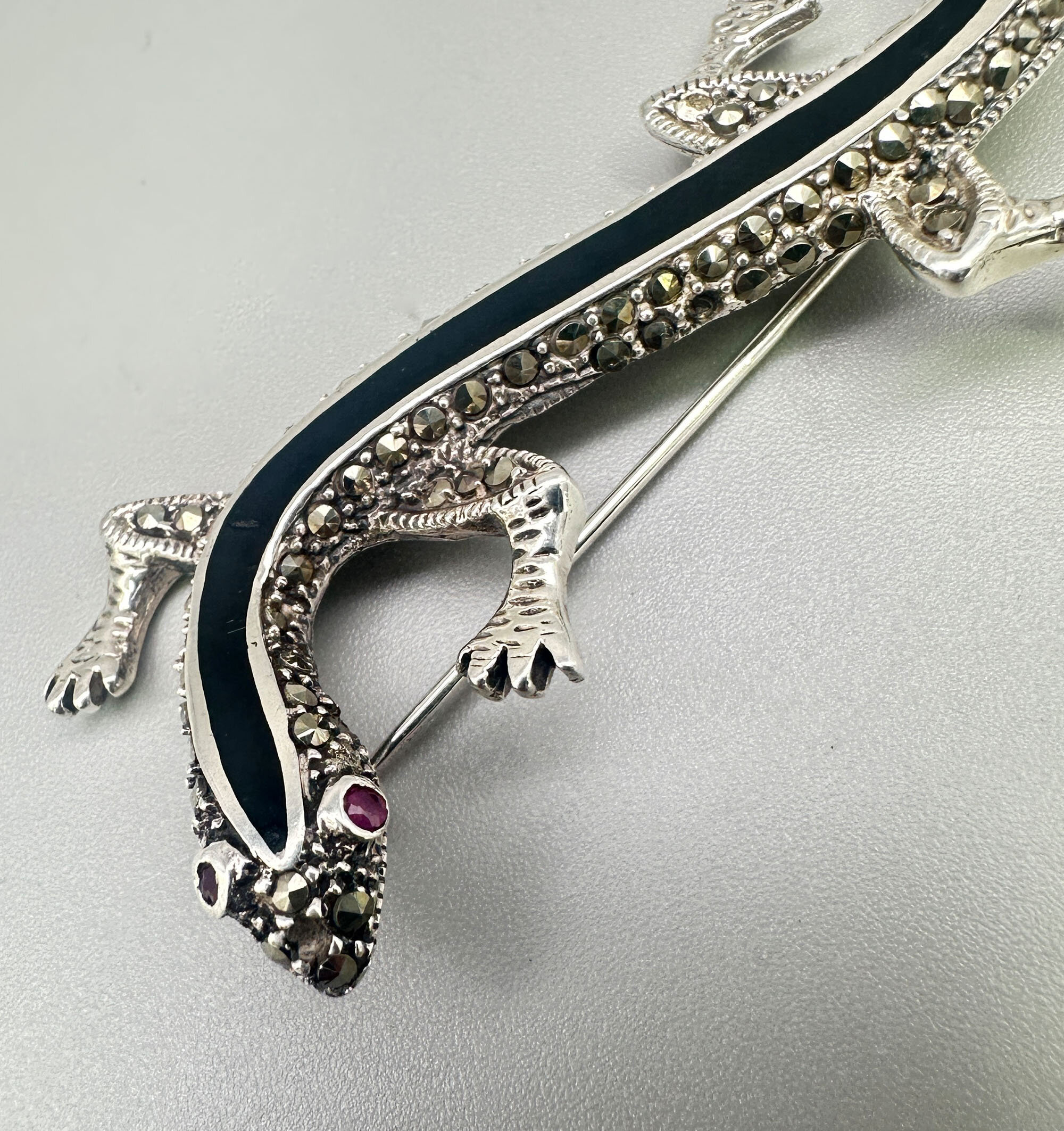 This is a striking large brooch that is in the shape of a crawling lizard. It is encrusted with marcasite stones and has a black enamel back. The eyes are rubies. It is marked 925.| Size: | 109 x 29.3 mm |
