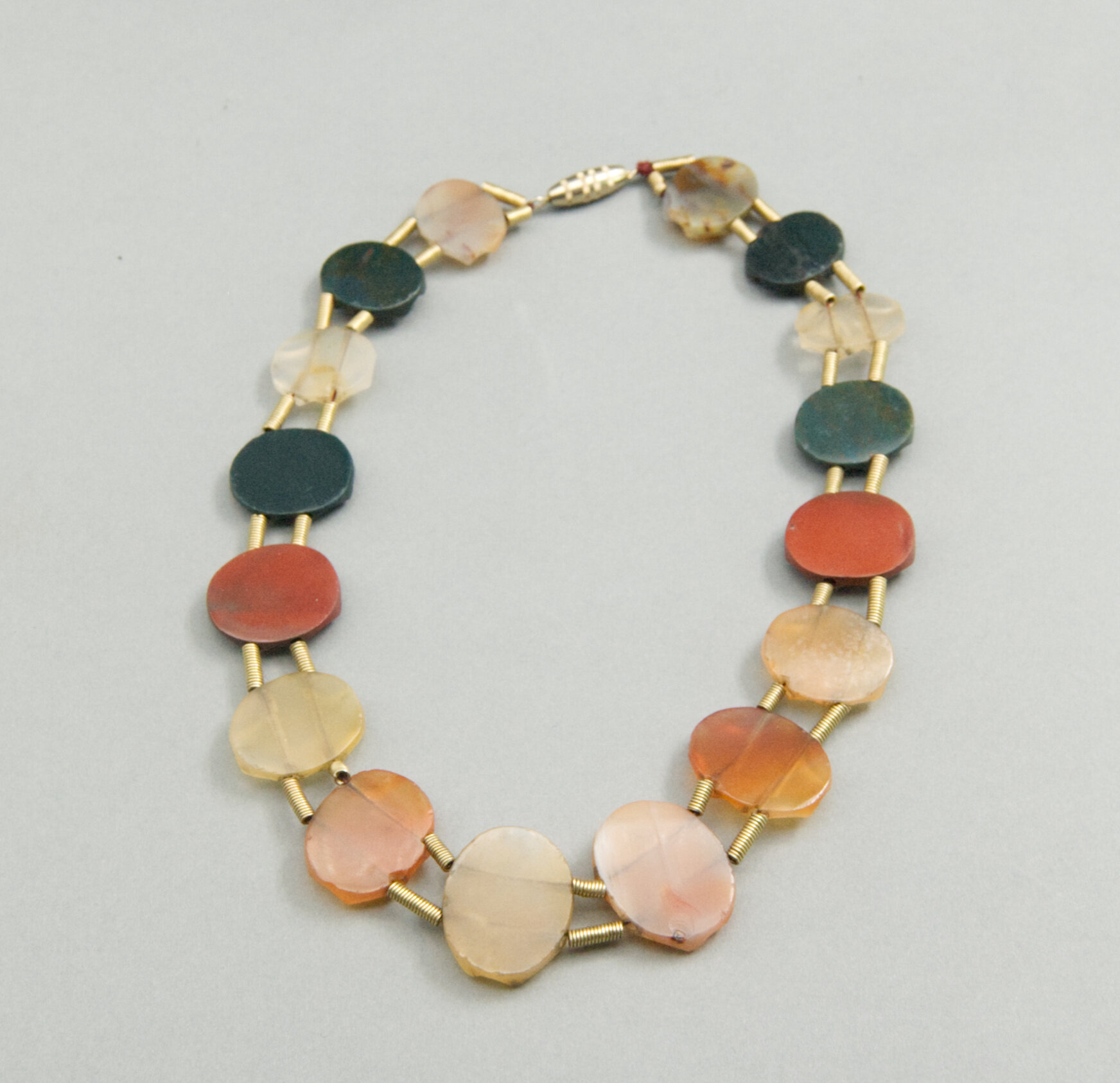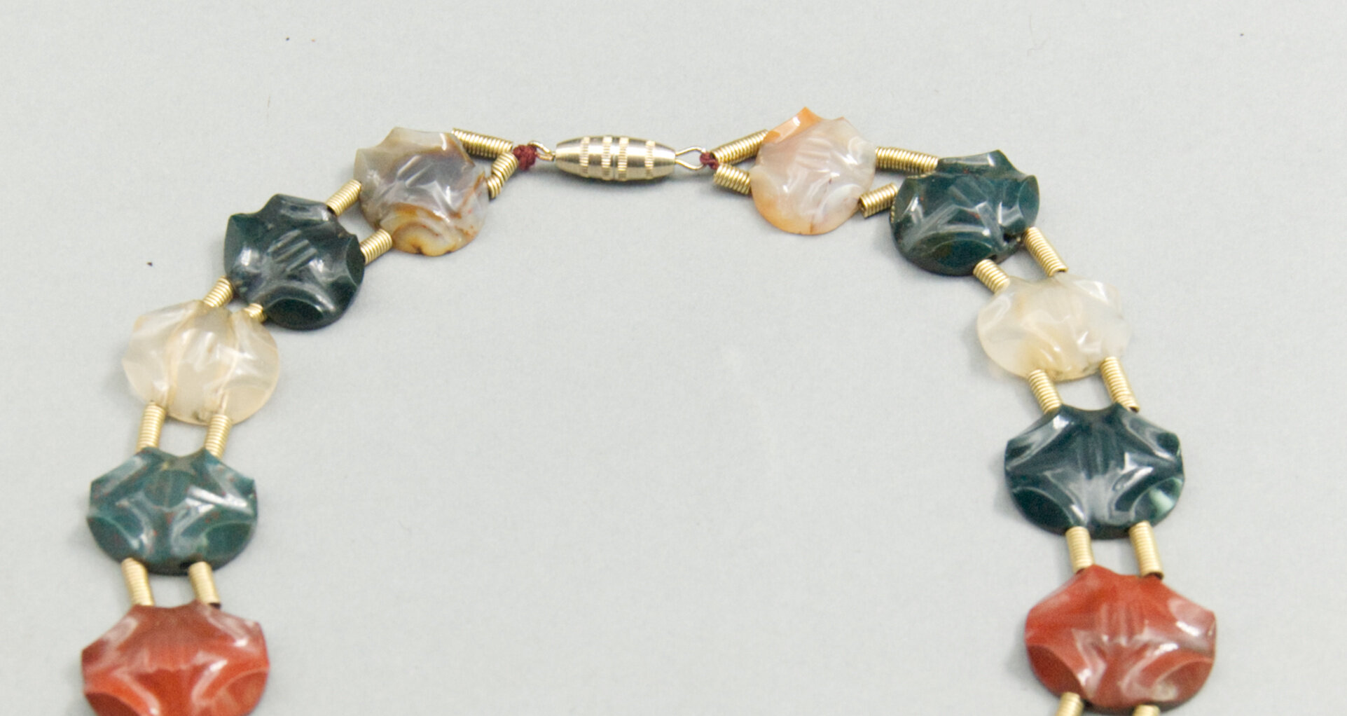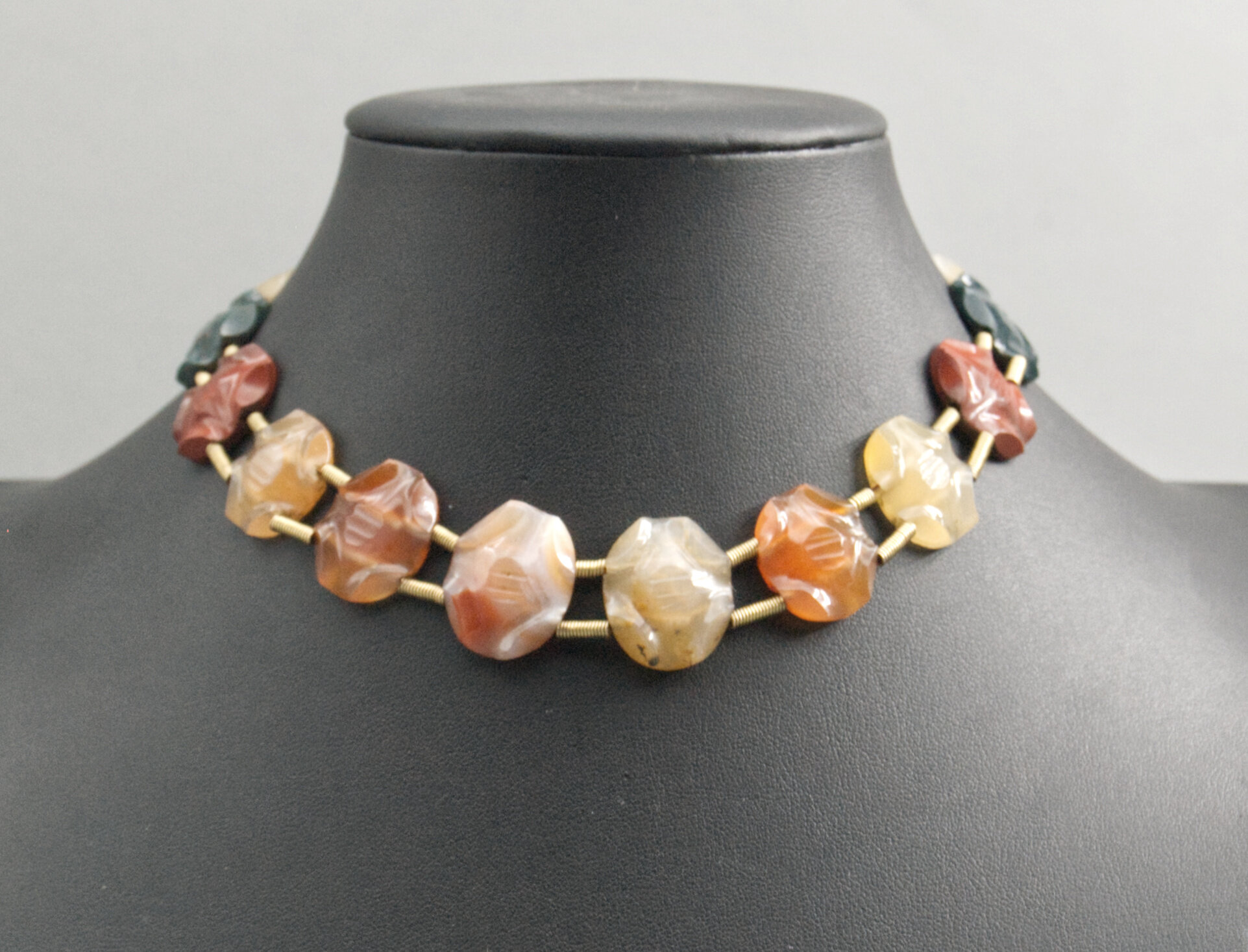 This is a very unusual necklace comprising carved stations of different Scottish agate stones, the stones are slightly graduated and are connected by gilt brass spring like connectors and fitted with the original screw clasp.| Size: | Necklace 34 cm; largest stone measures 2.2 cm x 1.8 cm |