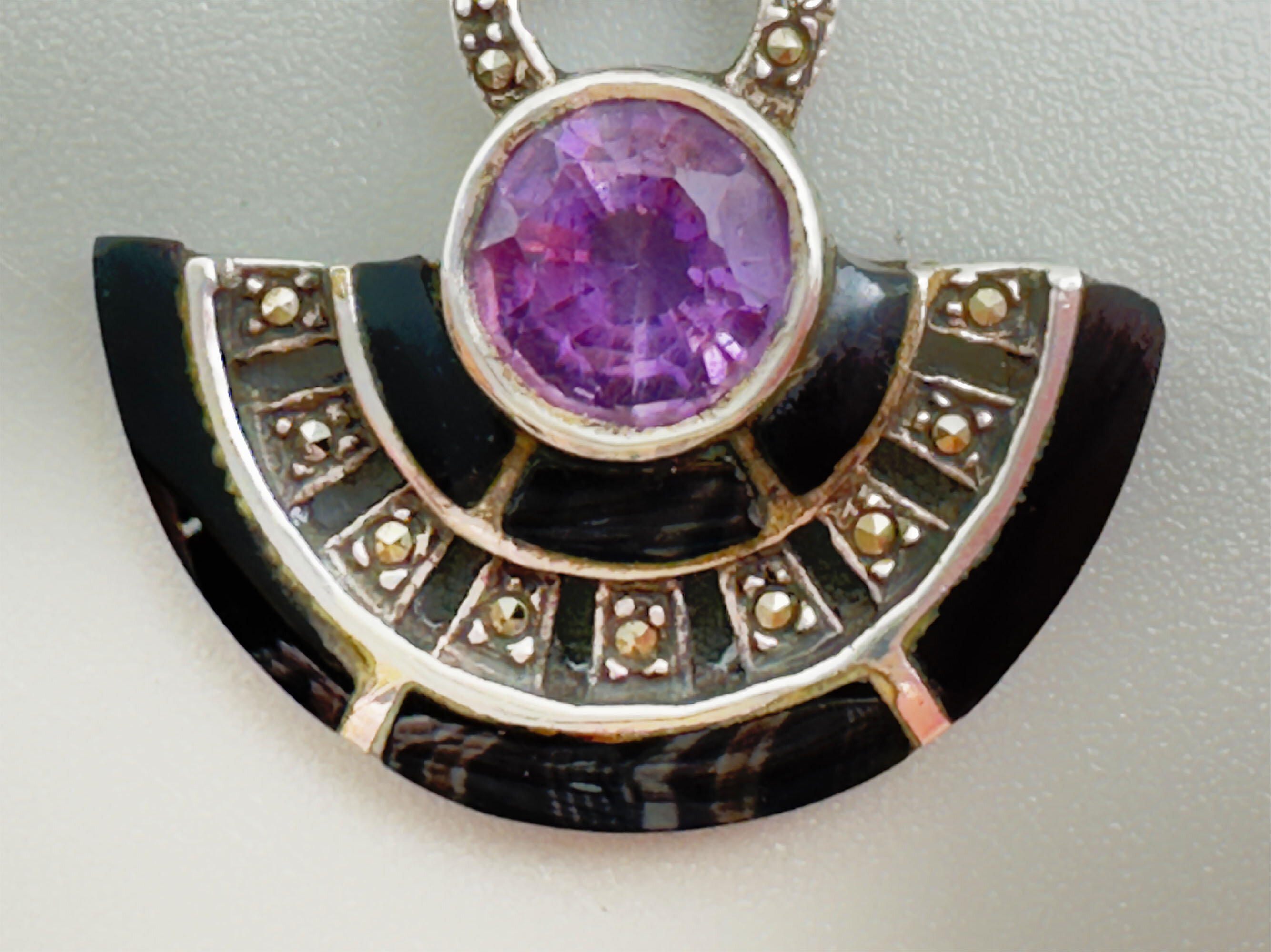 This is a pair of earrings that have a quintessential Art Deco design. They are set with onyx stones (not enamel), marcasites and amethysts. They are marked 925. These are not from the Art Deco period but show how popular these designs remain in the present day.| Size: | 61 x 22.5 mm |