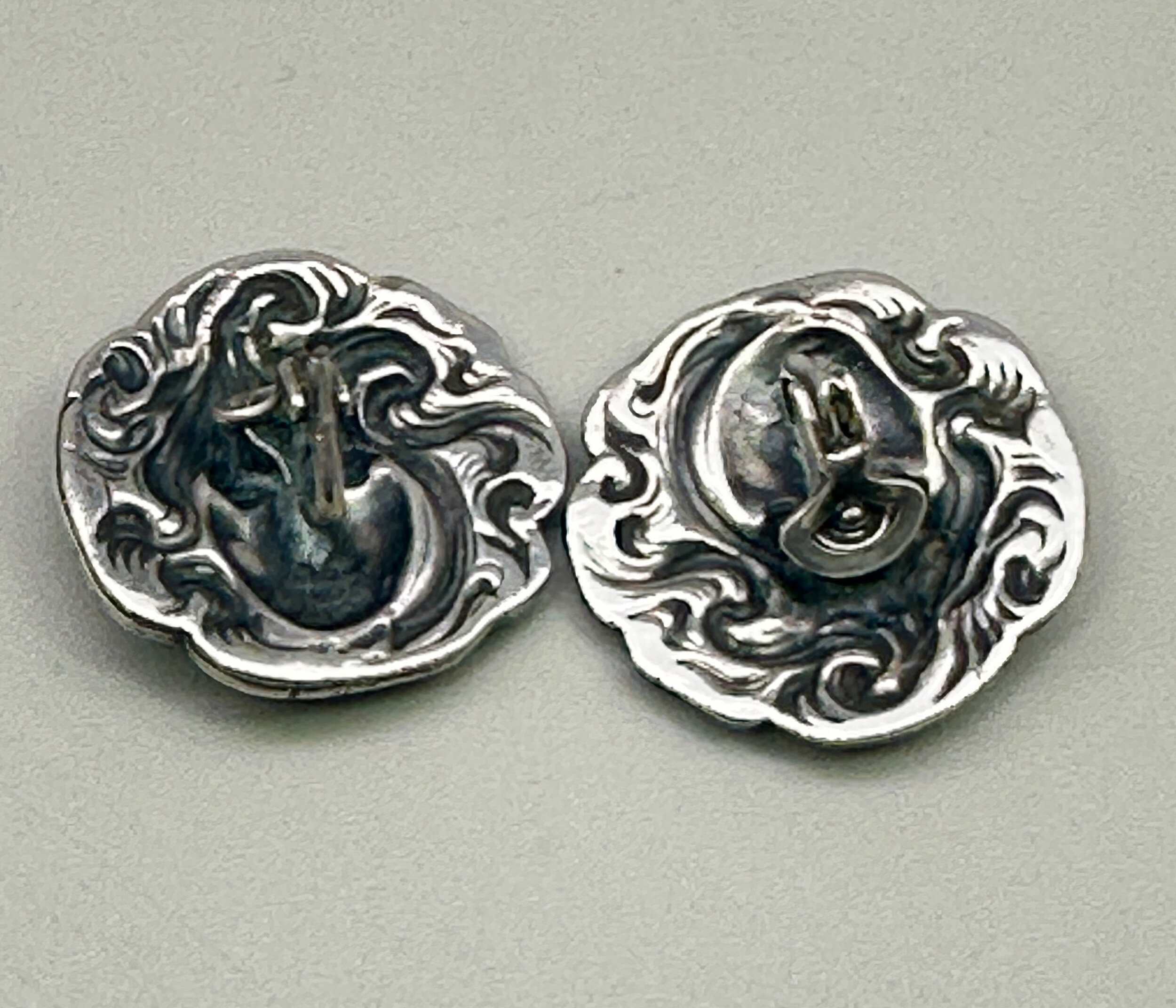 This is a wonderful pair of earrings that are true period pieces of Art Nouveau. They are clip earrings that feature the typical image of a ladies face with her hair swirling around her. They are most likely Belgian or Austrian. These are an exciting find for Art Nouveau collectors. They are unmarked silver with clips that are marked Patent.| Size: | 26.7 mm diameter |