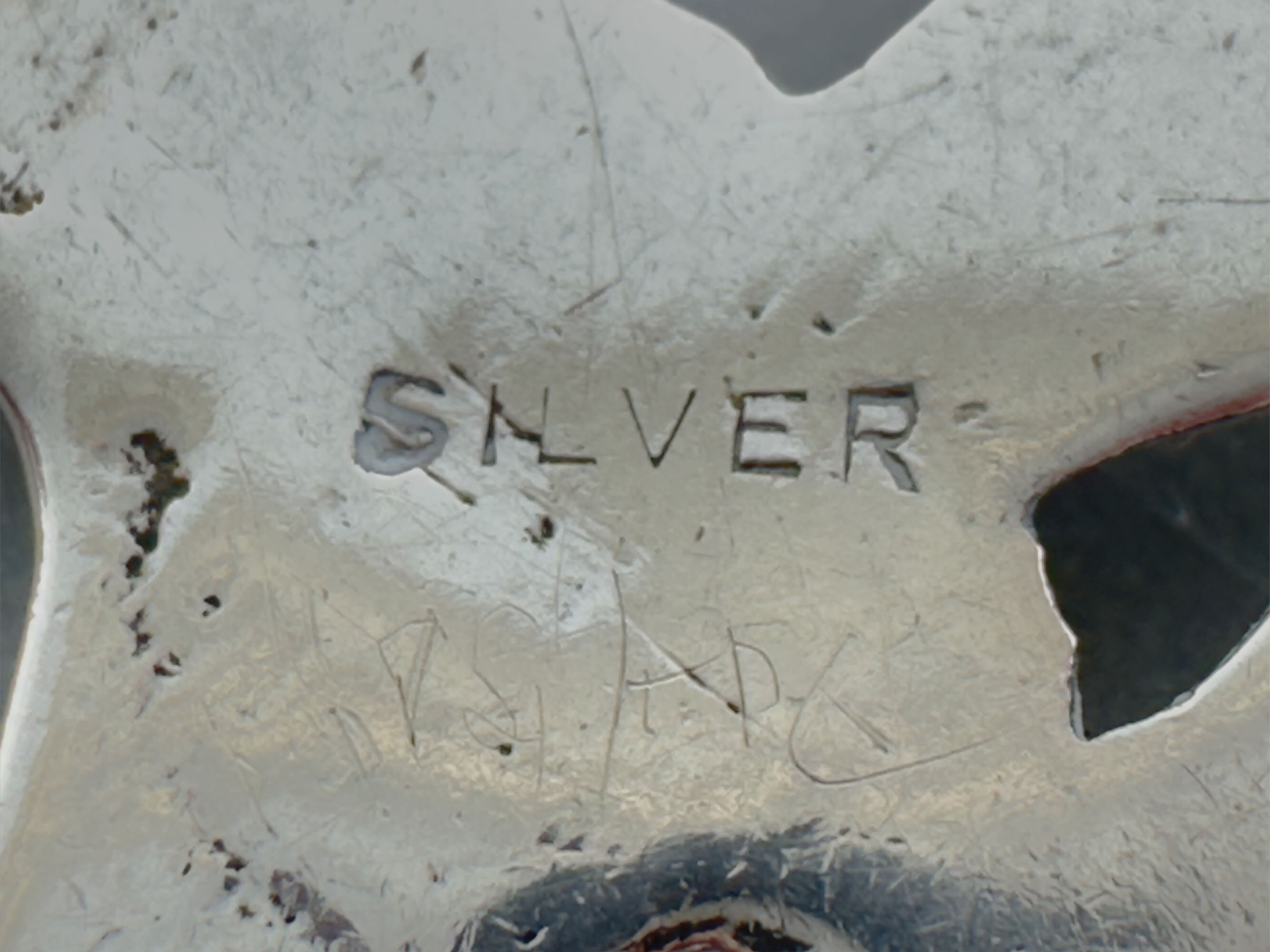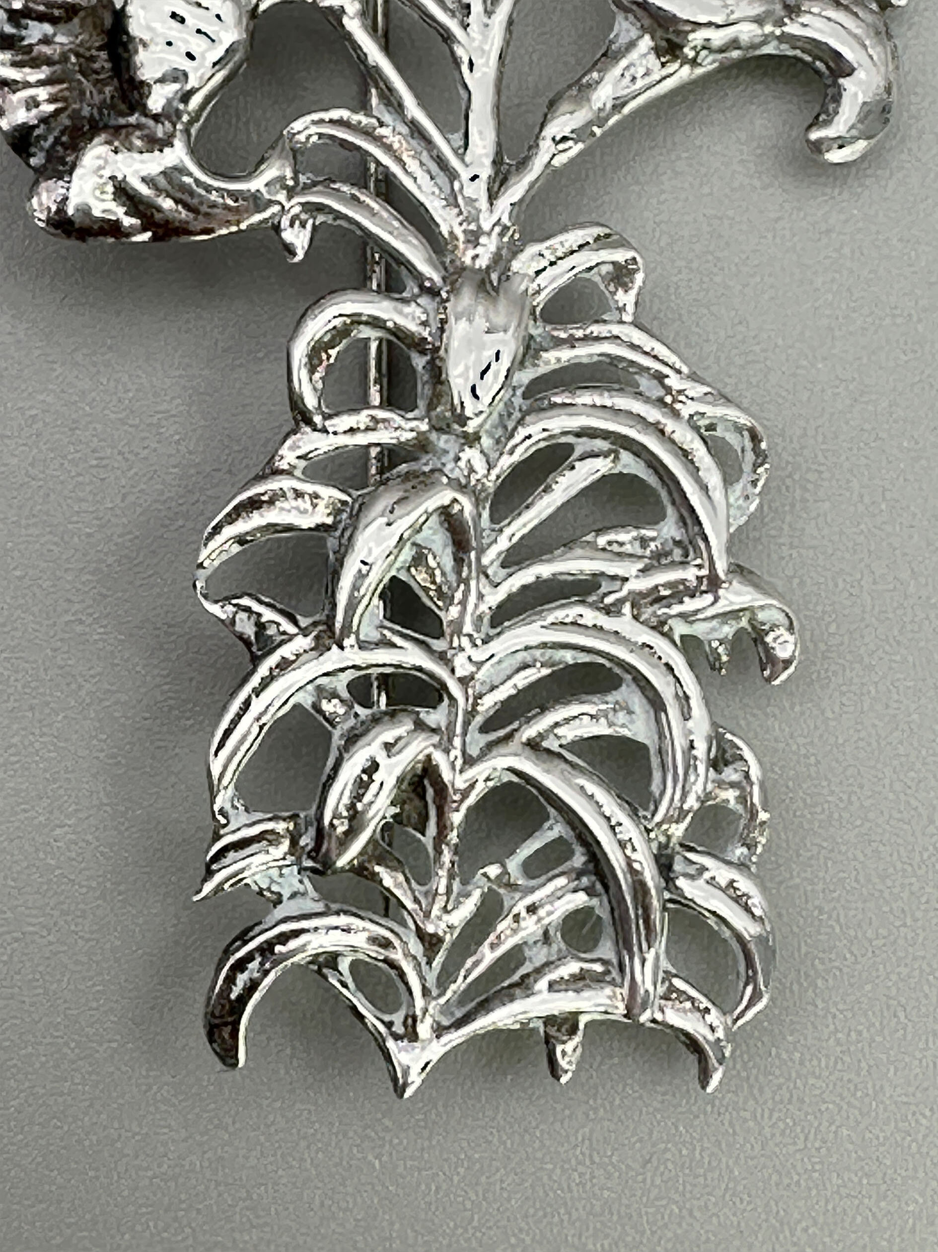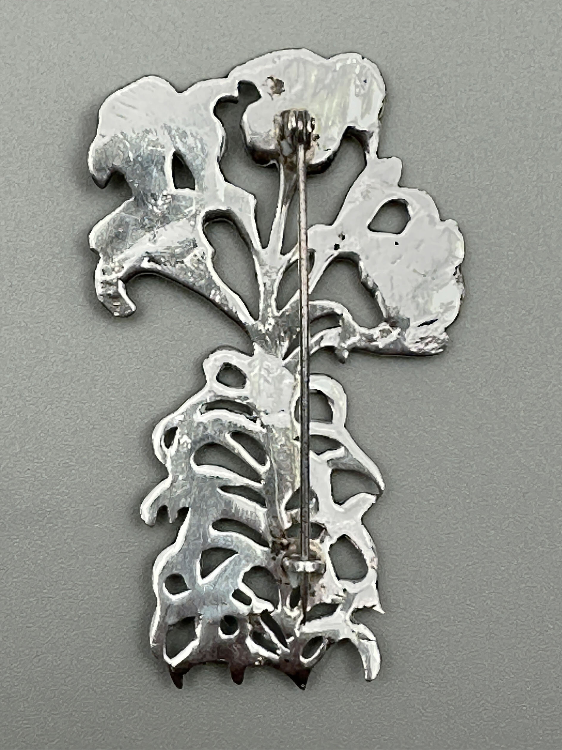 This is a large brooch with a lily spray design. It is marked 'silver' and there is a makers mark. The origin of this piece isn't clear.| Size: | 62 x 39 mm |