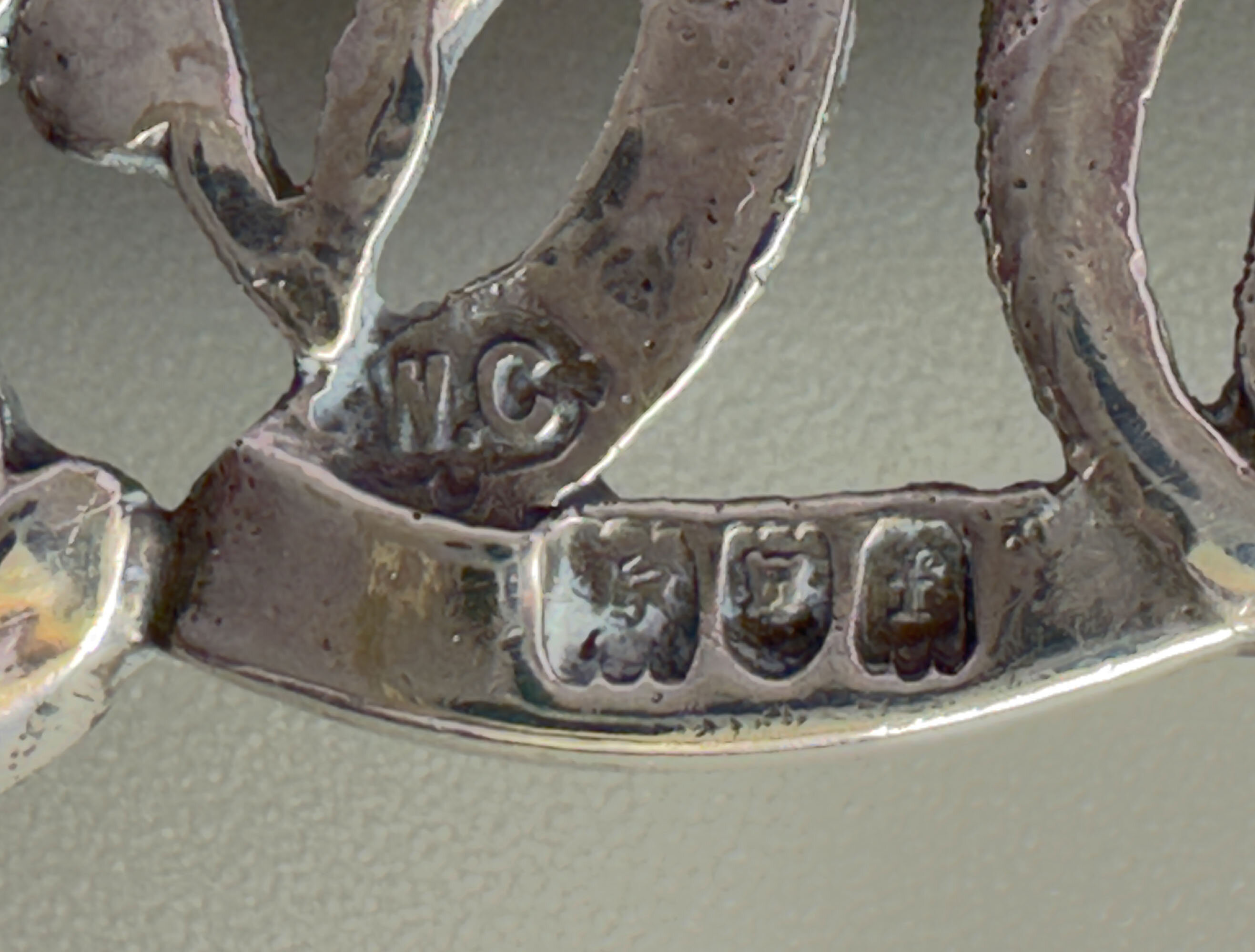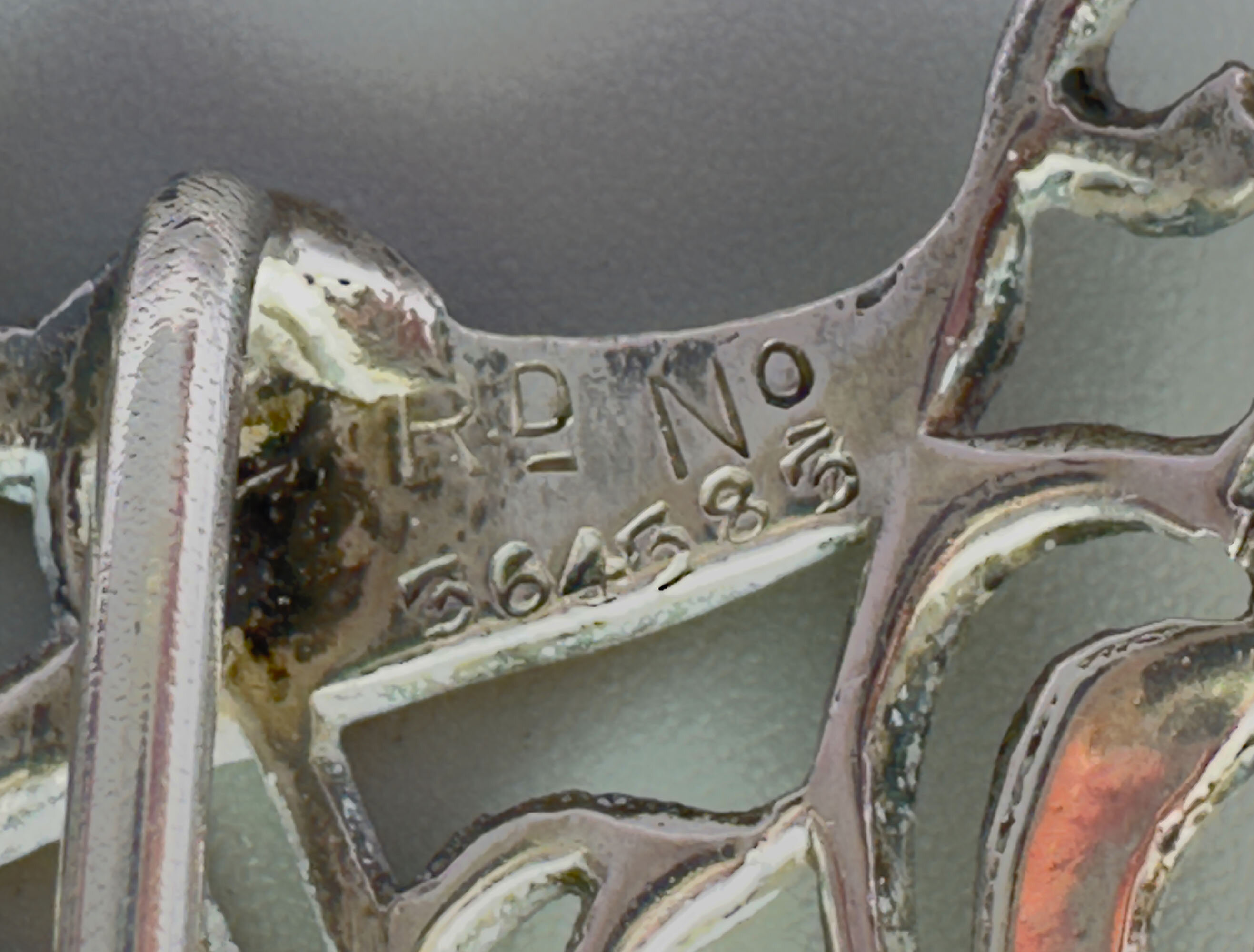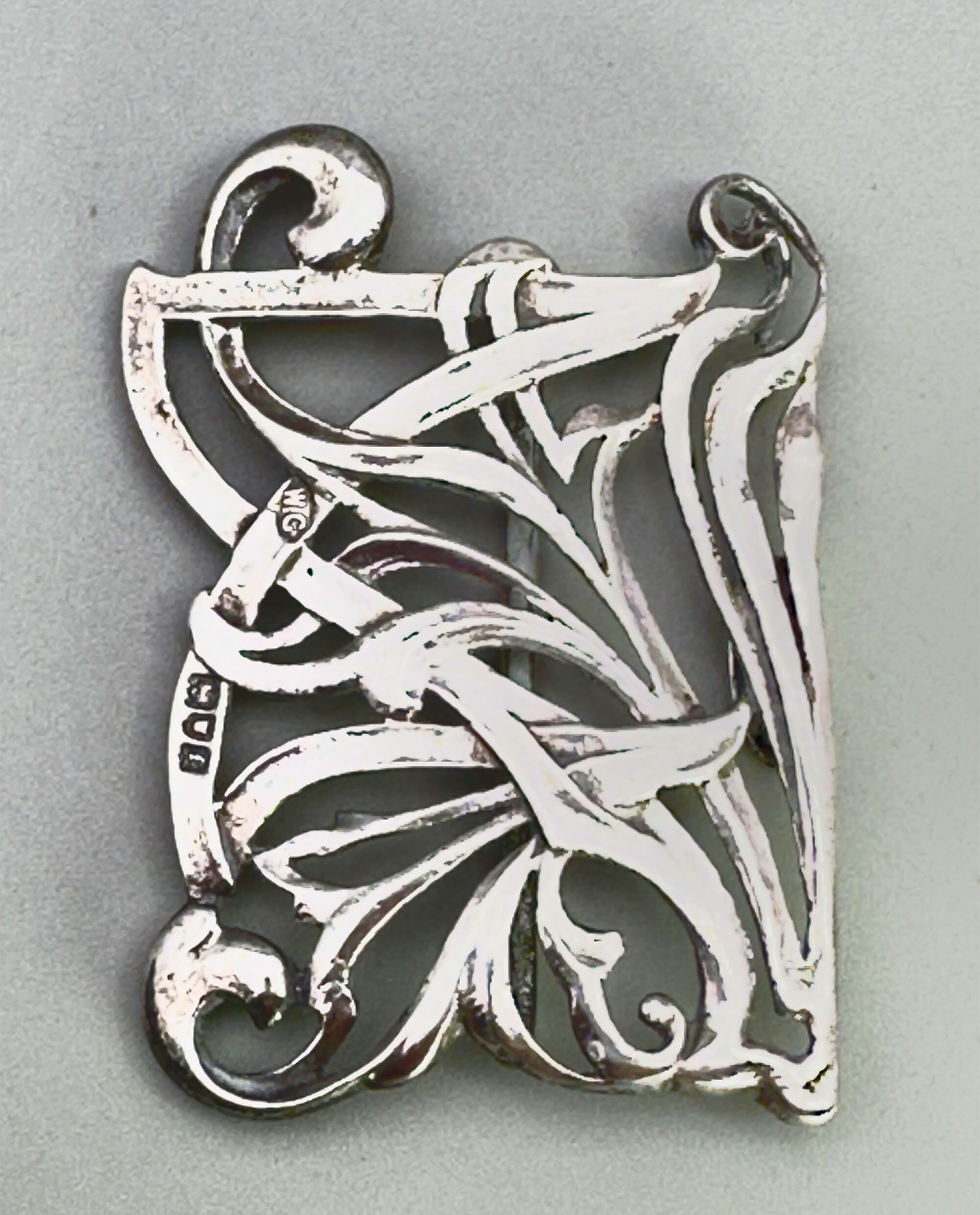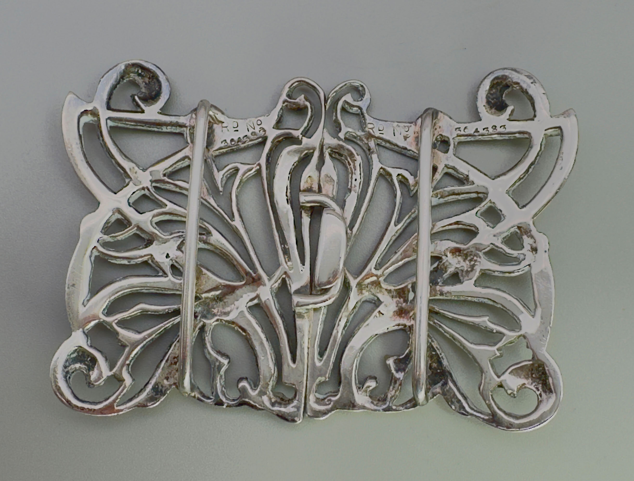 This is a piece of true Art Nouvea design. It is a ladies silver buckle by silver maker William Comyns. It bears the hallmarks for Comyns, London 1901. There is also a design patent number Rd No 564 383.William Comyns founded the company in 1858. He initially operated from the former premises of silversmith Robert Tagg at 2 Carlisle Street, Soho, London, where he registered his first maker’s mark (W.C in a four-tipped oval) in 1859. Comyns’ silverware was retailed by some of the world’s most prestigious firms, including Tiffany & Co., The Goldsmiths & Silversmiths Company, and leading London retailers such as Henry Lewis and Howell & James.
