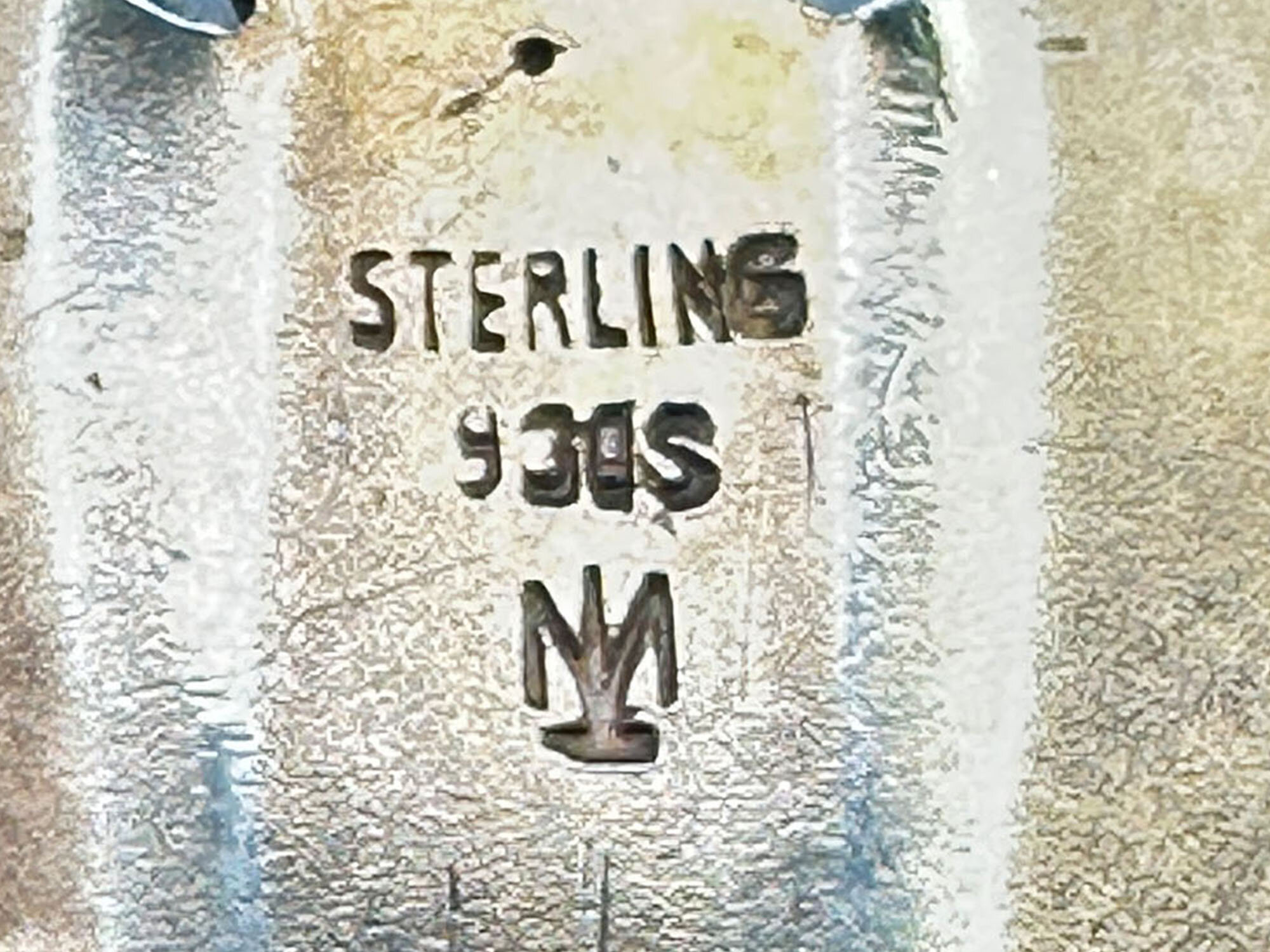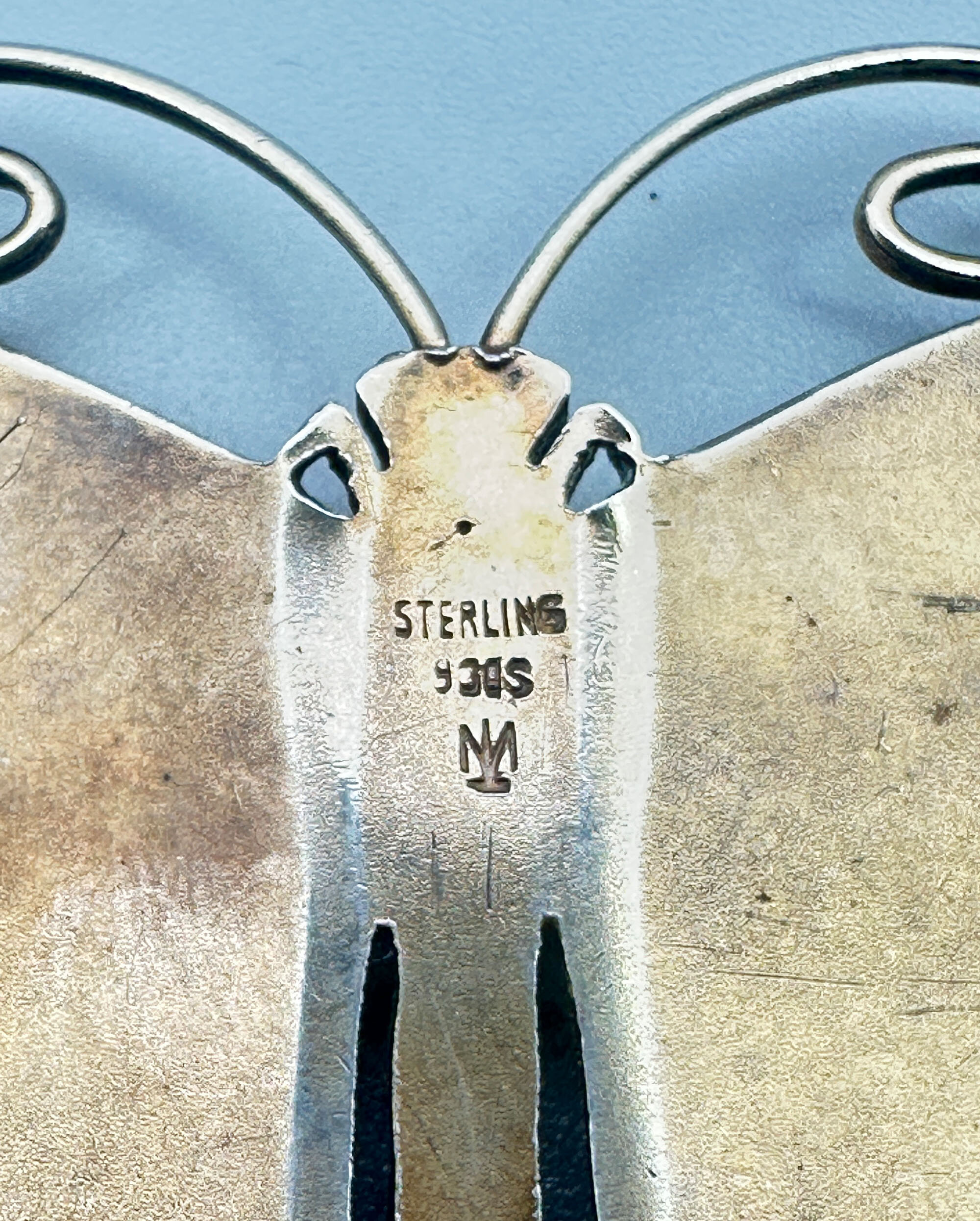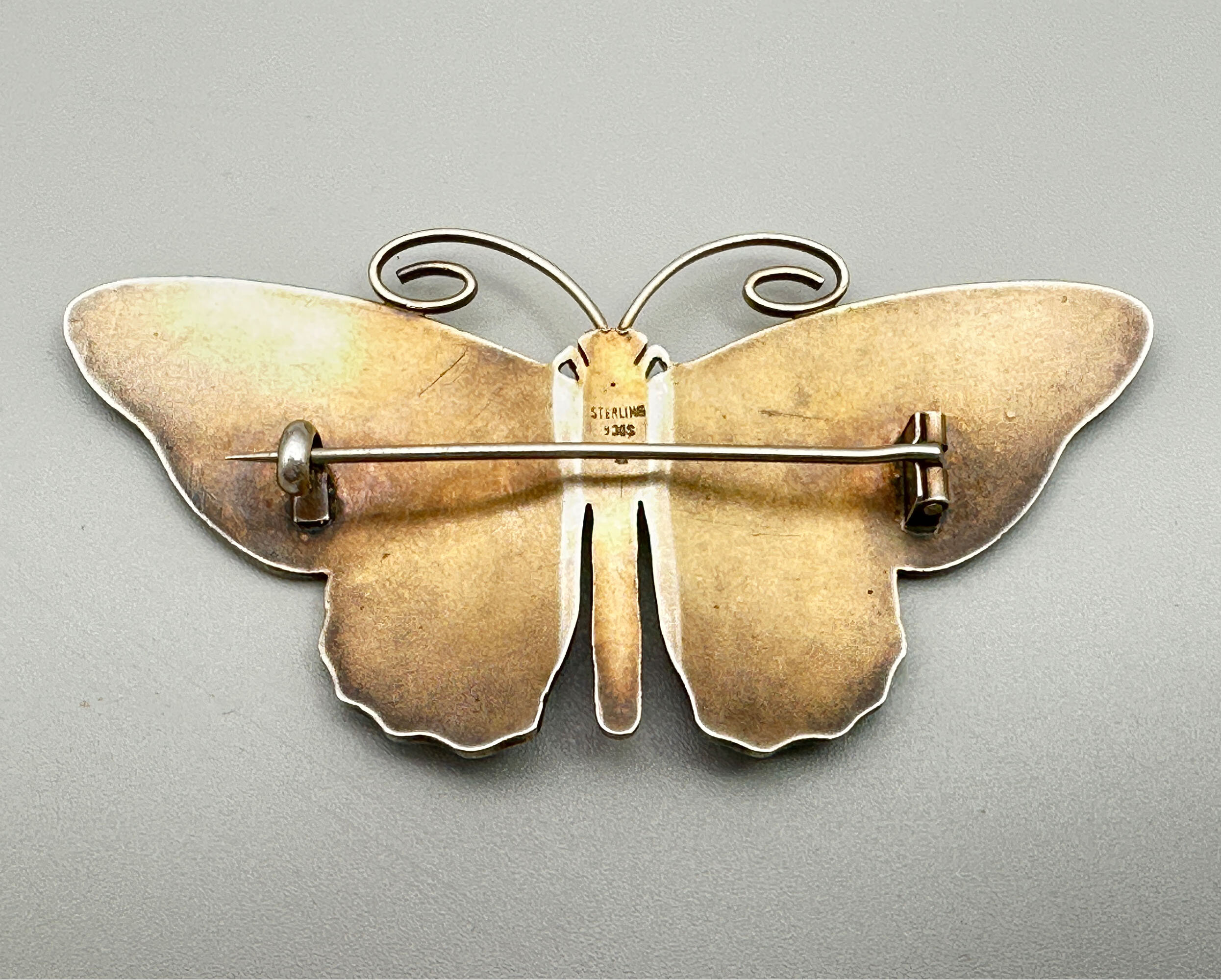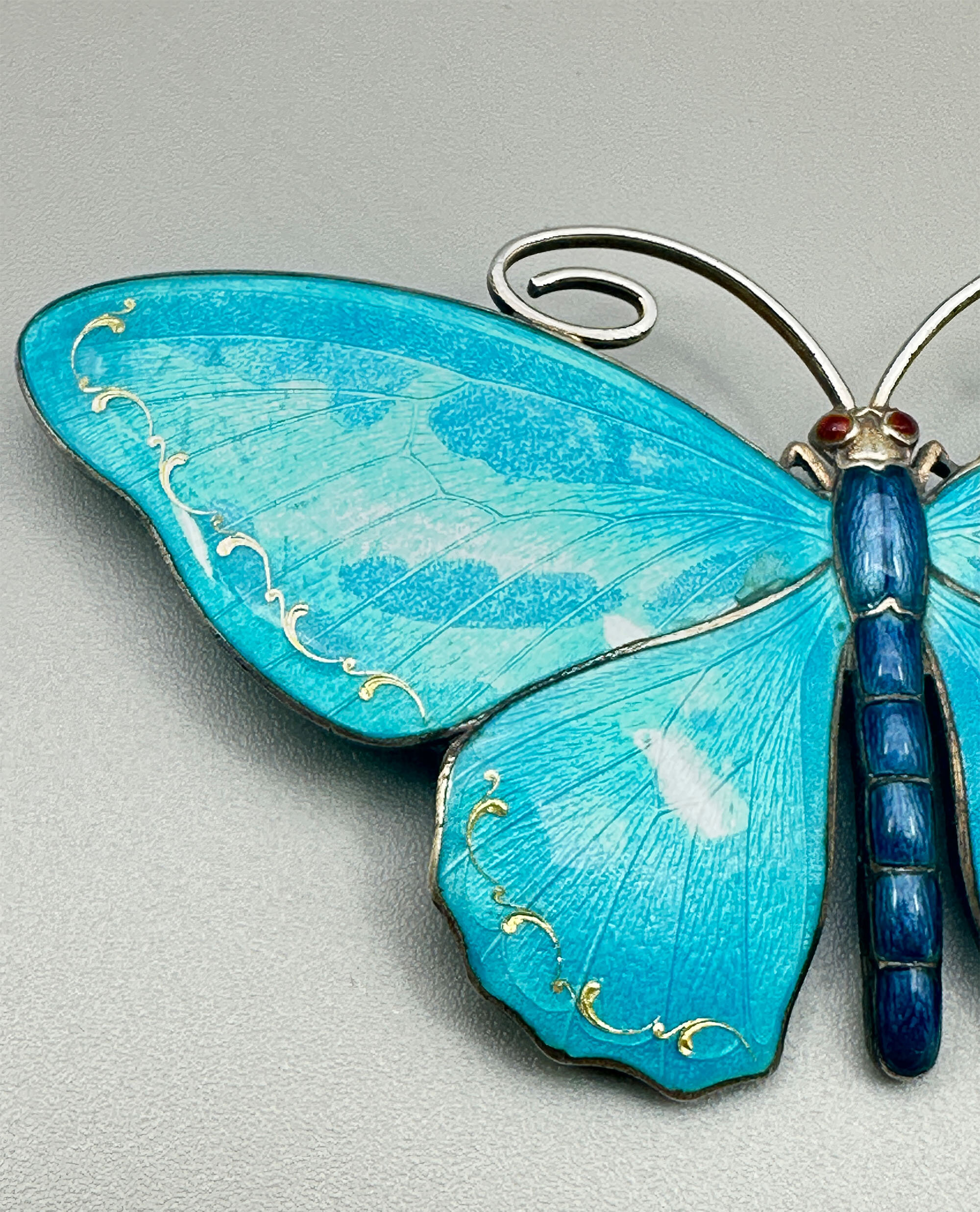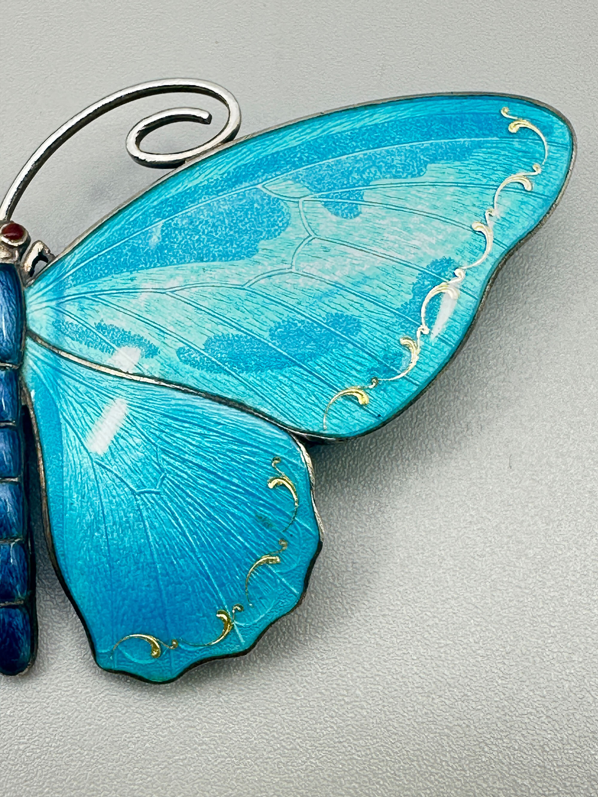 This is a very fine example of the work by the well known Norwegian goldsmith Marius Hammer (1847 - 1927). It is one of his most popular designs, a butterfly with guilloche enamel wings and body. The wings are turquoise, the body is blue and the eyes are red enamel. It is all done in silver with a gold finish on the reverse and it is marked Sterling 930S and then with his monogram which is an M with a hammer intersecting it. This is quite a unique piece as it is one of the largest examples of the butterfly designs with a wingspan of 8 cm (the most commonly found size is 6.2 cm). The gilt detail on the edge of the wings is also seldom seen.MARIUS HAMMER BIO: