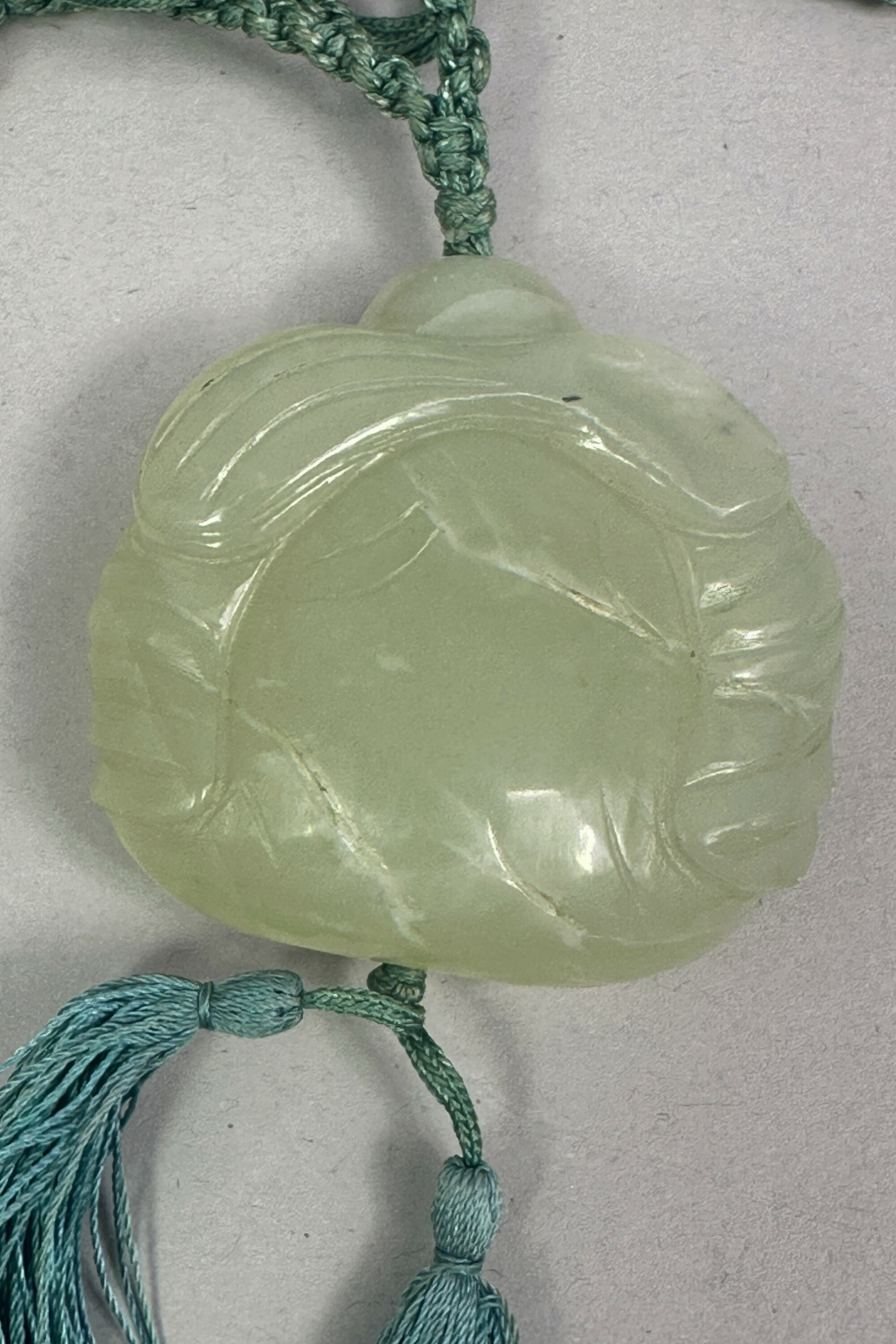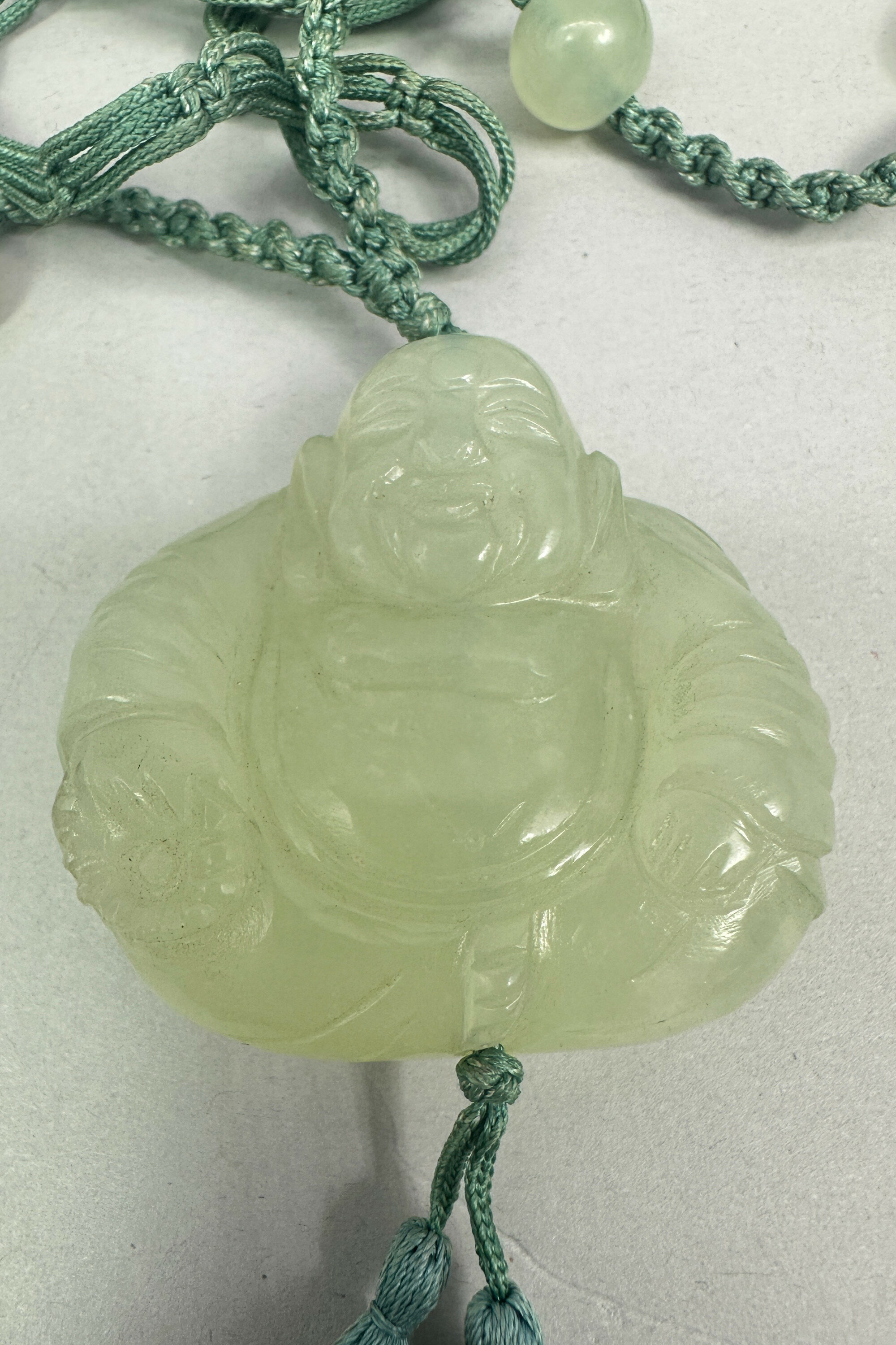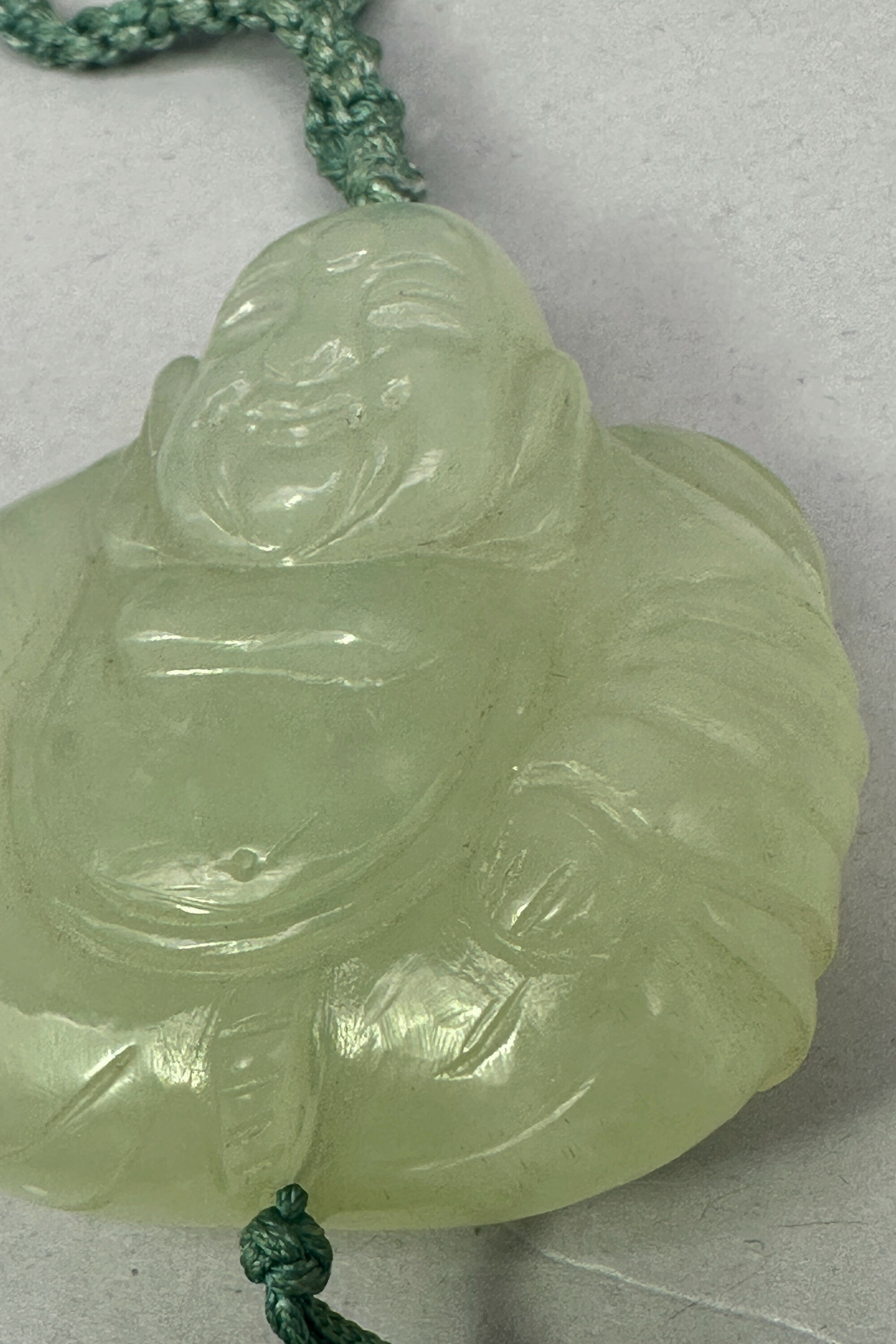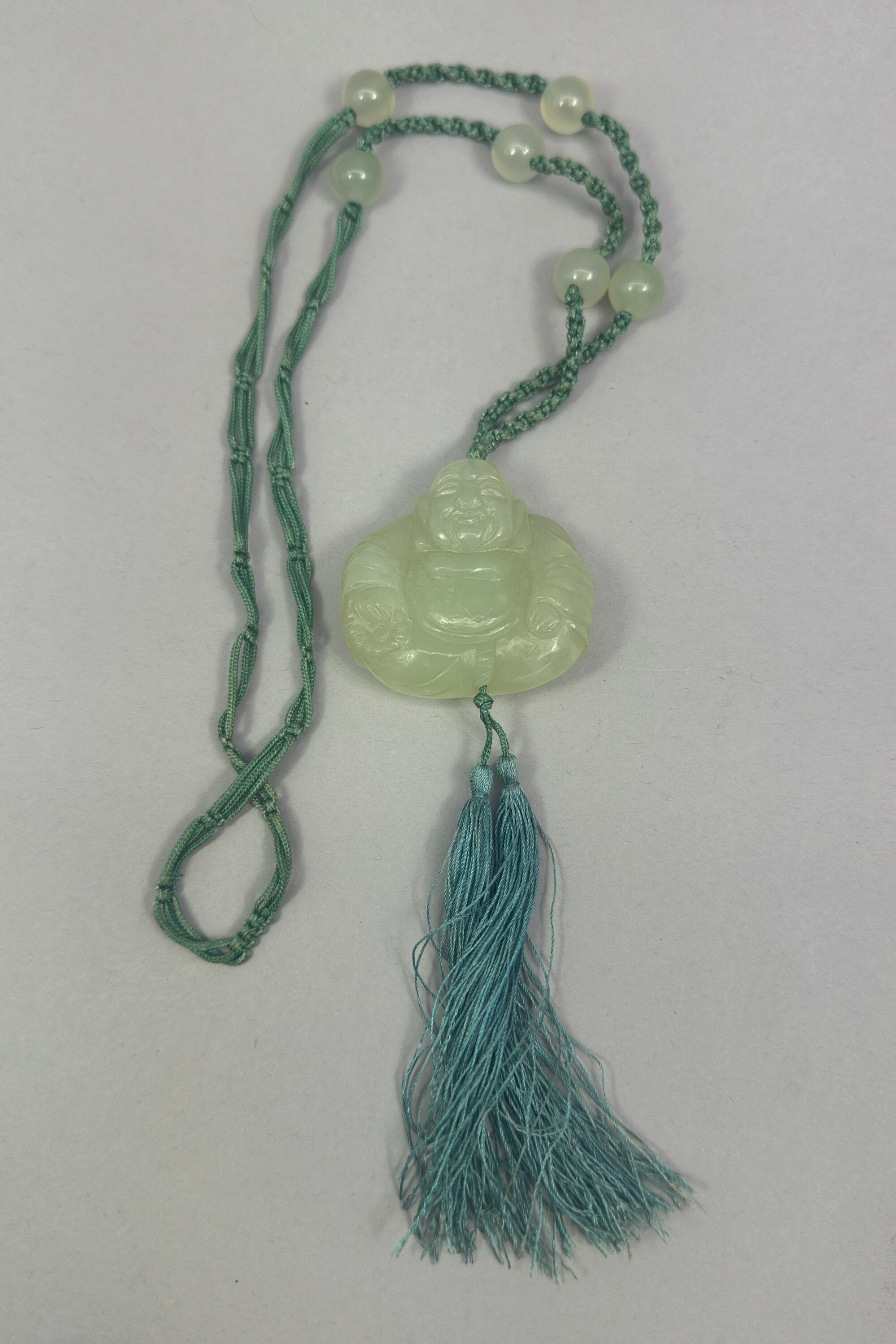 This is a beautiful and long necklace that features a large carved Buddha pendant figure in celadon jade. It is strung on the original silk cord that also has bead stations. (Please note that although this is jade, we are not specialists in this field and cannot be sure whether or not the jade has been treated in some way.)| Size: | Carving : 46.2 mm x 47 mm wide; beads :10.9 mm; necklace length 70 cm |