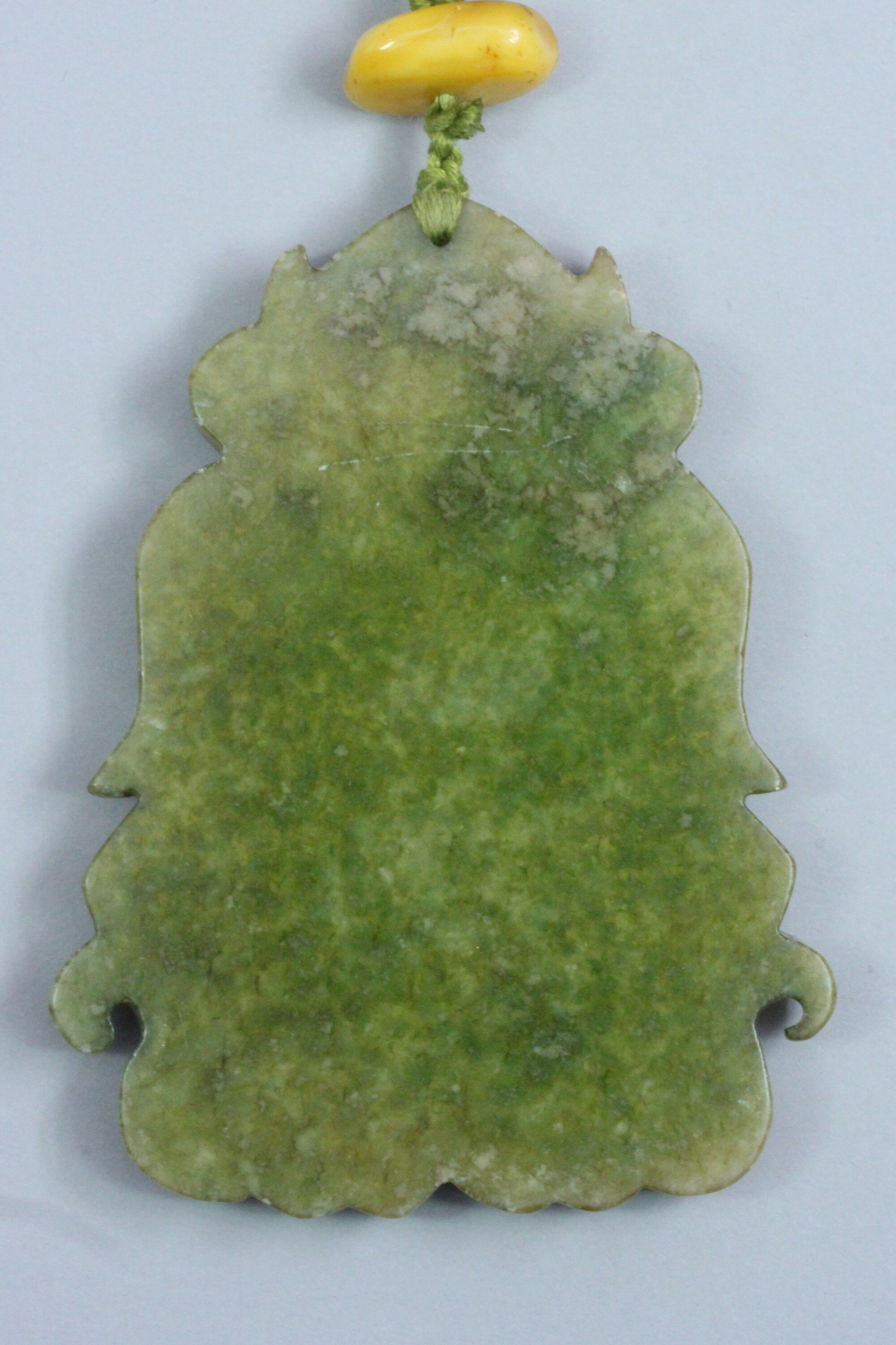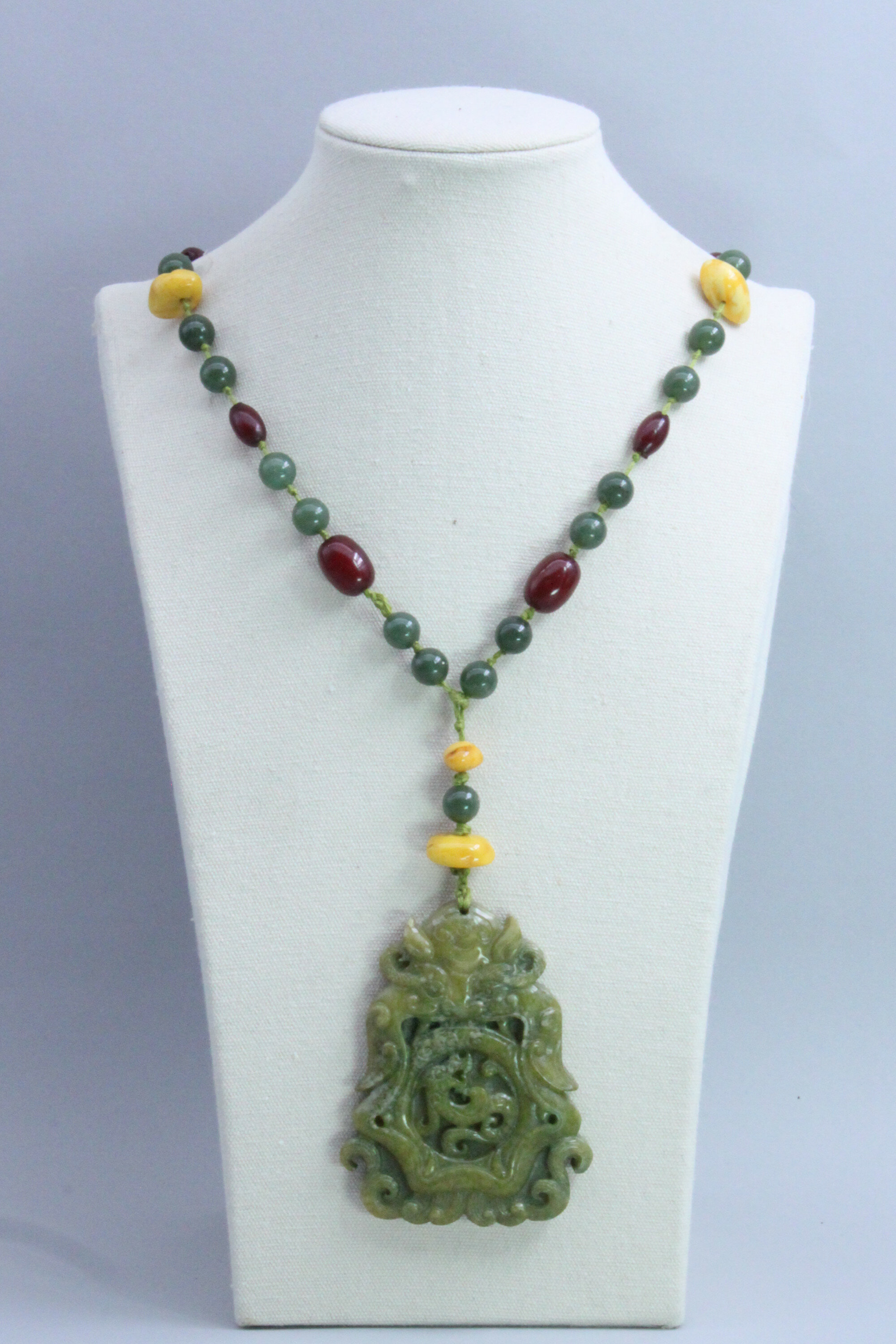 This necklace is a wonderful ensemble comprising cherry and egg yolk amber beads together with jade beads, terminating in a very large carved jade plaque which is a very fine example of Chinese carving, with an allegorical motif of a dragon's mouth around a smaller dragon, and formed from golden spinach jade, an unusual colour.| Size: | 64 cm long, drop is 13 cm, pendant 6.2 cm x 8 cm |