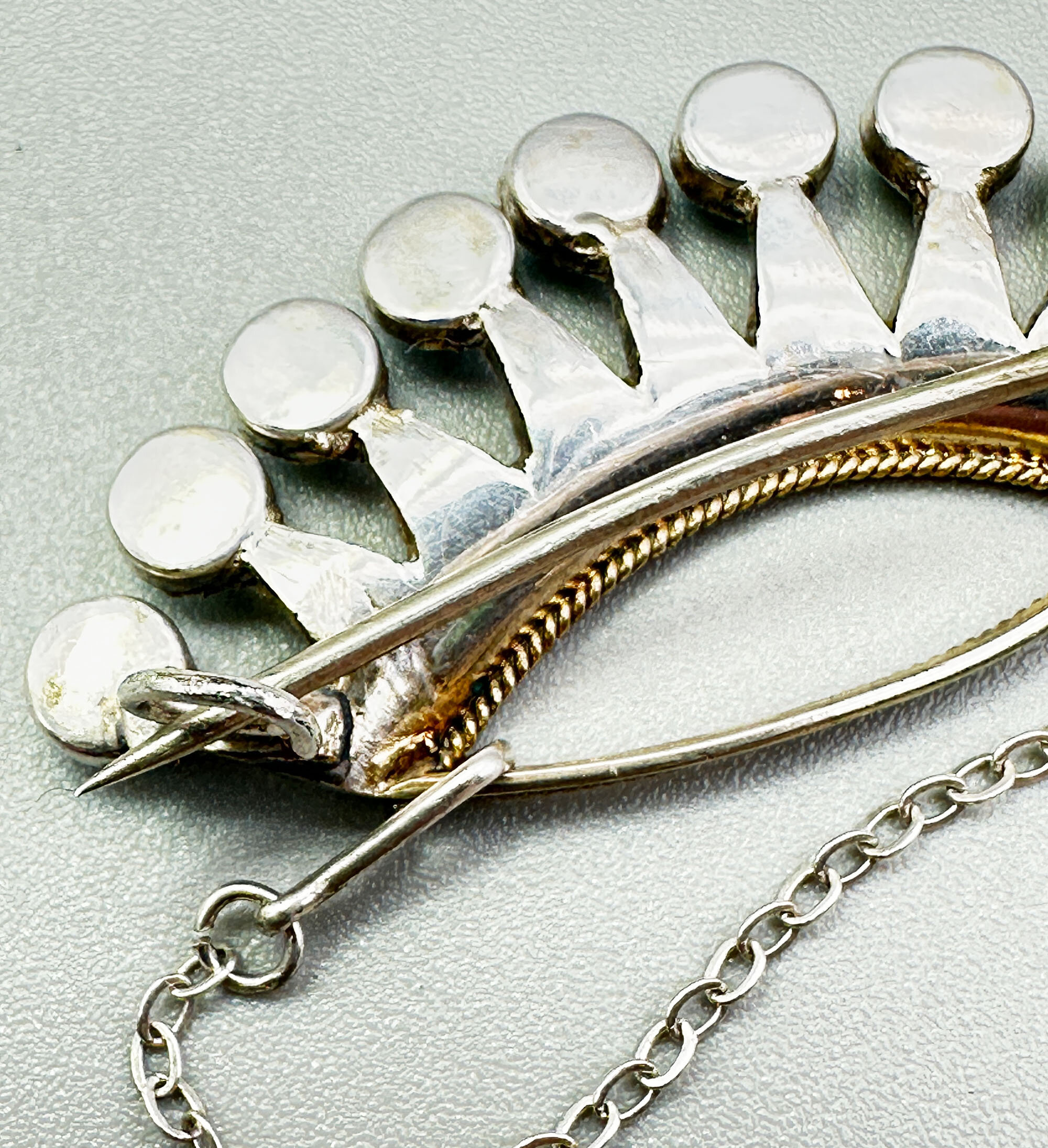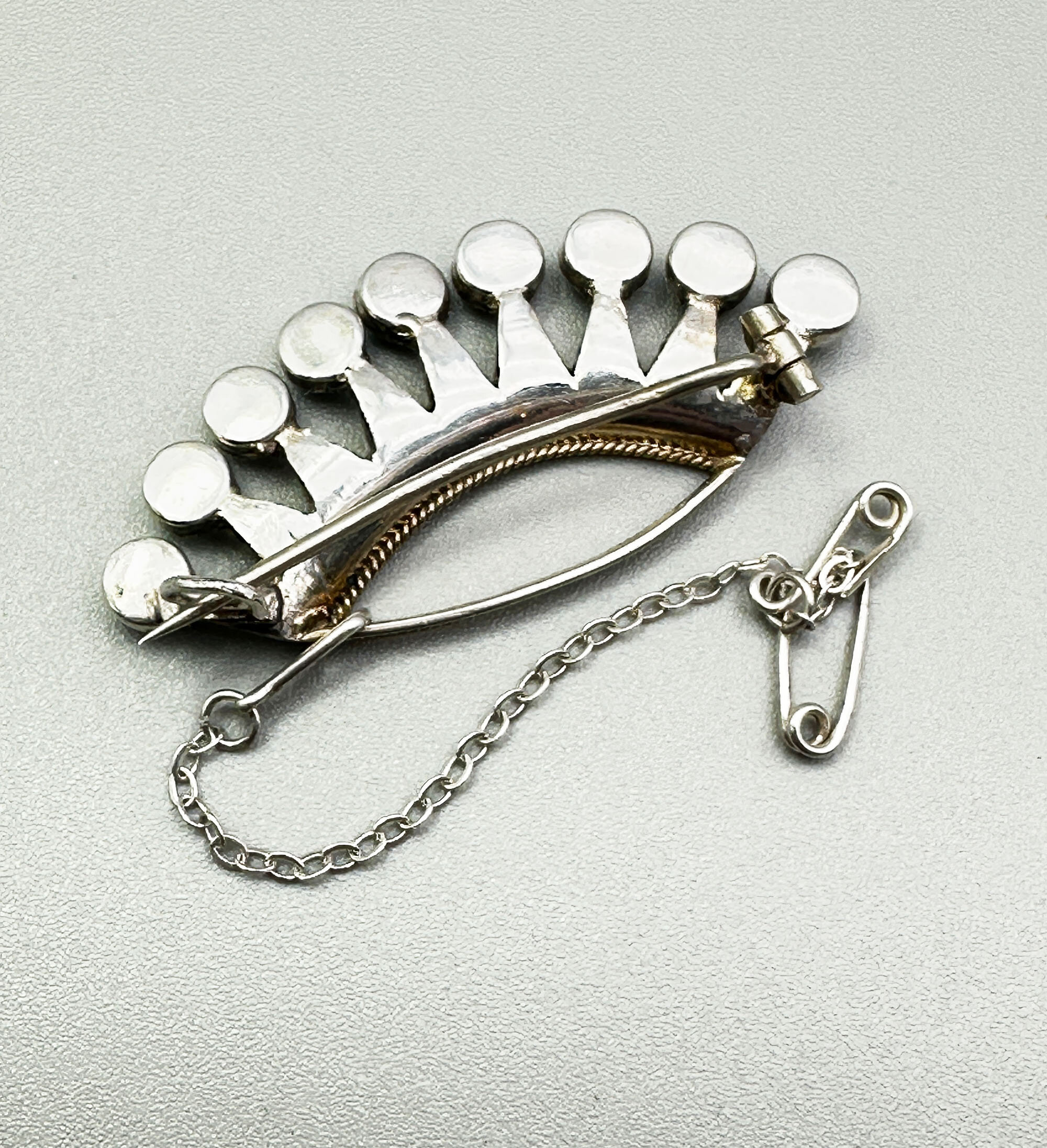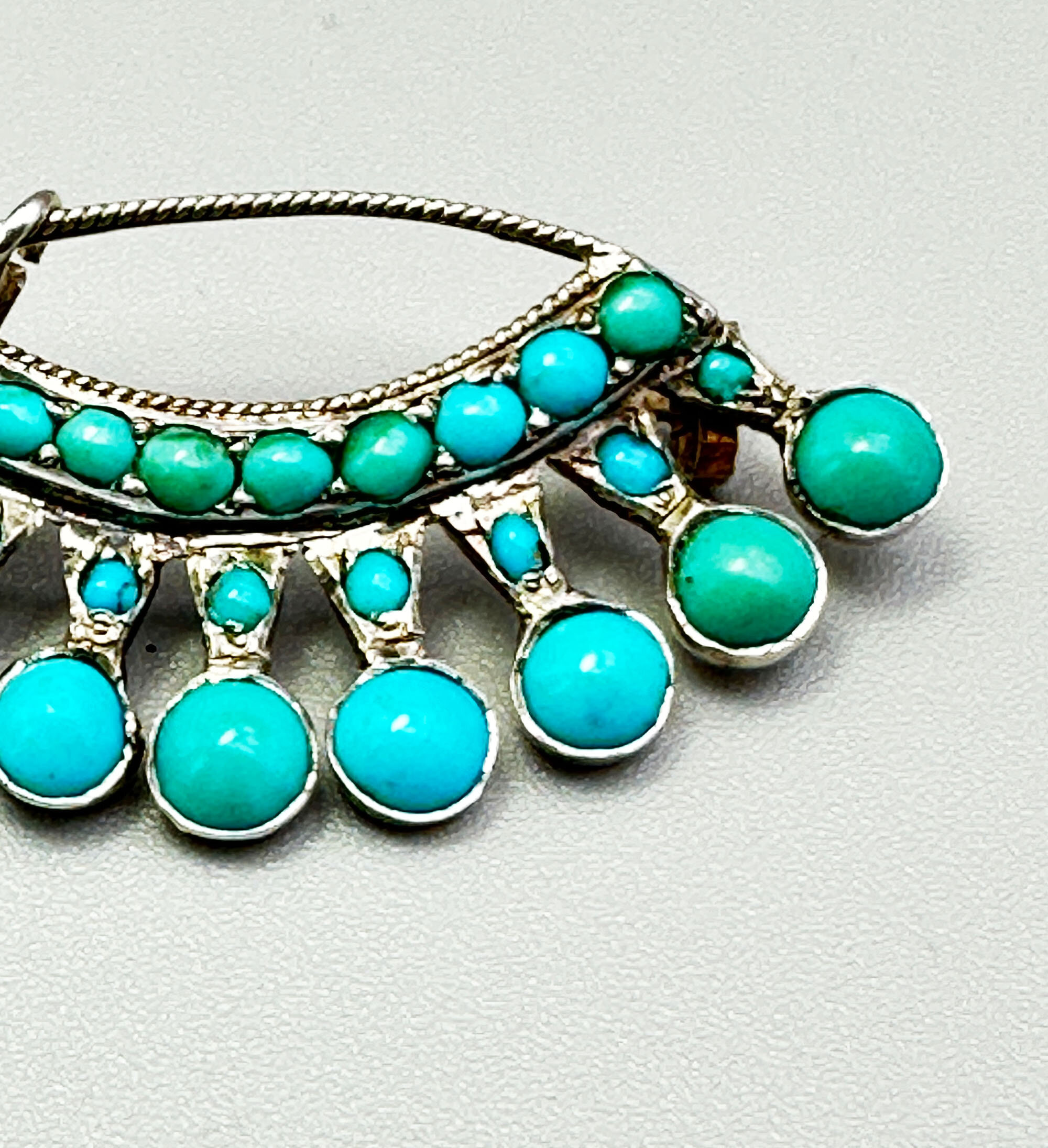 This a very unusual brooch created from silver set with turquoise stones. It is in a crown shape and has nine large stones and numerous smaller stones. It is continental with the turquoise being most likely from the Middle East. It is unmarked and comes in its original box.| Size: | 41 x 19 mm |