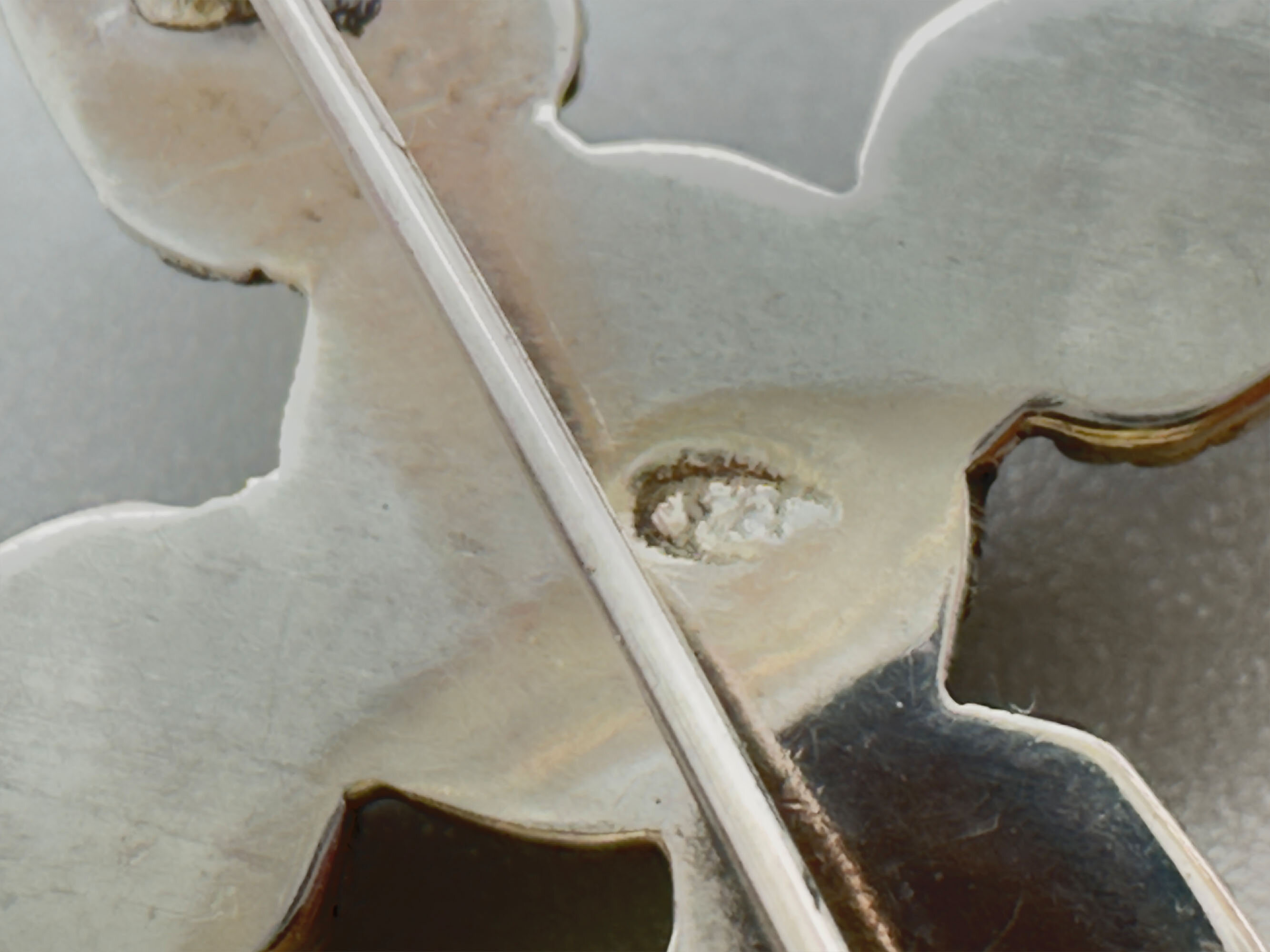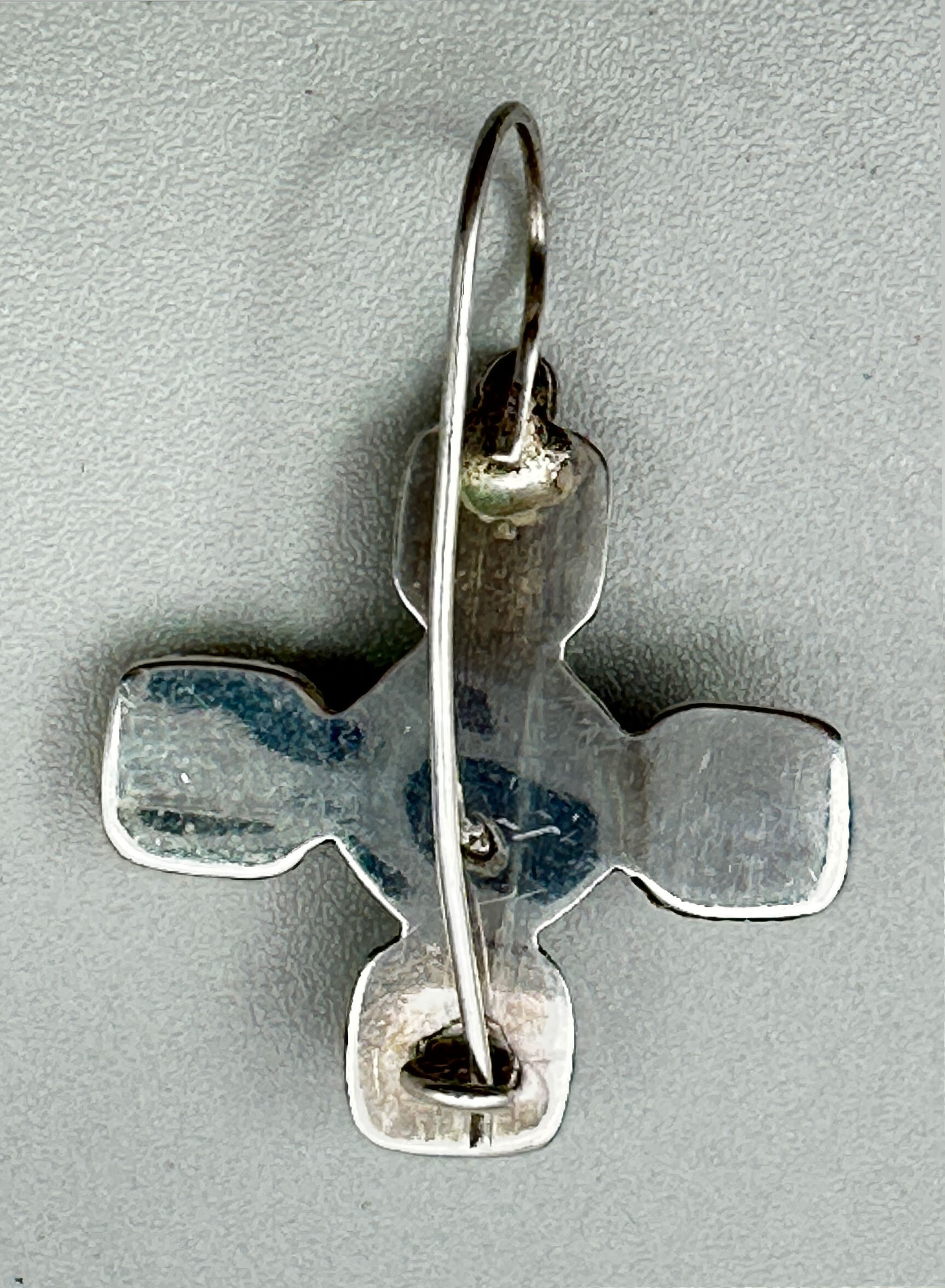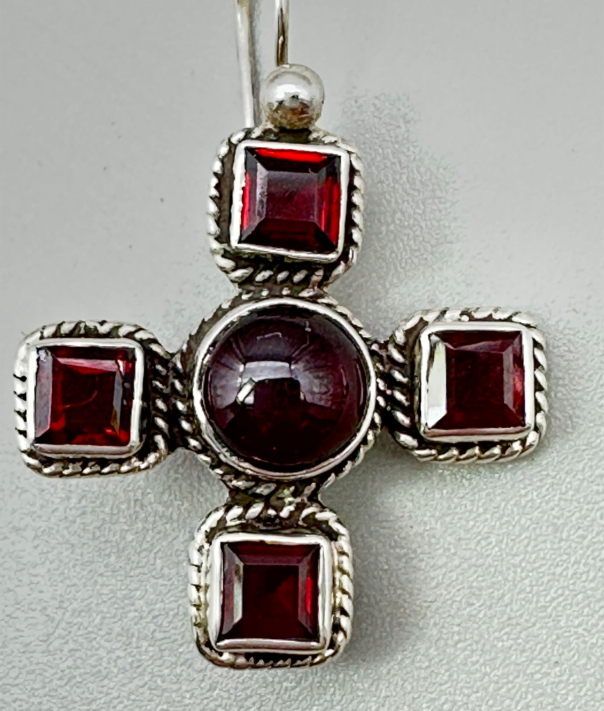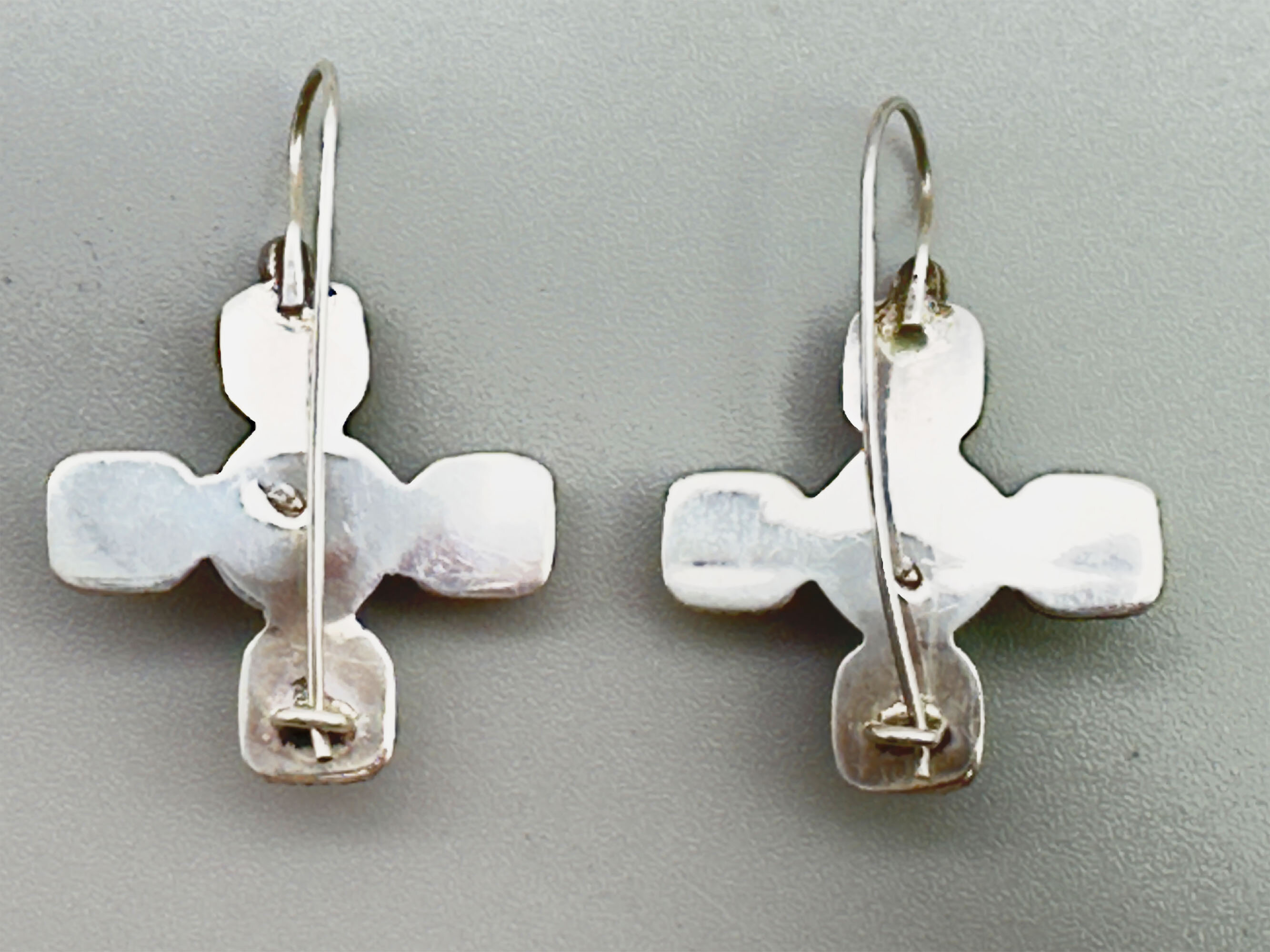 These are a lovely and delicate pair of earrings comprising square cut stones surrounding a large cabachon. They are marked illegibly. Most likely Italian in origin.| Size: | Earring cross measures 21 x 21 mm |