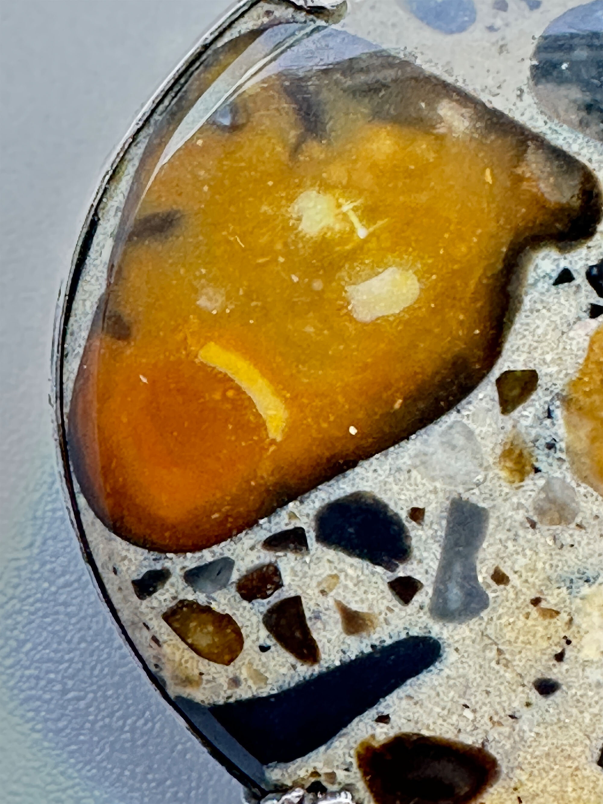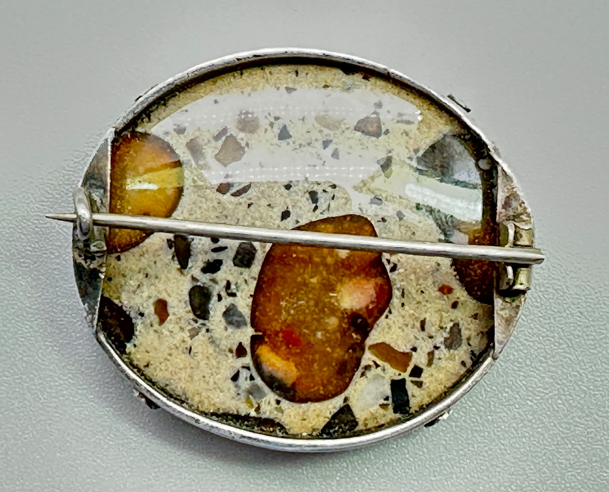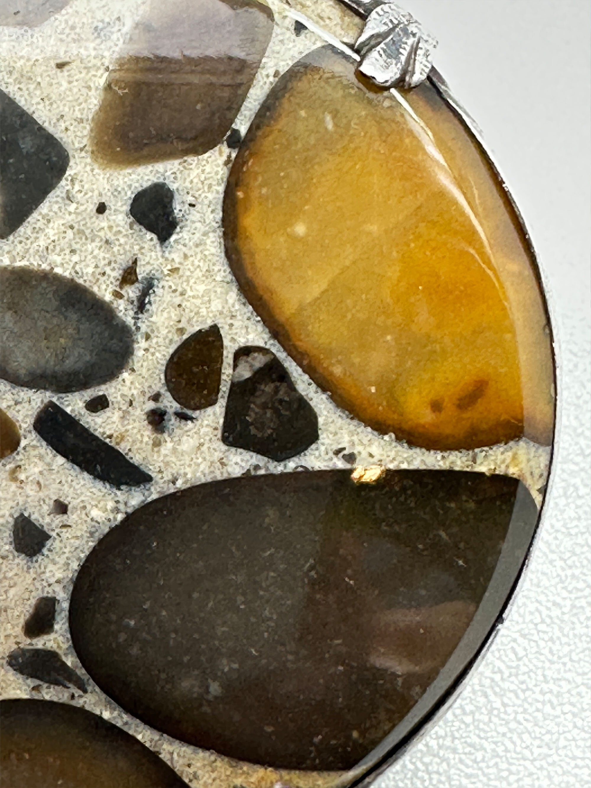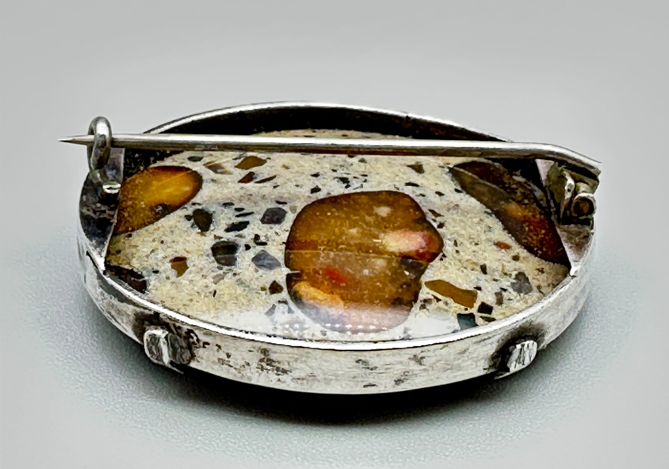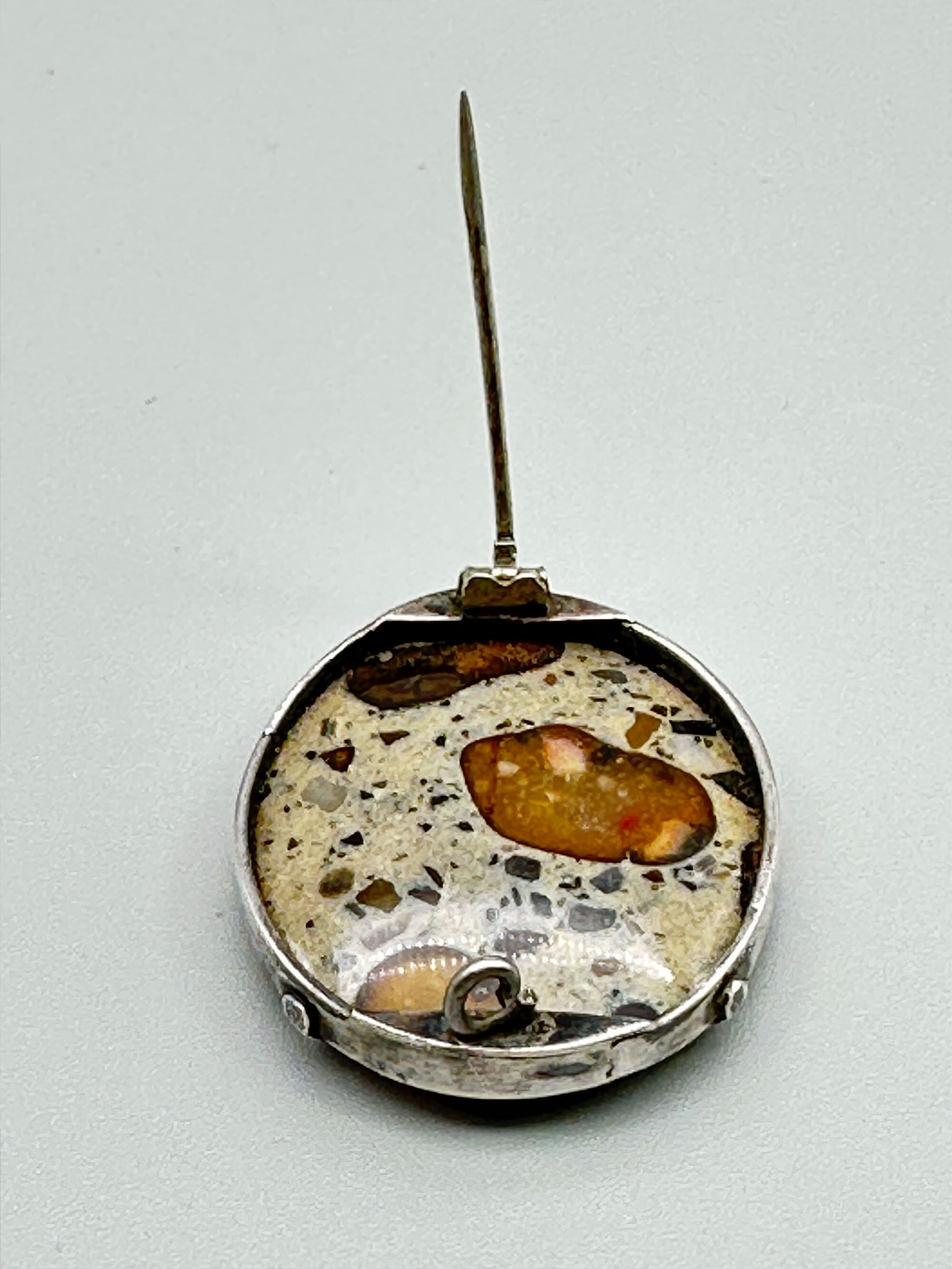 This is a very unusual brooch set with a hertfordshire puddingstone and mounted in silver. Hertfordshire puddingstone is a conglomerate of rounded flint pebbles in a matrix of fine pale sand all cemented together (basically a ‘fossil beach’). As the pebbles, the sand and the cementing material are all silica the rock is very hard and breaks evenly across pebbles and sandy matrix. The story of hertfordshire puddingstone is also the story of climate changes over the last 80 million years ranging between extremes of hot and cold. (Ref: East Herts Geology Club, https://ehgc.org.uk/hertfordshire-puddingstone/puddingstone-formation/ )| Size: | 39 mm x 34 mm |