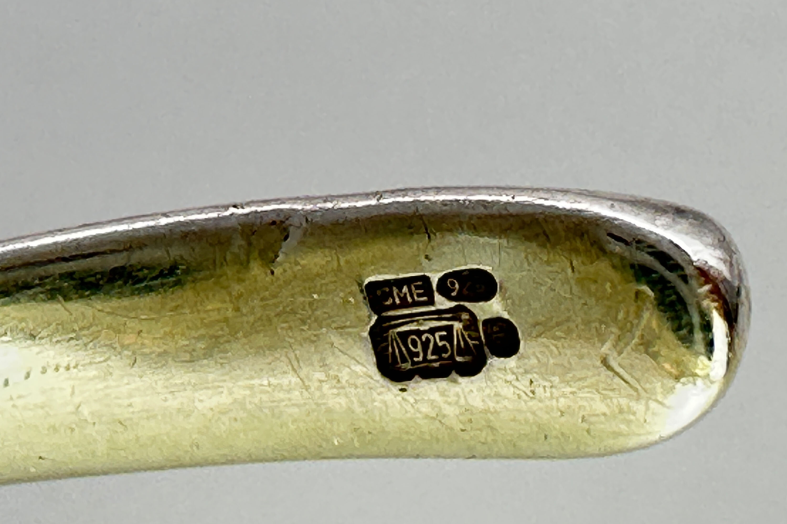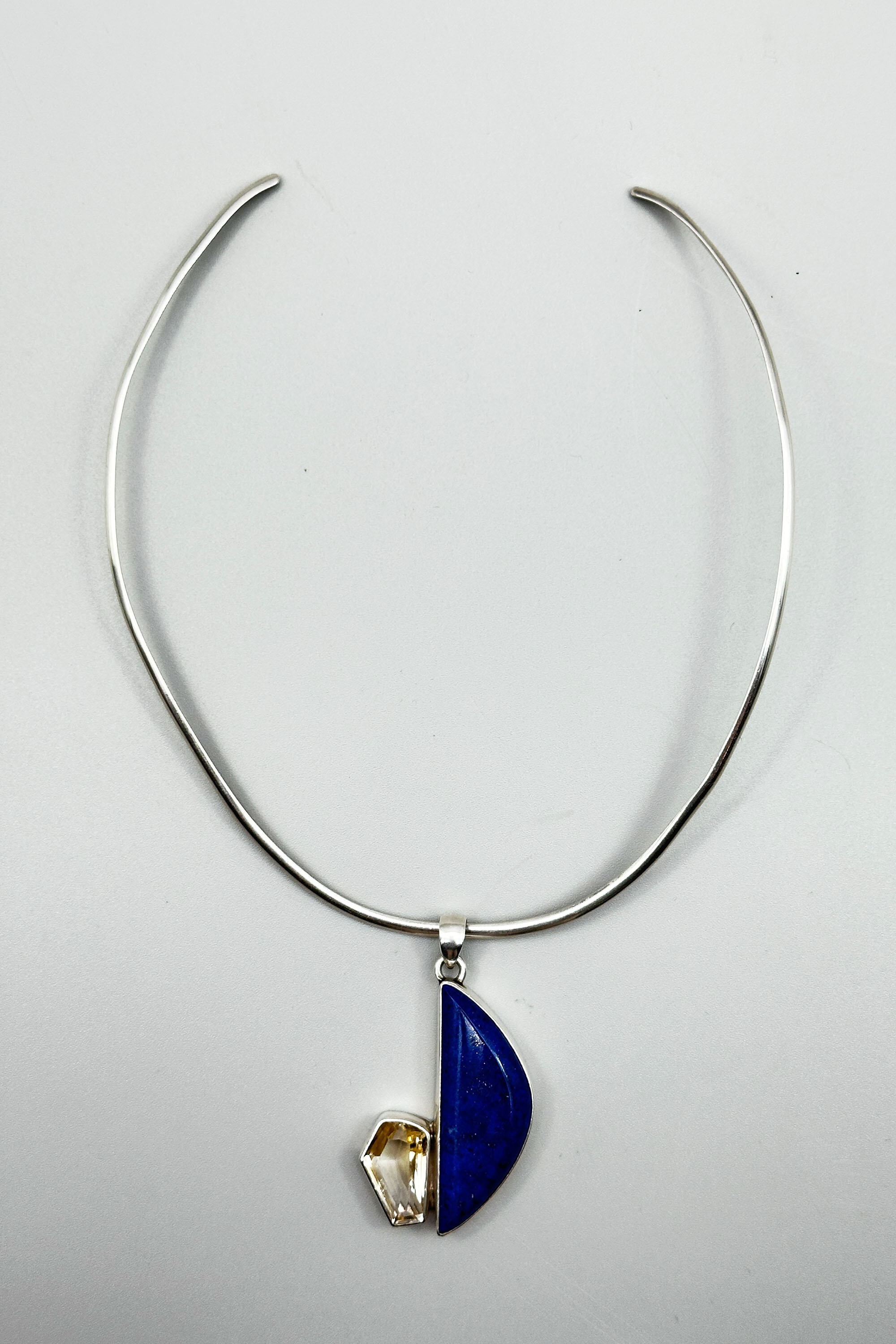 This is a very sleek necklace with a geometric pendant on a torque necklace. The pendant has a half moon shaped Lapis Lazuli stone and a fancy cut five sided lemon quartz stone. This is a very elegant and balanced piece. Both pendant and necklace are marked 925.| Size: | Pendant without bail 56.4 x 38.7 mm, necklace is free size and is 3.3 mm wide |