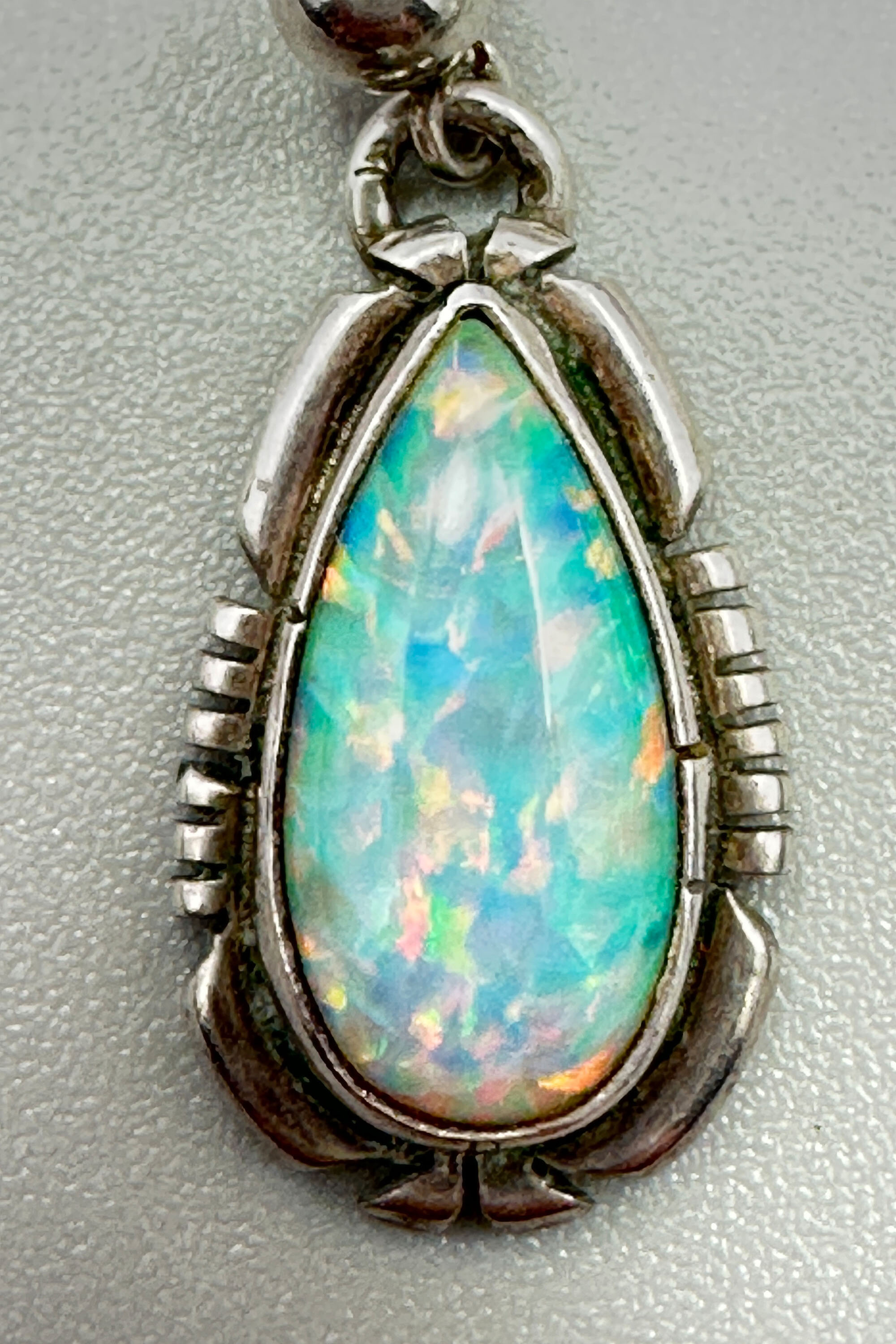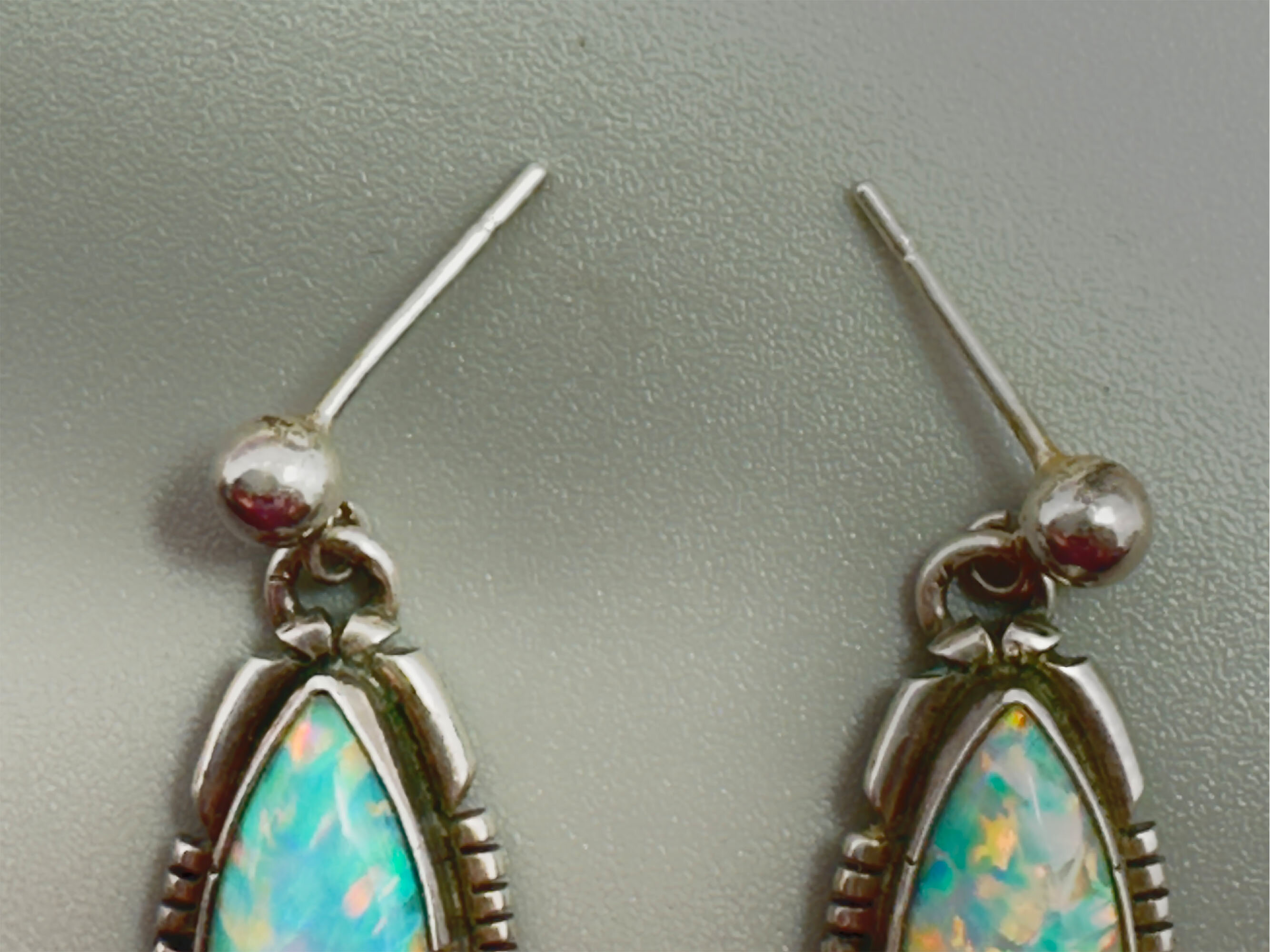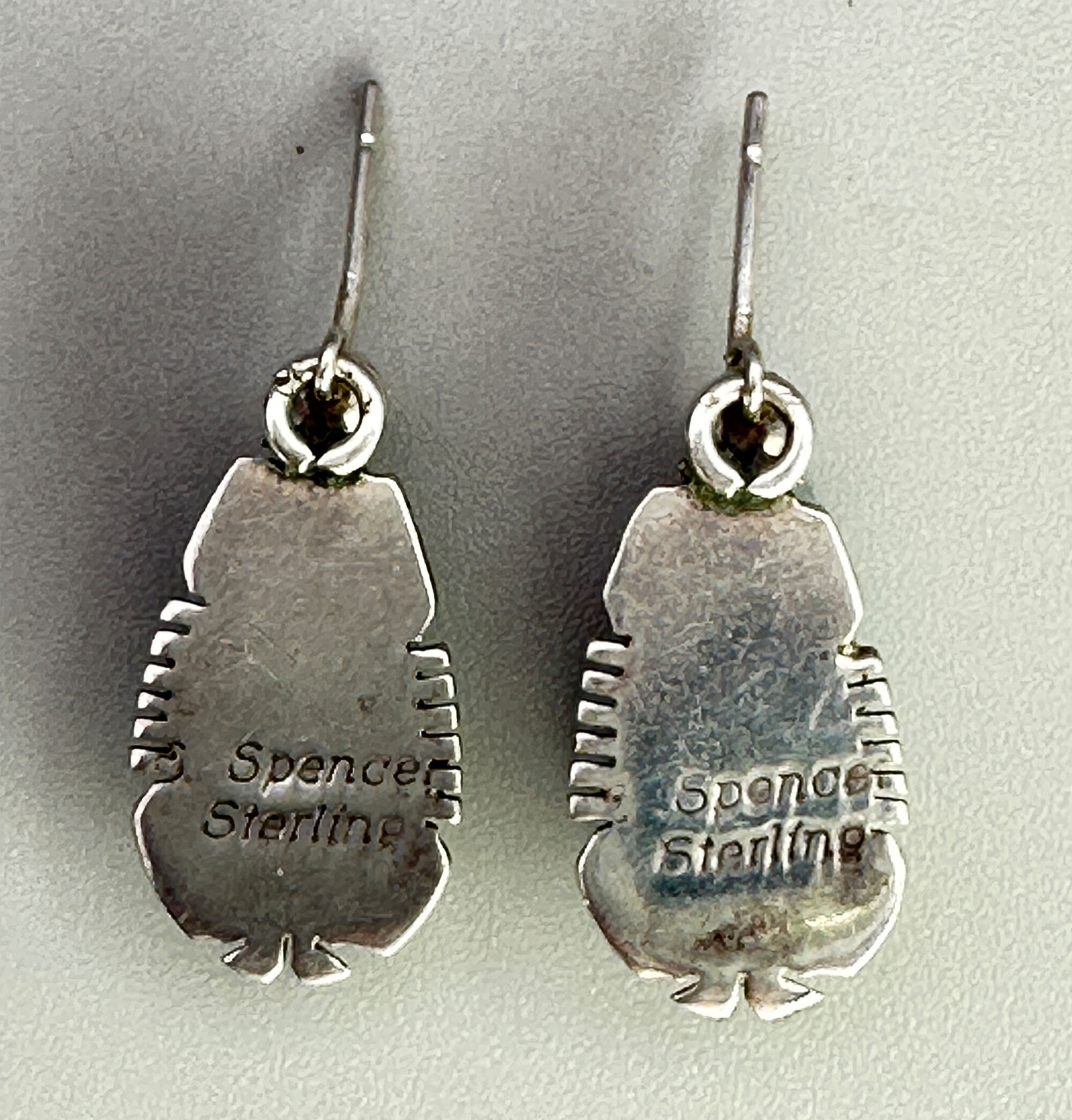 This is a very rare pair of earrings that are set with large pear shaped opals from the Spencer mine in Idaho. They are set in a typical Native American setting, most likely Zuni. They are marked Spencer Sterling to indicate the origin of the opals.| Size: | Opals are 15 x 8 mm |