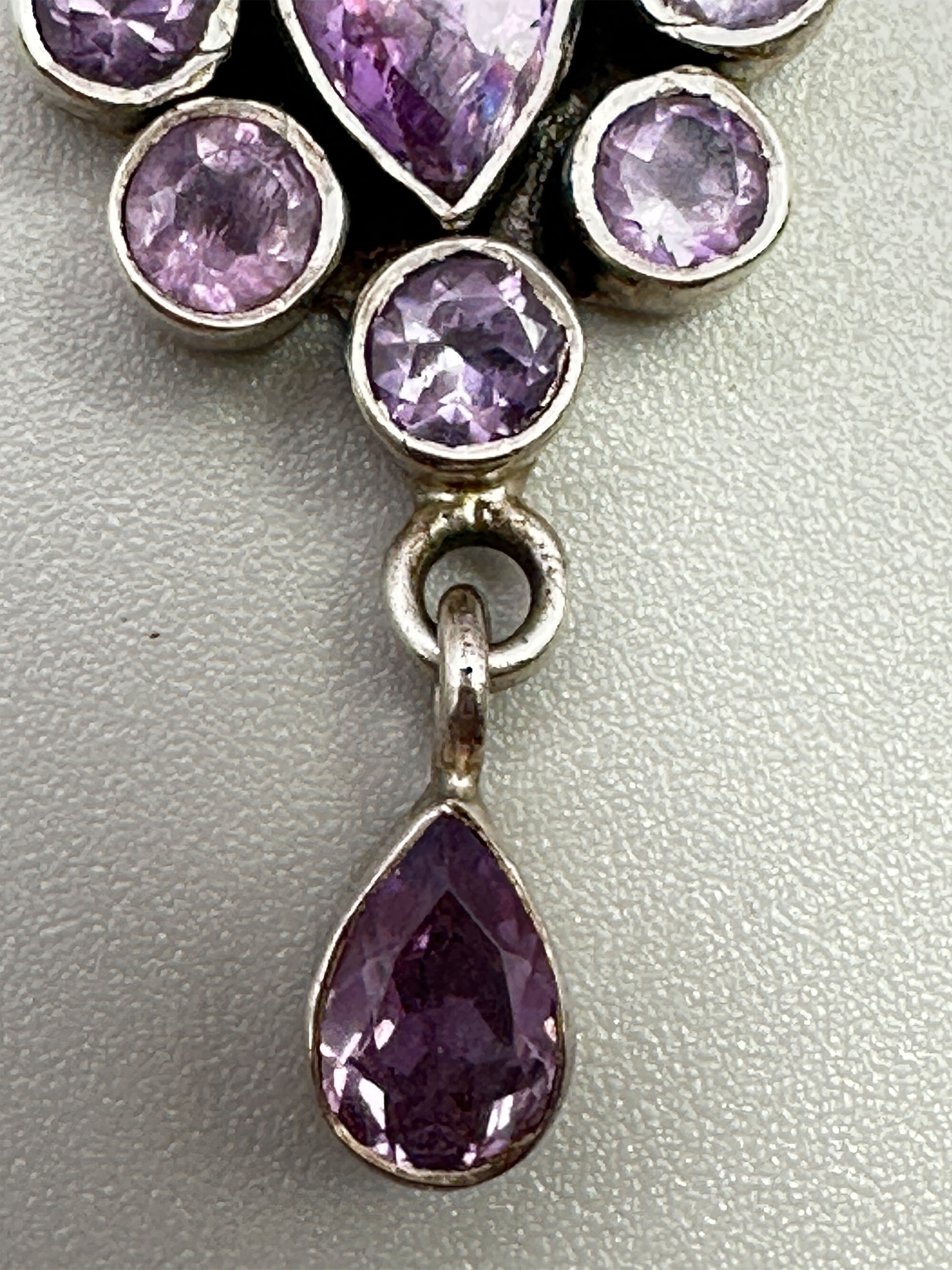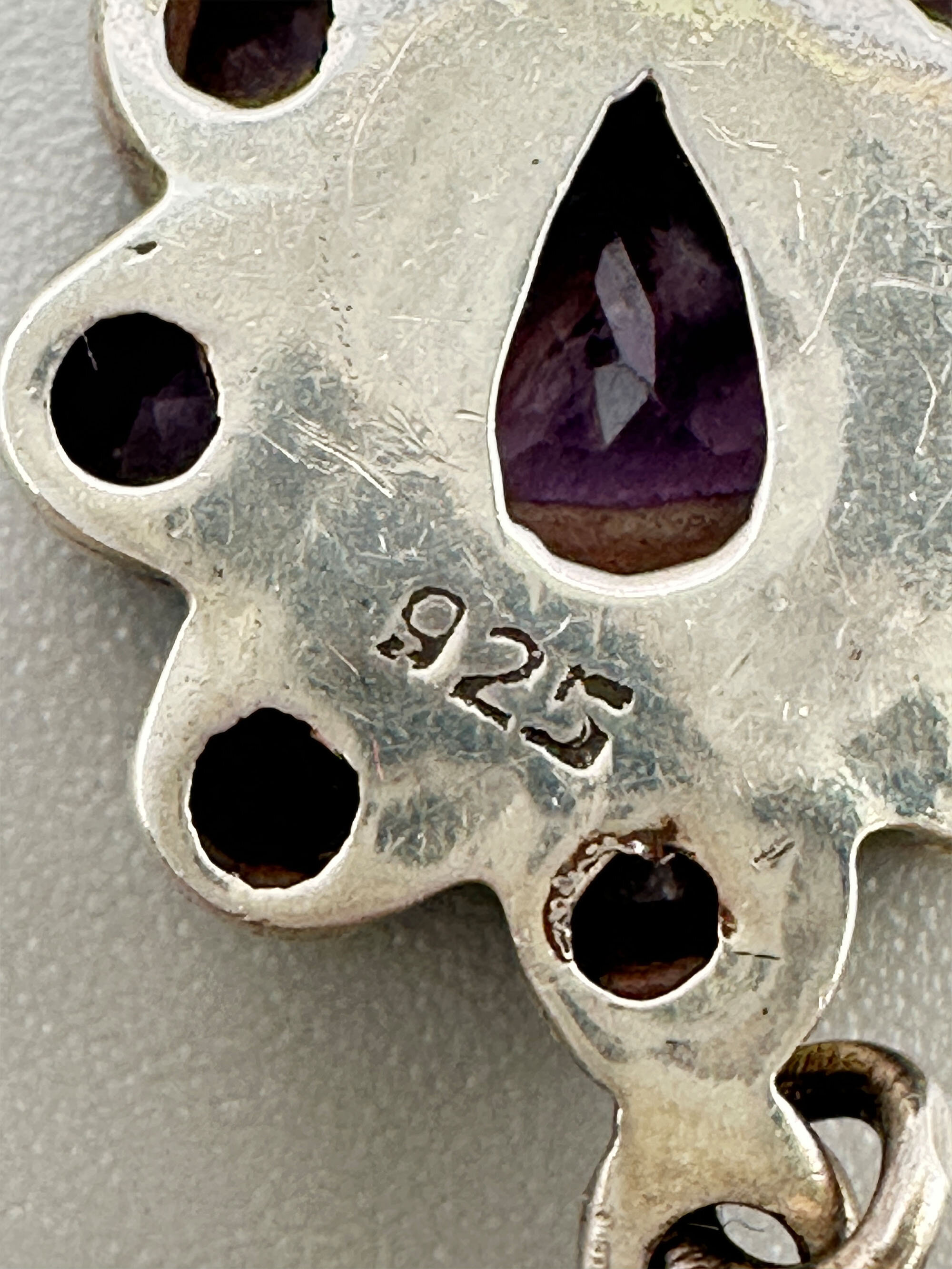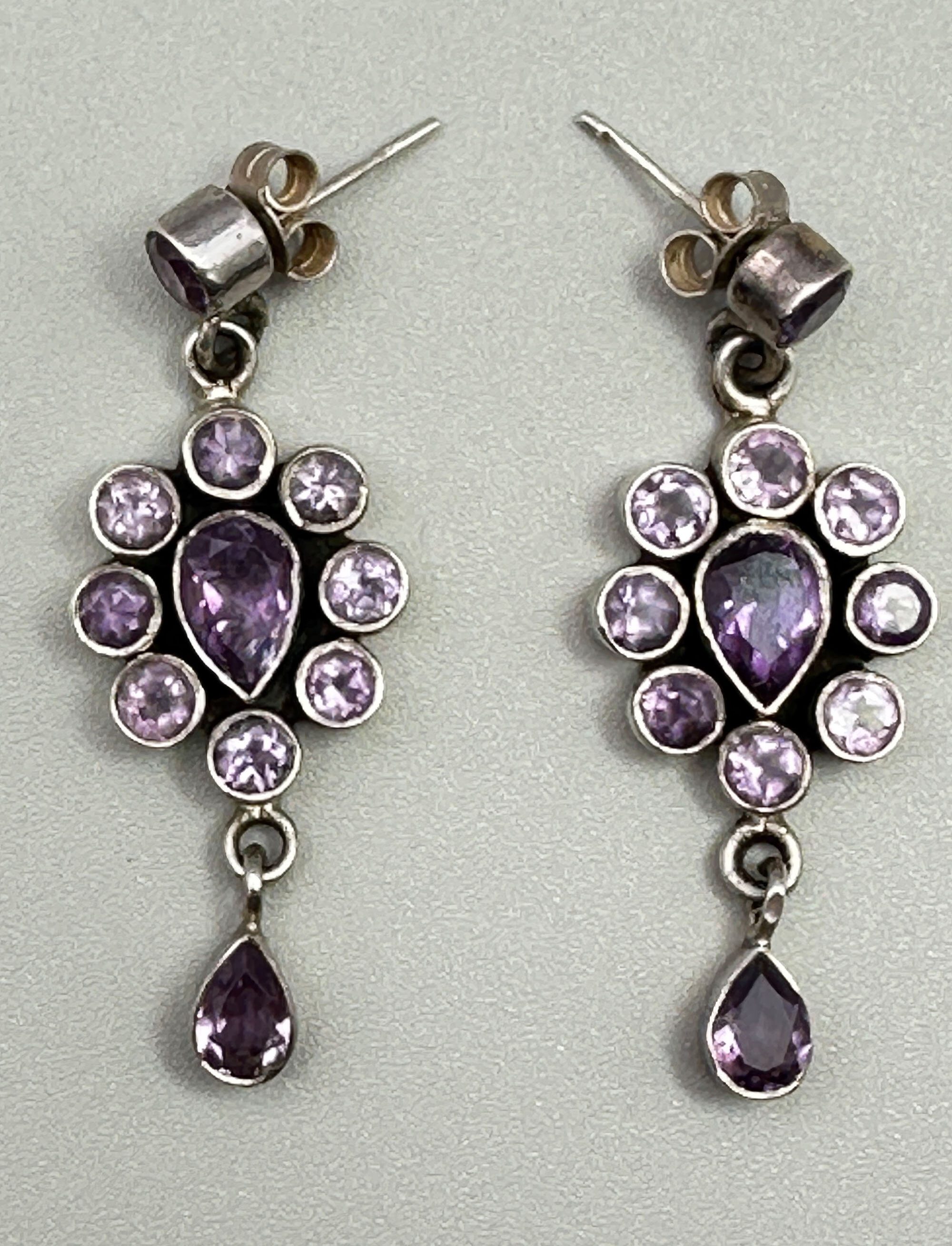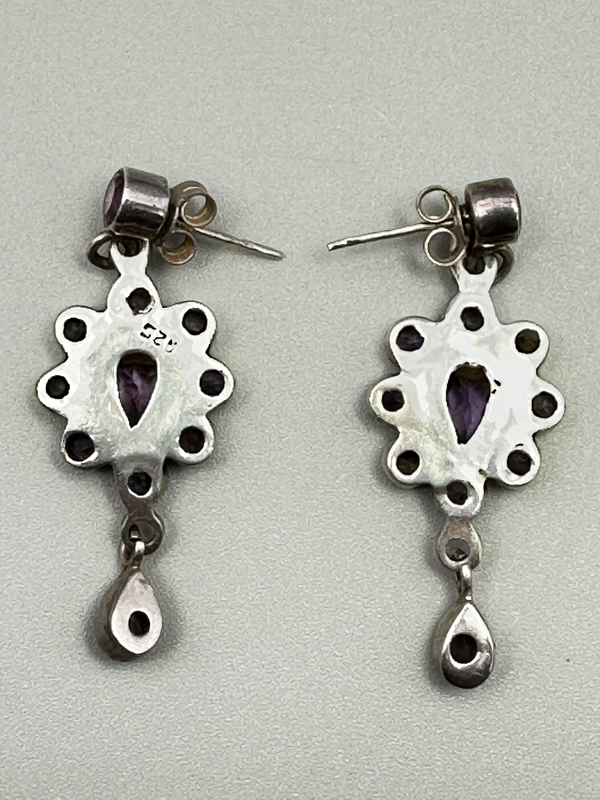 This a quite indricate paid of earrings bezel set with 11 amethyst stones. The stones are great quality with lots of sparkle. They are post and butterfly and are marked 925. They are most likely Indian in origin.| Size: | 47.4 x 17.3 mm |