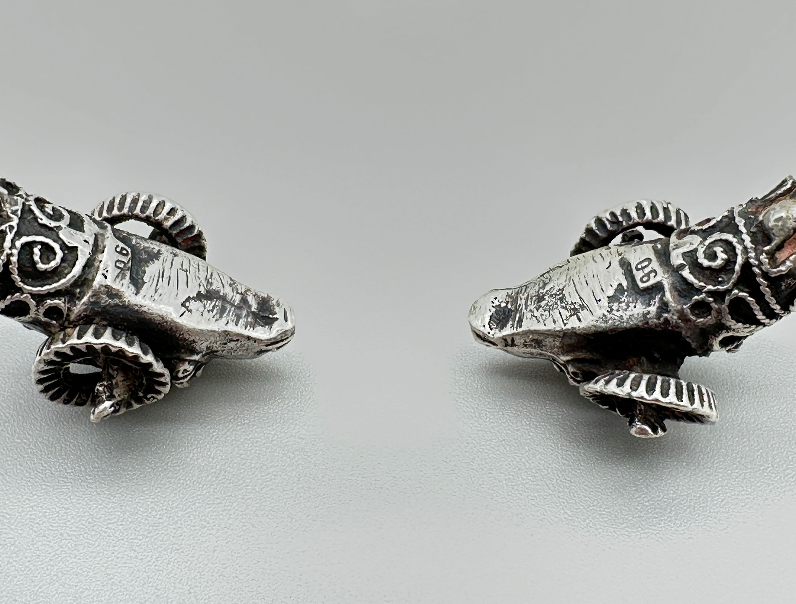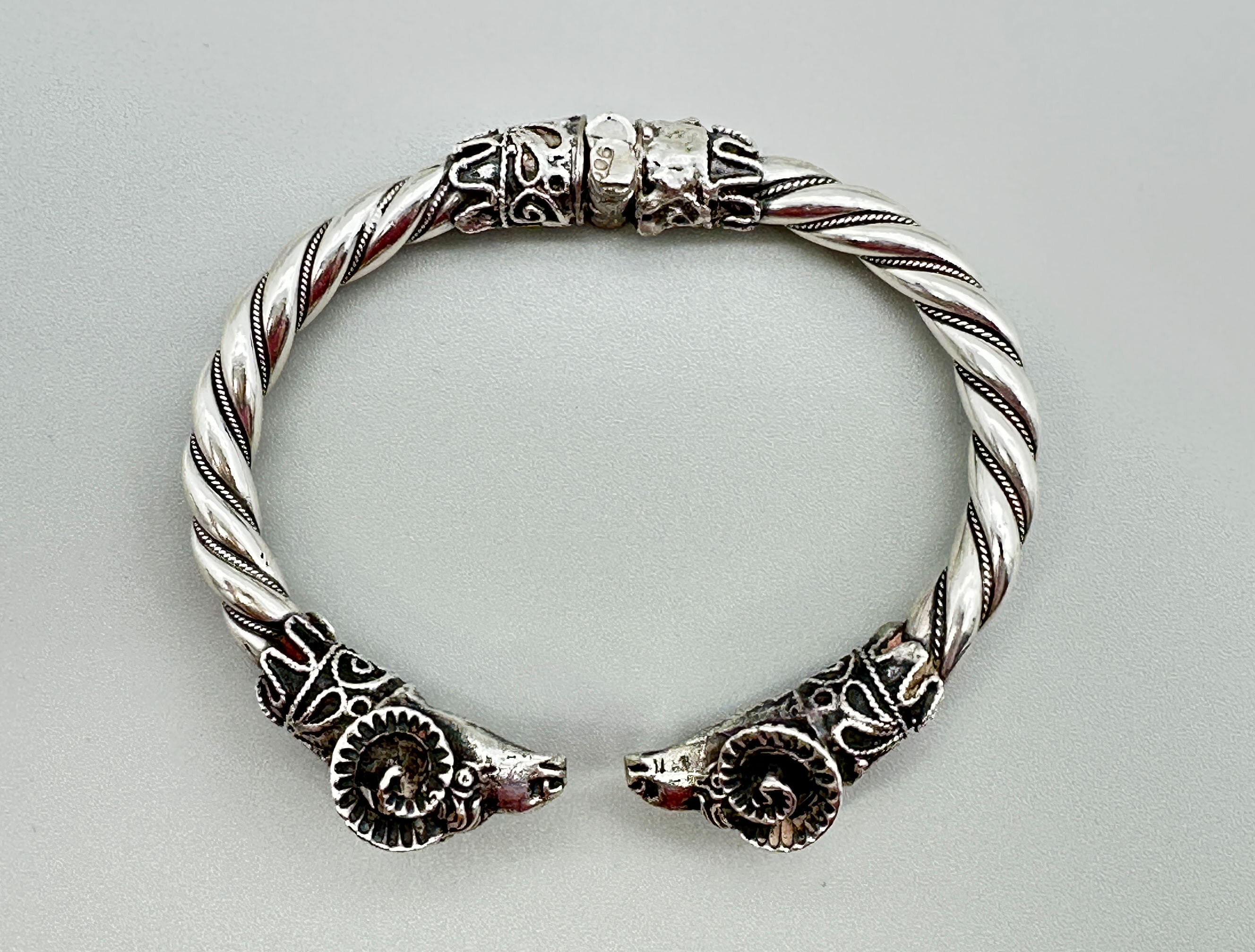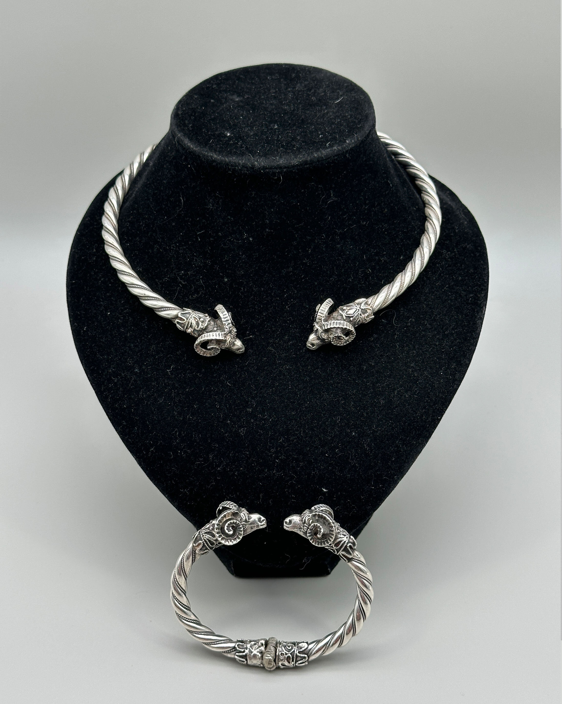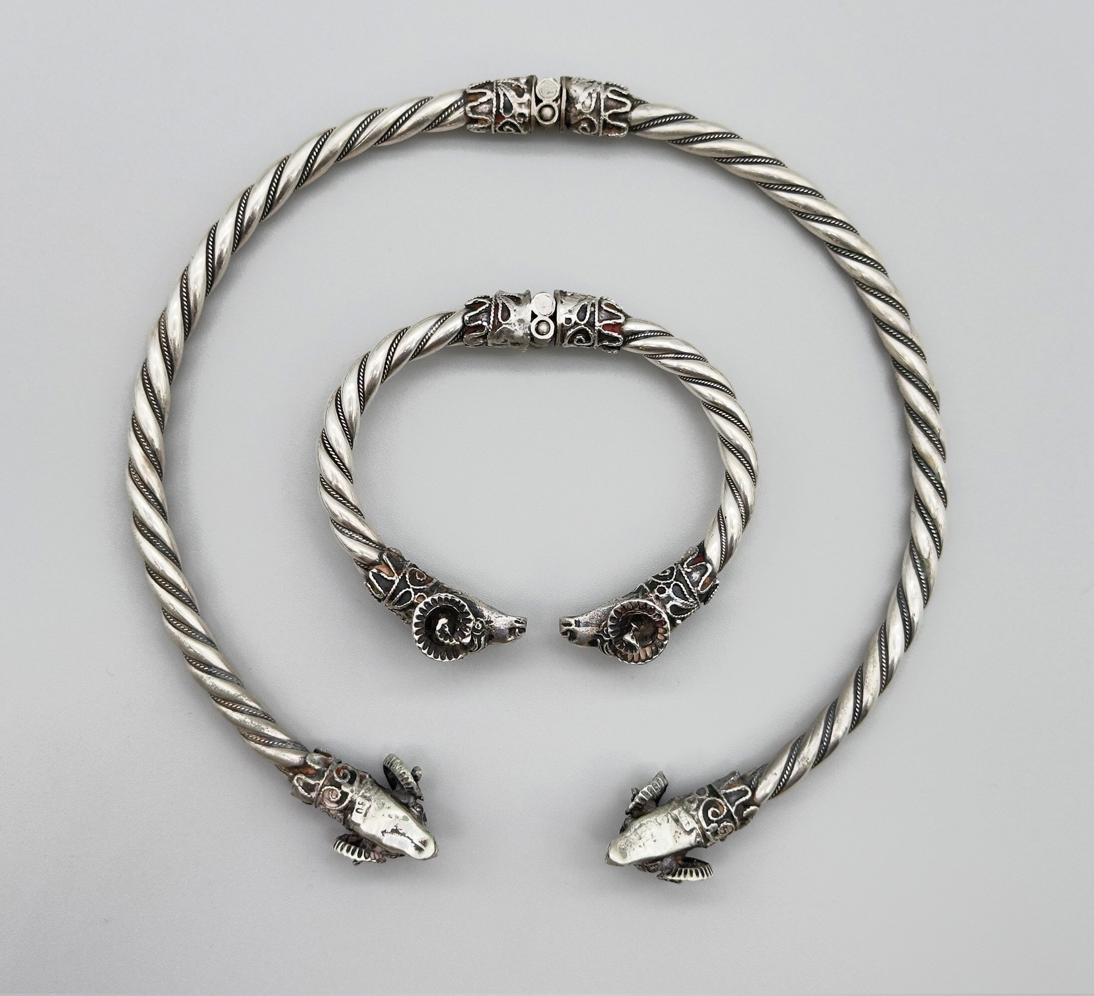 This is a very rare set of a necklace and bracelet that is Indian in origin. It is very heavy and has a twisted design with dual rams’ heads. The rams’ heads are very detailed, and this quality continues throughout both pieces. Both have a very strong bolt type clasp that allows the two pieces to open and then it is locked in place. The clasp mechanism is crafted from iron and not silver. This is to ensure that it remains strong and in position. This design is very well known in many cultures but is probably best known in Greek and Etruscan jewellery. These pieces might have been commissioned and were most likely made for a man. The size fits both genders but it is so chunky that it doesn’t seem likely to have been made for a woman during the 1920s. They would look great on anyone today!| Size: | Ram's heads measure 20.3 mm wide and 30.6 mm long, shank measures 6.6 mm wide, necklace measures approx 50 cm, bracelet measures approx 18 cm |