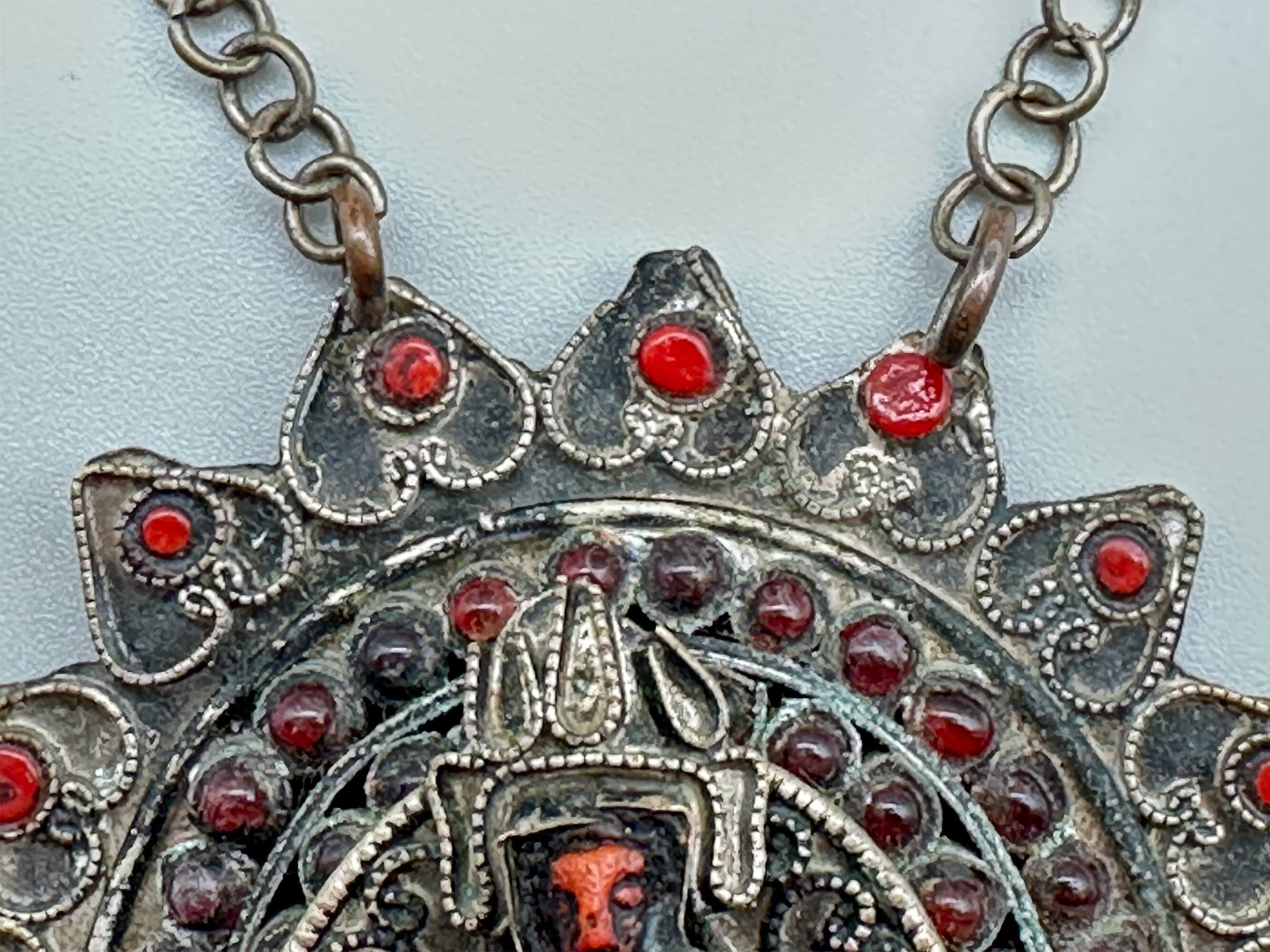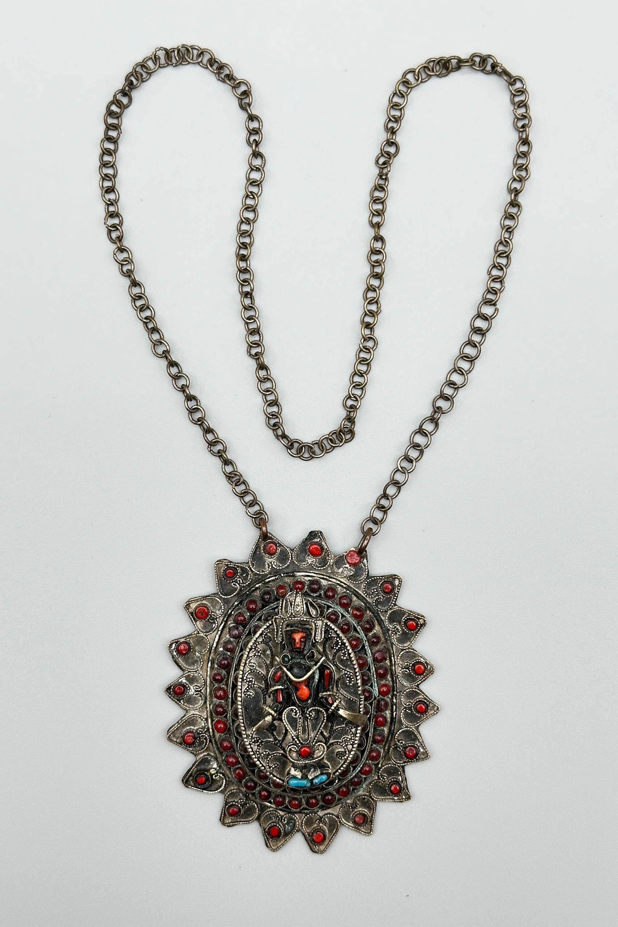 This is very interesting necklace that comprises a very large amulet or talisman in a flower shape, which is built up in steps and features a figure holding a sword. It is made from brass, that would have had bright gilding in its time. It is mounted with garnets and enamel work. There are some stones that appear to be turquoise and coral although these might be enamel. There is also an embossed lotus flower on the back. The chain on this necklace is quite short for it to fit over a modern head so it would probably need a clasp in addition.| Size: | Amulet : 84 mm x 70 mm; Chain : 20 cm |