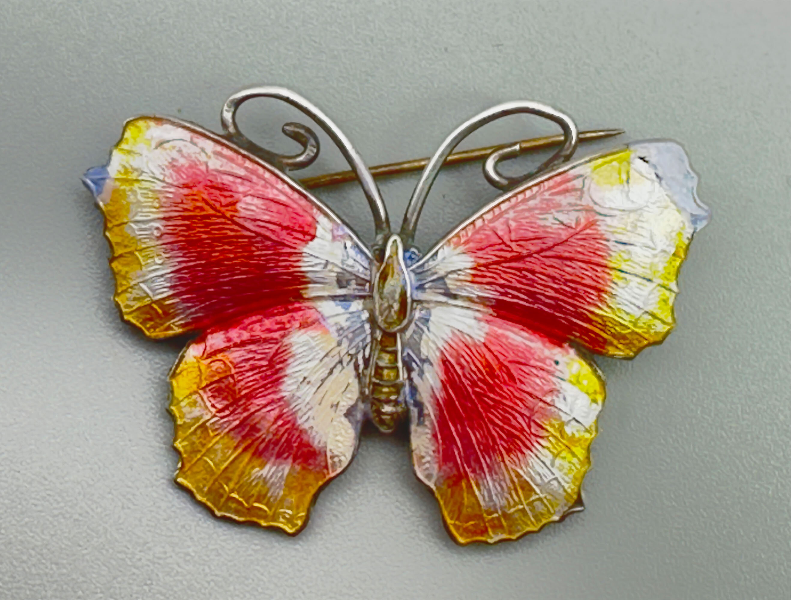 Pink and yellow enamel butterfly brooch, Norway c1950