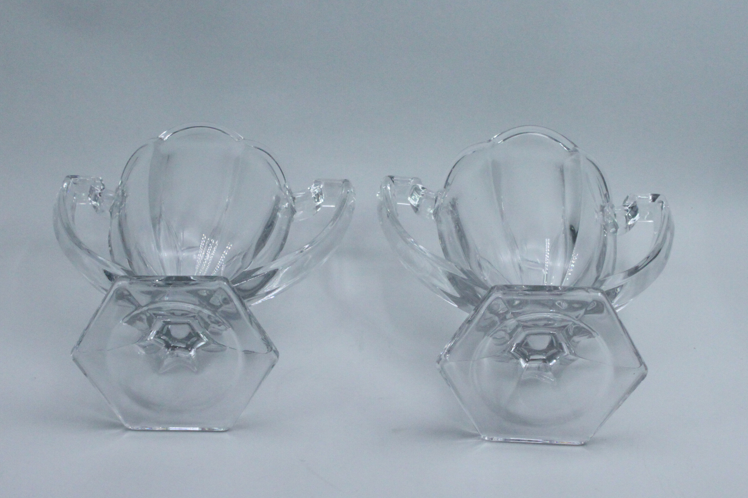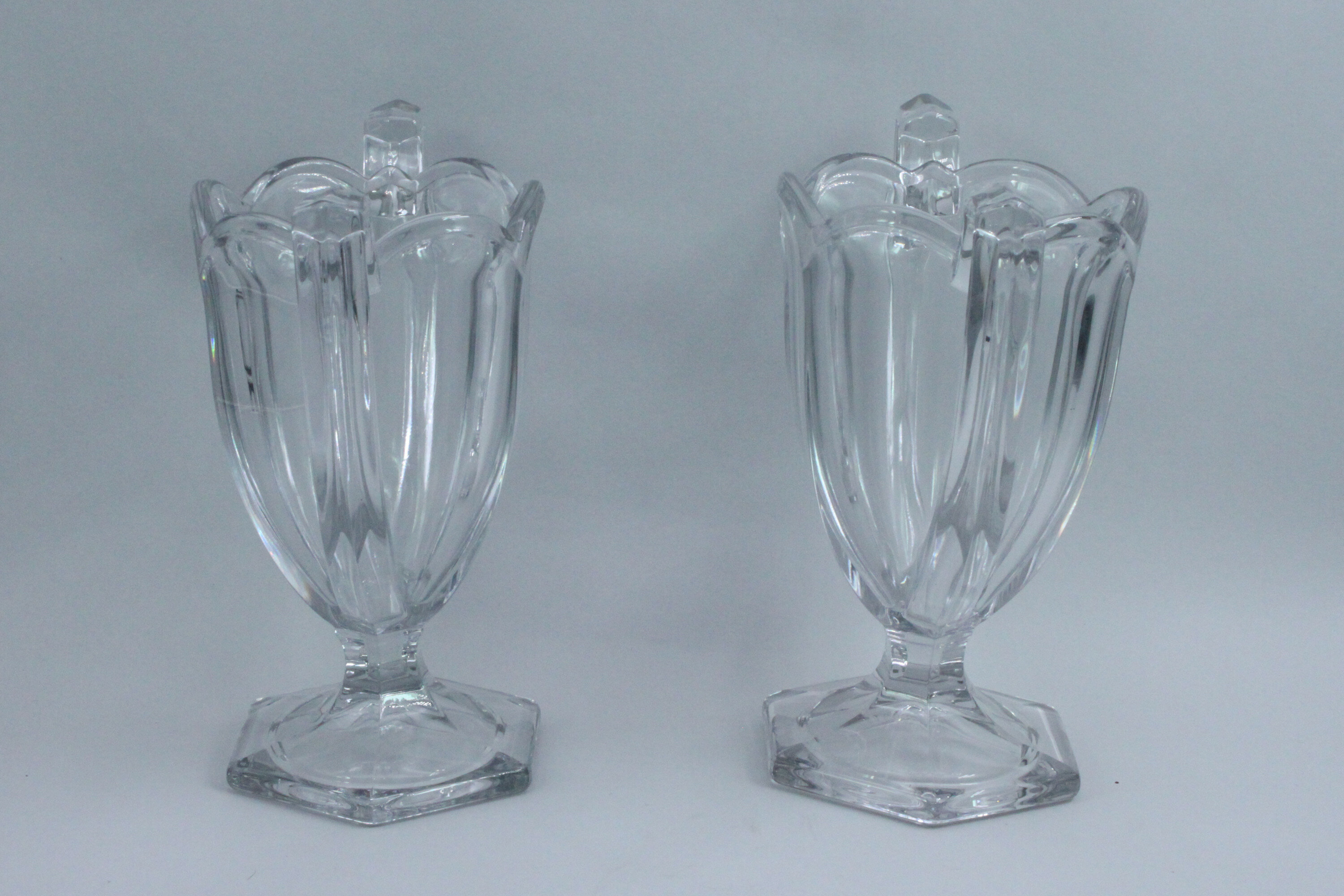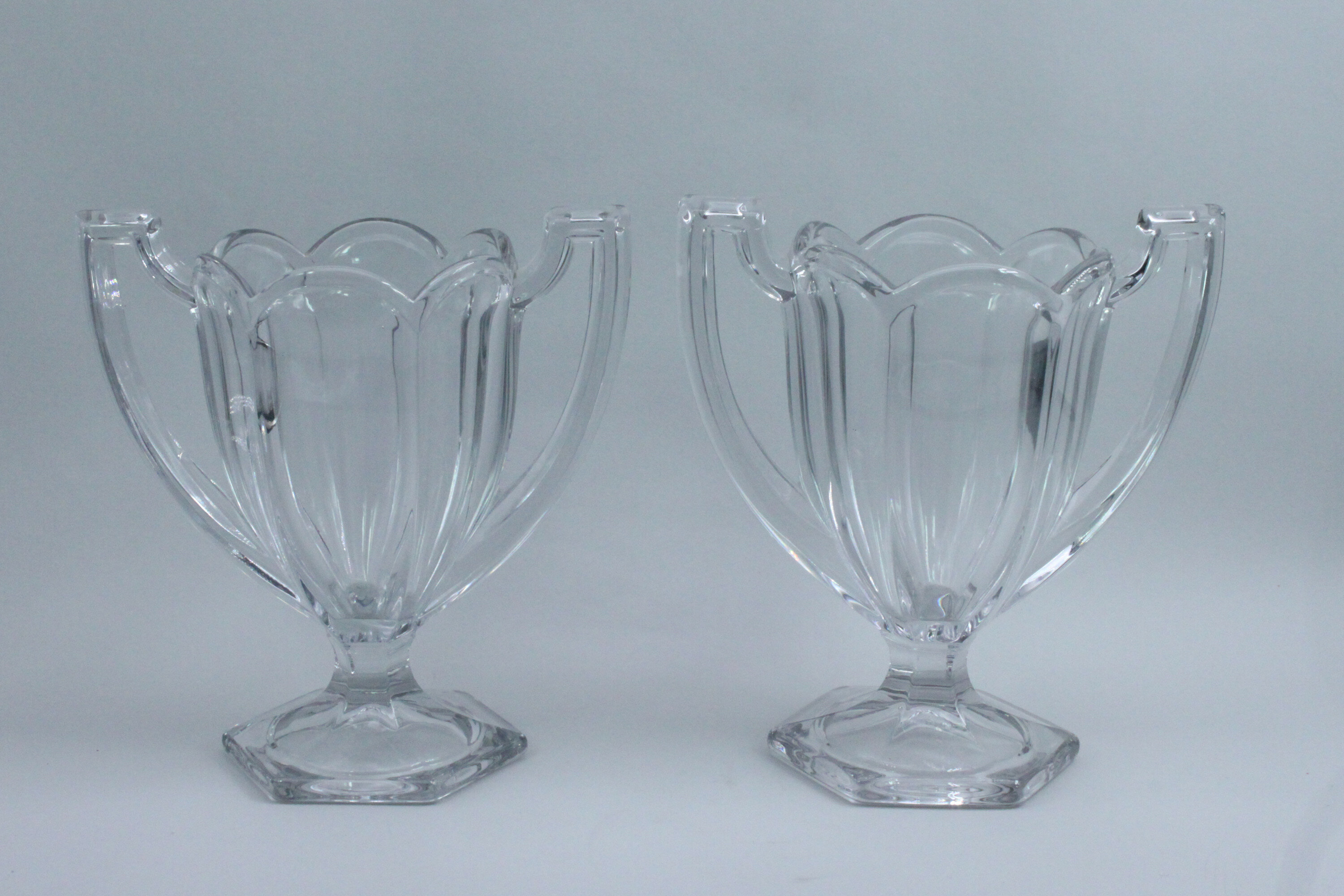 A Pair of pressed glass vases of hexagonal form, the rounded body with a lobed rim and standing on a shaped foot, two handles to the sides in the shape of a trophy. These pieces resemble similar designs in clear pressed glass made by the Davidson factory in the 1930s. George Davidson founded the Teams Flint Glass Works in 1867, which later became known as George Davidson & Co. In the 1880s the company began producing pressed glass tableware in a variety of shapes and by the 1920s their designs began to reflect the new Art Deco trends. The firm continued production until the 1980s, closing in 1987. These vases come from their 'Chippendale' range and were probably made in the 1930s. It has been suggested that this and other similar forms were intended to hold celery. Normally sold singly, it is less common to find a matching pair with their obvious decorative potential.| Size: | Ht 20cm (max), Width 18.5cm (max) and 19.5cm (max), Width 19cm (max) |
