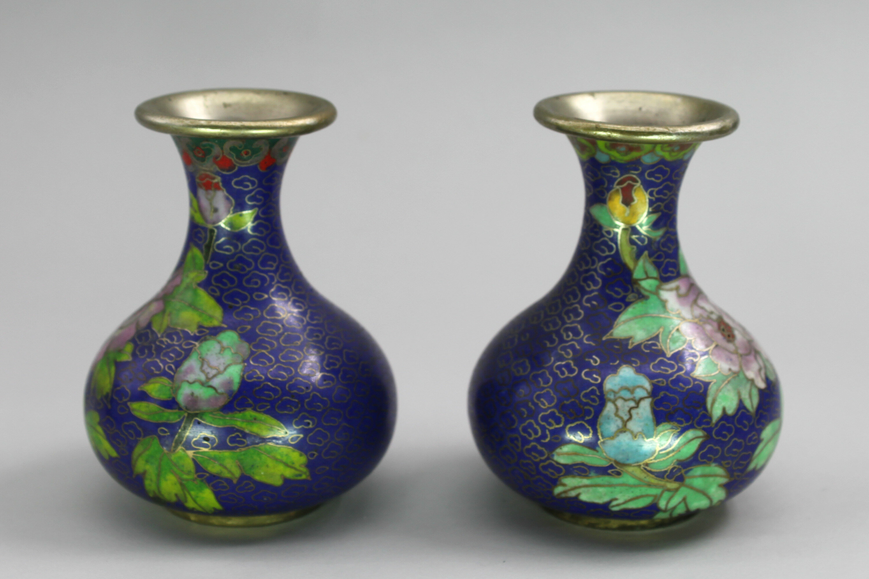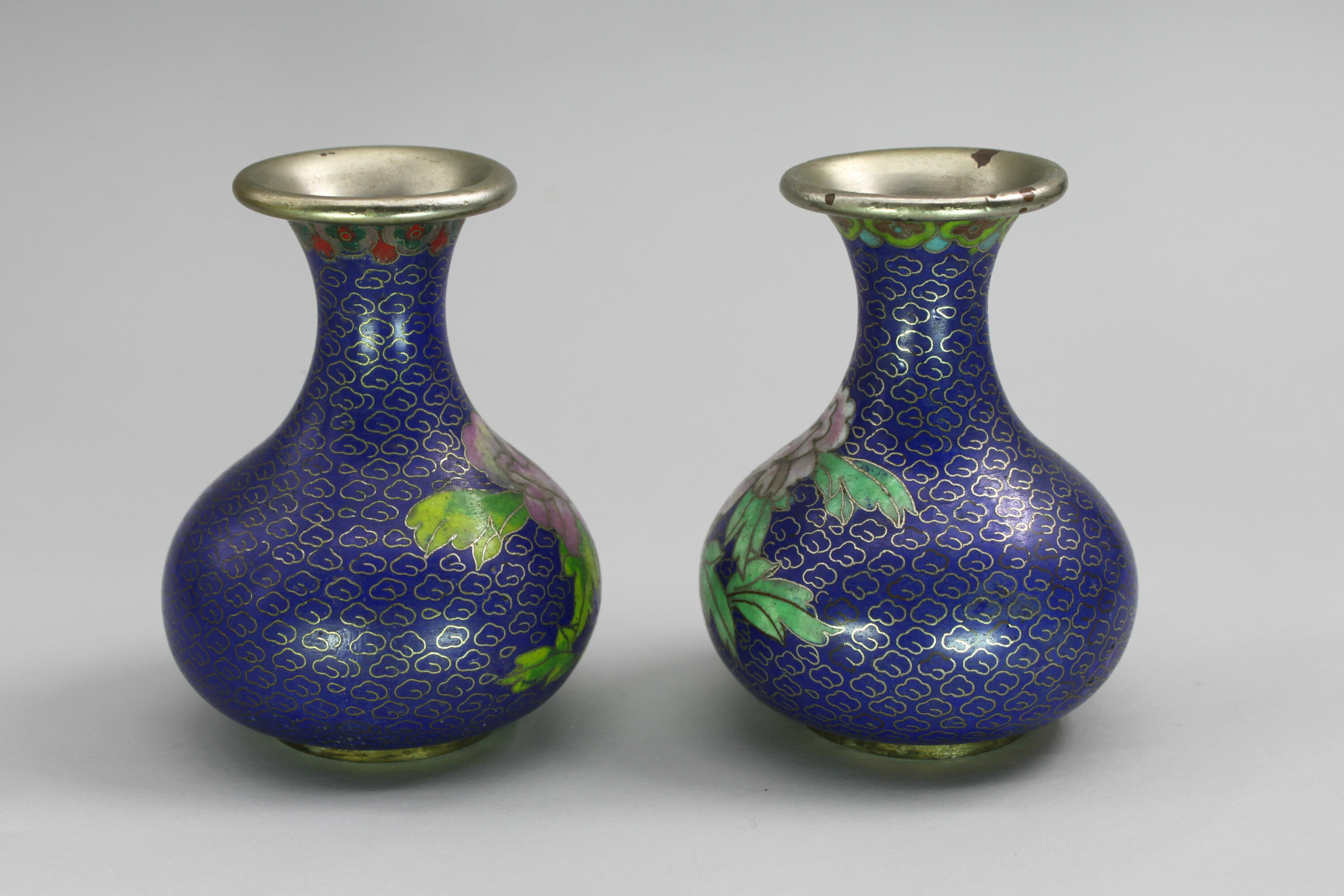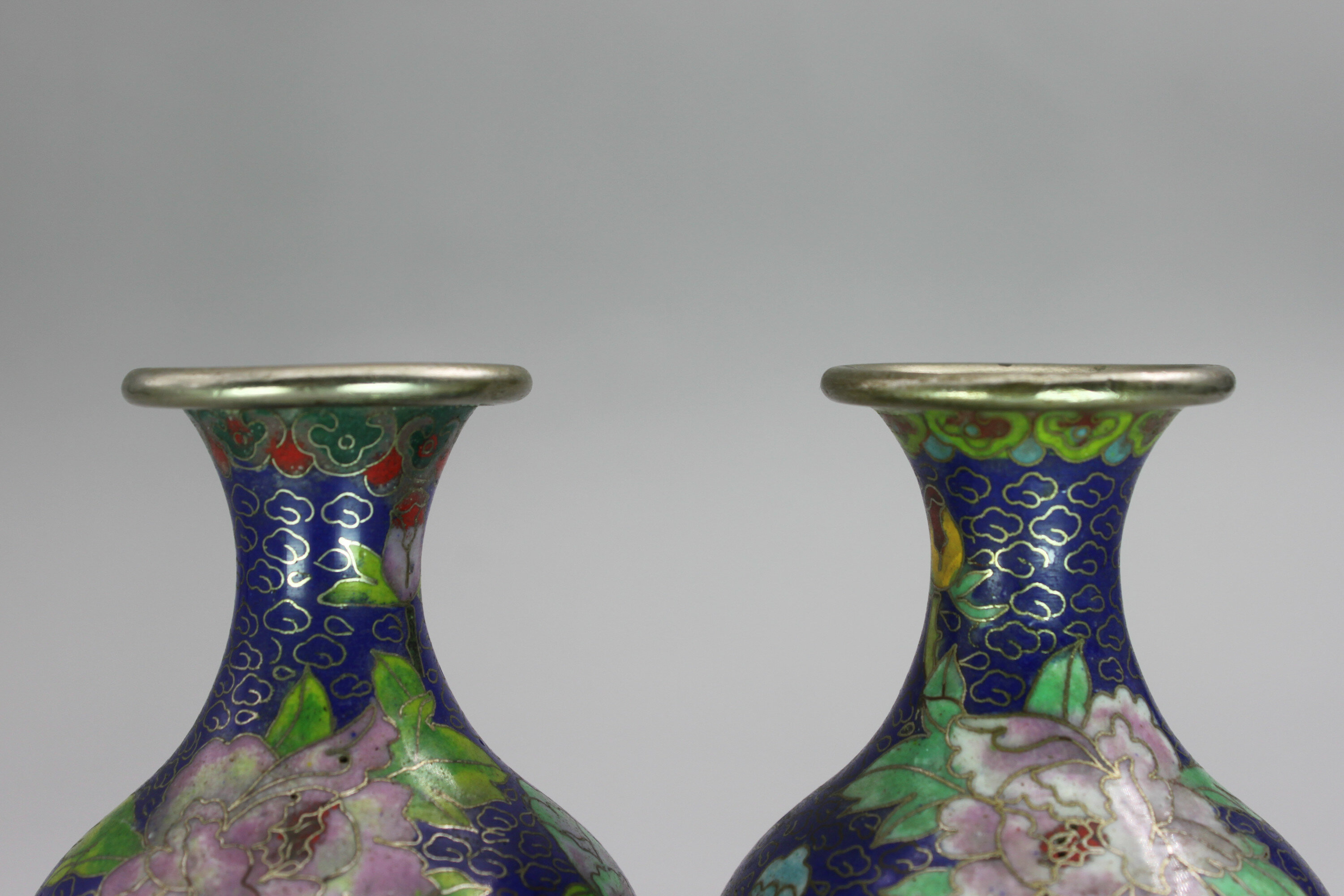 A matched Pair of Chinese Cloisonne Vases of squat bottle form with broad bodies and a slender flaring neck, decorated with flowering peony on a blue enamel ground with a gilt wire design of stylised clouds, the bases with two bands of overlapping semi circles and the tops with a band of repeating ju'i lappets, the top interior rims finished in metal and the bases with a gilt foot rim enclosing blue enamel. The designs on these vases match very closely and the peony flowers are in mirror image but the vases are unlikely to have been an original pair. Weight and style of decoration suggest a circa date at the end of the nineteenth century.| Size: | 9.5 x 7 cm |