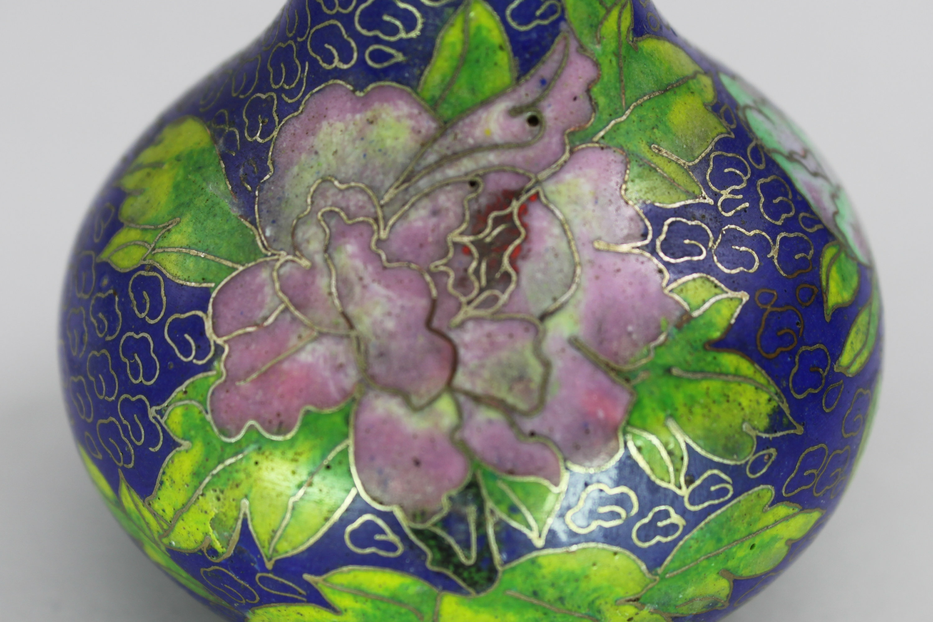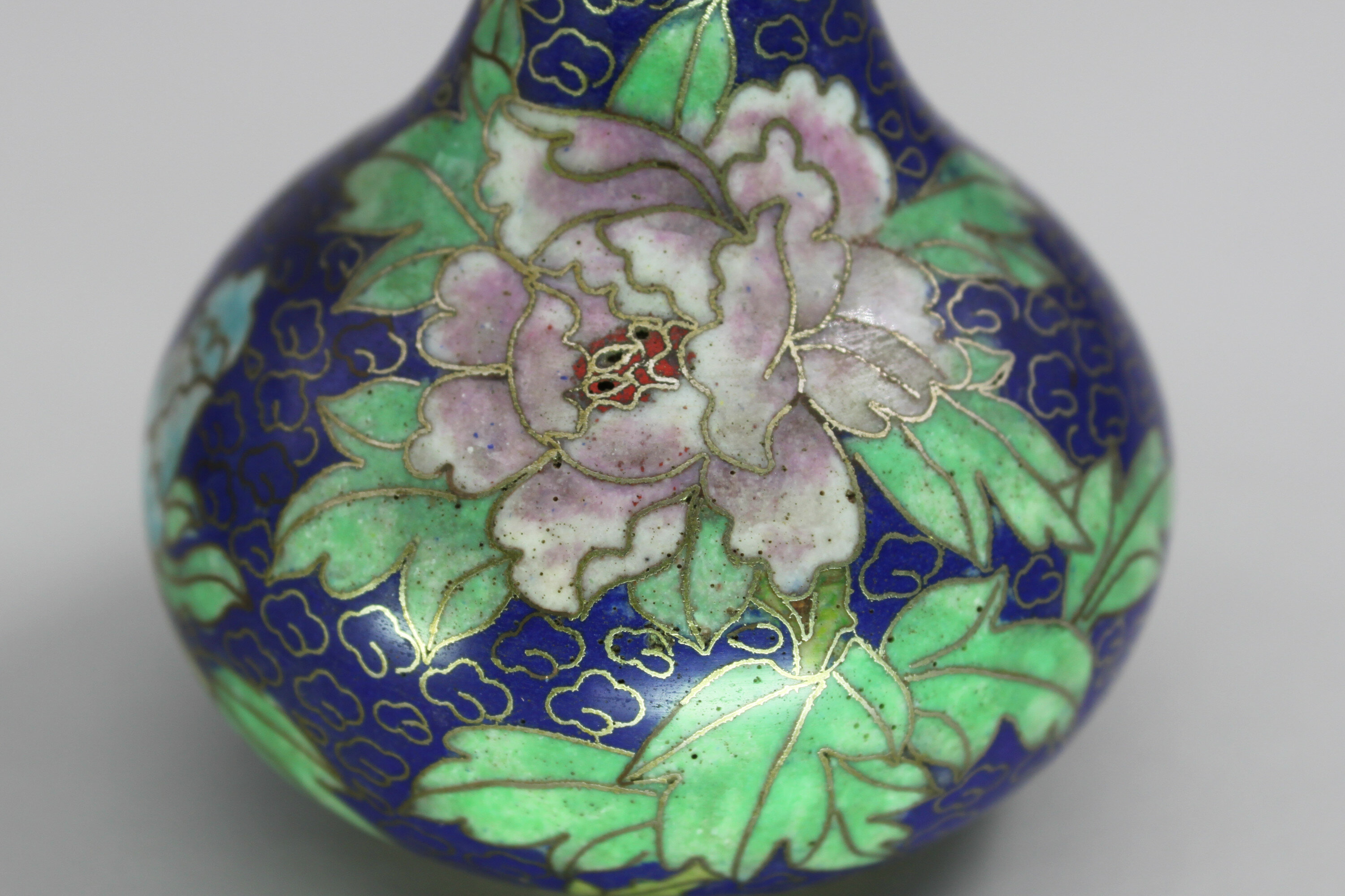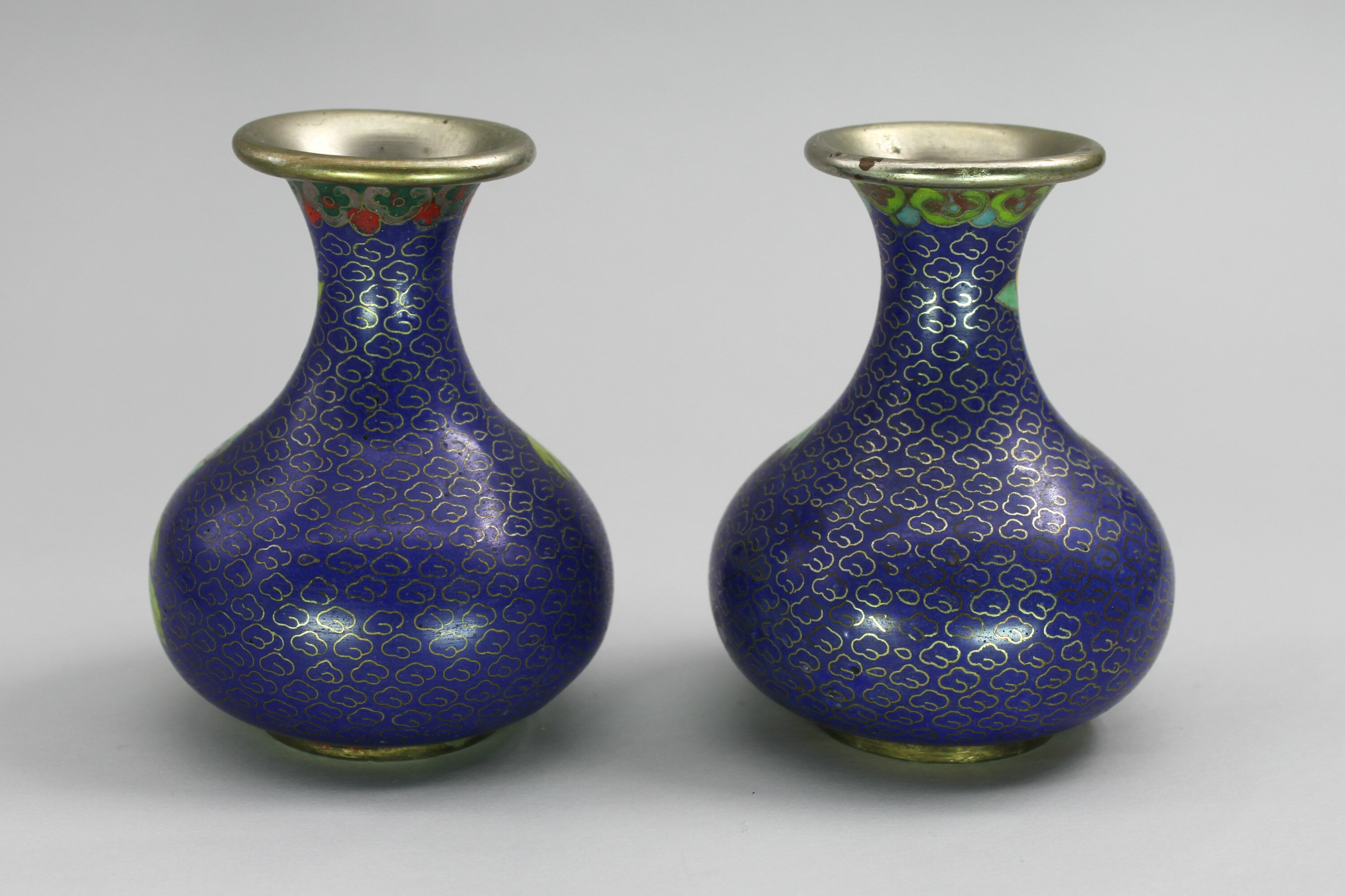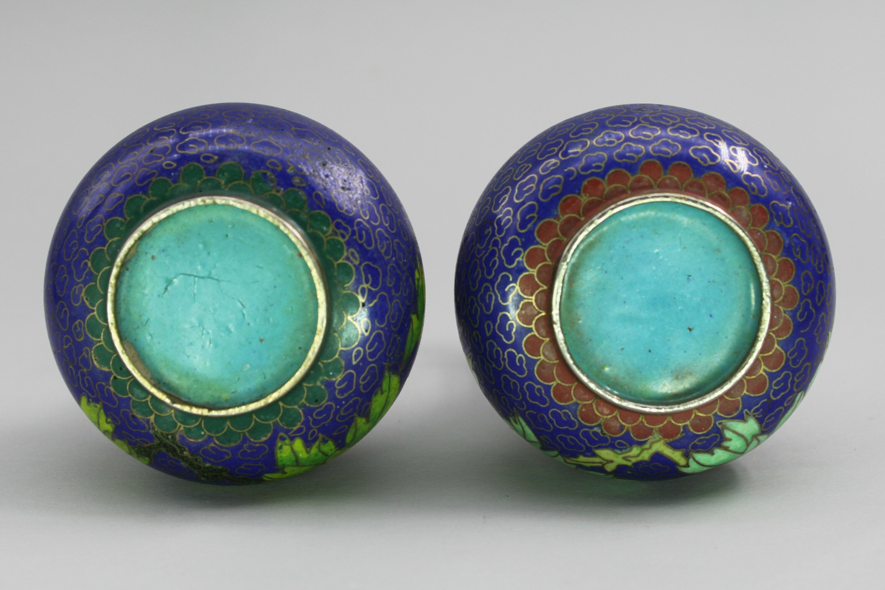 A matched Pair of Chinese Cloisonne Vases of squat bottle form with broad bodies and a slender flaring neck, decorated with flowering peony on a blue enamel ground with a gilt wire design of stylised clouds, the bases with two bands of overlapping semi circles and the tops with a band of repeating ju'i lappets, the top interior rims finished in metal and the bases with a gilt foot rim enclosing blue enamel. The designs on these vases match very closely and the peony flowers are in mirror image but the vases are unlikely to have been an original pair. Weight and style of decoration suggest a circa date at the end of the nineteenth century.| Size: | 9.5 x 7 cm |