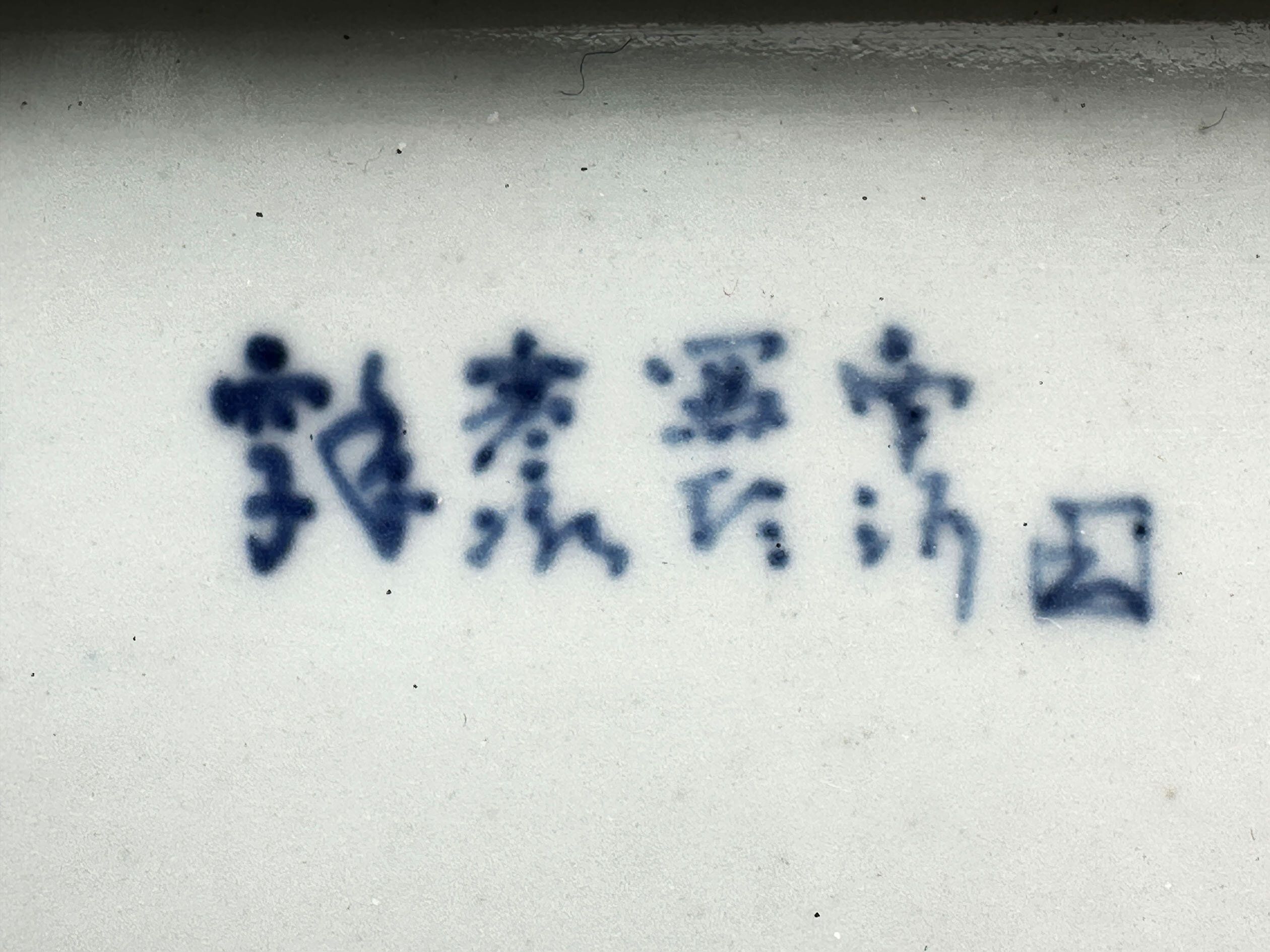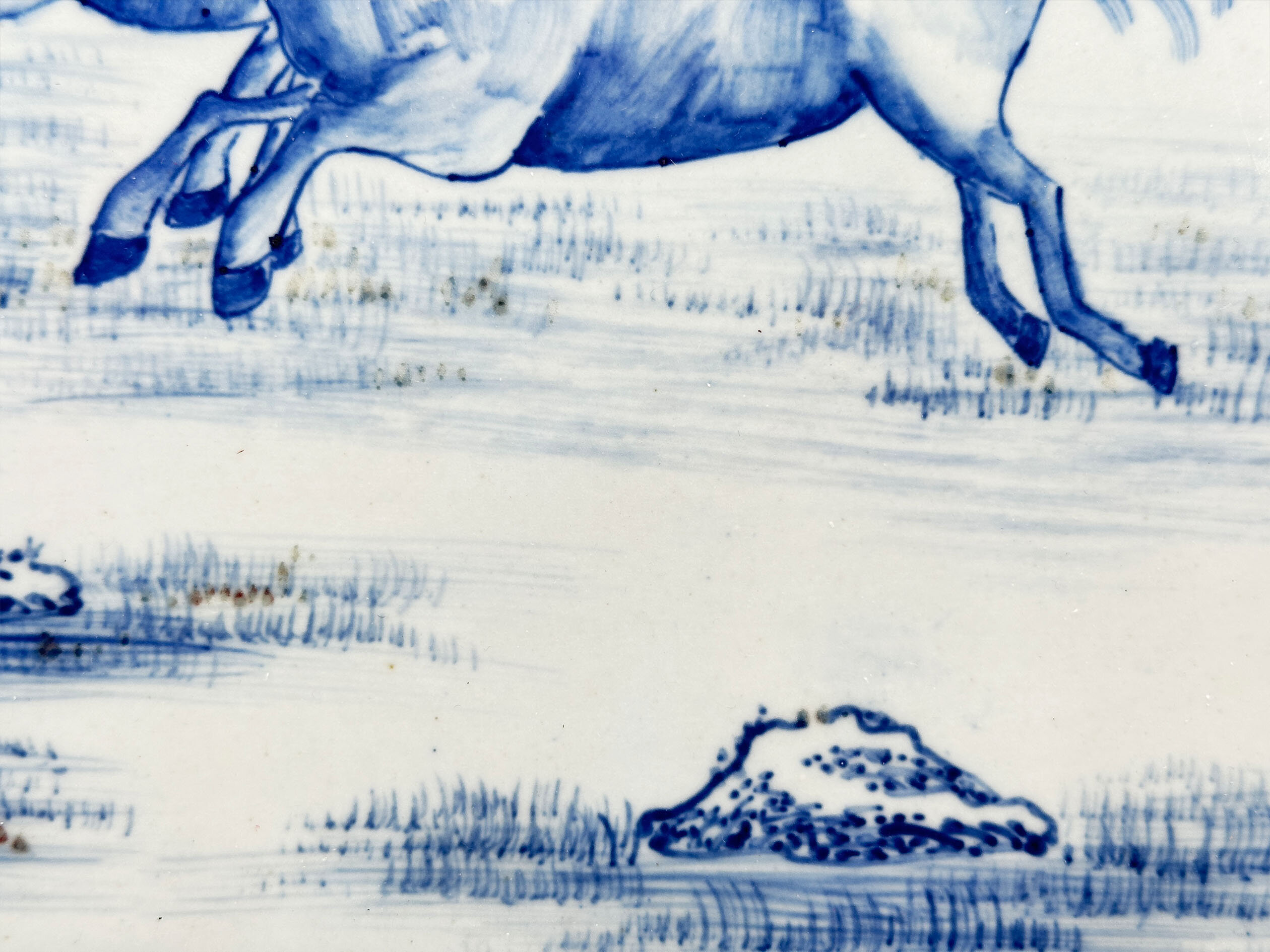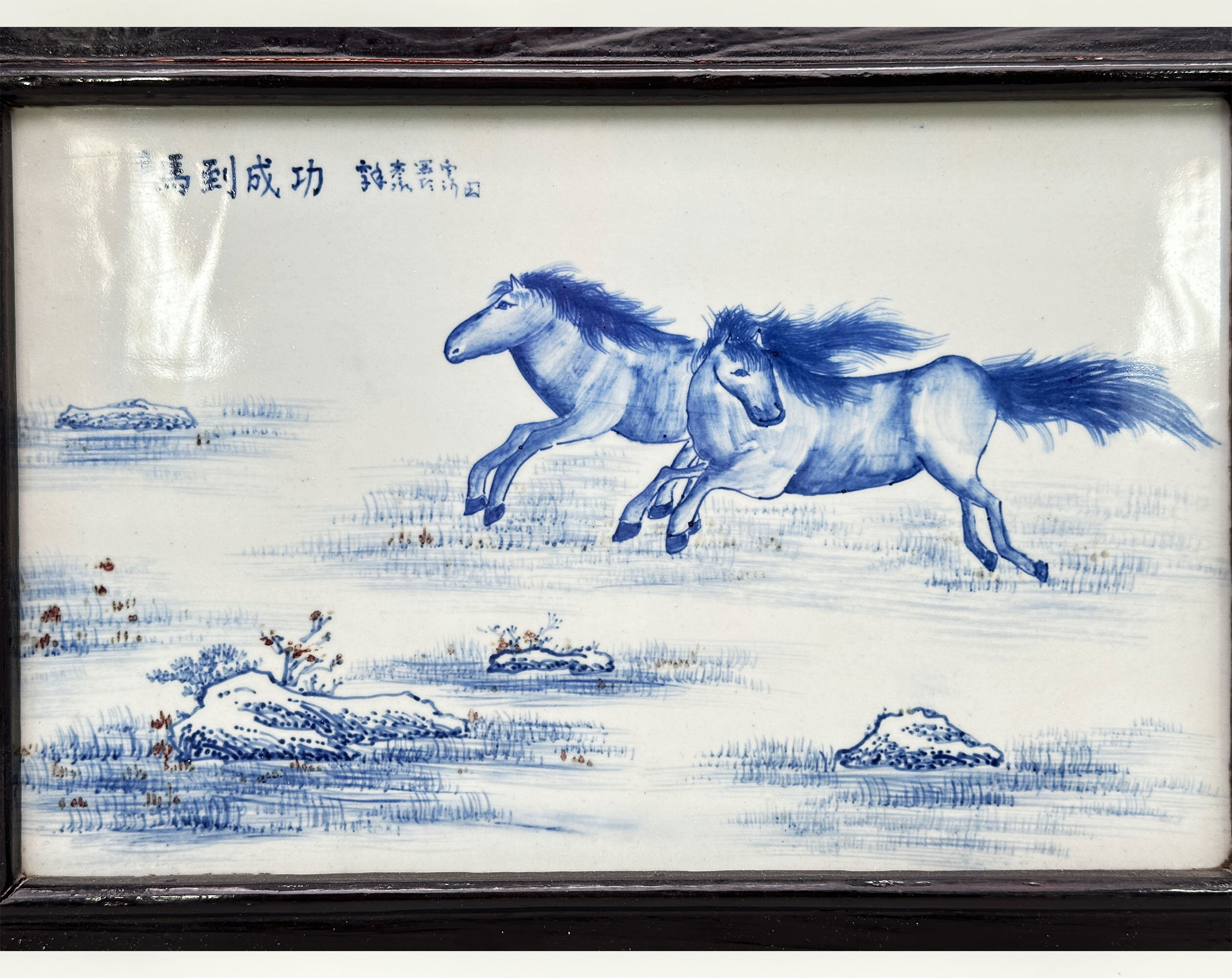 A Chinese porcelain plaque decorated in underglaze blue with underglaze copper red detail depicting two horses galloping across a field with rocks, two calligraphic inscriptions to the top left. The theme of two horses in Chinese tradition refers to harmony, partnership, and swift success. They are associated with the motto ‘Ma Dao Cheng Gong’ (馬到成功), which translates ‘horses arrive, and with them success’ and the characters of this motto are contained in the left of the two calligraphic inscriptions, the right hand inscription possibly containing the name of the artist. The style of the drawing very loosely resembles that of the famous Chinese artist Wang Bu (1898-1968), known from many fine and original works by his hand but much copied by other porcelain painters in the twentieth century. The general effect of this piece and the flat mirror like finish to the tile itself suggest a dating to the Republican period (1912–1949) and the wood of the frame is not inconsistent with this. The scene here is not commonly found amongst porcelain tiles from this period and the addition of the underglaze copper red detail, again an unusual feature, indicates no small amount of care in the production.| Size: | Frame : 48.5cm x 35cm x 2.2cm Plaque (measured within frame) 36.2cm x 22.8cm |