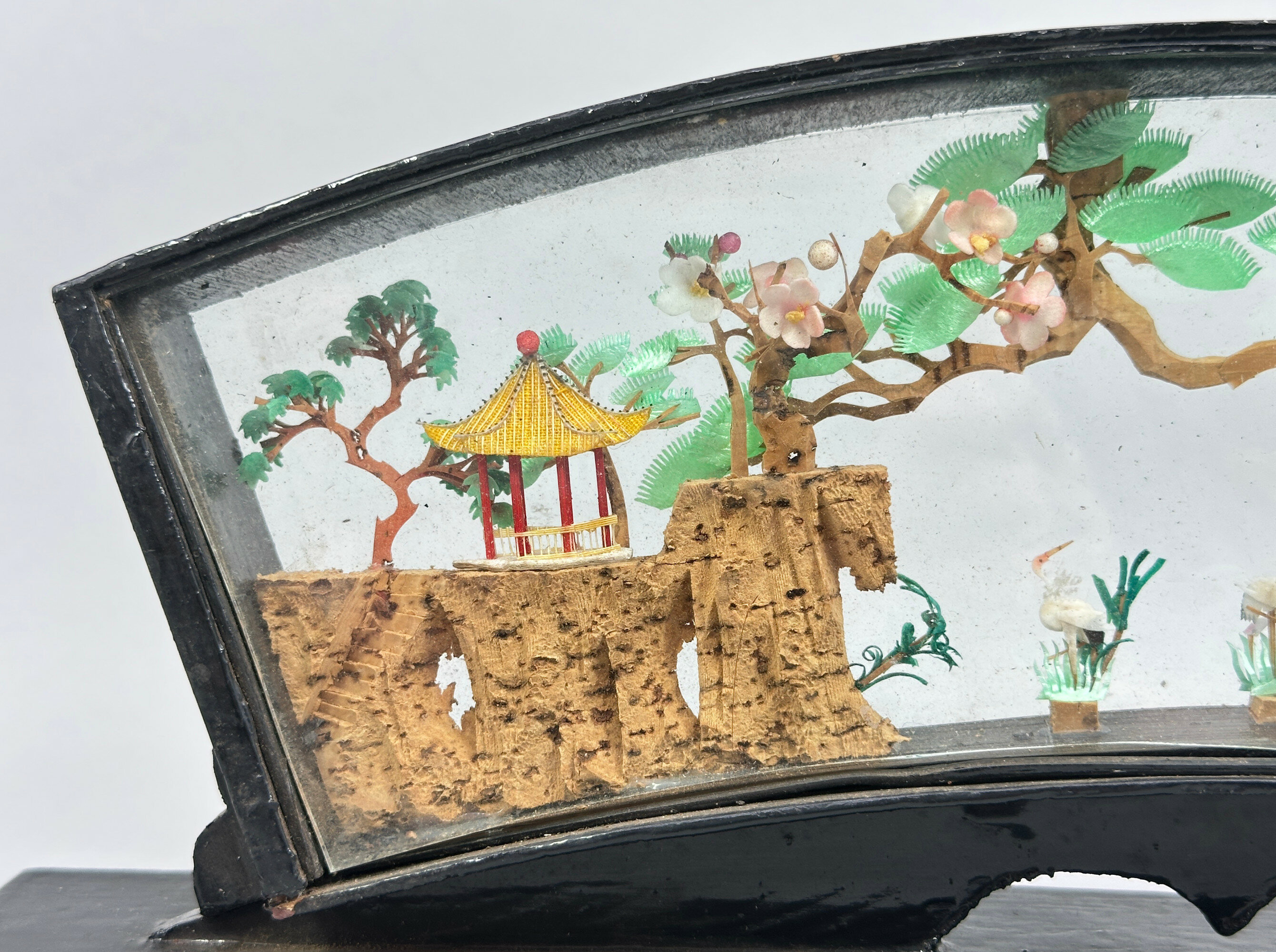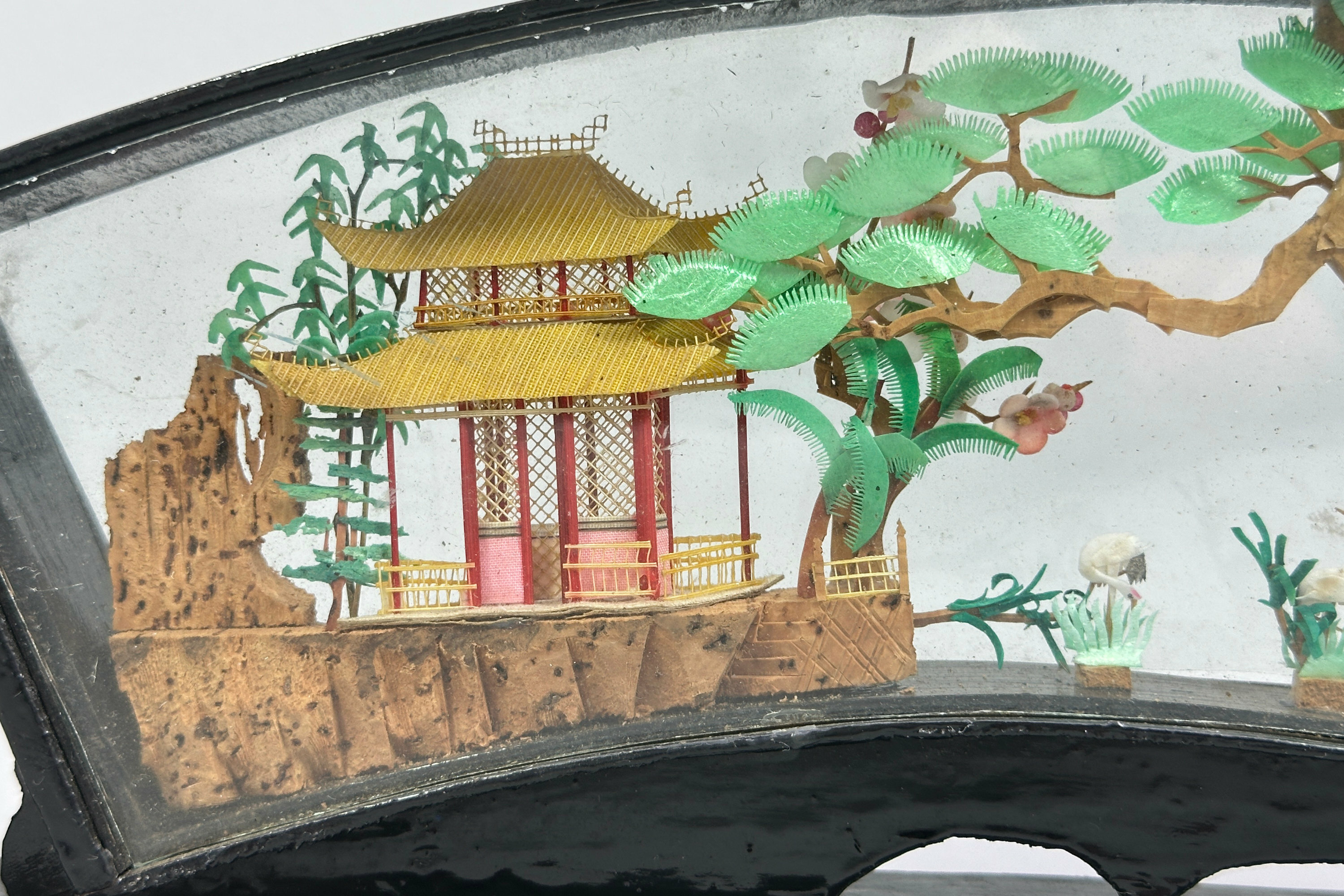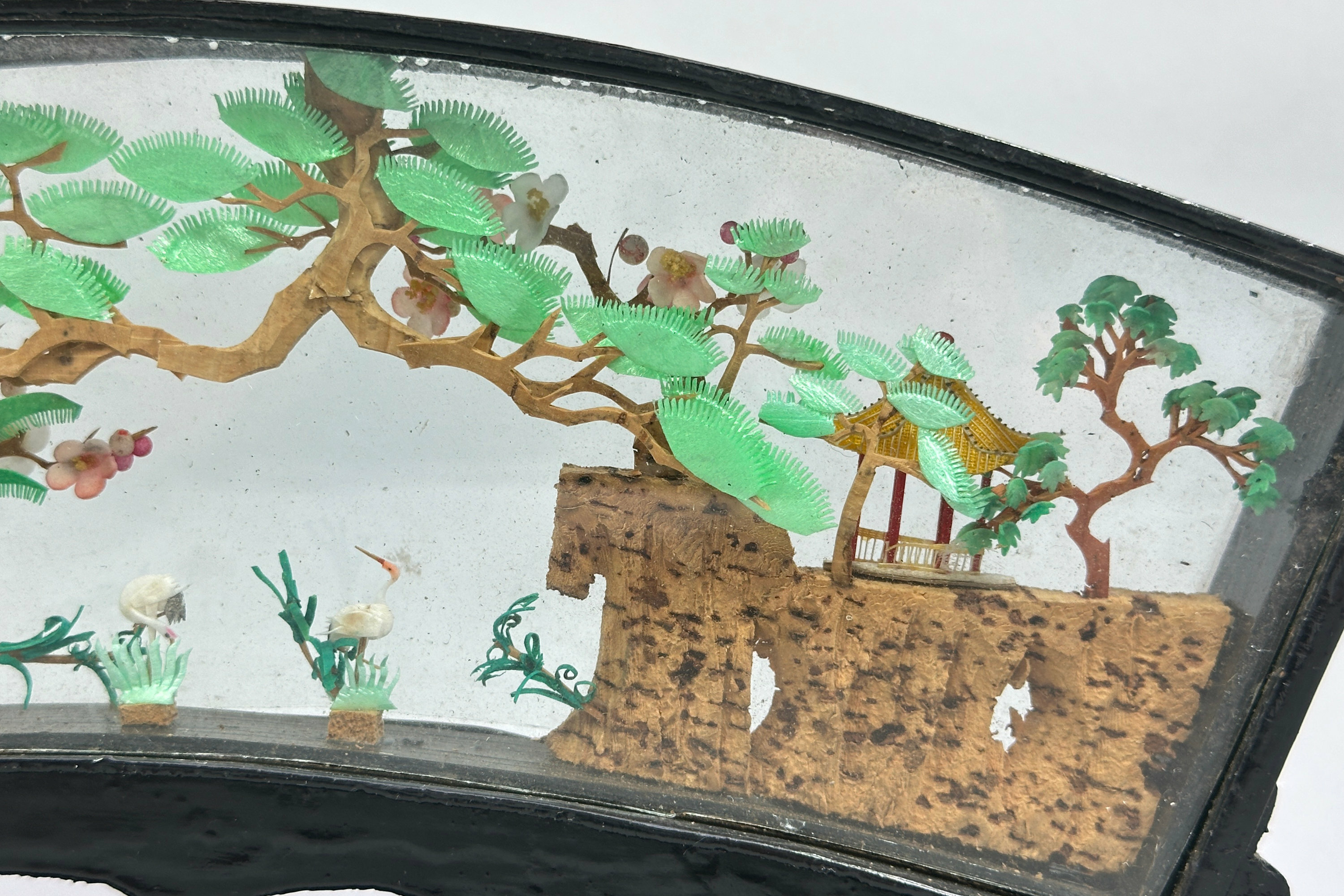 A fine quality Chinese carved and coloured cork sculpture with pavilions on rocks, pine trees and crane amidst reeds, all rendered in minute and meticulous detail and set in a fan shape glazed frame of lacquered wood set on an altar table form stand.Chinese cork carving, also known as cork sculpture, is a traditional Chinese art form depicting intricate landscapes with pavilions and animals. The cork (from cork bark of trees) is cut, carved, coloured and glued together into pictures after which it is wood-framed, usually painted in black lacquer, with clear glass protection. The tradition seems to have begun in the early twentieth century when the Chinese wood carving artist Wu Qiqi from Xiyuan village in Fuzhou was inspired by a wood carving picture that brought back from Germany to create something in imitation using locally cork for the main elements with rice paper plant to form the animals. The sculptures proved popular and many were exported. This piece is an excellent example with a particularly attractive frame and probably dates to before the Second World War.