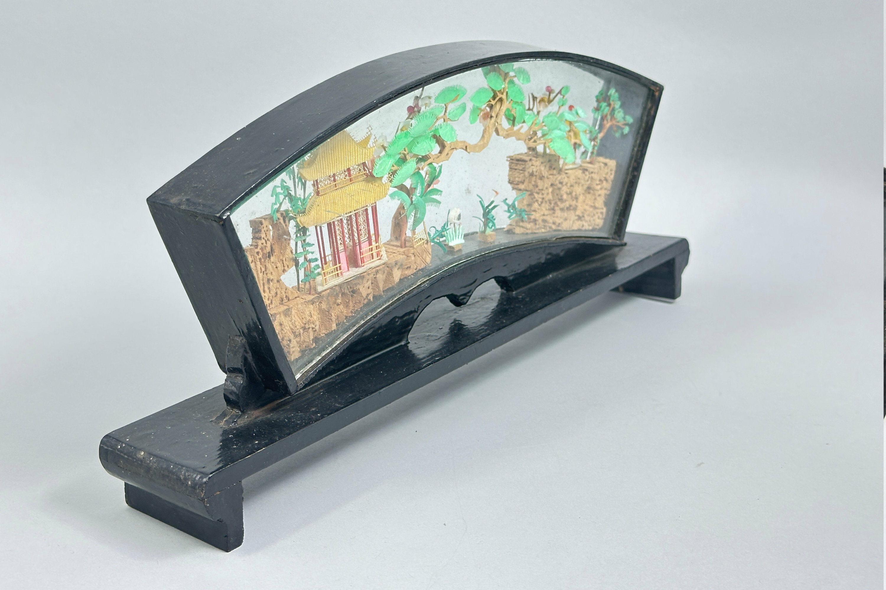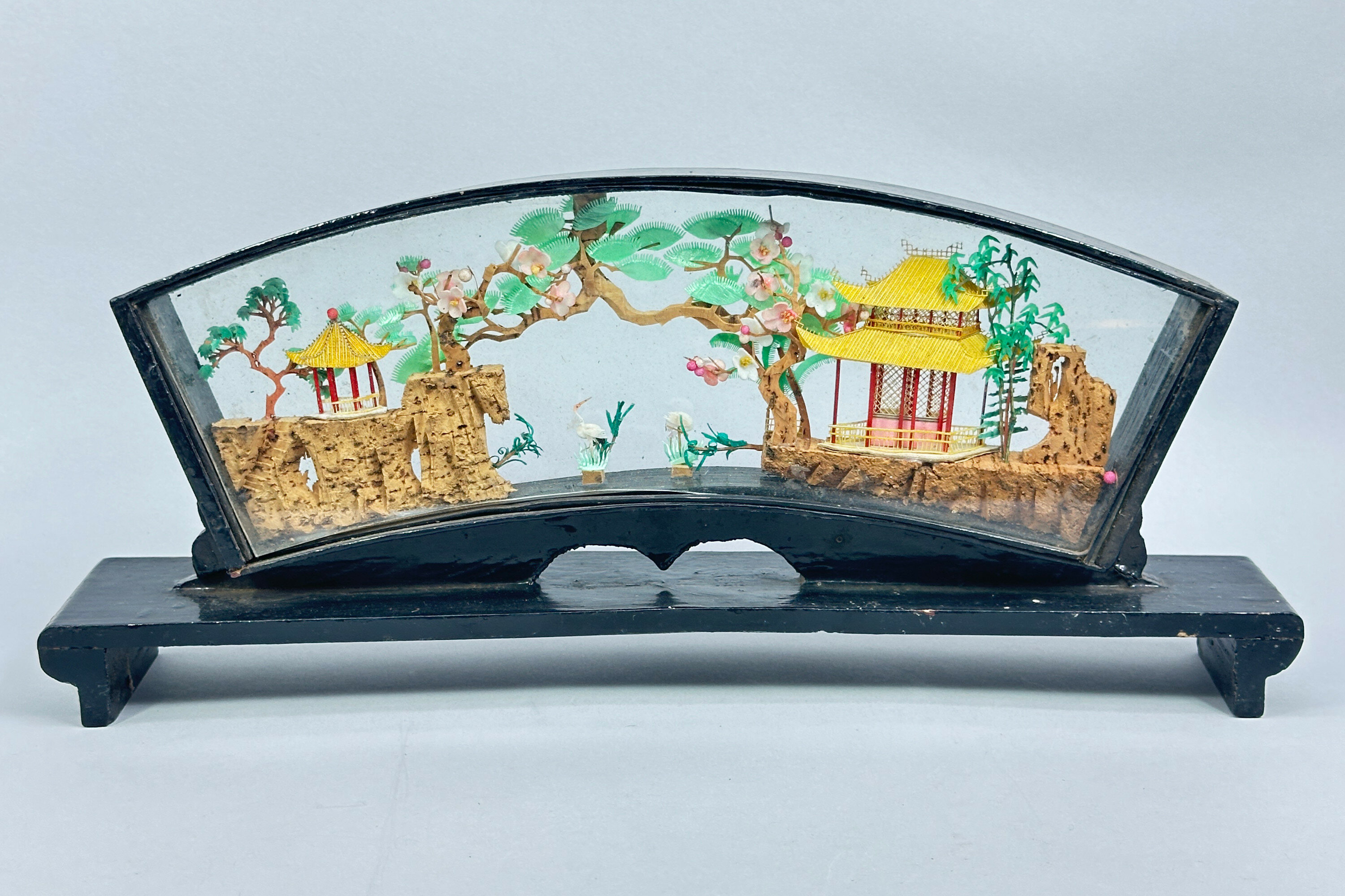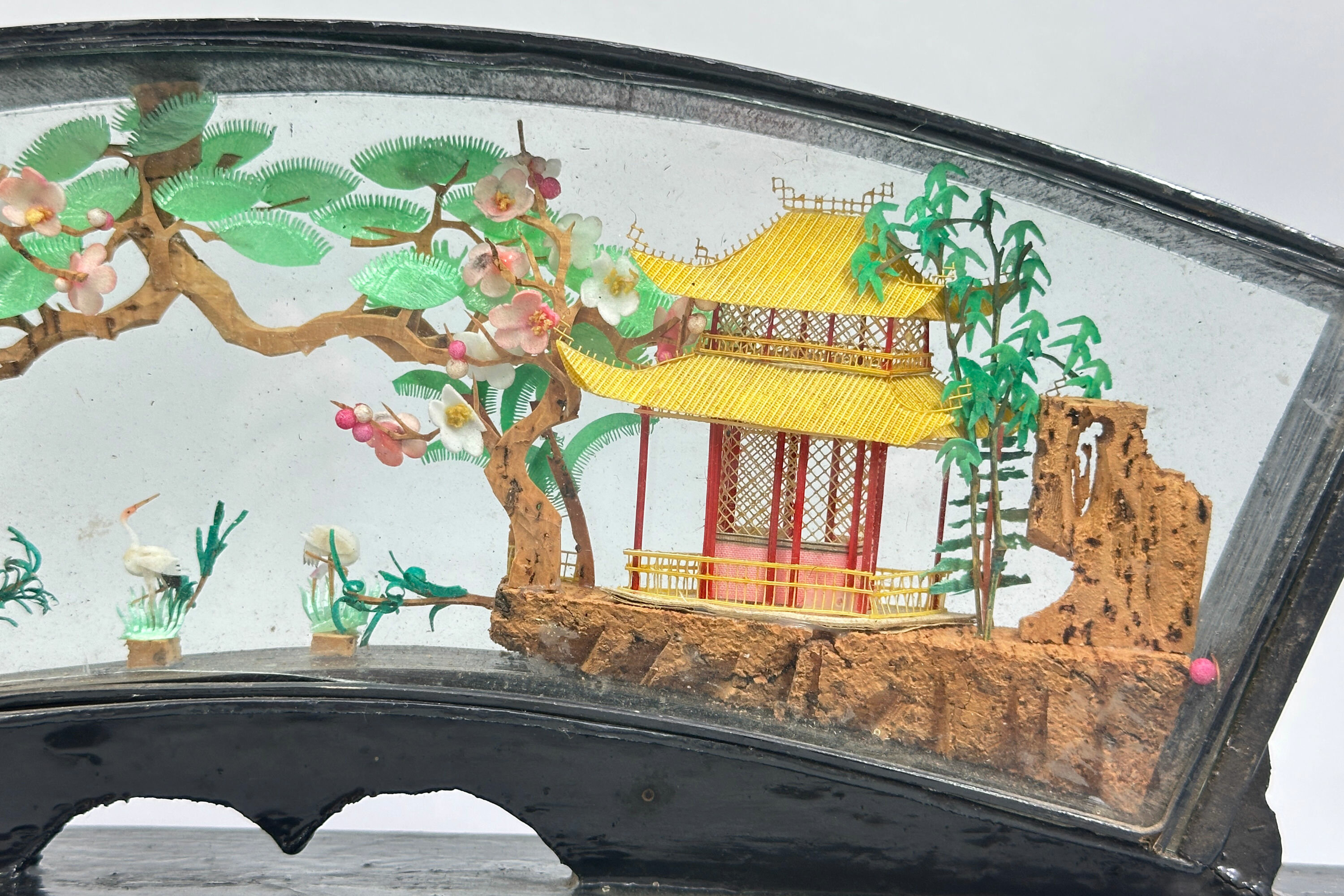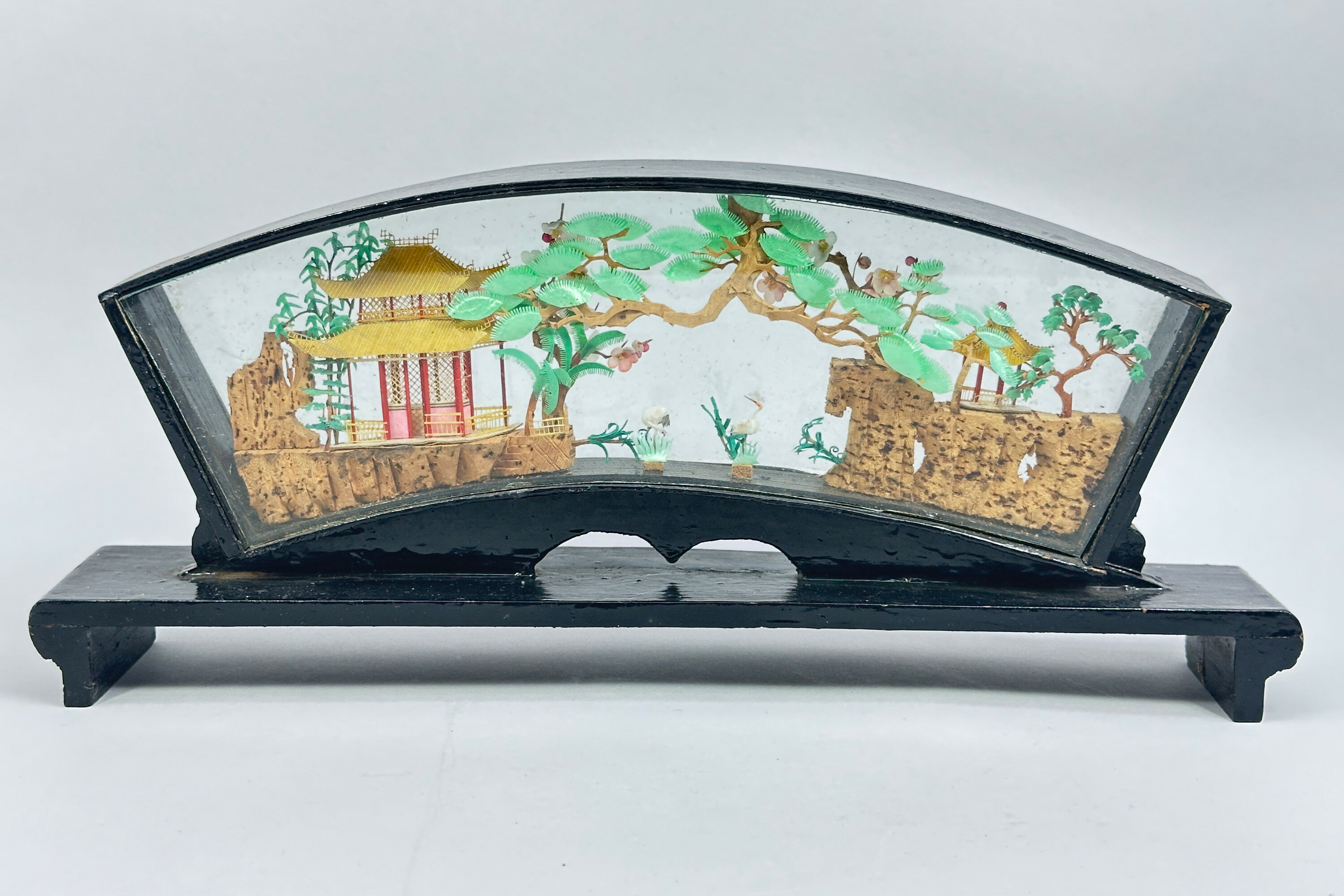 A fine quality Chinese carved and coloured cork sculpture with pavilions on rocks, pine trees and crane amidst reeds, all rendered in minute and meticulous detail and set in a fan shape glazed frame of lacquered wood set on an altar table form stand.Chinese cork carving, also known as cork sculpture, is a traditional Chinese art form depicting intricate landscapes with pavilions and animals. The cork (from cork bark of trees) is cut, carved, coloured and glued together into pictures after which it is wood-framed, usually painted in black lacquer, with clear glass protection. The tradition seems to have begun in the early twentieth century when the Chinese wood carving artist Wu Qiqi from Xiyuan village in Fuzhou was inspired by a wood carving picture that brought back from Germany to create something in imitation using locally cork for the main elements with rice paper plant to form the animals. The sculptures proved popular and many were exported. This piece is an excellent example with a particularly attractive frame and probably dates to before the Second World War.