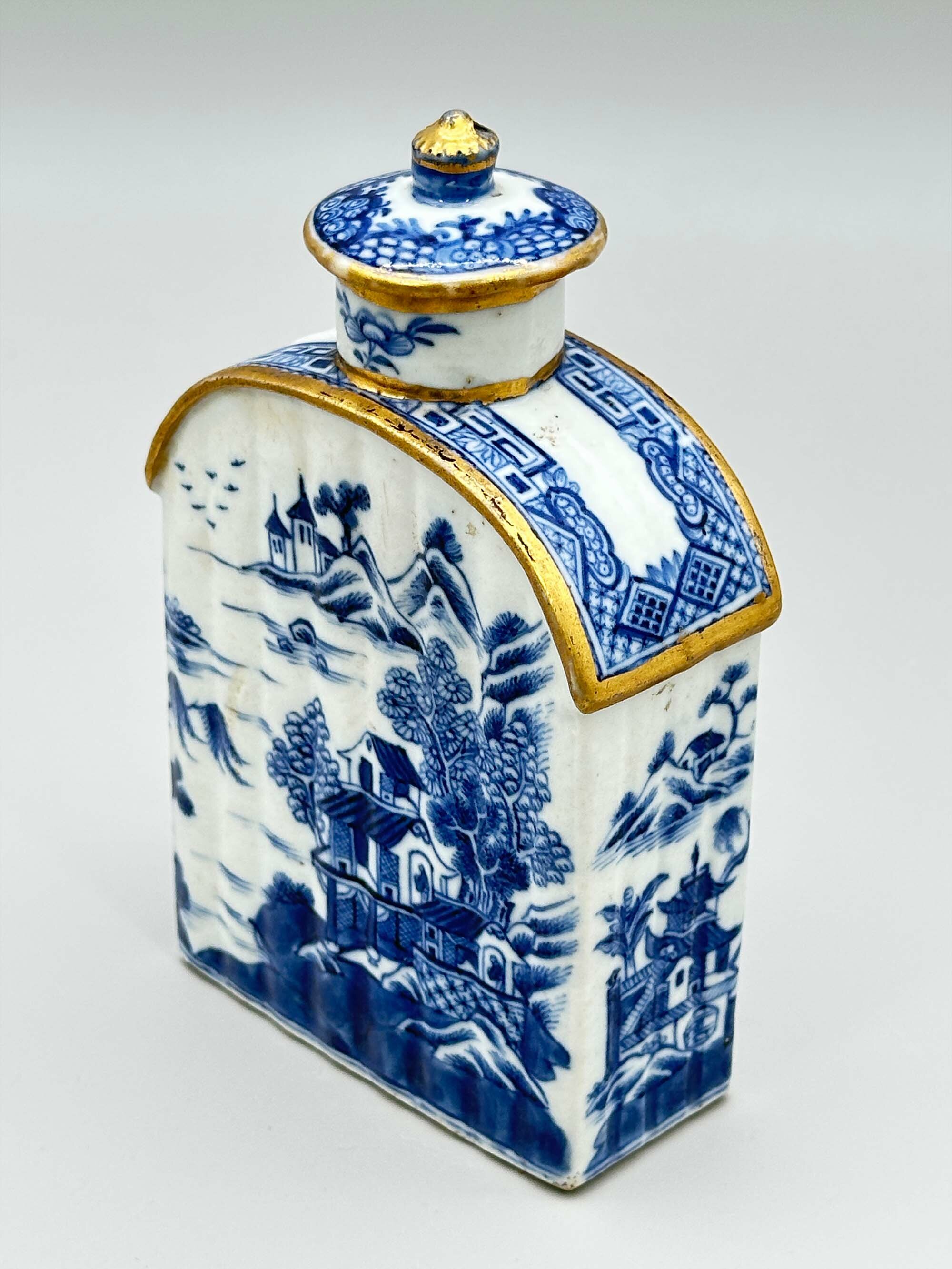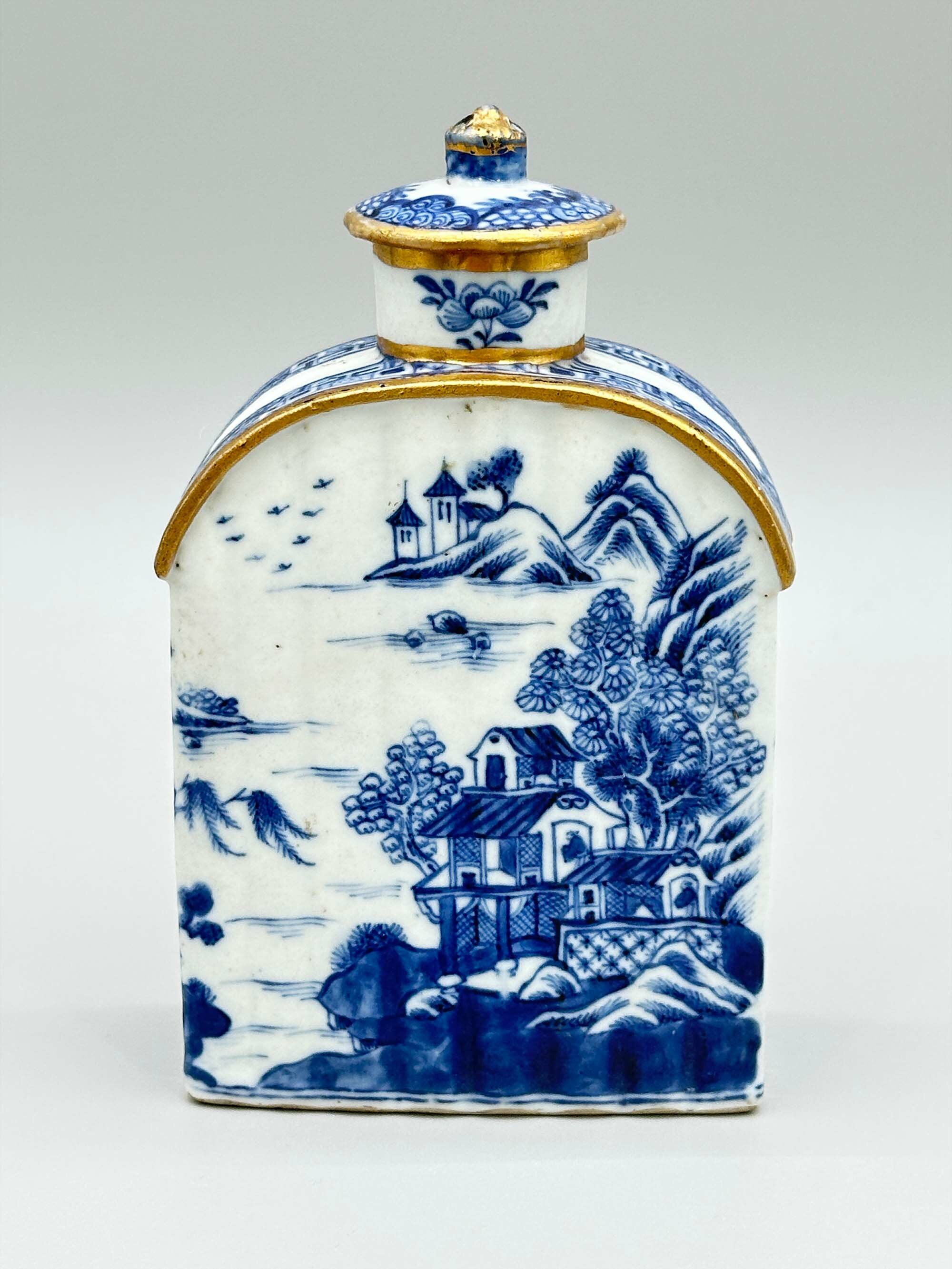 Accordingly, we have here an example of the Chinese potter’s work at its best. As the seams at the side indicate, the body of these caddies was mould made in two parts and then joined together with the neck added. An additional attraction here is the fluting to the body which is much less common. The decoration is in underglaze blue, the colour being applied to the body before glazing and firing, and the design is a typical stylised landscape scene, a rocky outcrop in the foreground with trees and pavilions and behind a lake with flying birds and another mountainous range in the background again with buildings. As often, small figures can be seen occupying the nearer pavilions. The shoulder is decorated with a classic stylised geometric pattern border with diaper work and key pattern, the neck has two small floral sprays and the lid has a stylised floral border with cell work. To add opulence to the effect, the caddy (and indeed doubtless all of its companion pieces) was given the enhancement of gilt decoration on its arrival, most likely in one of the London workshops.