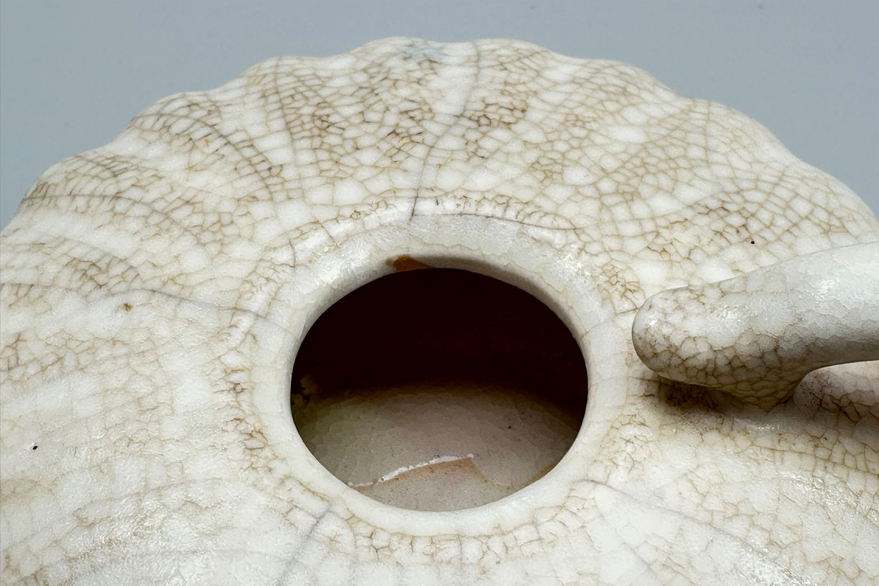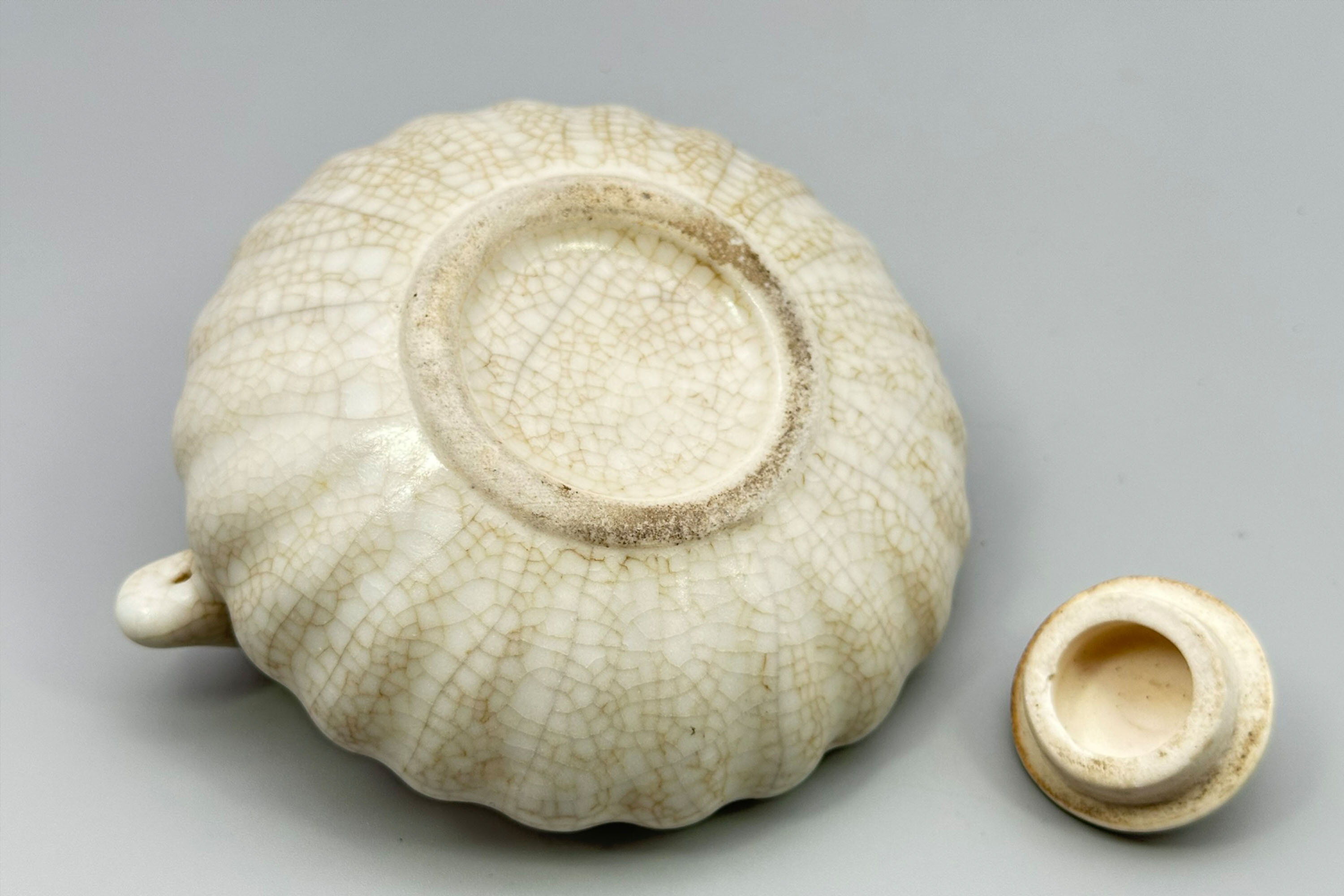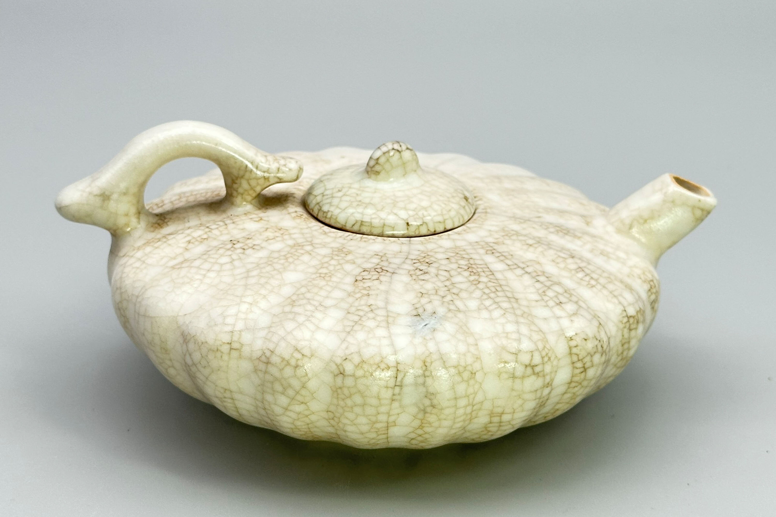 This is an unusual Chinese teapot of ‘pumpkin’ form with a typically lobed body but of extremely compressed proportions, with a short spout, a shallow fitted lid and flattened loop handle in the form of a stylised dragon. It is clearly ‘archaistic’ in style and the cream craquelure glaze recalls pieces from the Ming dynasty (1368–1644) and even before, particularly the so called ‘guan ware’, but while earlier lobed pieces can be found, particularly shallow bowls, there do not seem to be any precedents for this form of teapot and there are no parallels amongst later pieces either. The paste of the foot and the general style of the glaze certainly indicate a dating to around 1900 and just possibly slightly before. A piece, then, for a curious collector who might perhaps be lucky enough to make further discoveries about its origin.| Size: | Ht (max) 6cm, Width (max) 13.5cm, Depth (max) 11cm, Base 6cm |