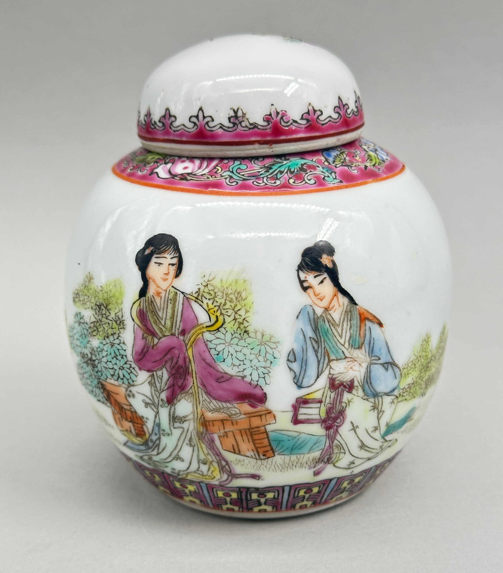 A reverse glass (or verre eglomise) painting depicting two ladies in elaborate court dress on a garden terrace with fencing at the front and a stylised garden scene at the rear with rocks, prunus and bamboo (symbolising longevity and renewal); one reads a book and the other holds a small library book box. Reverse glass paintings became a staple of the decorative items exported by China in the eighteenth century and production continued into the twentieth. The style of painting here, a little less detailed than that found in older counterparts but still with charm and skill in the brushwork, suggests a dating to the 1920s which would fit with the frame which is most likely original and retains its original fastening pegs at the back. The composition is well balanced and attractive and this is an excellent example of the genre in good and original condition.