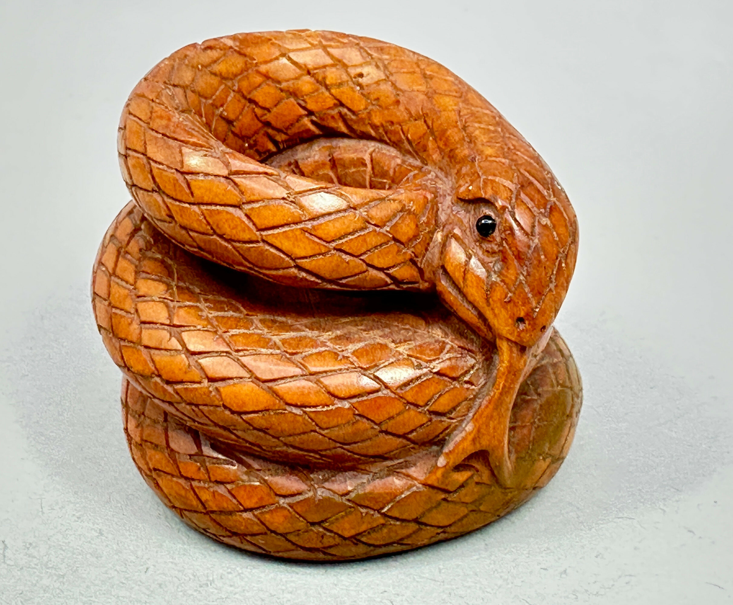 A Japanese boxwood netsuke sculpture of a coiled snake, seated with its tongue protruding, the eyes inset with small hardstones [CHECK] and the scale rendered in detail with an incised artist’s mark to underside next to the two attachment holes. Netsuke were carved toggles used to attach hanging objects, usually okimono, to the sash of a kimono and became the subject of the master carver’s art, sometimes of the very highest class. They were formed from ivory or wood, as here, and usually display the holes through which the fastening cord was threaded. While there is certainly skill in the carving, the artist’s signature cannot be identified. Netsuke began to fall out of fashion in the nineteenth century as European dress gradually became more popular but a dating to this period seems reasonable.| Size: | Ht (max) 3.3cm, Width (max) 4cm, Depth (max) 3.8cm |