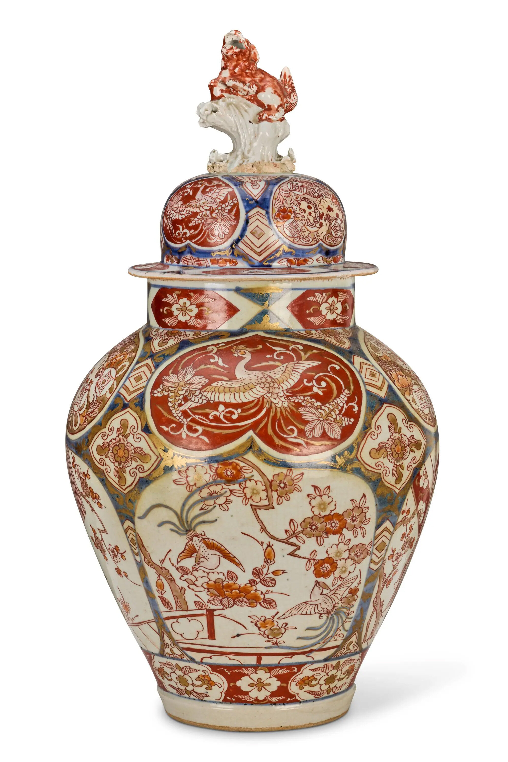 Trade with Japan in the seventeenth century was predominantly directed by the Dutch merchants who had a trading station at Nagasaki. It was their requirements which dictated what the potteries at Arita should make and by the 1660s they were demanding ‘red wares’, the Japanese term for pieces in the colourings of underglaze blue, red and gold, sometimes with additional colours as well. Once made, these porcelains were sent to the port of Imari from where they began their journey to the West and from which they were to take their name. They proved to be immediately popular on their arrival in Holland and the auctions of the cargoes as they arrived were extremely successful. This led to a plentiful supply of chargers, bowls and vases (many with covers and some forming part of a five piece garniture) which were to decorate the royal and aristocratic homes not only of Holland itself but throughout Europe and particularly in Great Britain, where they can be seen today.