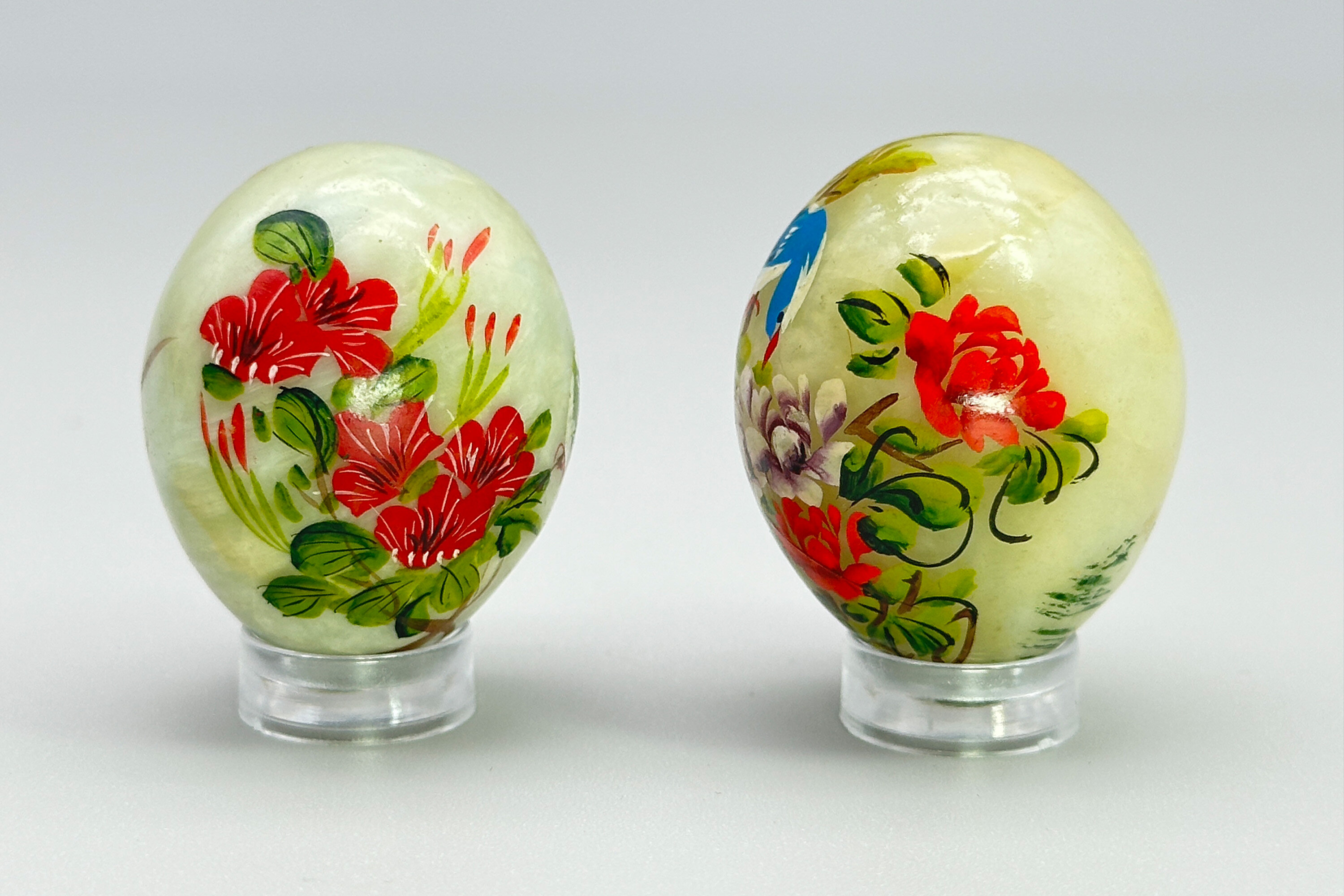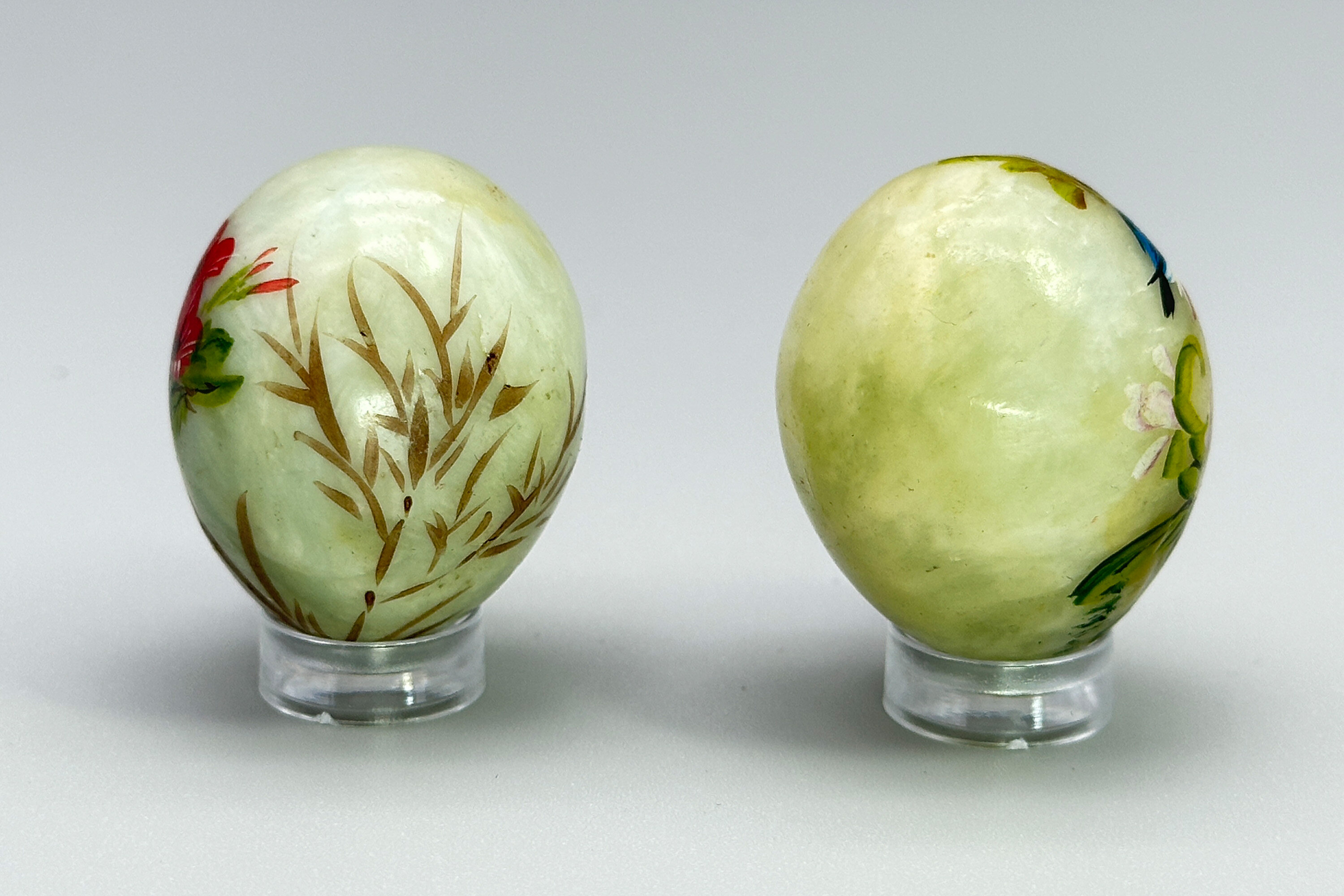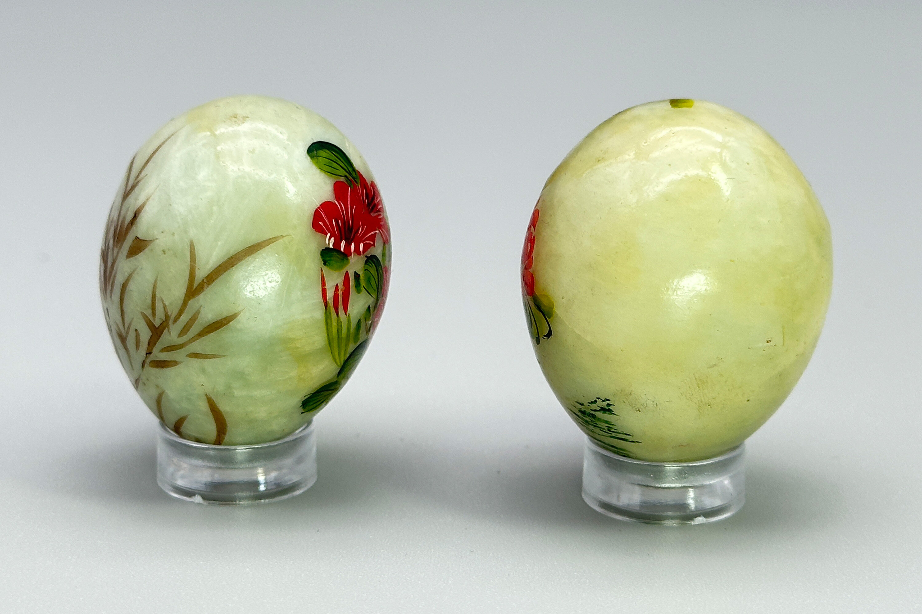 Each of these eggs is made from light green coloured jade formed into the shape of an egg. Both are attractively painted in bright colours with birds and flowers, the designs complementary rather than matching. They were made in China, doubtless as tourist souvenirs and are most likely quite recent in date but the combination of the stone shape and colour and the careful decoration make them attractive decorative items nevertheless.| Size: | 3.5cm x 2.8cm; 3.8cm x 3cm |