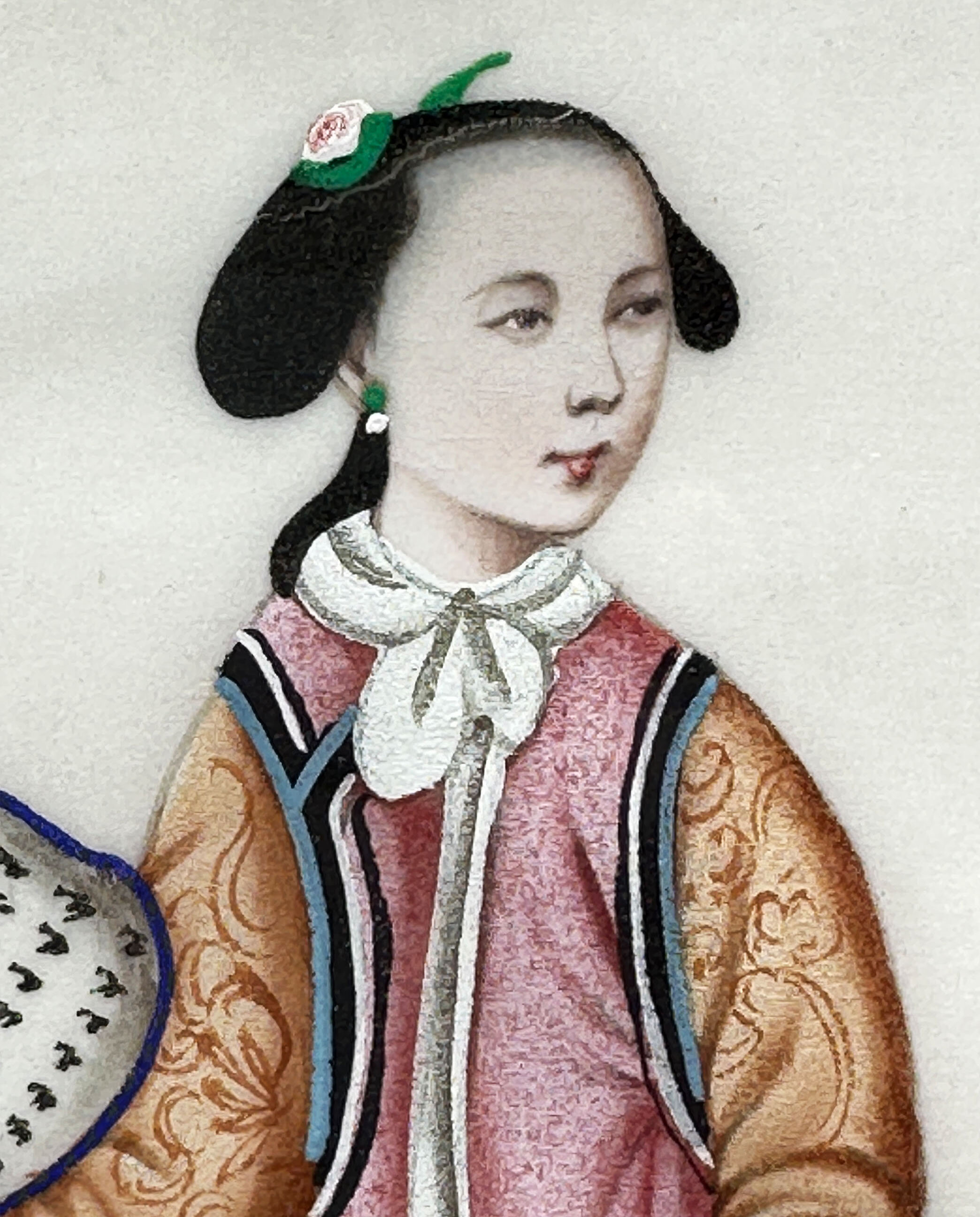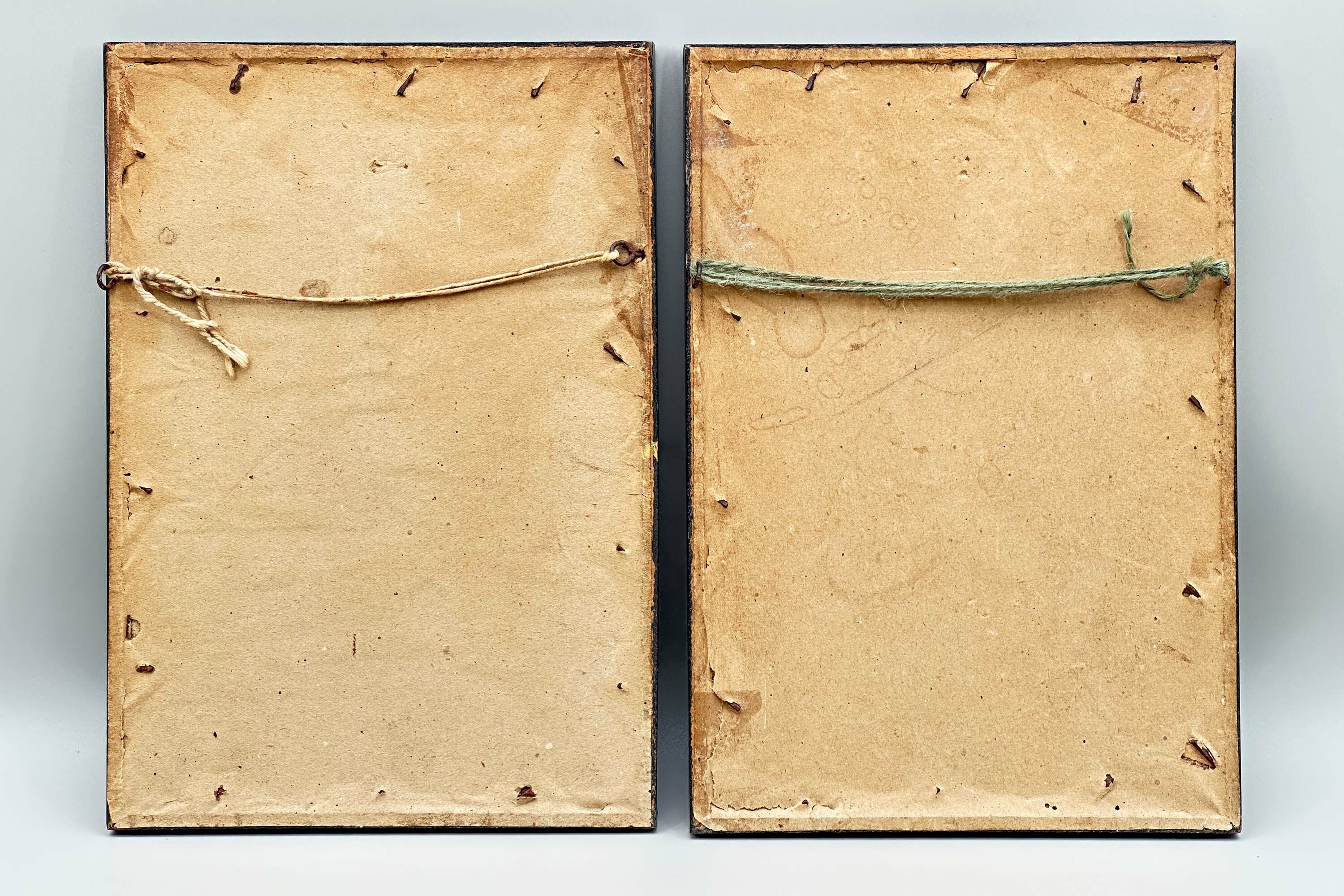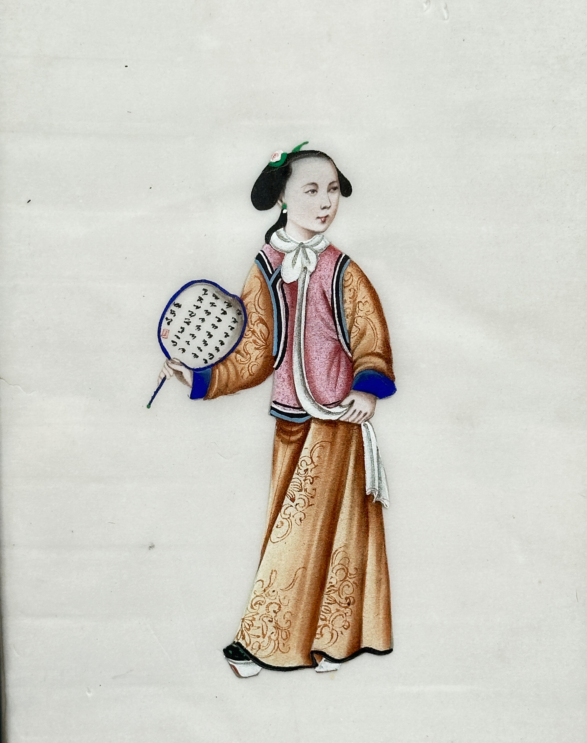 A pair of Chinese paintings on rice paper of two figures, a lady and a gentleman, in traditional court dress. She holds a fan while he holds a quiver of arrows in one hand and a bow in the other, suggesting, perhaps fancifully, a contrast between war and peace. Finely detailed, almost jewel-like, cabinet paintings of this type were made in the 18th and 19th centuries for export to Europe, from the Chinese ports and in particular Canton. The subject matter included botanical studies, commercial and domestic scenes and, as here, people depicted wearing elaborate Chinese dress. These paintings were often issued in sets or albums either to be enjoyed as connoisseurs’ items or for framing to be used as wall decoration. The detail of the brushwork here, especially seen on the robes, and the expression of the faces represents the best of work which was exported and the rice paper ground is in remarkably good condition with little or no trace of foxing. Dating is fairly certainly to the nineteenth century and perhaps to the 1840s/1860s since the style of work resembles that seen on the porcelains produced at this time. The simple frames are doubtless a twentieth century addition and allow these two miniature masterpieces to be displayed with great effect.| Size: | Ht 27cm, Width 18.8cm, Depth 1.3cm |