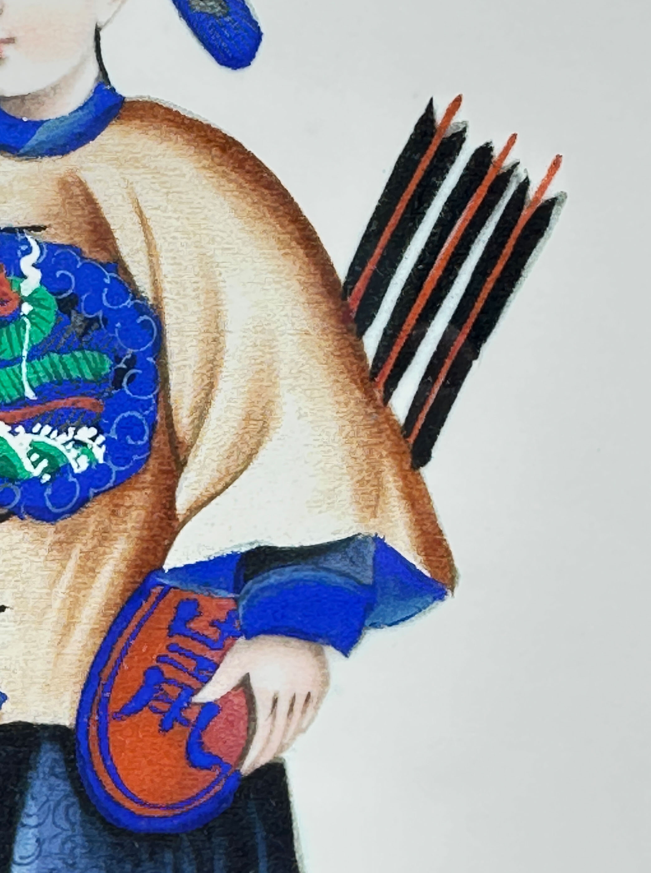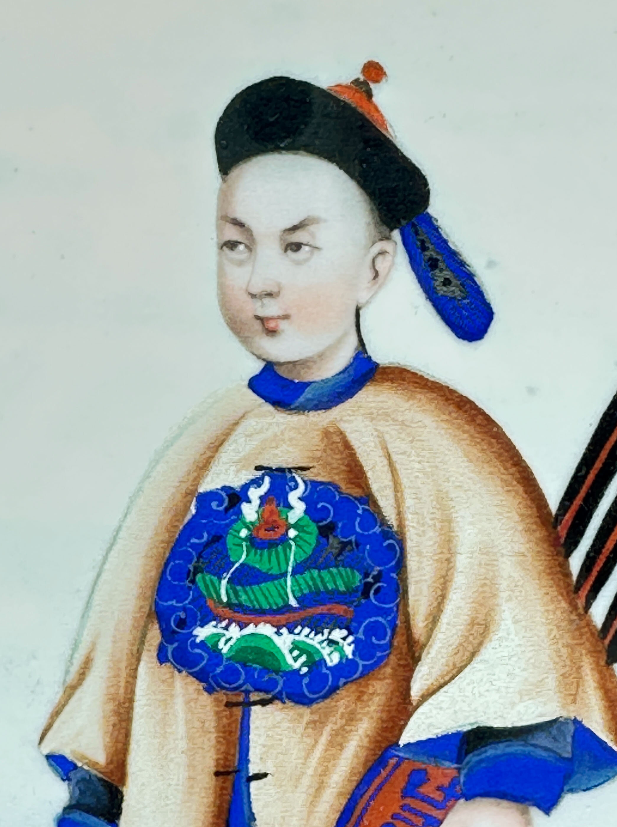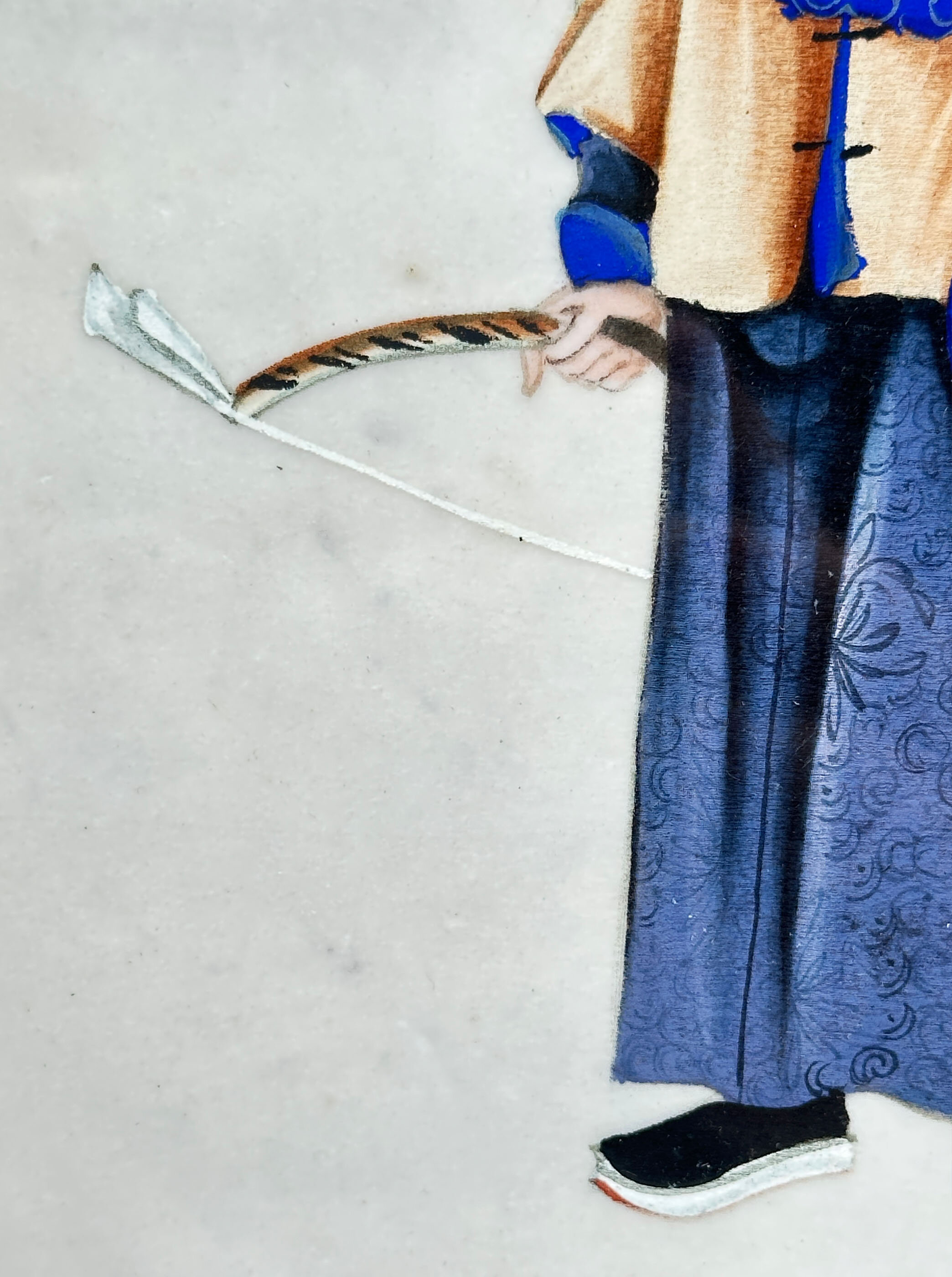 A pair of Chinese paintings on rice paper of two figures, a lady and a gentleman, in traditional court dress. She holds a fan while he holds a quiver of arrows in one hand and a bow in the other, suggesting, perhaps fancifully, a contrast between war and peace. Finely detailed, almost jewel-like, cabinet paintings of this type were made in the 18th and 19th centuries for export to Europe, from the Chinese ports and in particular Canton. The subject matter included botanical studies, commercial and domestic scenes and, as here, people depicted wearing elaborate Chinese dress. These paintings were often issued in sets or albums either to be enjoyed as connoisseurs’ items or for framing to be used as wall decoration. The detail of the brushwork here, especially seen on the robes, and the expression of the faces represents the best of work which was exported and the rice paper ground is in remarkably good condition with little or no trace of foxing. Dating is fairly certainly to the nineteenth century and perhaps to the 1840s/1860s since the style of work resembles that seen on the porcelains produced at this time. The simple frames are doubtless a twentieth century addition and allow these two miniature masterpieces to be displayed with great effect.| Size: | Ht 27cm, Width 18.8cm, Depth 1.3cm |