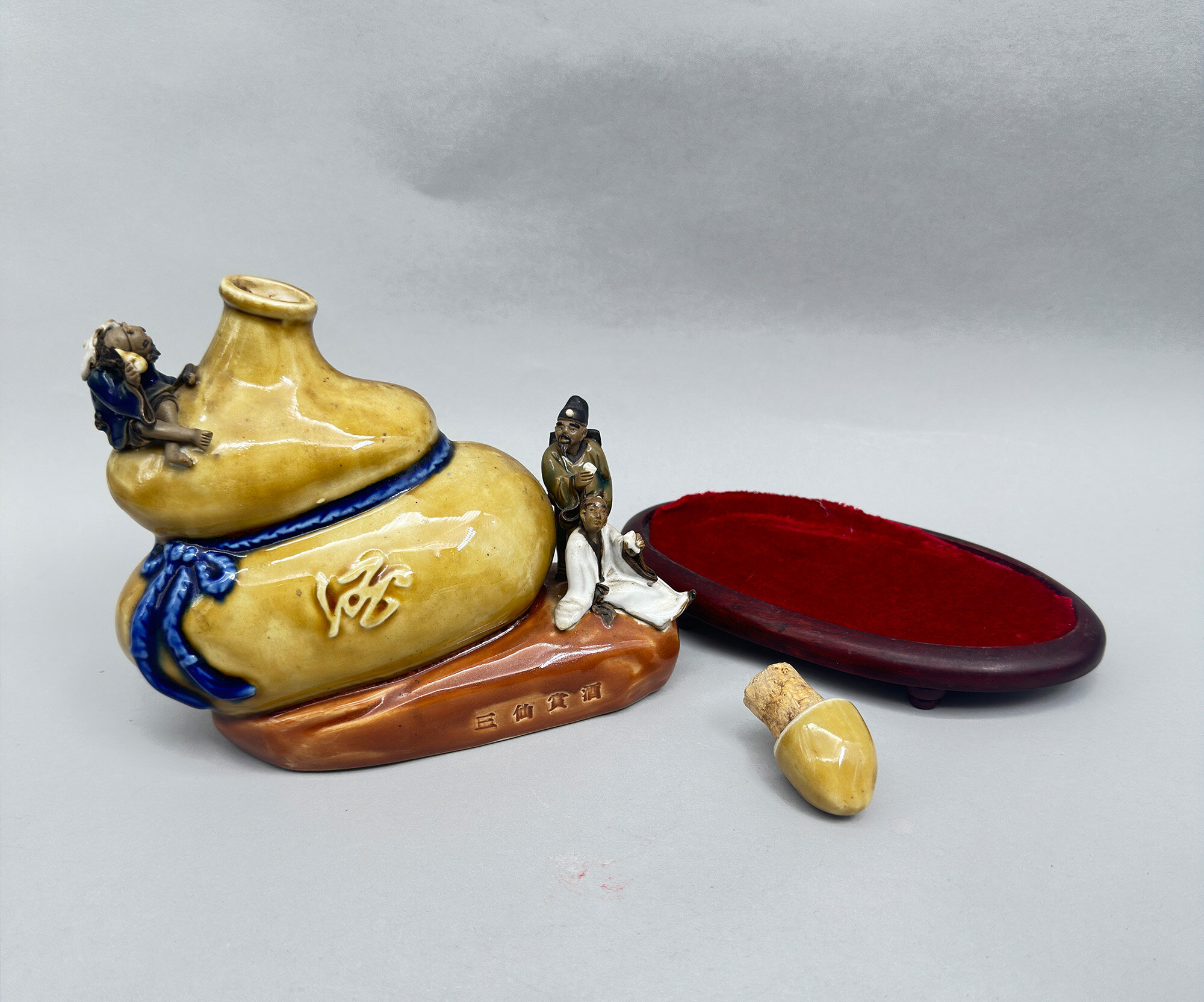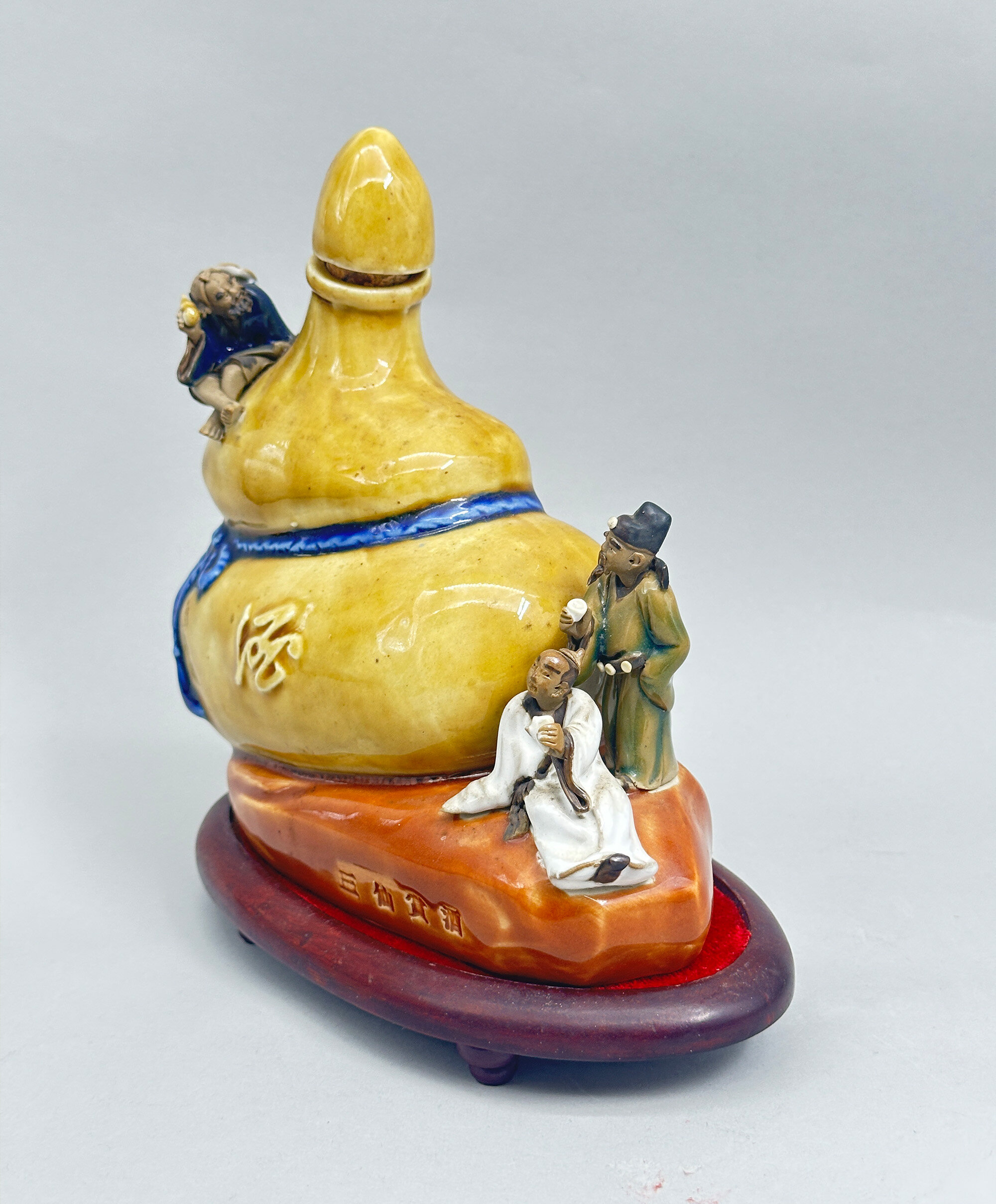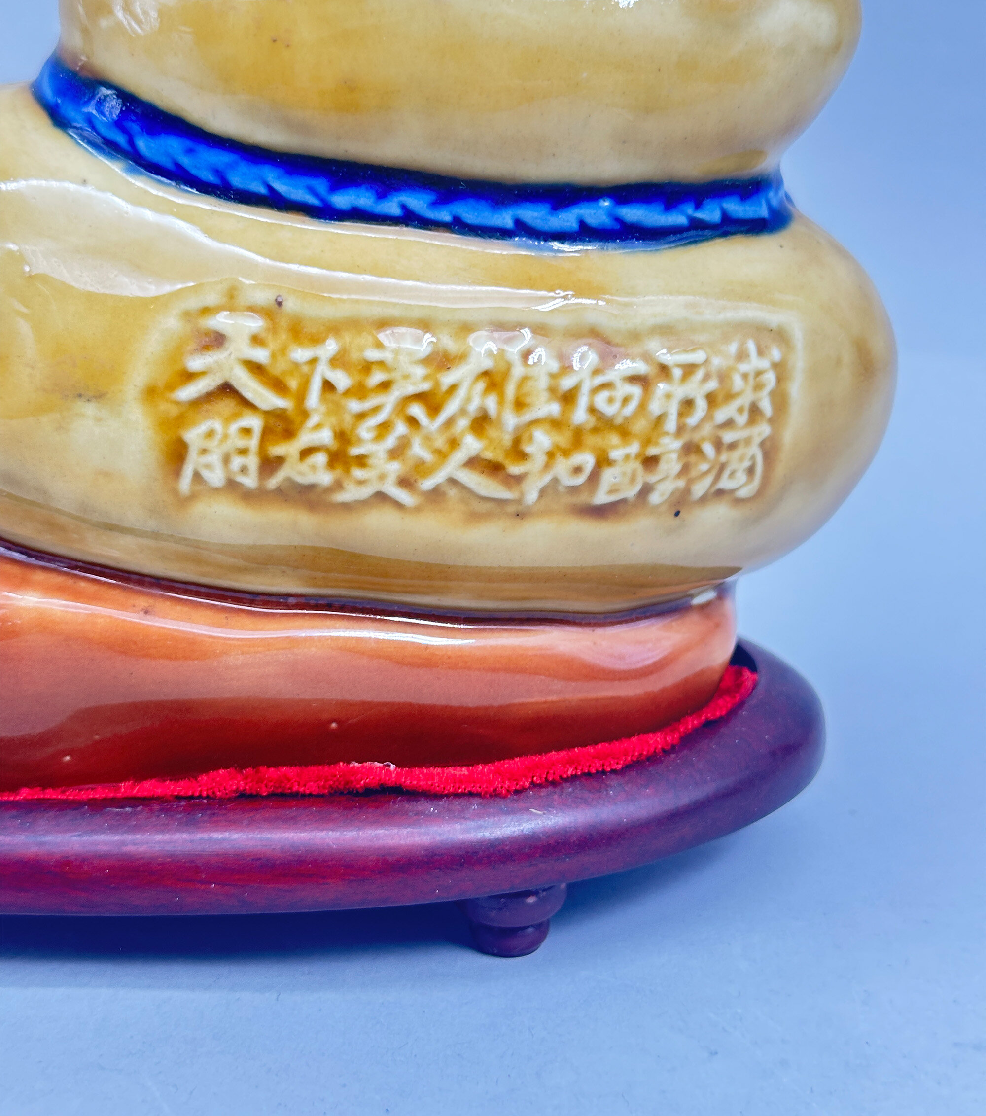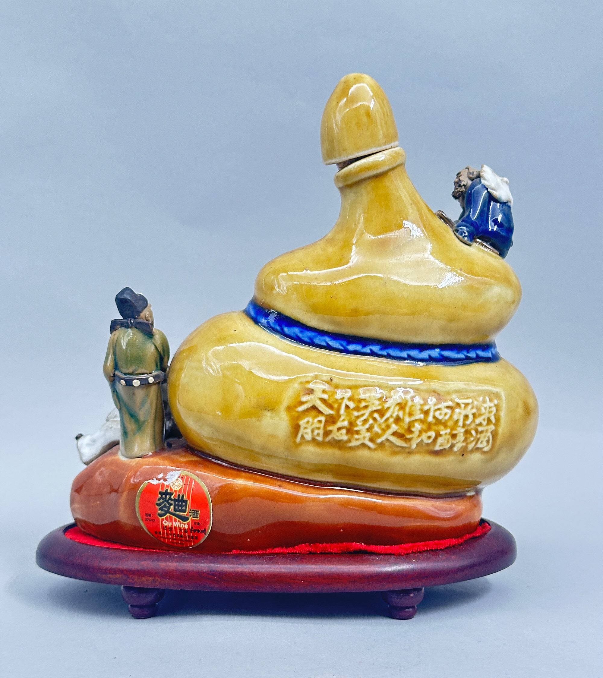 The Sam Seng Wine Company is based in Hong Kong. Founded by Hee Lin in 1974, it is known for producing a range of medicinal wines and rice wines, of which the ‘Qu Wine’, which originally formed the contents of this elaborate decanter or bottle, is the best known example. The Company seems to have adopted the practice of selling its wines in novelty ceramic containers which are now collectible items in themselves. This example is in the form of gourd on which sit three revellers each holding wine cups and seemingly rather the worse for wear. The complex and detailed modelling of the figures, which recalls that of earlier stoneware examples made at the Shiwan kilns from the Guangdong province, along with the extensive inscriptions are a surprising feature of an object which was essentially a ‘free gift’ but can certainly be enjoyed today. Fortunately the original trade label survives and the format of this suggests a late twentieth century dating.| Size: | Ht (max)16.5cm, Width (max) 17cm, Depth (max)8cm; Stand 17cm x 9cm (max) |