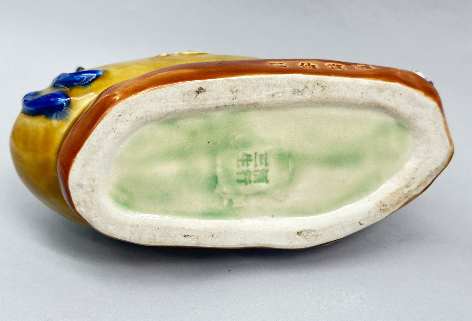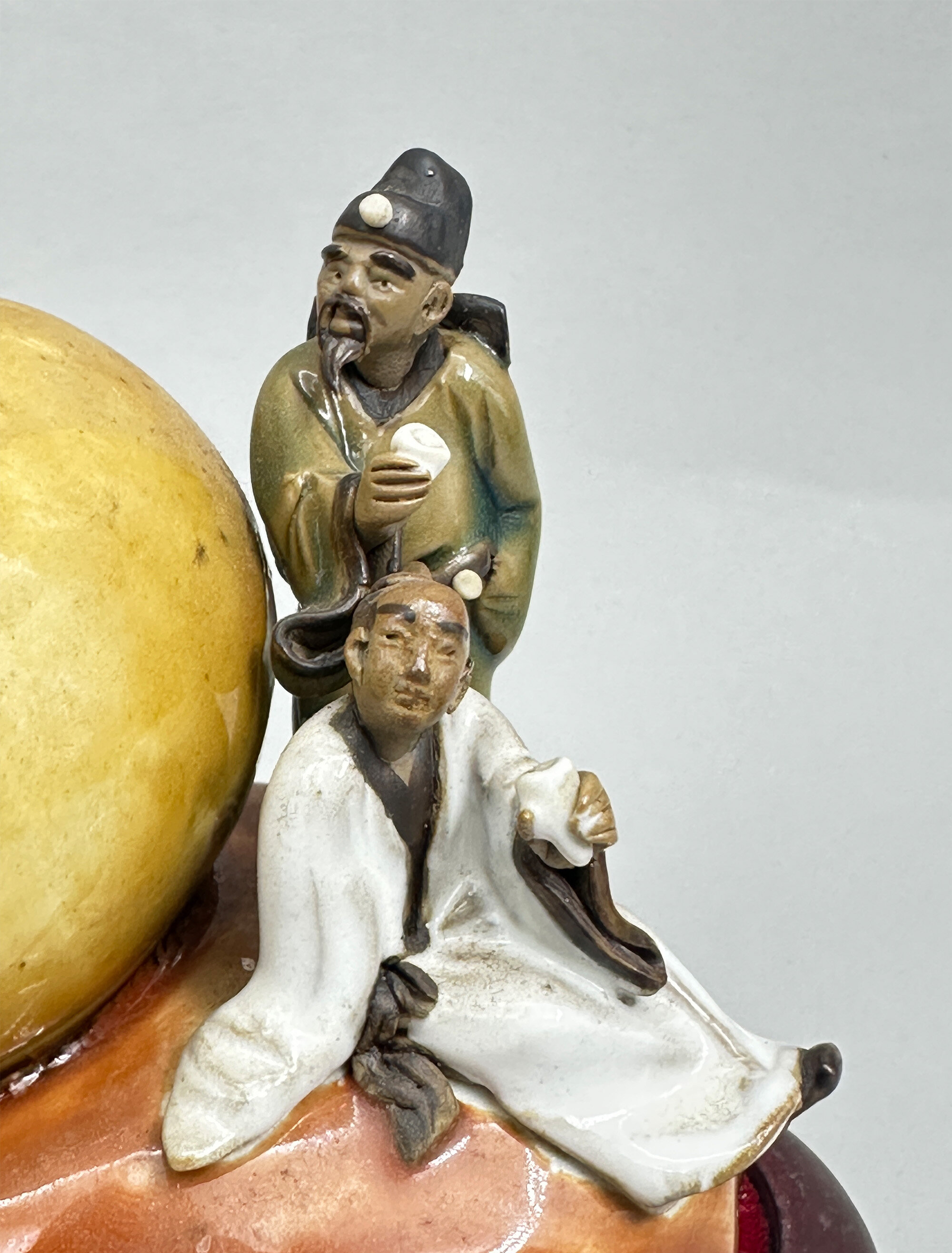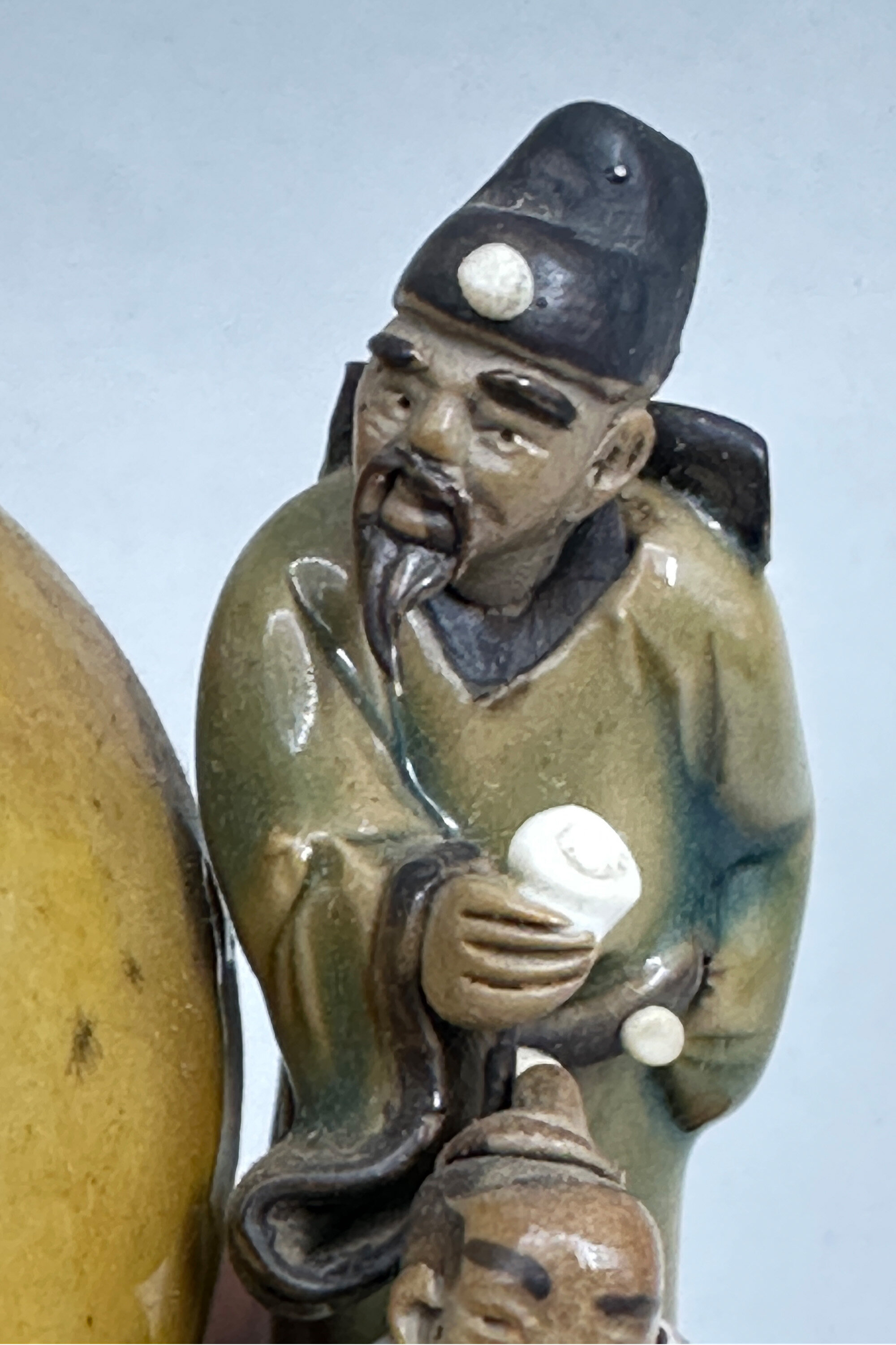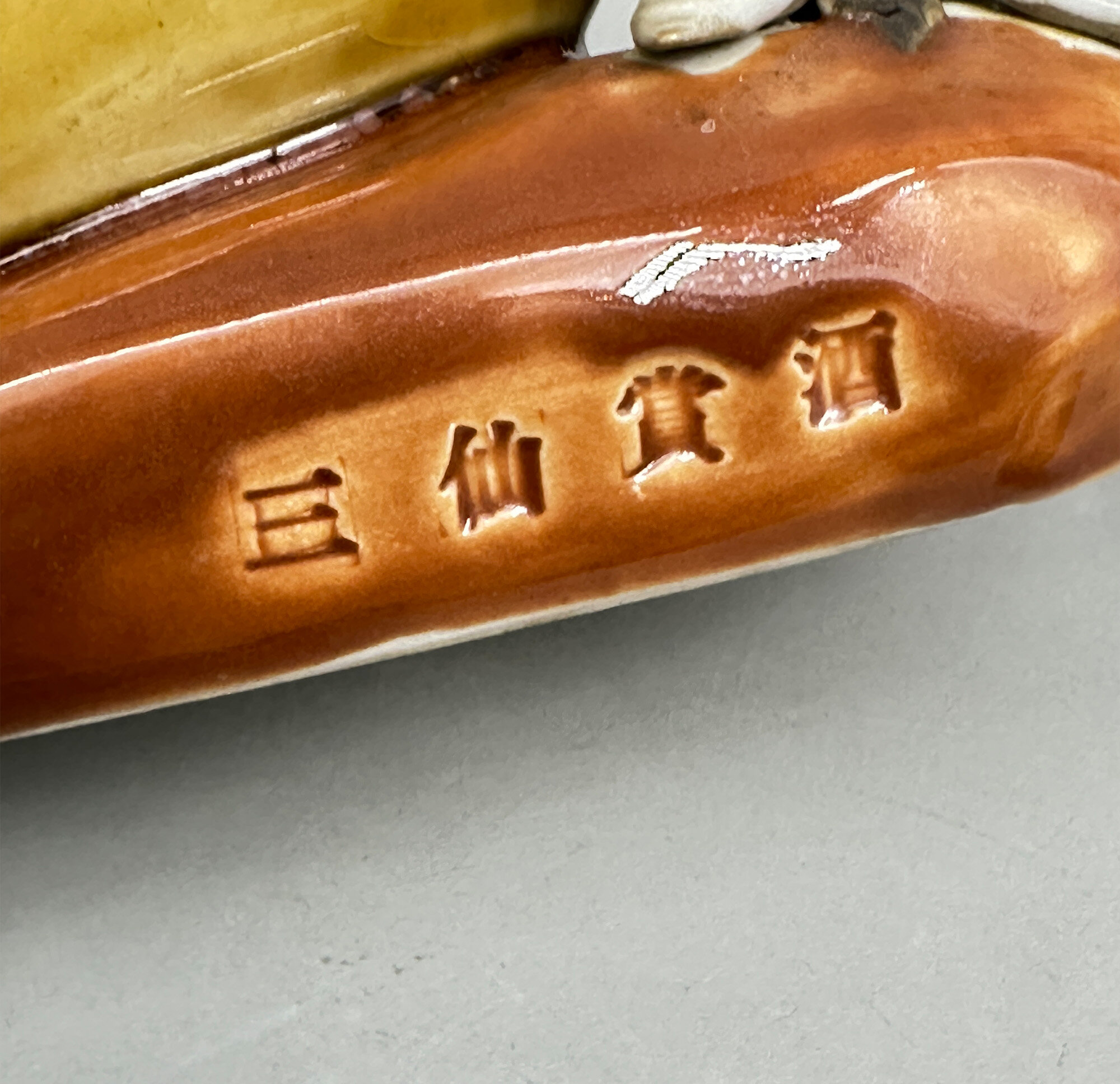 The Sam Seng Wine Company is based in Hong Kong. Founded by Hee Lin in 1974, it is known for producing a range of medicinal wines and rice wines, of which the ‘Qu Wine’, which originally formed the contents of this elaborate decanter or bottle, is the best known example. The Company seems to have adopted the practice of selling its wines in novelty ceramic containers which are now collectible items in themselves. This example is in the form of gourd on which sit three revellers each holding wine cups and seemingly rather the worse for wear. The complex and detailed modelling of the figures, which recalls that of earlier stoneware examples made at the Shiwan kilns from the Guangdong province, along with the extensive inscriptions are a surprising feature of an object which was essentially a ‘free gift’ but can certainly be enjoyed today. Fortunately the original trade label survives and the format of this suggests a late twentieth century dating.| Size: | Ht (max)16.5cm, Width (max) 17cm, Depth (max)8cm; Stand 17cm x 9cm (max) |