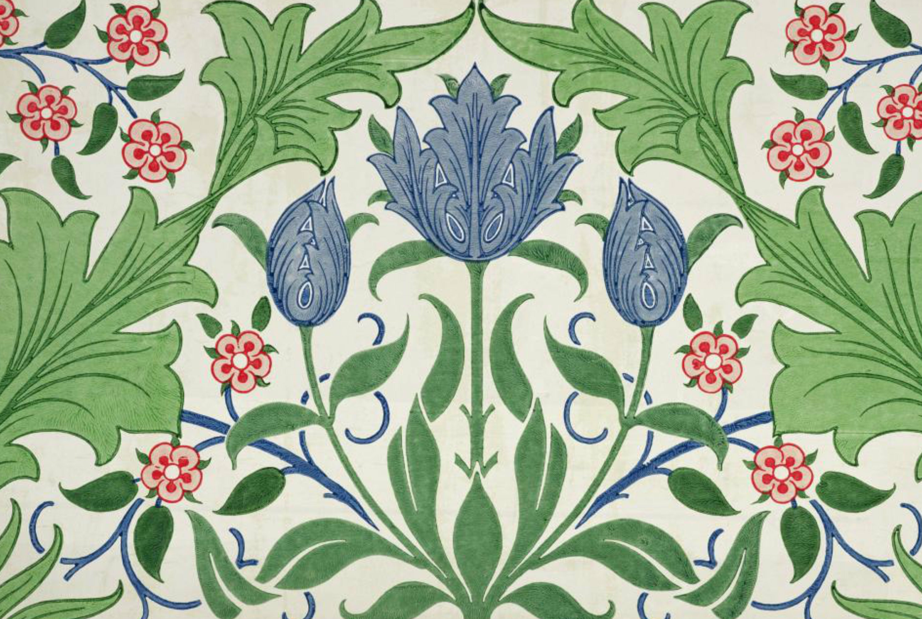 A pair of candlesticks, the bodies comprising slender ceramic columns decorated in blue and white with birds and reeds, the widely flaring bases with small tripod feet and decorated in repoussé (a process of hammering from the reverse to create a design in low relief) with two bands of scrolling foliage on a ‘punched’ ground, the drip pans and nozzles also with floral repoussé work, the underside of one marked ‘W B’.The design and style of these pieces recalls products of the ‘aesthetic movement’ era popular in Britain from 1860 to 1900. The object was to produce items of beauty and the furnishings and domestic objects of the middle-class home were to be of a quality that would please the eye of the artist and grace the houses of collectors and connoisseurs. William Morris, in particular, concentrated on distinctive organic forms and the floral designs of his wallpaper and tiles are reflected in the gilt bronze decoration here (see image 8) . The influences on the movement were diverse and Oriental porcelains extremely popular. Perhaps this explains the use of blue and white ceramic here, although the work looks Western rather than Eastern. The form of the nozzles also has many parallels in other contemporary candlesticks. Although there is a slightly continental feel to these pieces, the aesthetic movement was very much a British fashion so English manufacture is the most likely with a circa date in the late nineteenth century before the style lost its popularity in 1900.