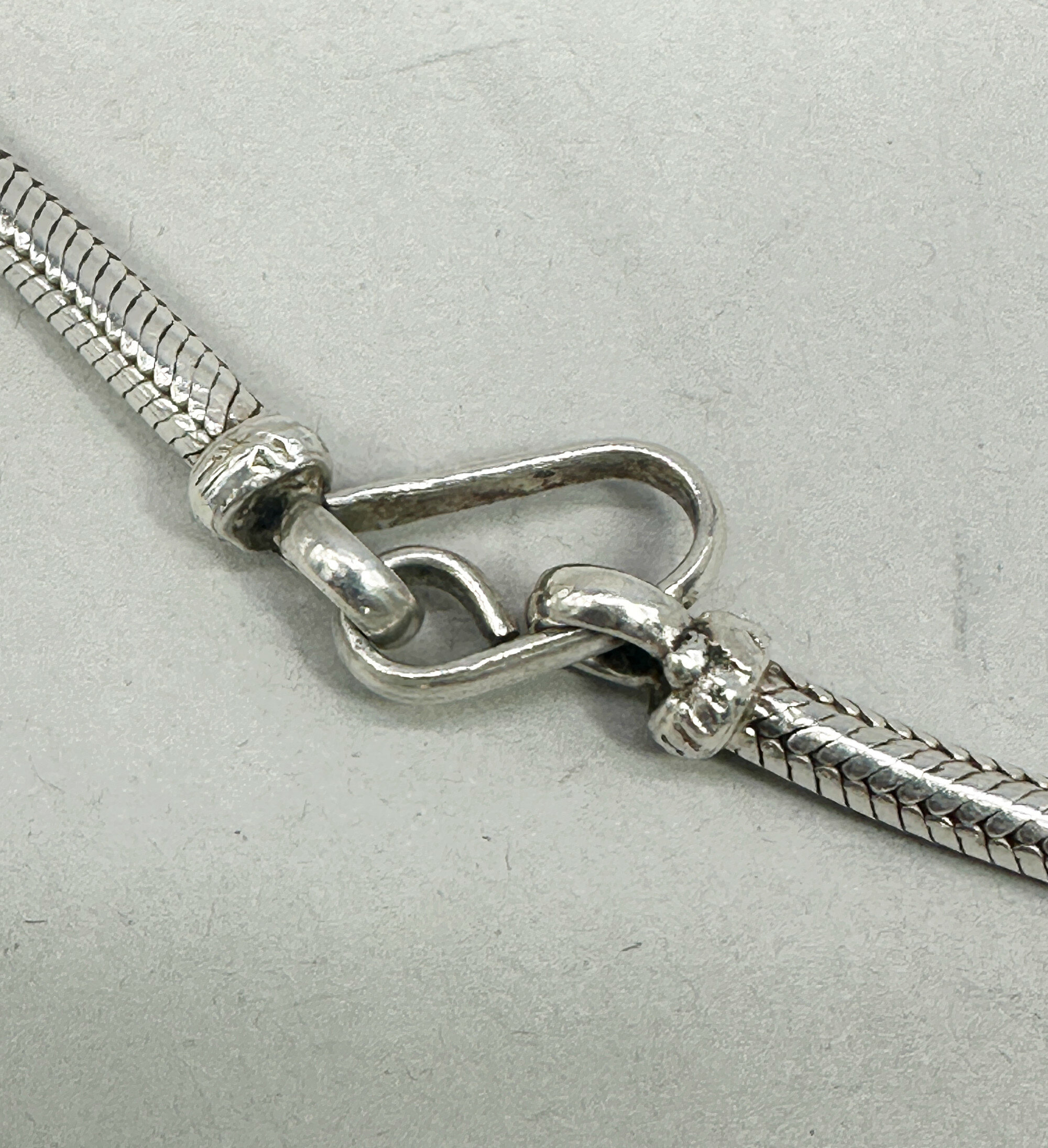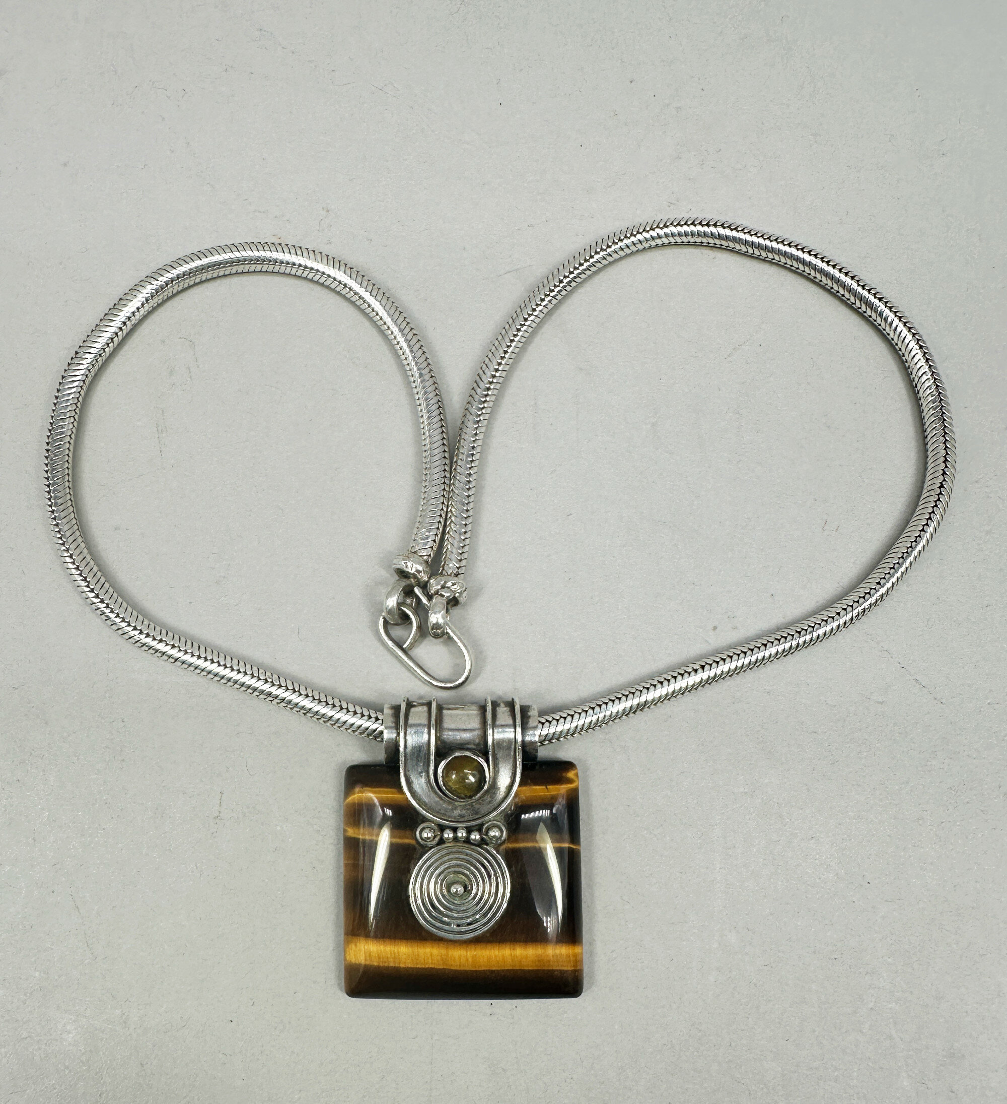 This is a full necklace comprising a large square tiger's eye stone with horizonal striations in a setting which employs Balinese motifs, highlighting the tradition of Balinese silver work. The mounted stone is suspended from a very thick snake form chain that complements it perfectly. There is a mark for '925' guaranteeing the quality of the silver. The abstract and bold forms present an arresting and attractive design which should appeal to a collector of contemporary costume jewellery.| Size: | Pendant is 3.5 x 4.5 cm, necklace is 44 cm and the chain has a thickness of 4mm |