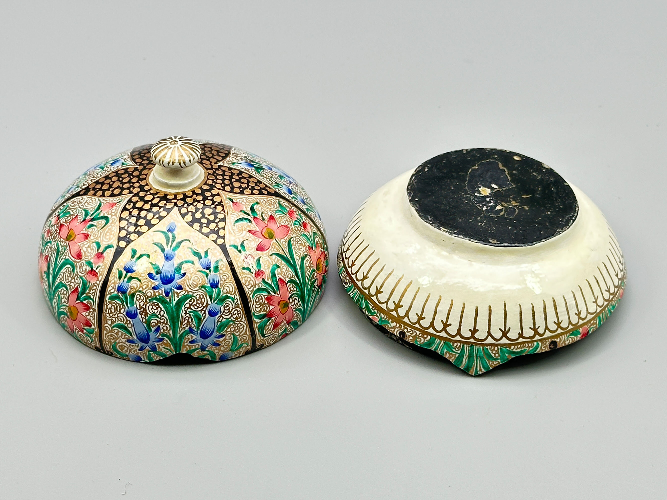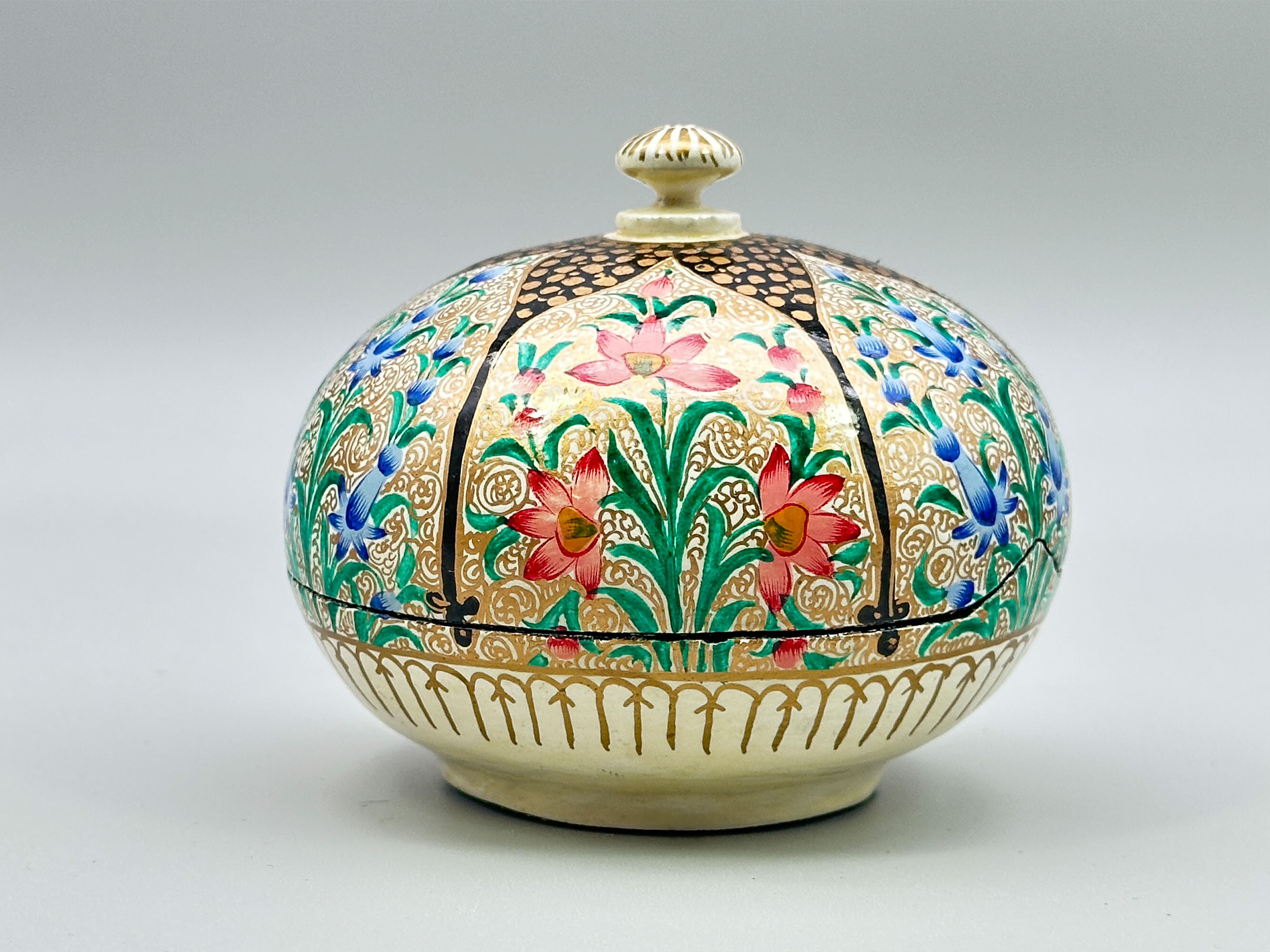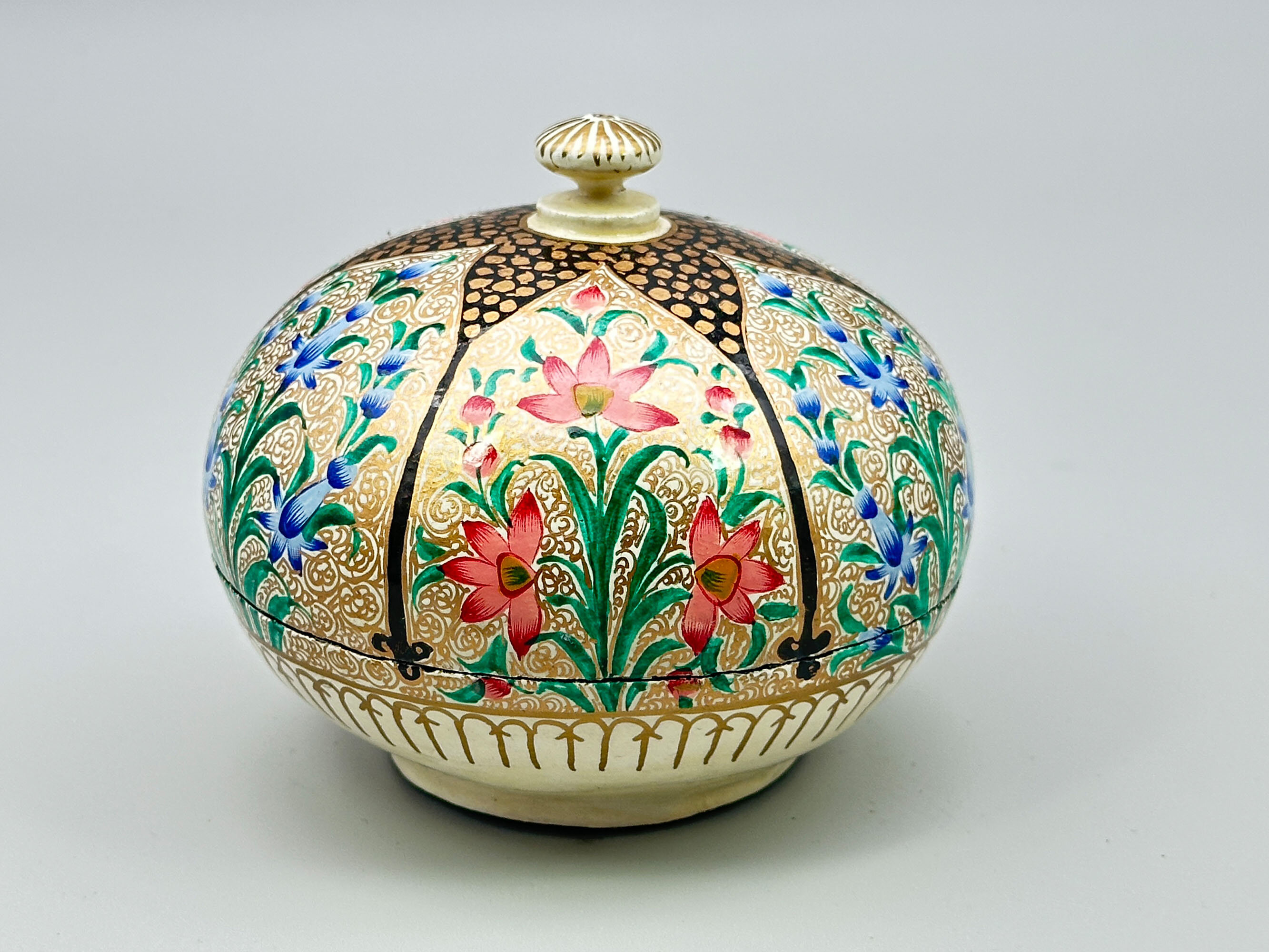 An attractive papier-mâché box and cover of slightly compressed globular form, the cover with a knob finial, and the base and lid with a mating small triangular section to ensure a secure fit, finely decorated in polychrome colourings with panels of stylised lotus on a gilt scroll ground, the top with gilt cells on a black ground and the base with a band of repeating gilt stylised lotus leaves, the interior and underside finished in black. The style of the decoration here is typical of the papier-mâché wares produced in Kashmir in the nineteenth and twentieth centuries which were known for their fine and elaborate floral decoration. Round trinket boxes were a particular speciality and this is a good example which probably dates to the early twentieth century.| Size: | Ht (max) 9cm, Ht (box) 3.5cm, Diam (max) 10cm, Base 5.8cm |