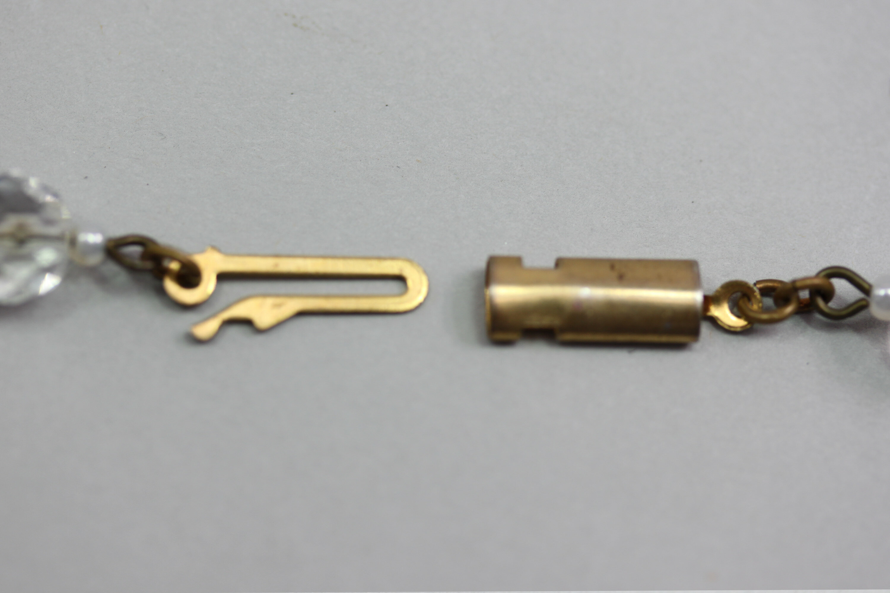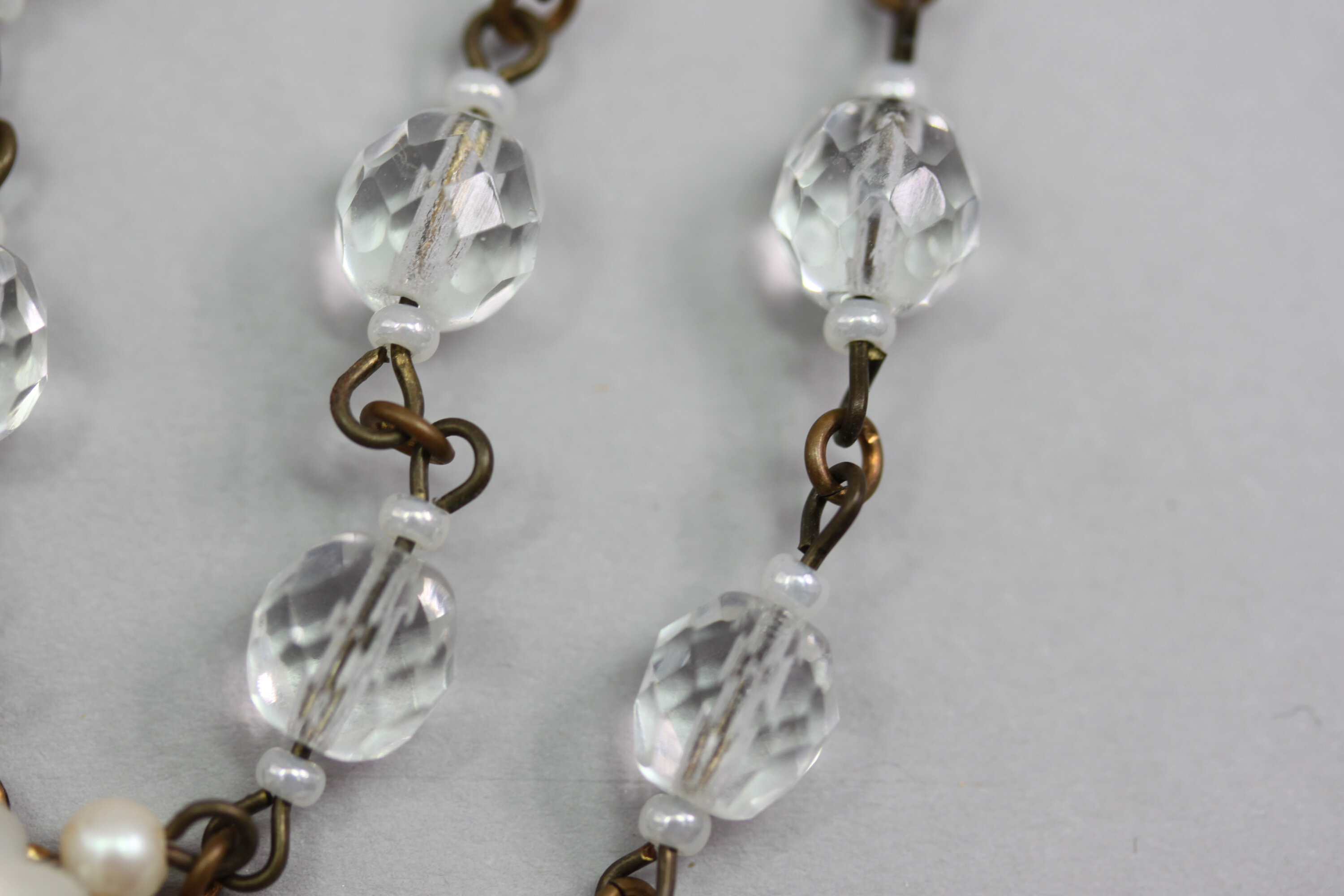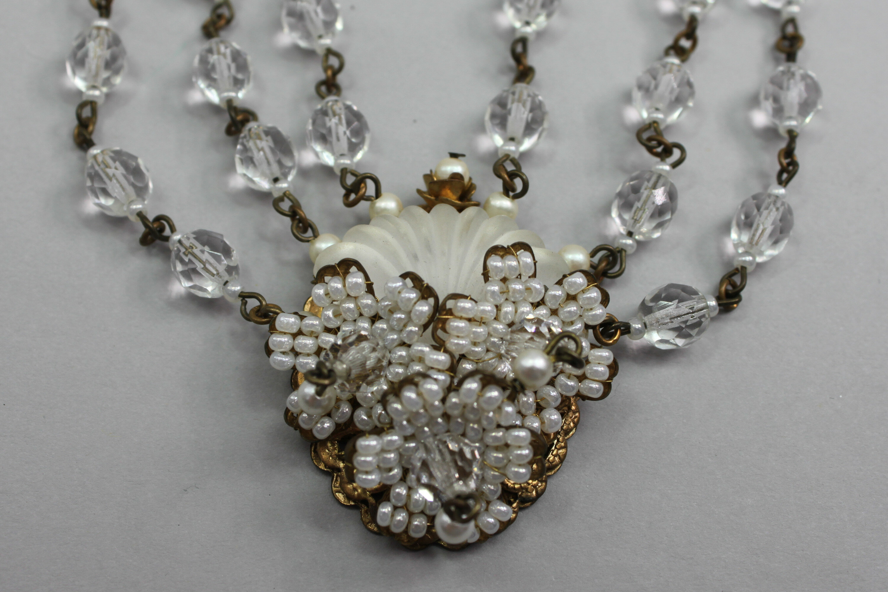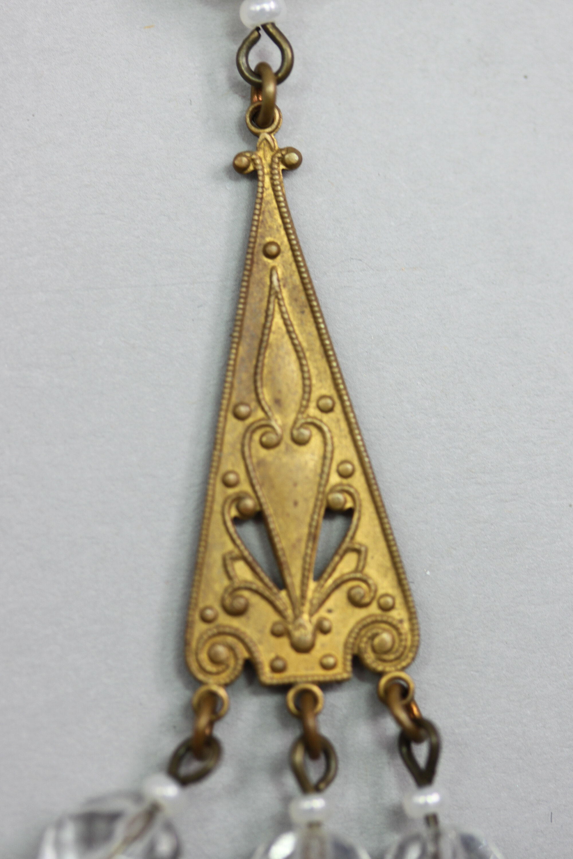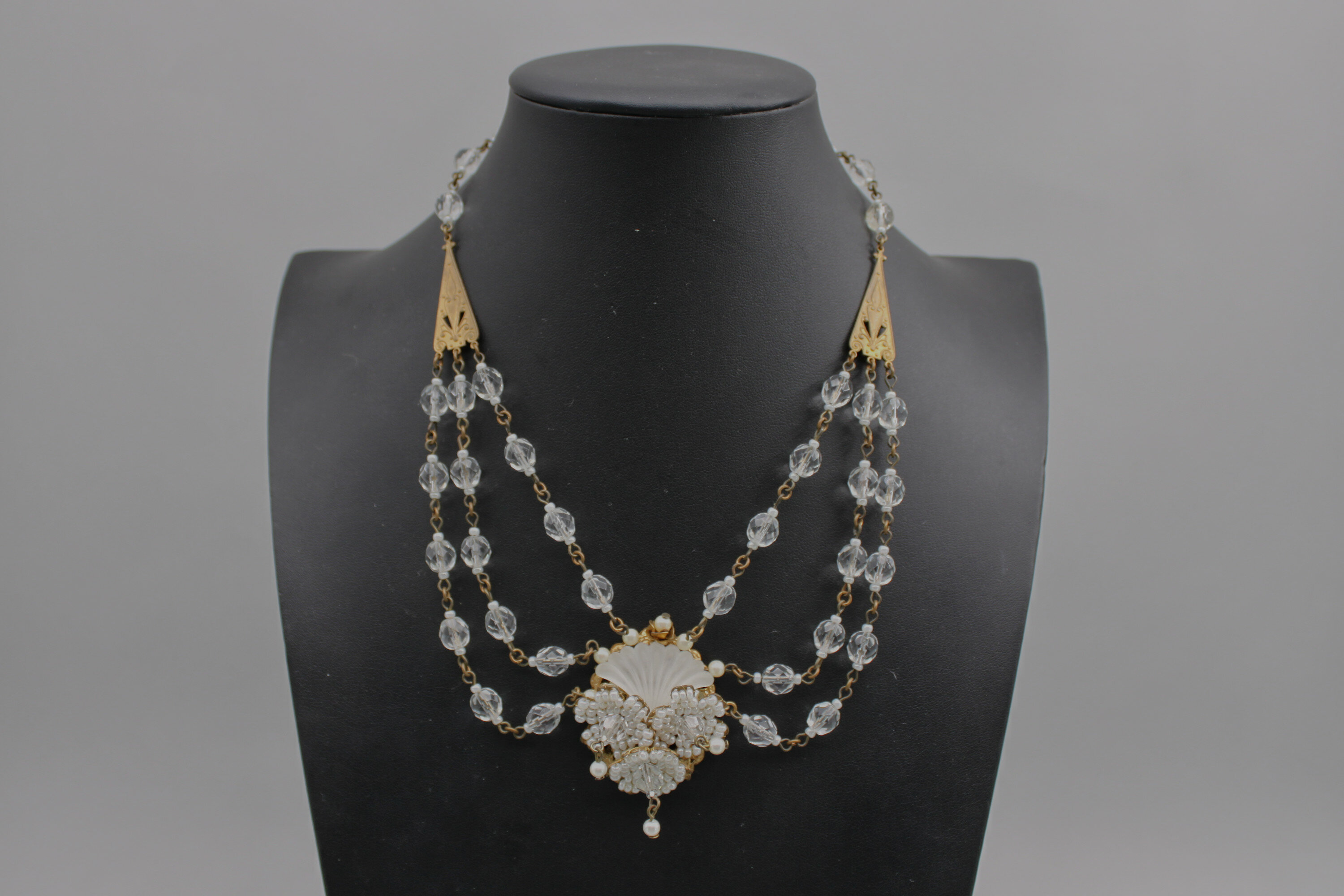 This is a very beautiful necklace with three strands of crystal beads suspended from gilt metal triangular plaques with an art deco style floral design ending in a cluster of three crystal beads in the form of stylised flower heads and a shell form crystal, all set on a gilt metal plaque with an openwork stylised floral design.| Size: | Necklace 44 cm long, central piece 4cm x 3 cm |