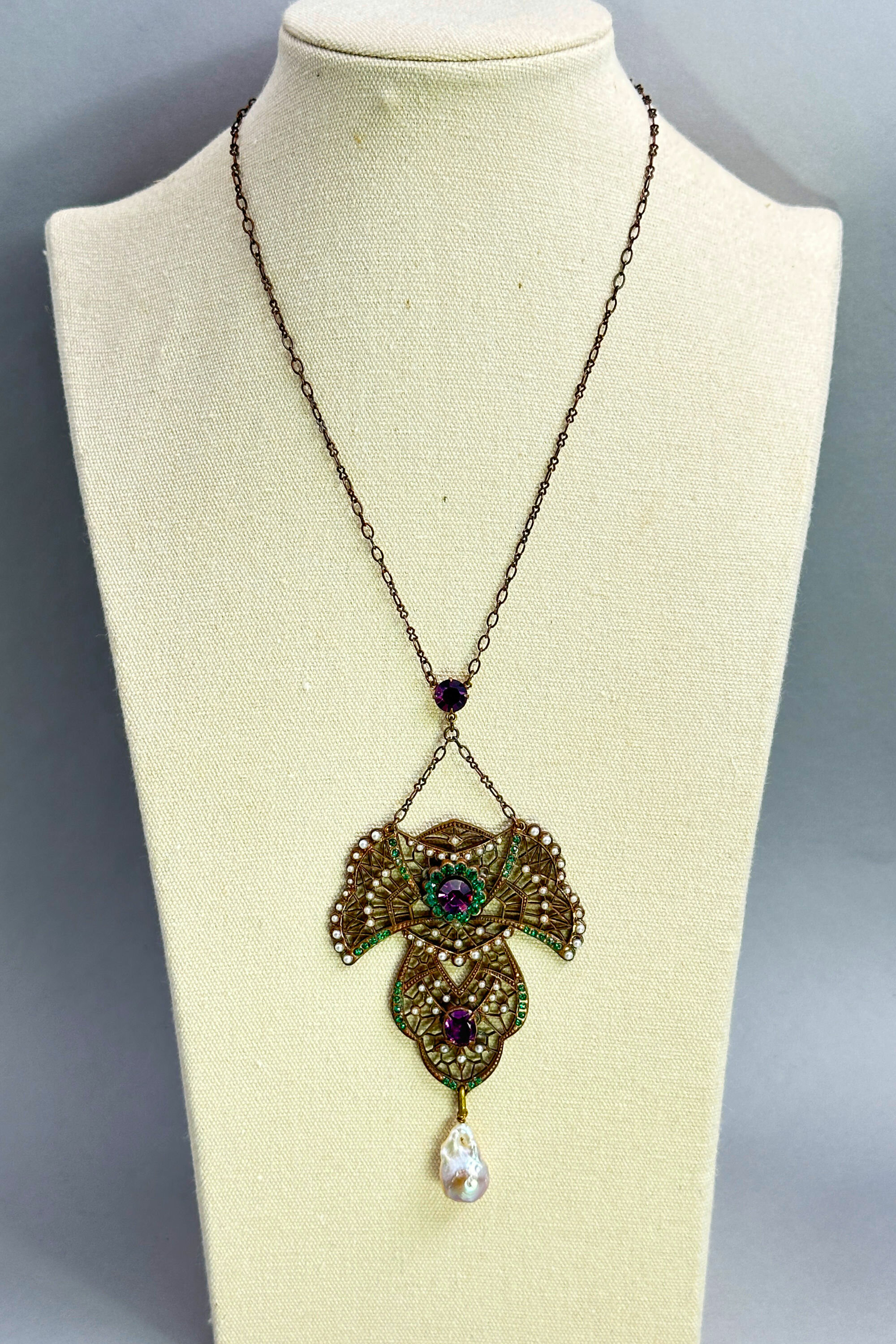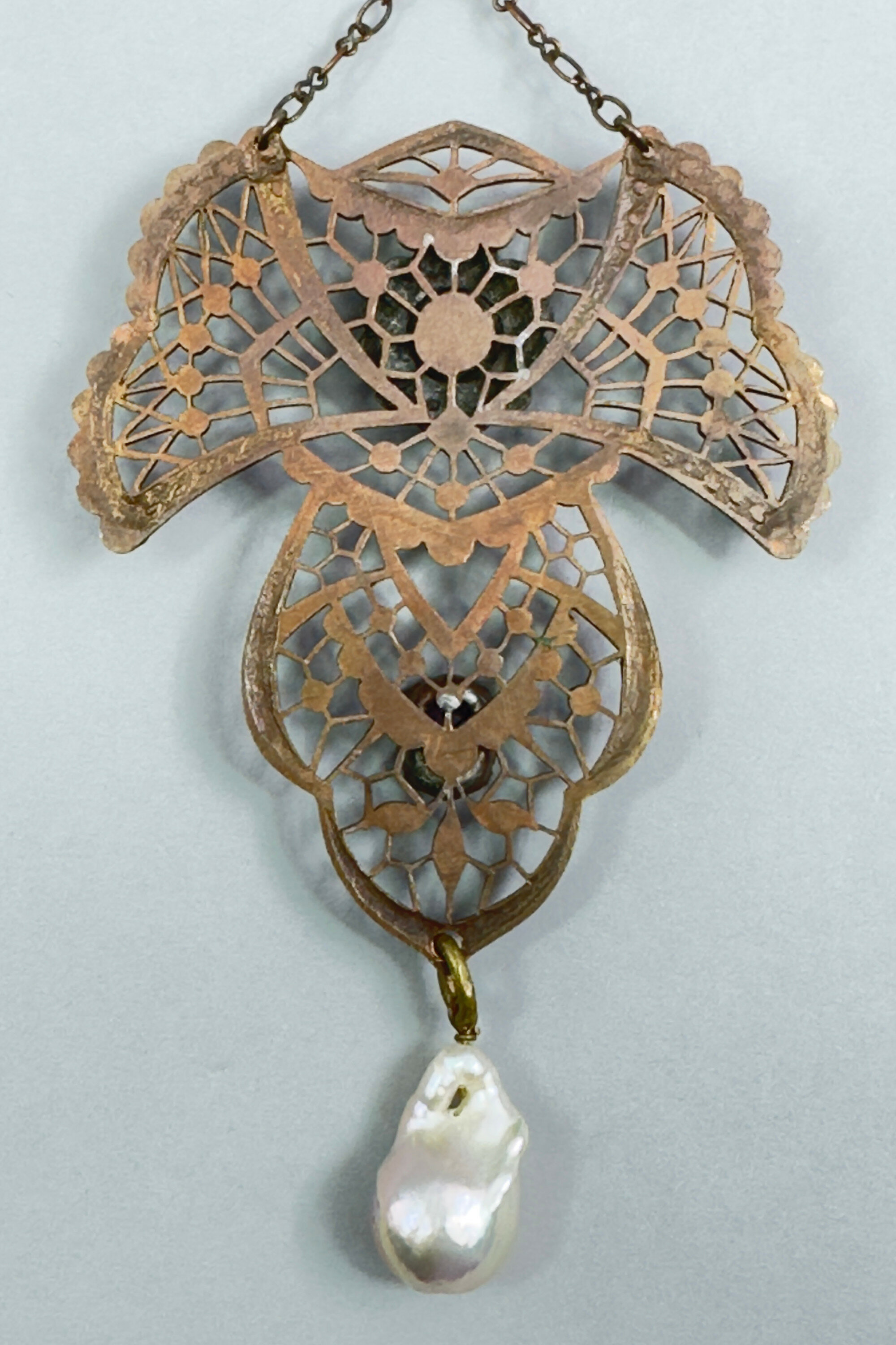 This is a very rare necklace that is in a lariat design. The central pendant has a lace design set with real seed pearls and paste stones. There is also a large teardrop shaped natural fresh water pearl.| Size: | Necklace is 40 cm long, central pendant is 6 x 5.6 cm (without pearl drop) |