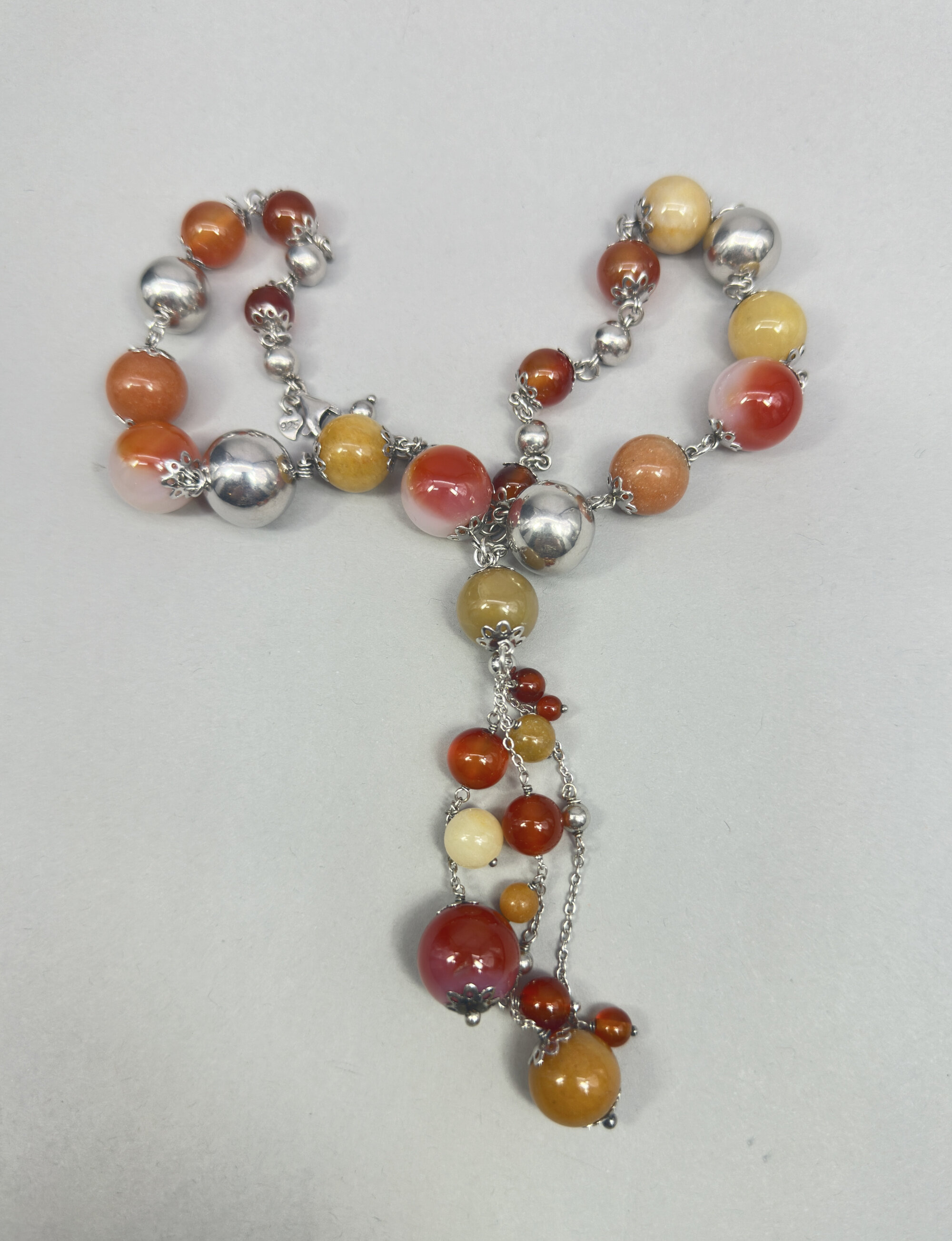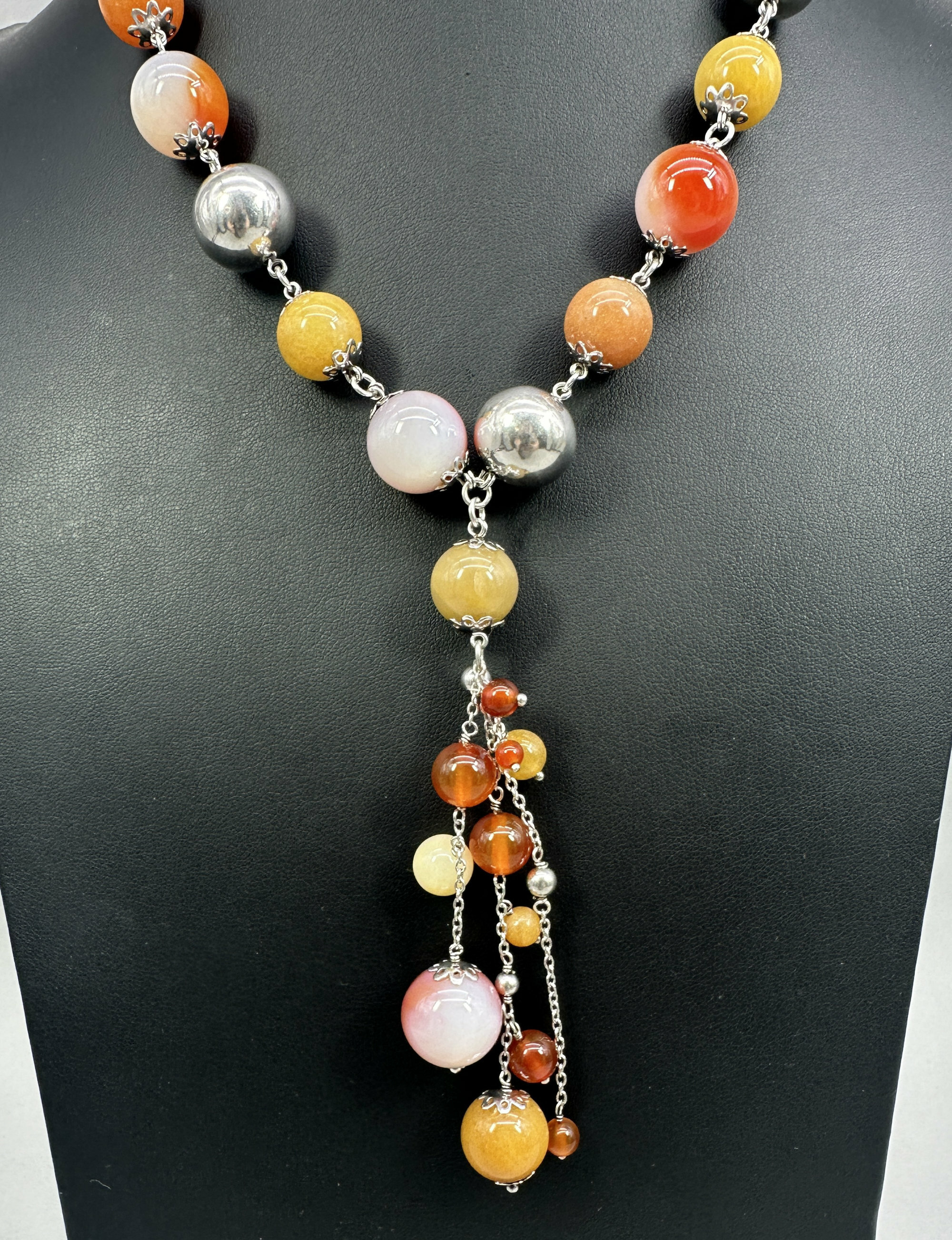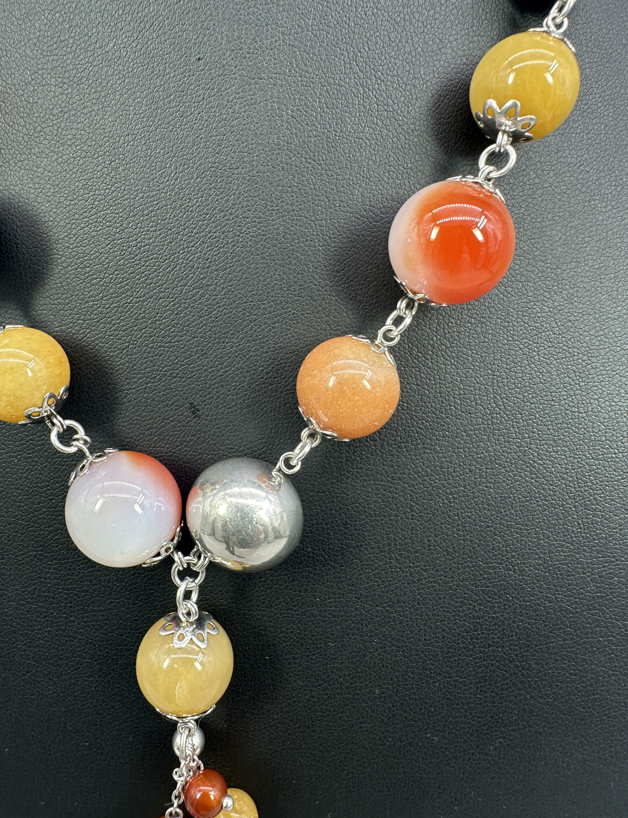 This is a very beautiful necklace comprising graduating beads that are yellow jade, bi colour jade and carnelian. There is a long drop comprising four strands with beads suspended on it to give it a many layered effect. The origin of this necklace is uncertain. it is super quality and is most certainly made by a jewellery designer. Marked 925.| Size: | Max 48 cm long, drop is 9 cm, large stone bead 16.2 mm, large silver bead 16.2 mm |