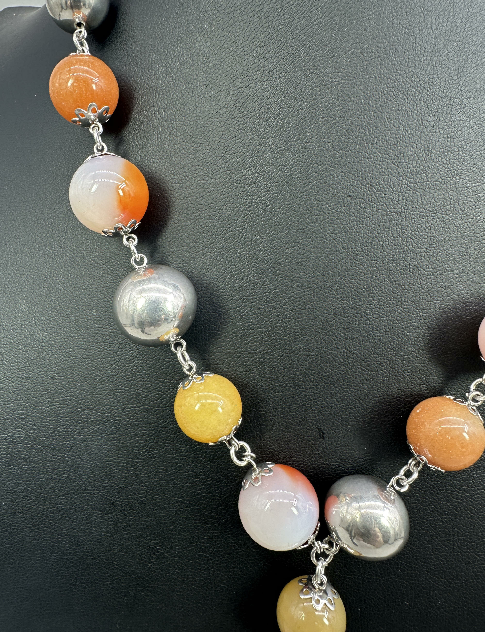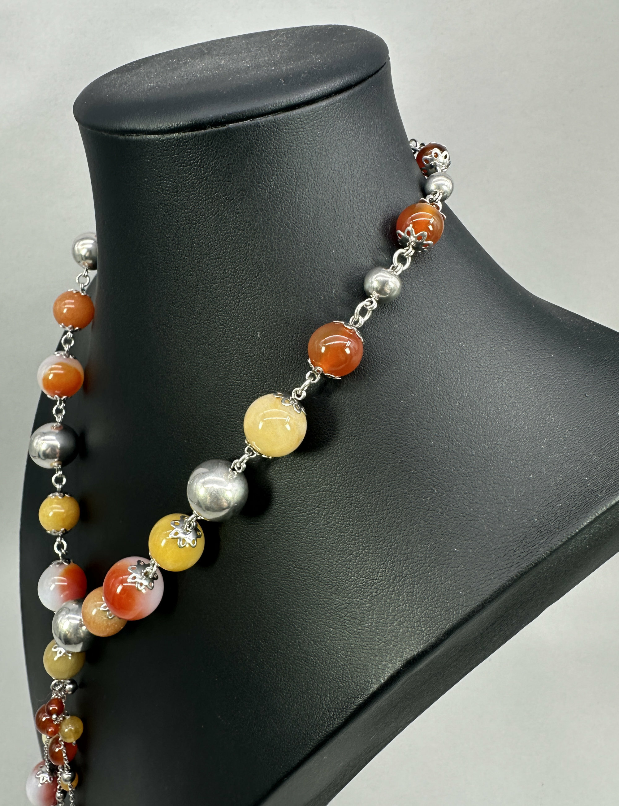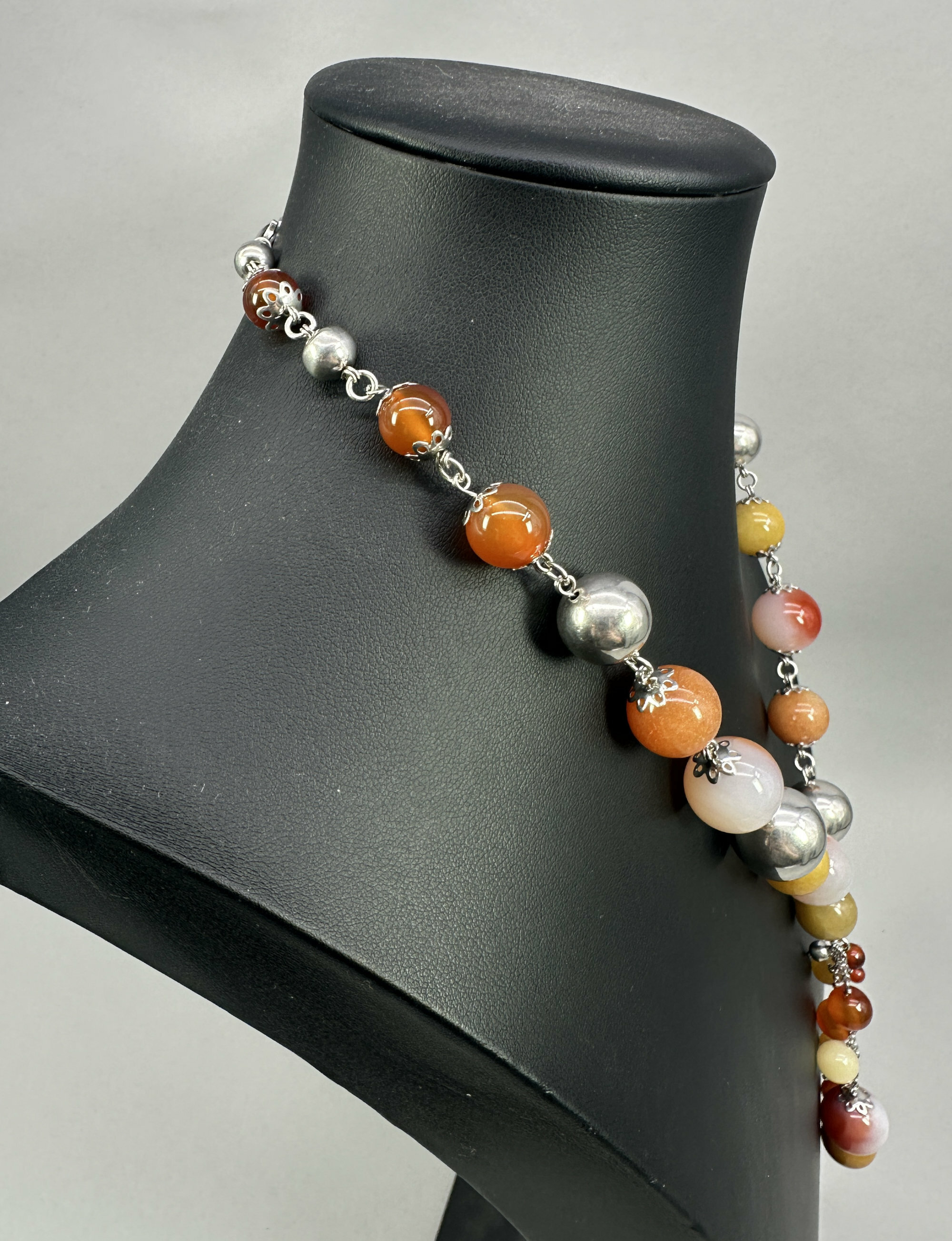 This is a very beautiful necklace comprising graduating beads that are yellow jade, bi colour jade and carnelian. There is a long drop comprising four strands with beads suspended on it to give it a many layered effect. The origin of this necklace is uncertain. it is super quality and is most certainly made by a jewellery designer. Marked 925.| Size: | Max 48 cm long, drop is 9 cm, large stone bead 16.2 mm, large silver bead 16.2 mm |