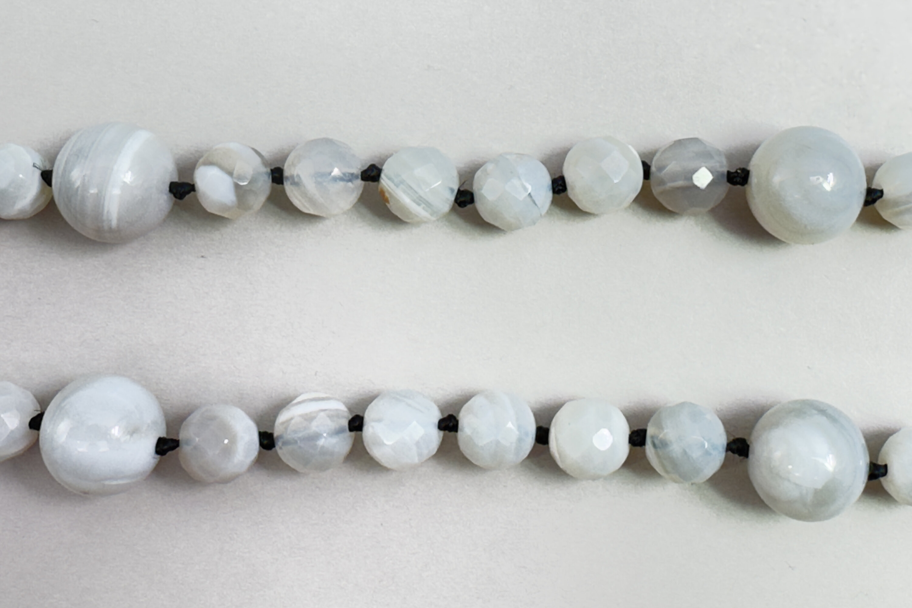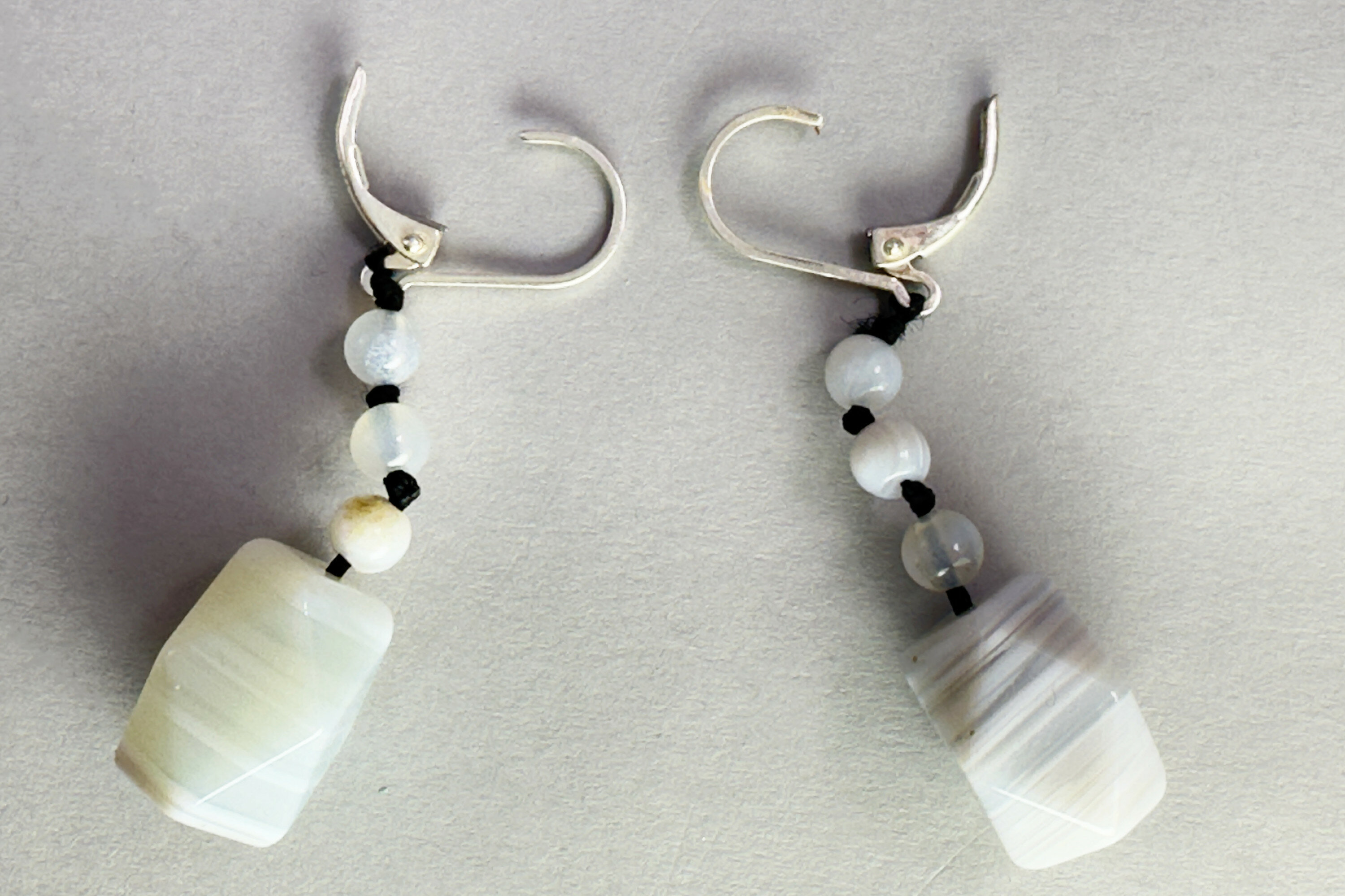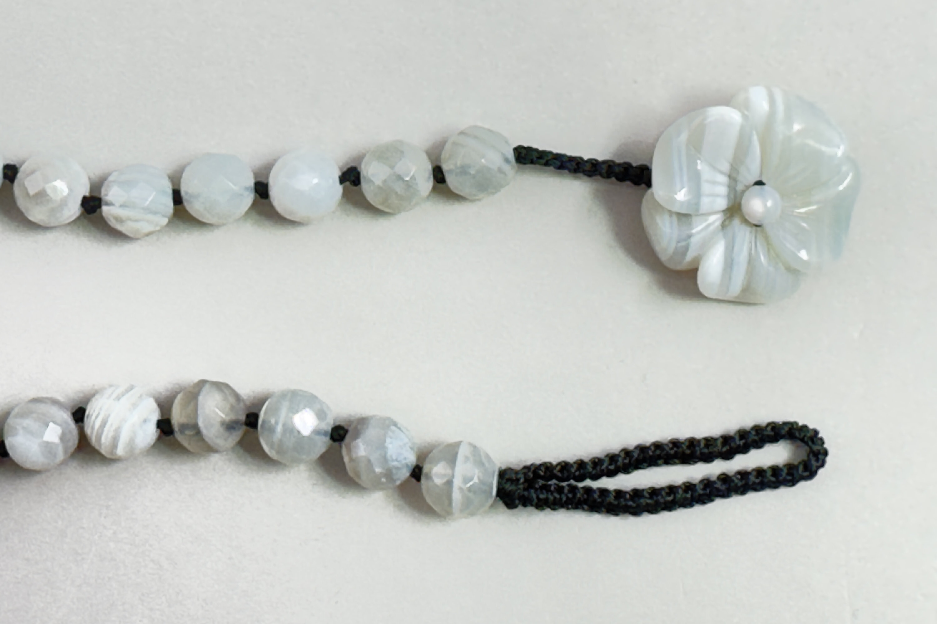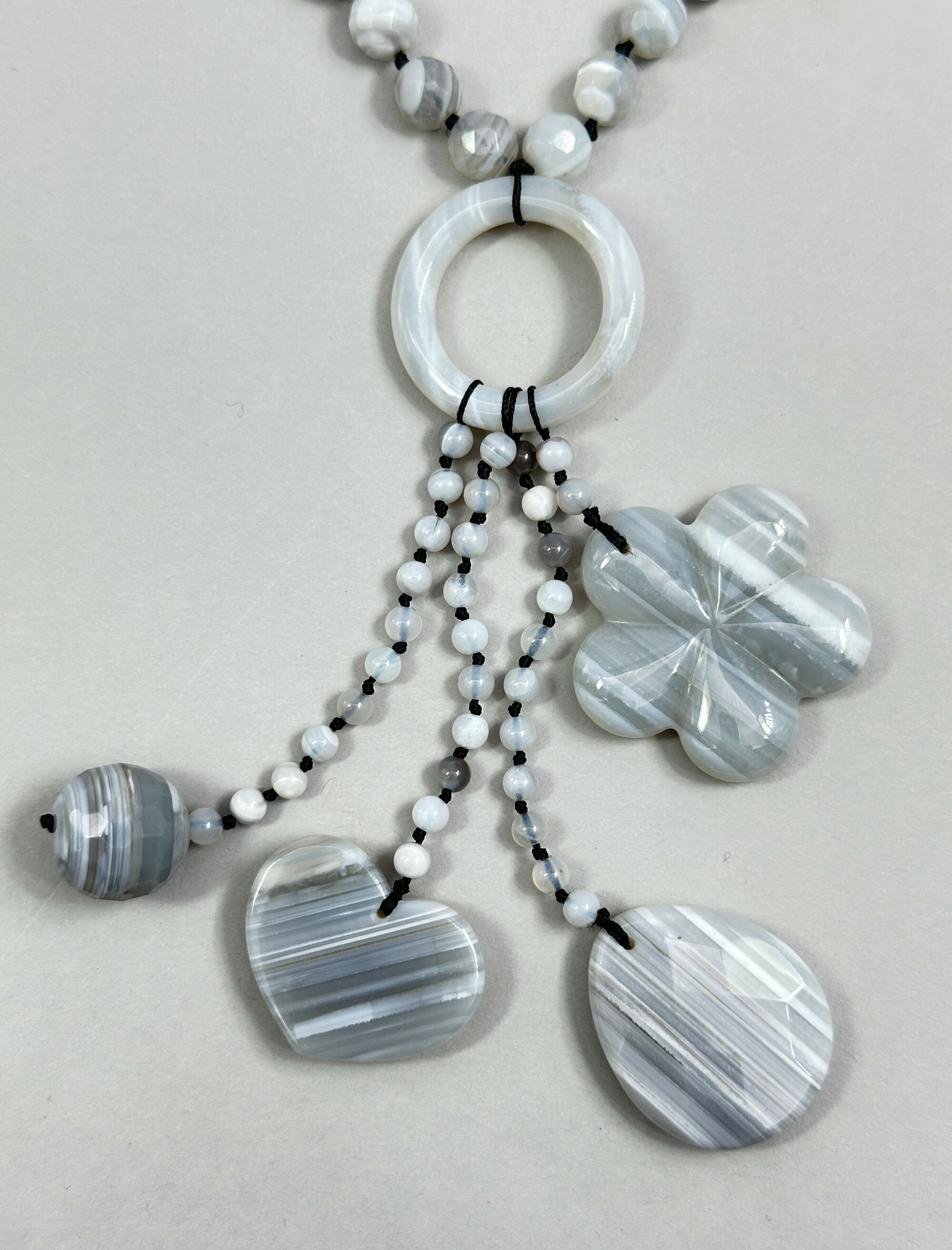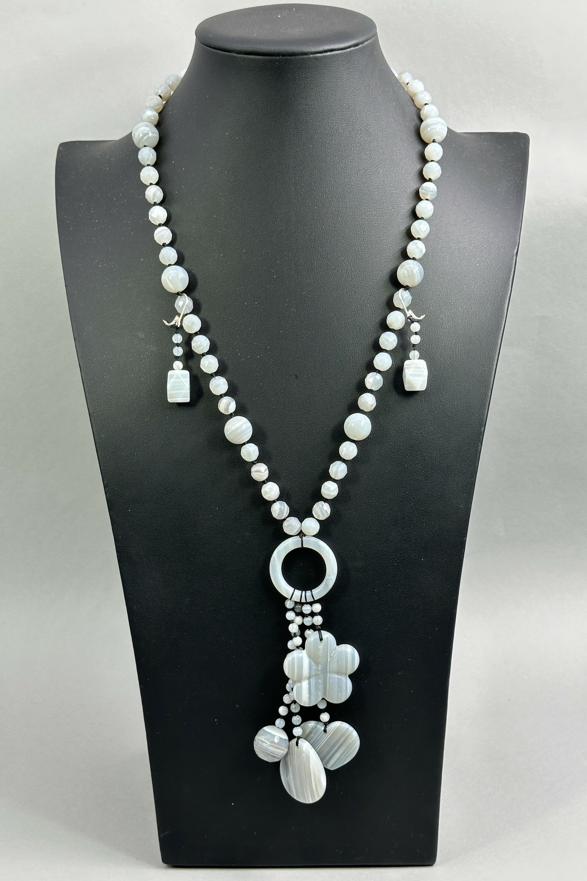 This is a beautiful and detailed set of necklace and earrings in Chinese grey lace agate. The necklace is in a lariat style with beads and a circular carving that has four carved "charms" hanging from it. The beads are facetted agate and the clasp is a very fine carving of a flower. The earring compliment the necklace with carvings that have a barrel shape.| Size: | Necklace is 60 cm length, drop is 12 cm. The circle carving is 3 cm in diameter. |