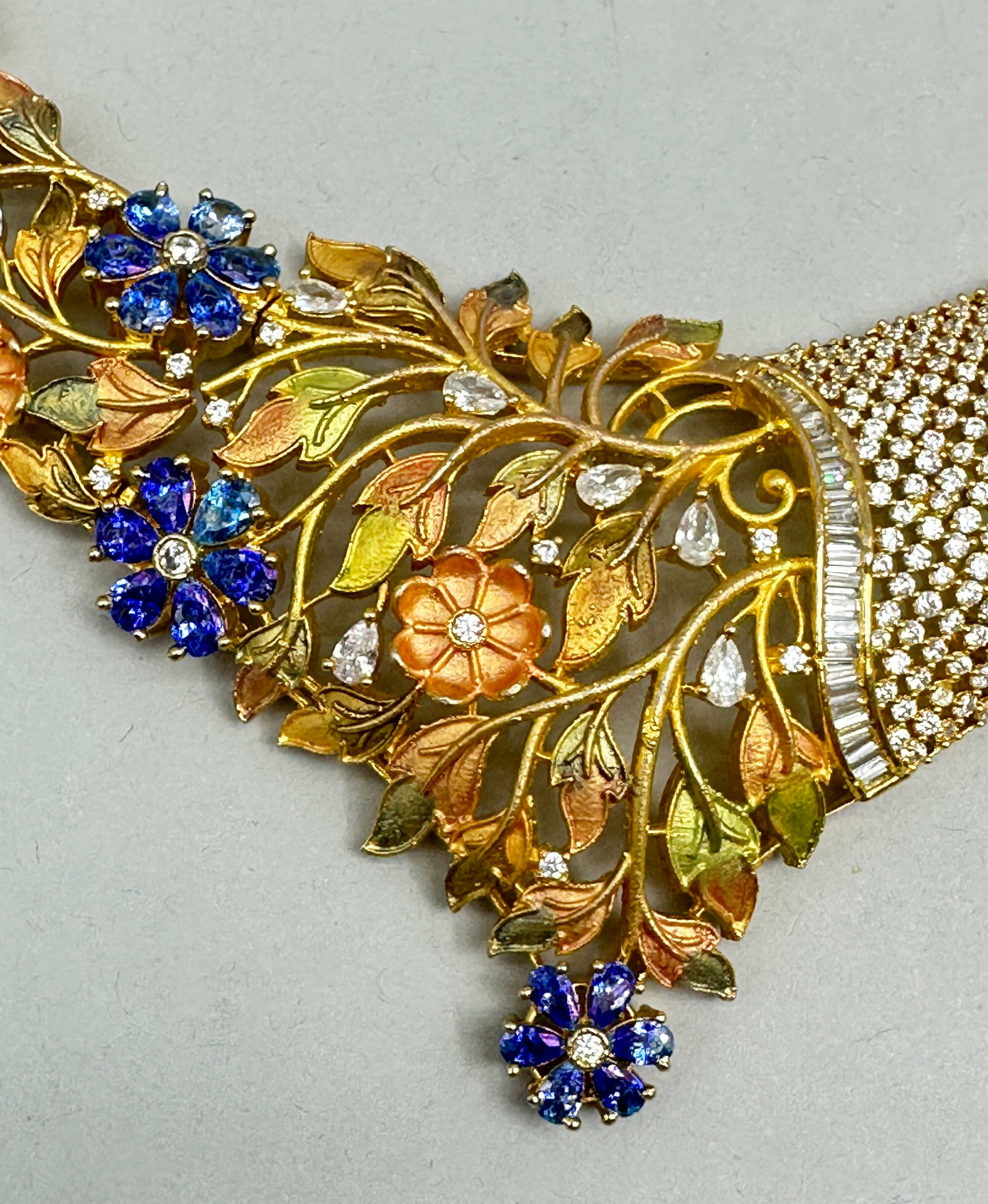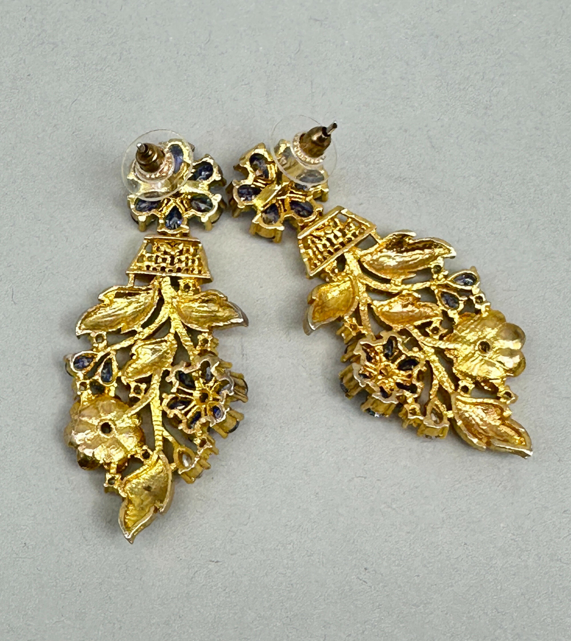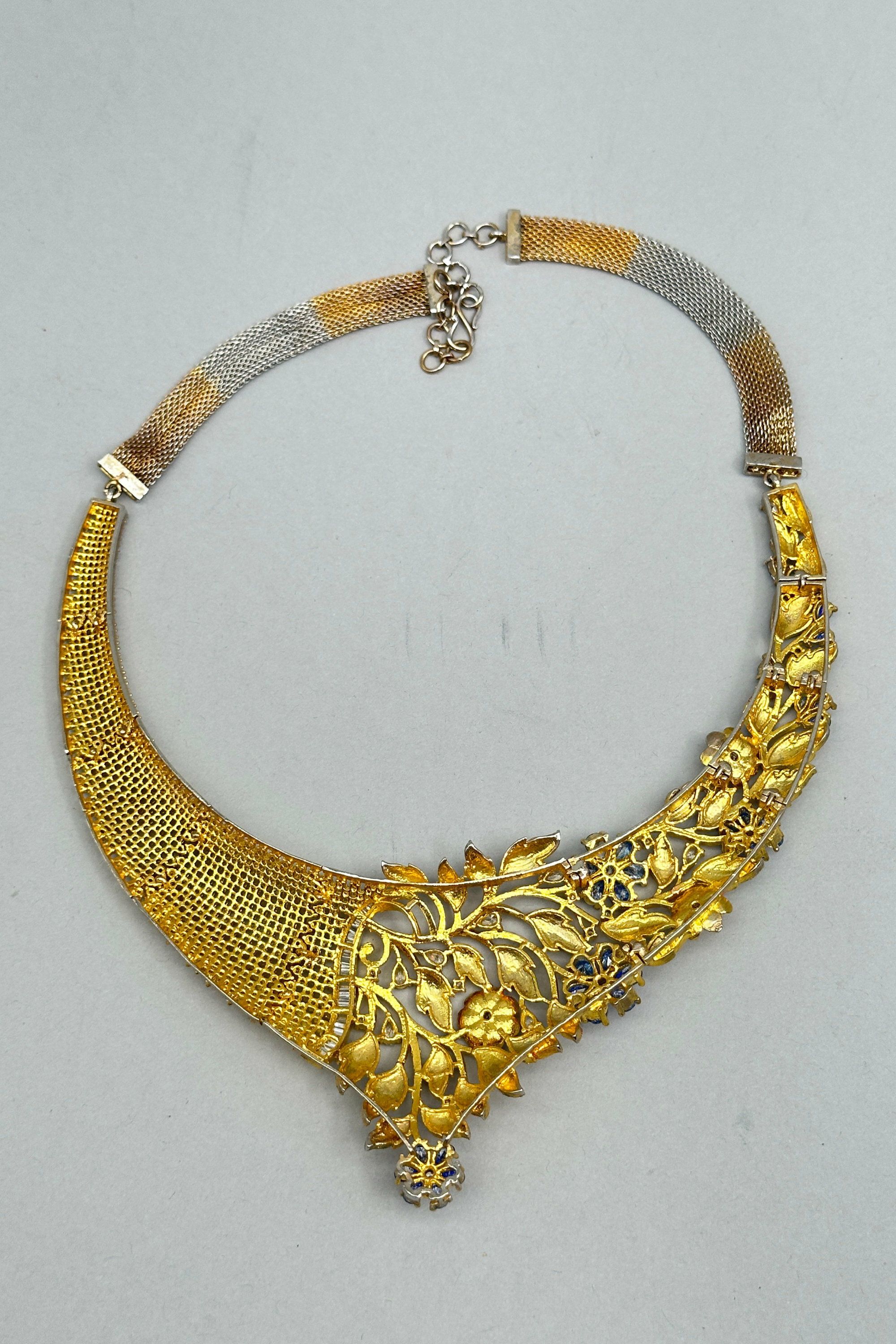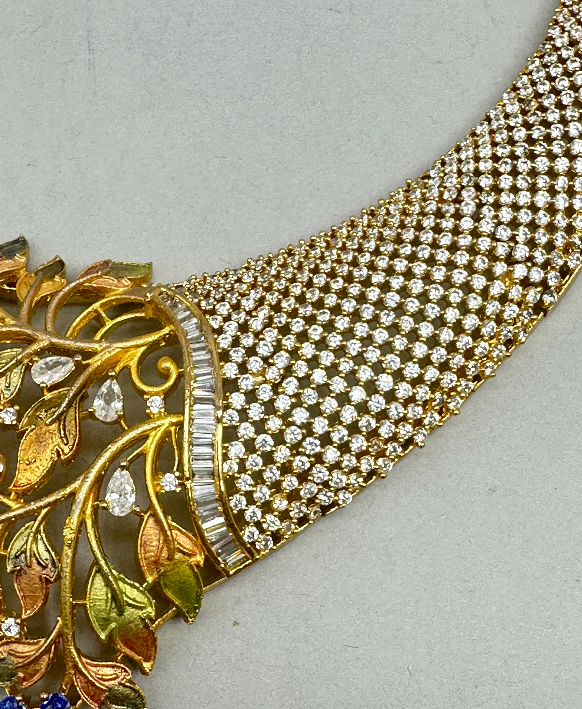 This is an incredible set of necklace and earrings. The necklace has a cornucopia with one side set with diamantes and the other side is a twisting floral design set with diamantes and faux sapphires. It is made of gild metal with a polychroming effect in soft greens and peachy tones. The earrings mirror this design and are just as striking as the necklace. The origin of this set is uncertain; it could perhaps be American but it will certainly attract attention!| Size: | Necklace is 50 cm, Large breastplate is 15 cm side to side and the thickest part measures 5.8 cm |