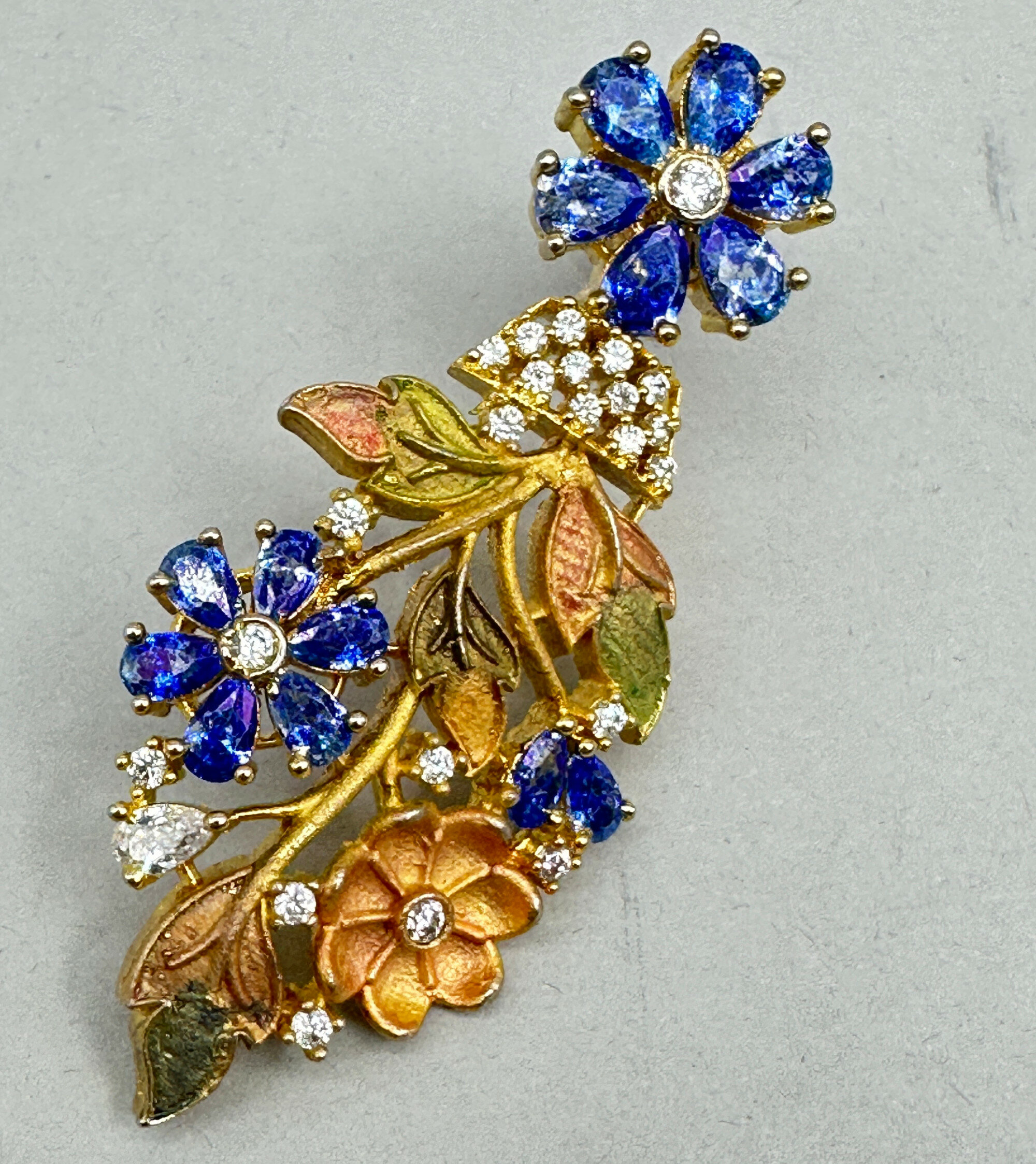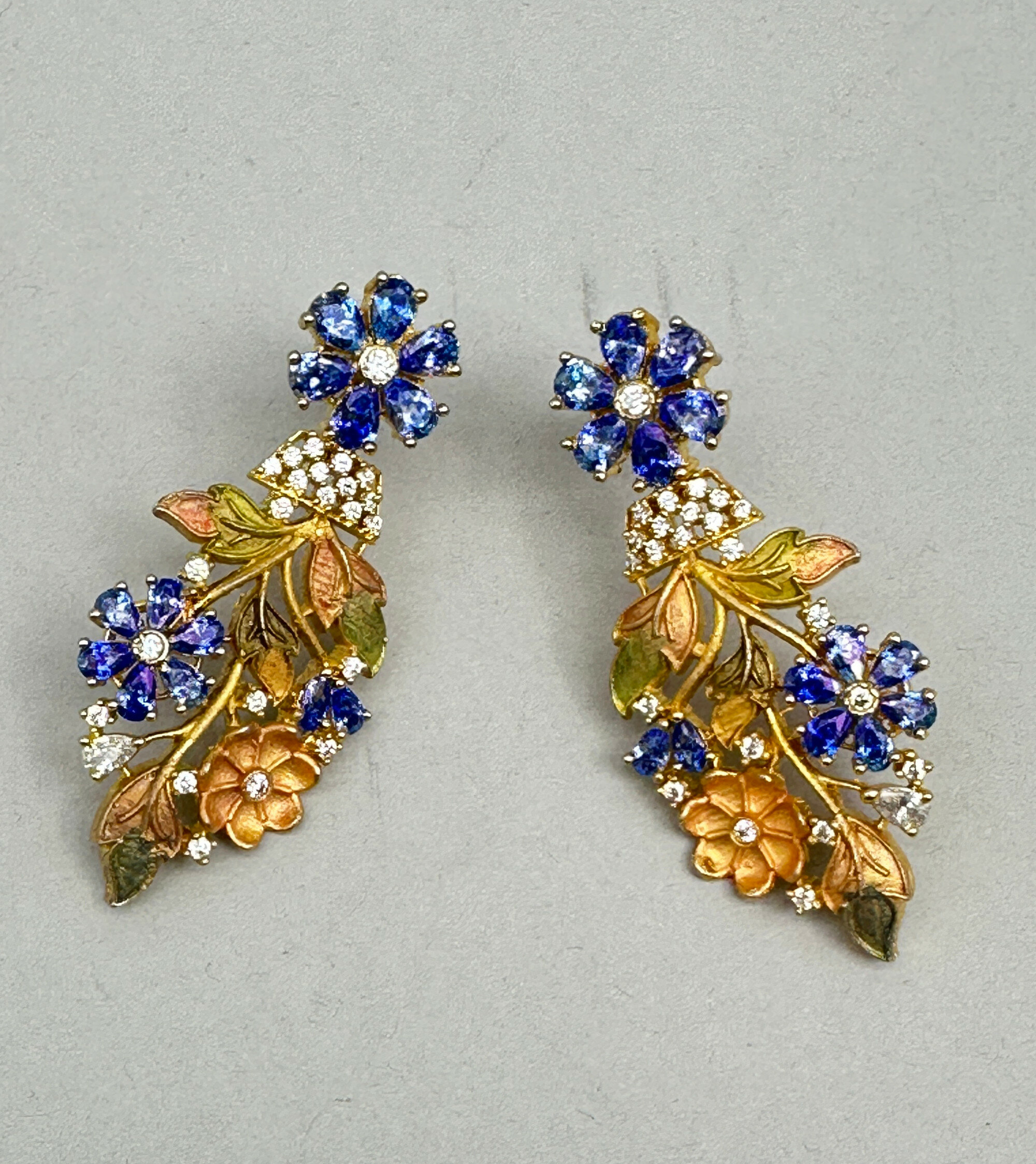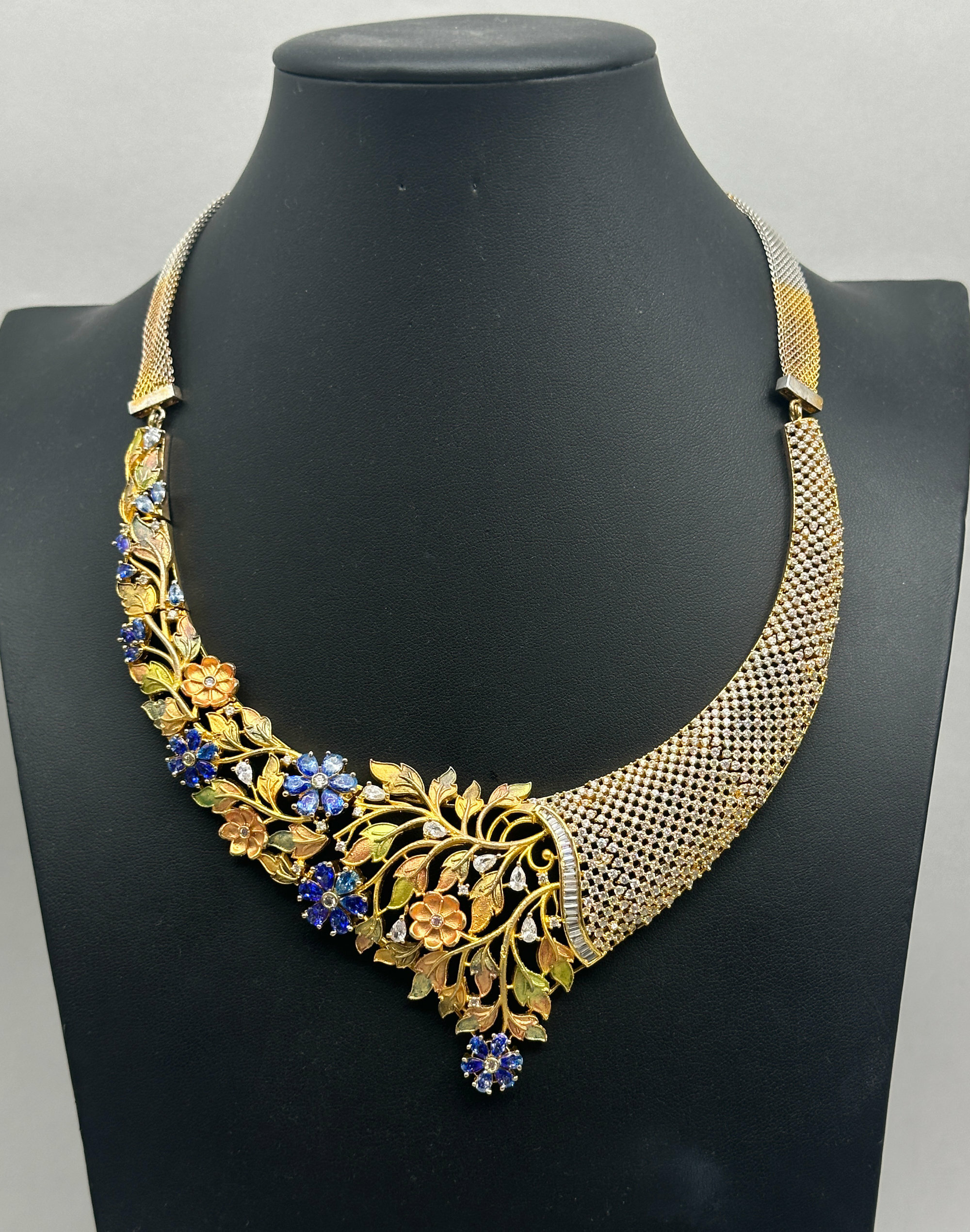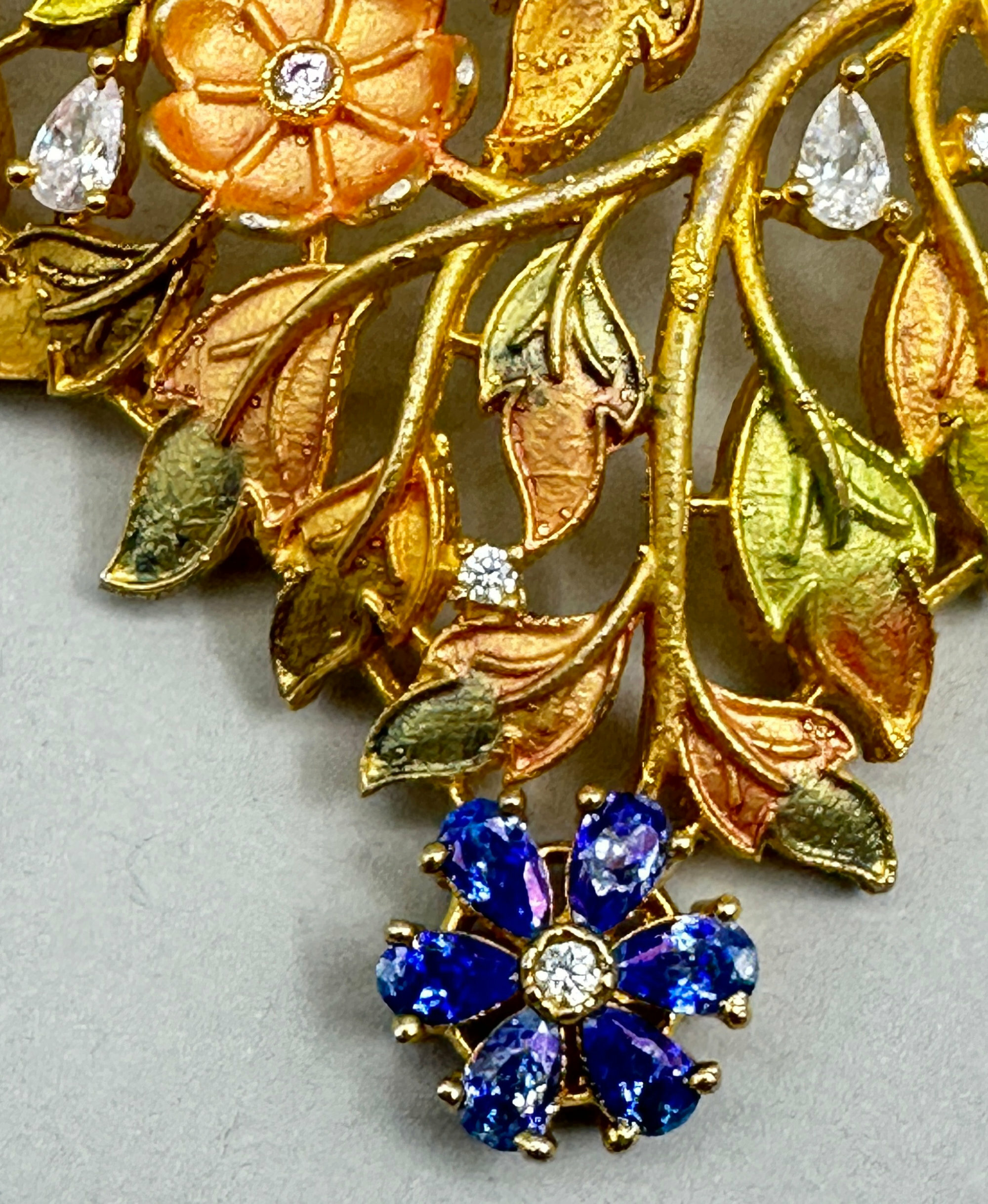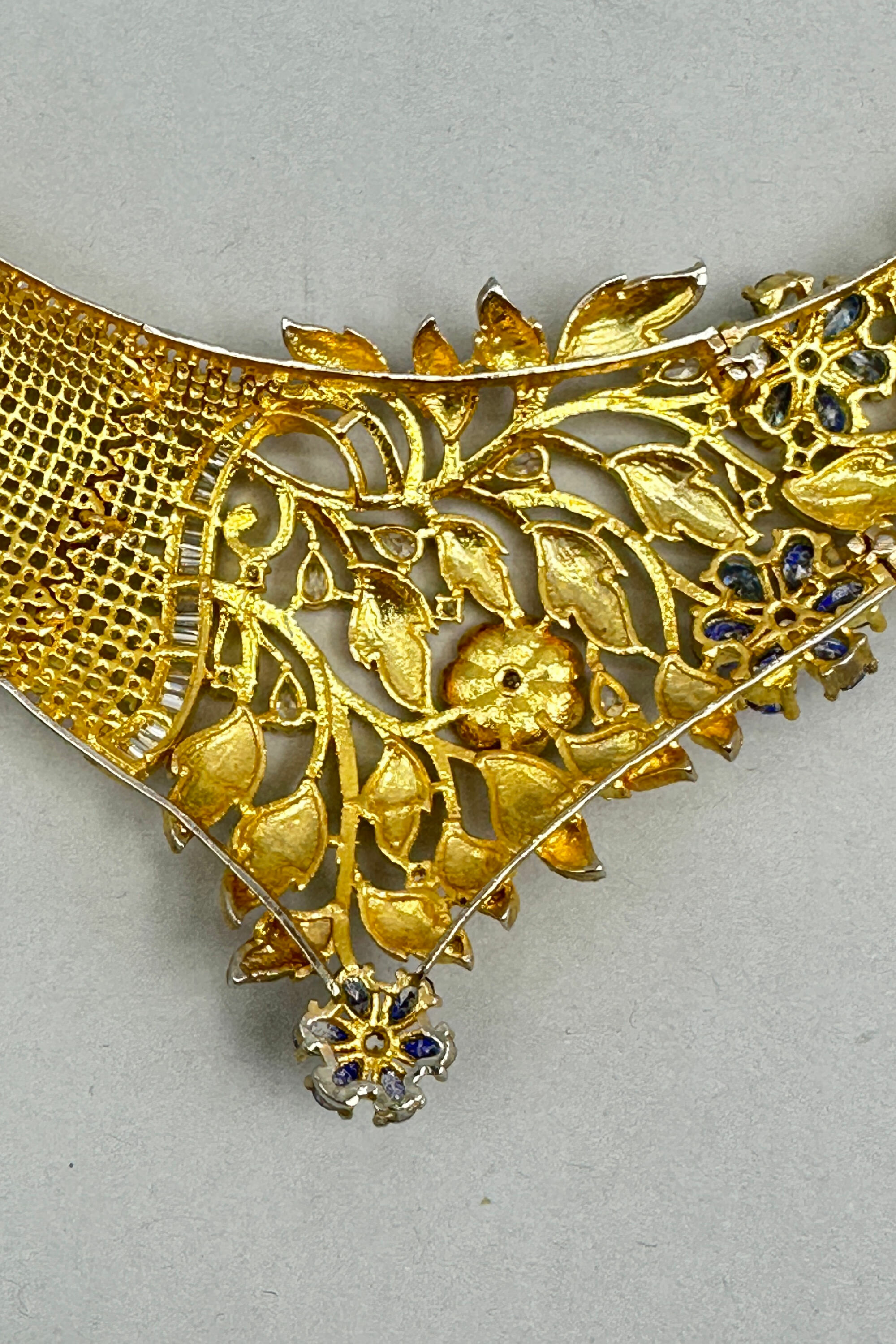 This is an incredible set of necklace and earrings. The necklace has a cornucopia with one side set with diamantes and the other side is a twisting floral design set with diamantes and faux sapphires. It is made of gild metal with a polychroming effect in soft greens and peachy tones. The earrings mirror this design and are just as striking as the necklace. The origin of this set is uncertain; it could perhaps be American but it will certainly attract attention!| Size: | Necklace is 50 cm, Large breastplate is 15 cm side to side and the thickest part measures 5.8 cm |