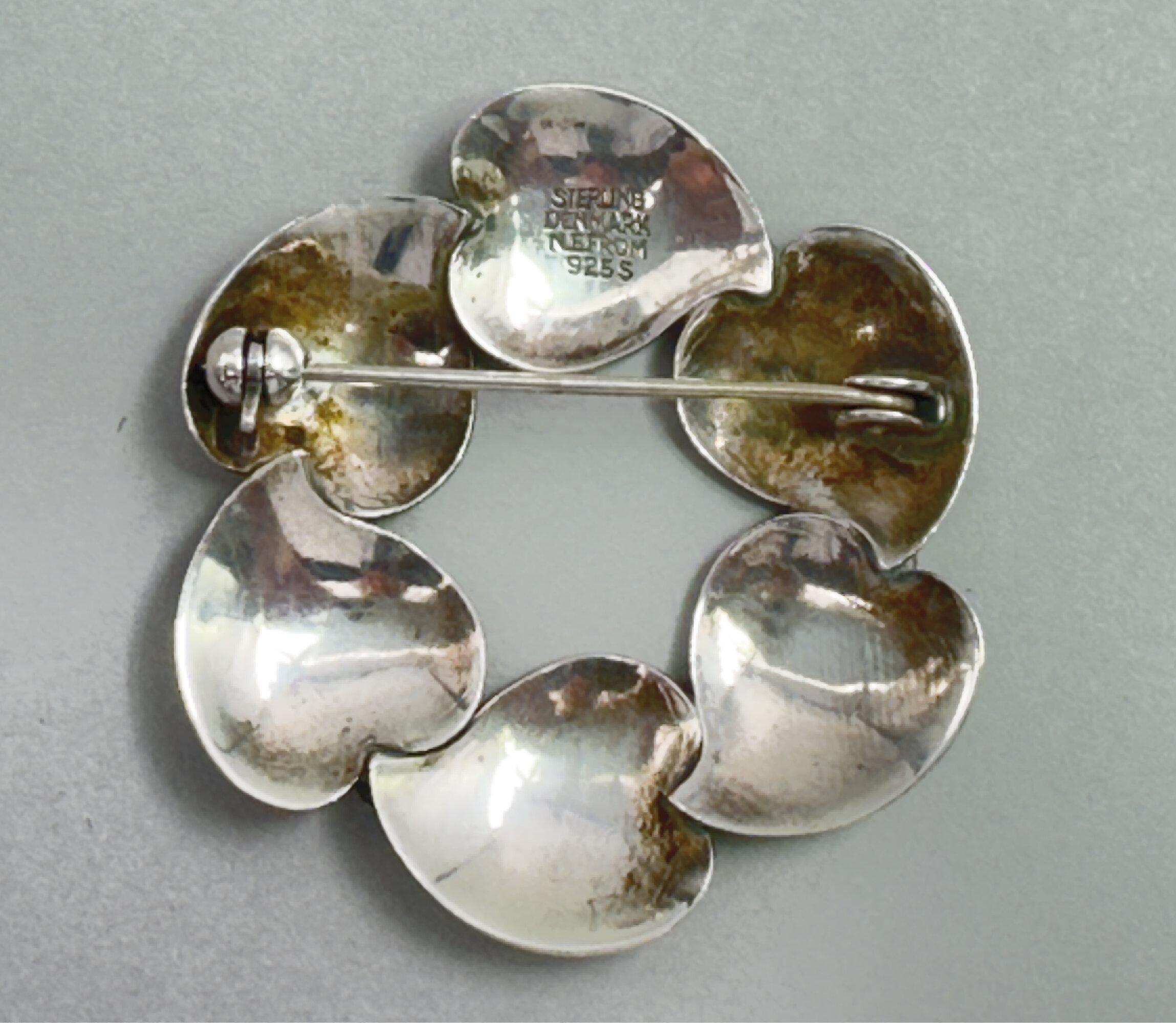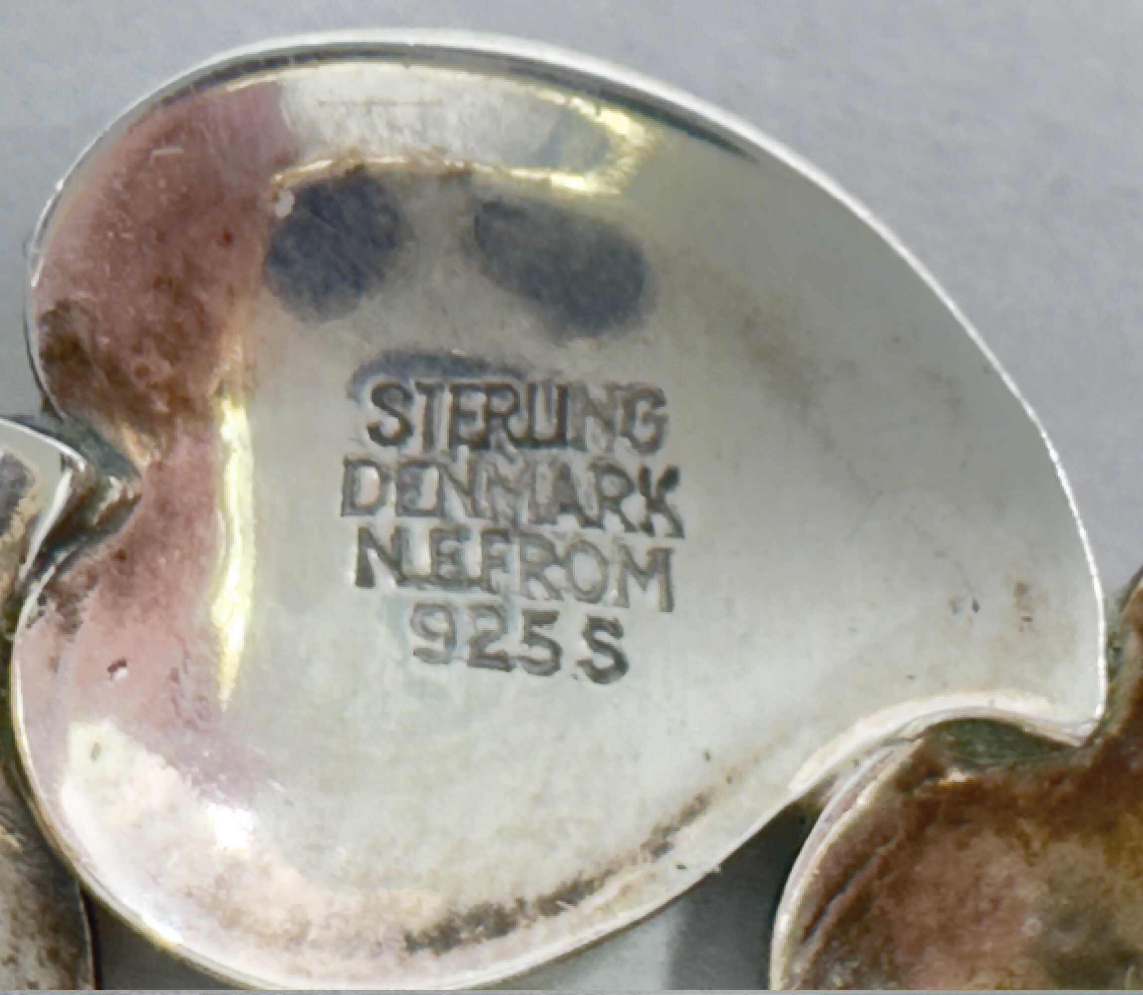 This is a wonderful quality silver brooch made by Danish silversmiths Niels Erik From. It is in a characteristic Danish wreath design typical of the modernist designs developed by the firm in the 1970s. Established in 1931, the company took its name from its founder Niels Erik From (1908-1982) and initially concentrated on pieces in the style of the Danish Arts and crafts movement, later adapting to the changing fashions of the time. Niels Erik From's son joined with his father in the 1960s and continued the success of the business, running it himself for a few years after his Father's death but finally closing down in the late 1980s. The firm's designs remain highly collectible and this brooch is an excellent example of their later work. It marked ' Sterling' 'Denmark' 'N.E.From' '925 S'.| Size: | 3.79 diameter |