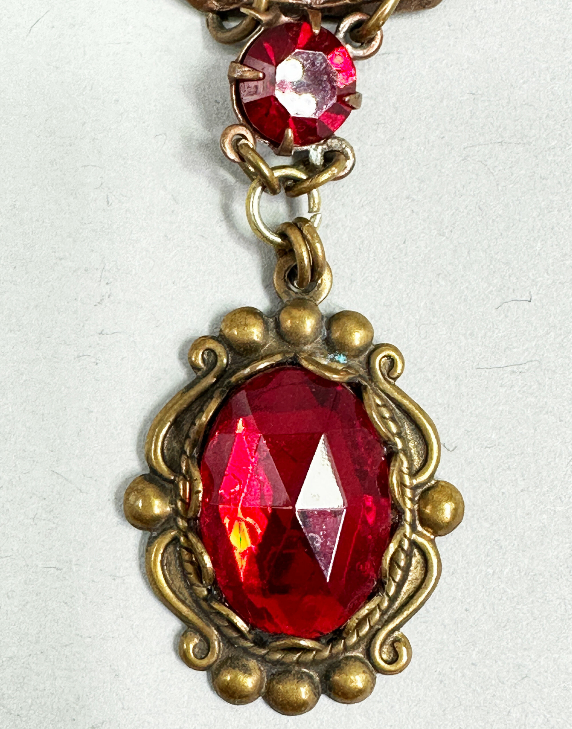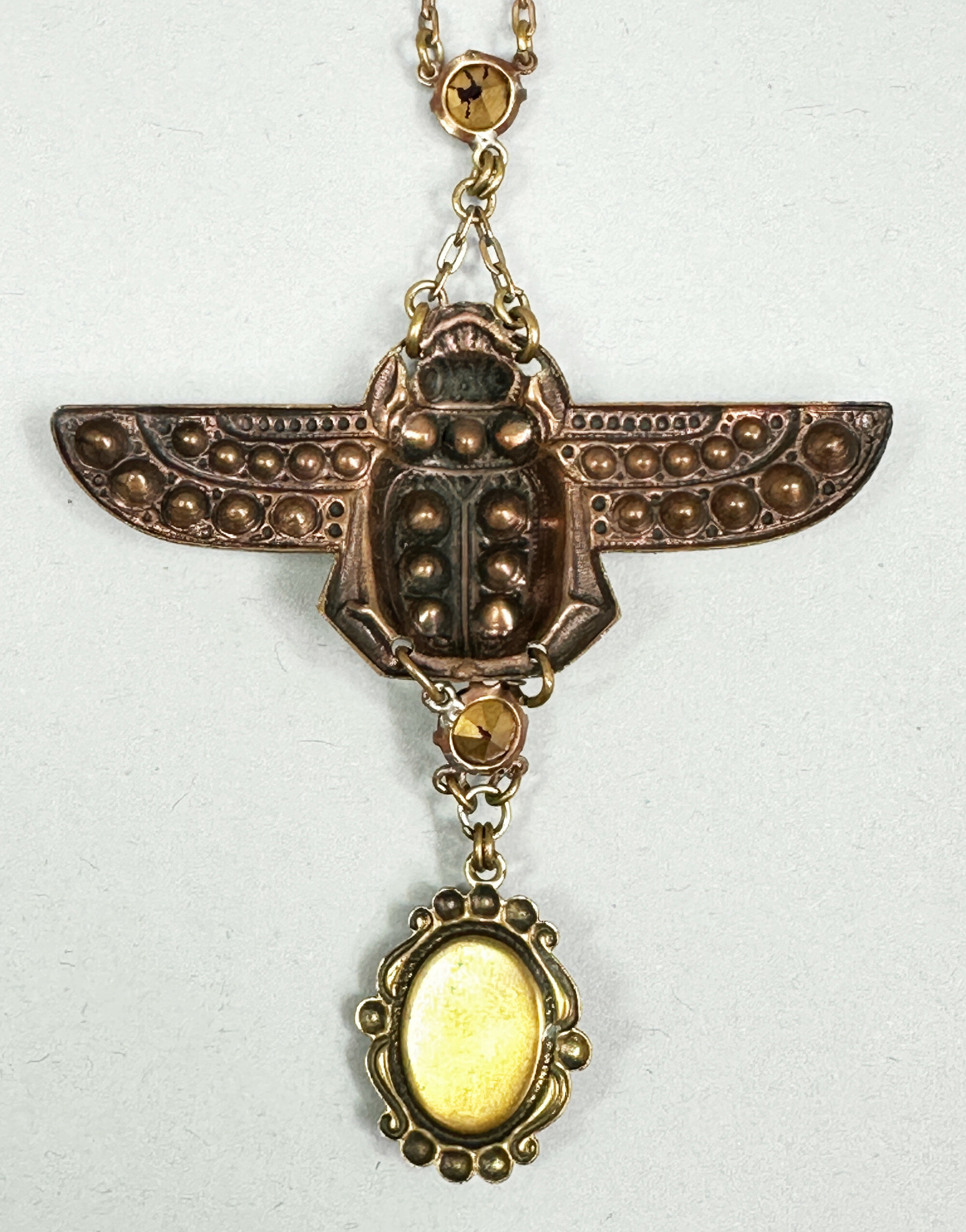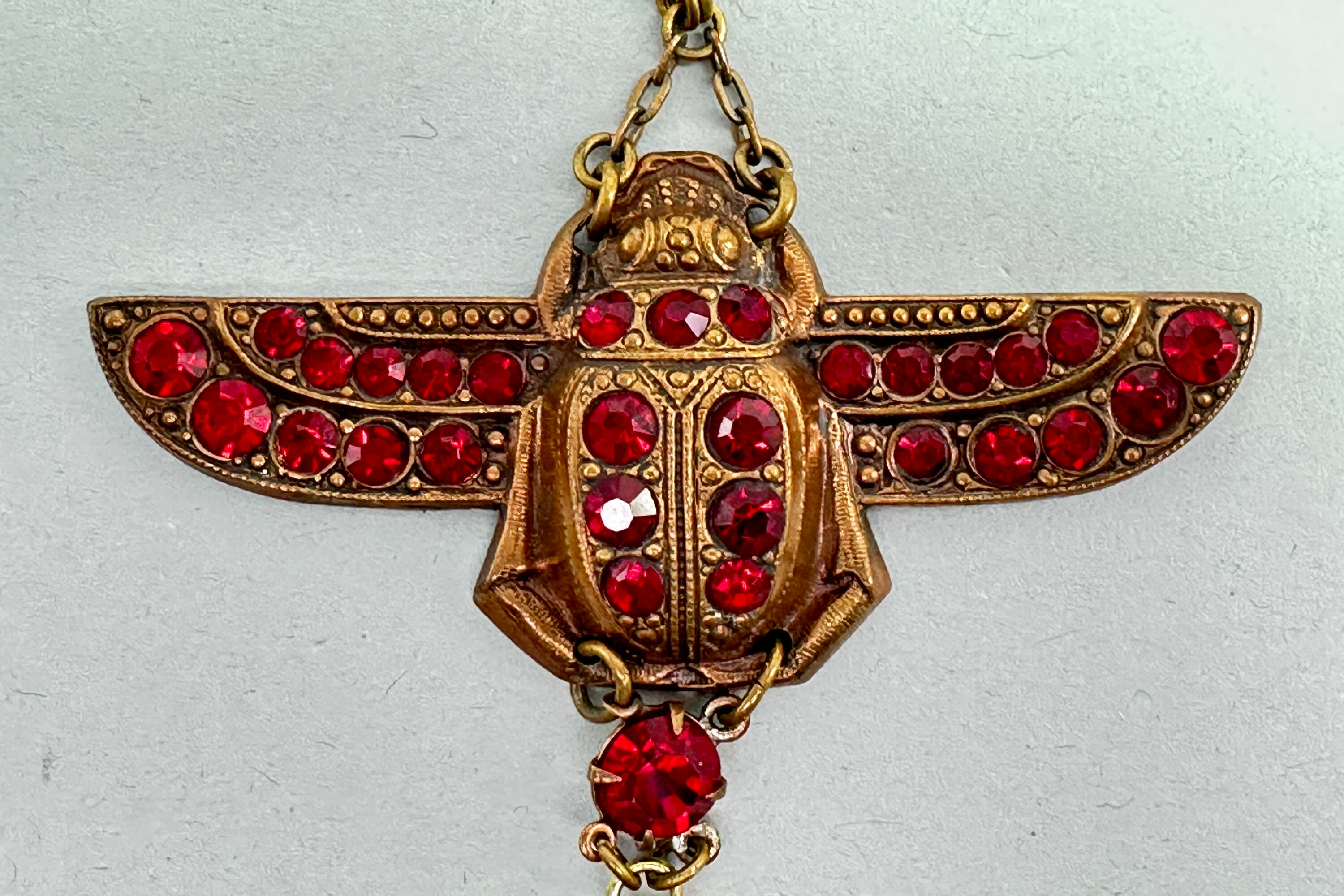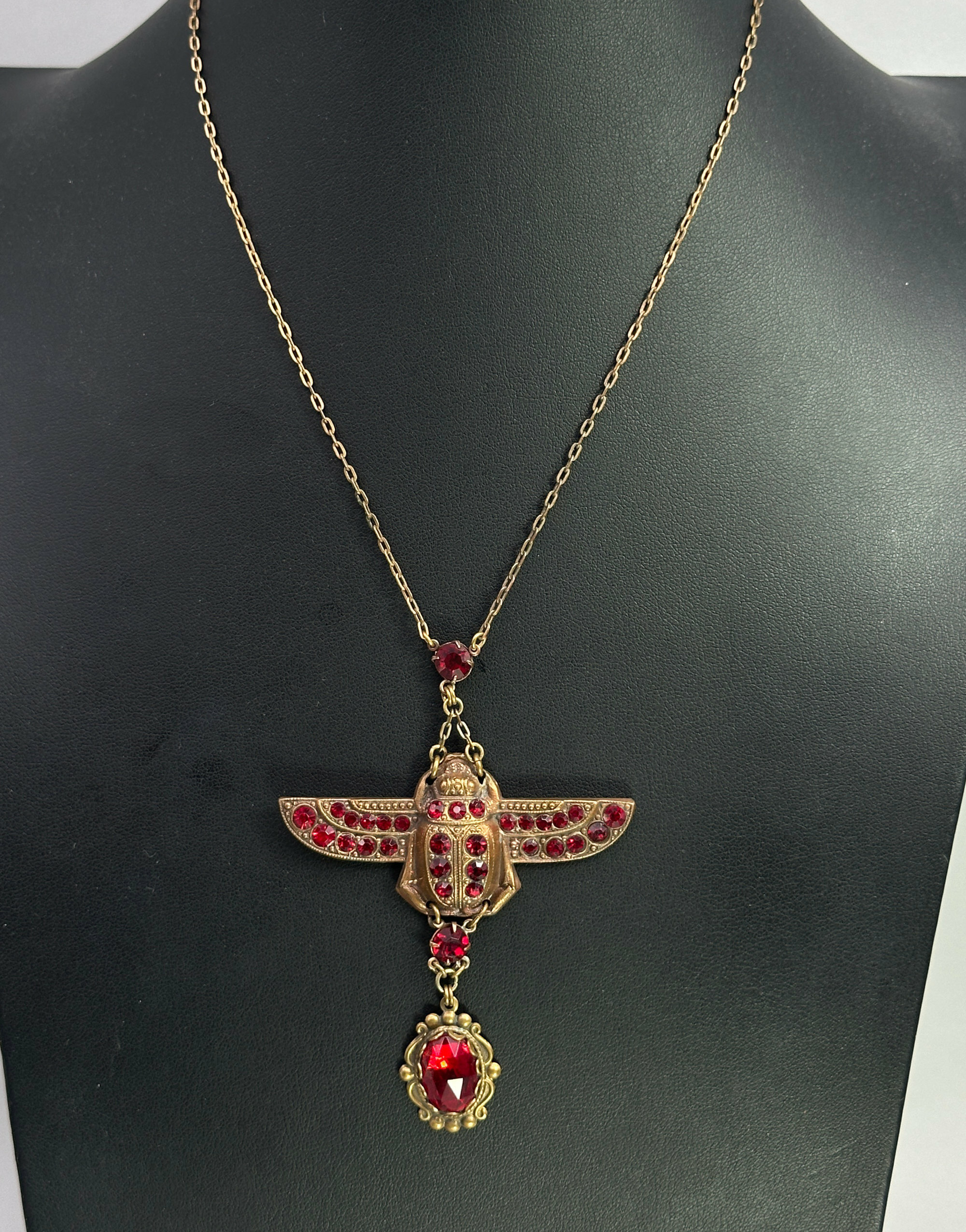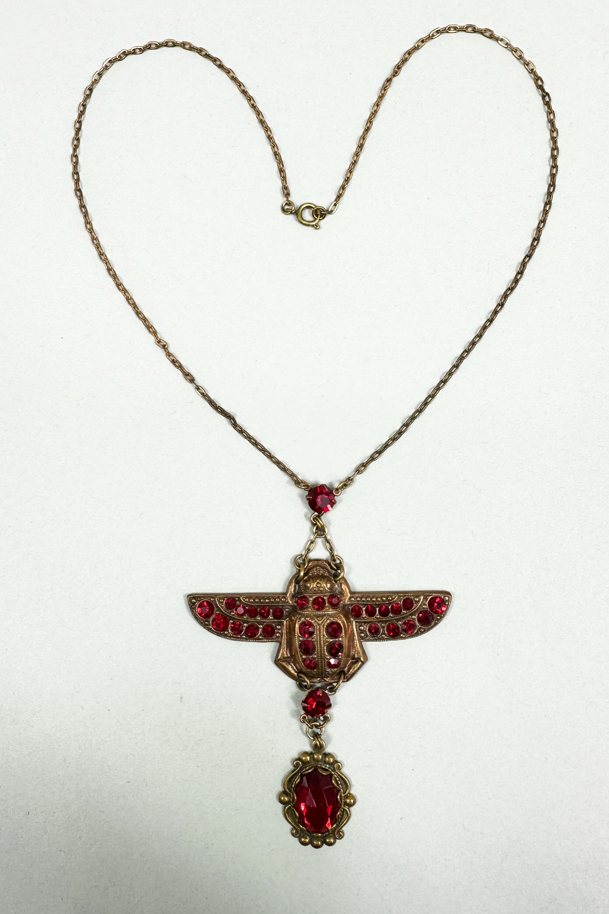 This is a lovely example of early Egyptian Revival that was popular in the 19th century. It comprises a lariat style pendant in the shape of a winged scarab ending with a tradtional Victorian style drop with vivid red stones.| Size: | Necklace is 42 cm long, Pendant is 7 x 6 cm with drop |