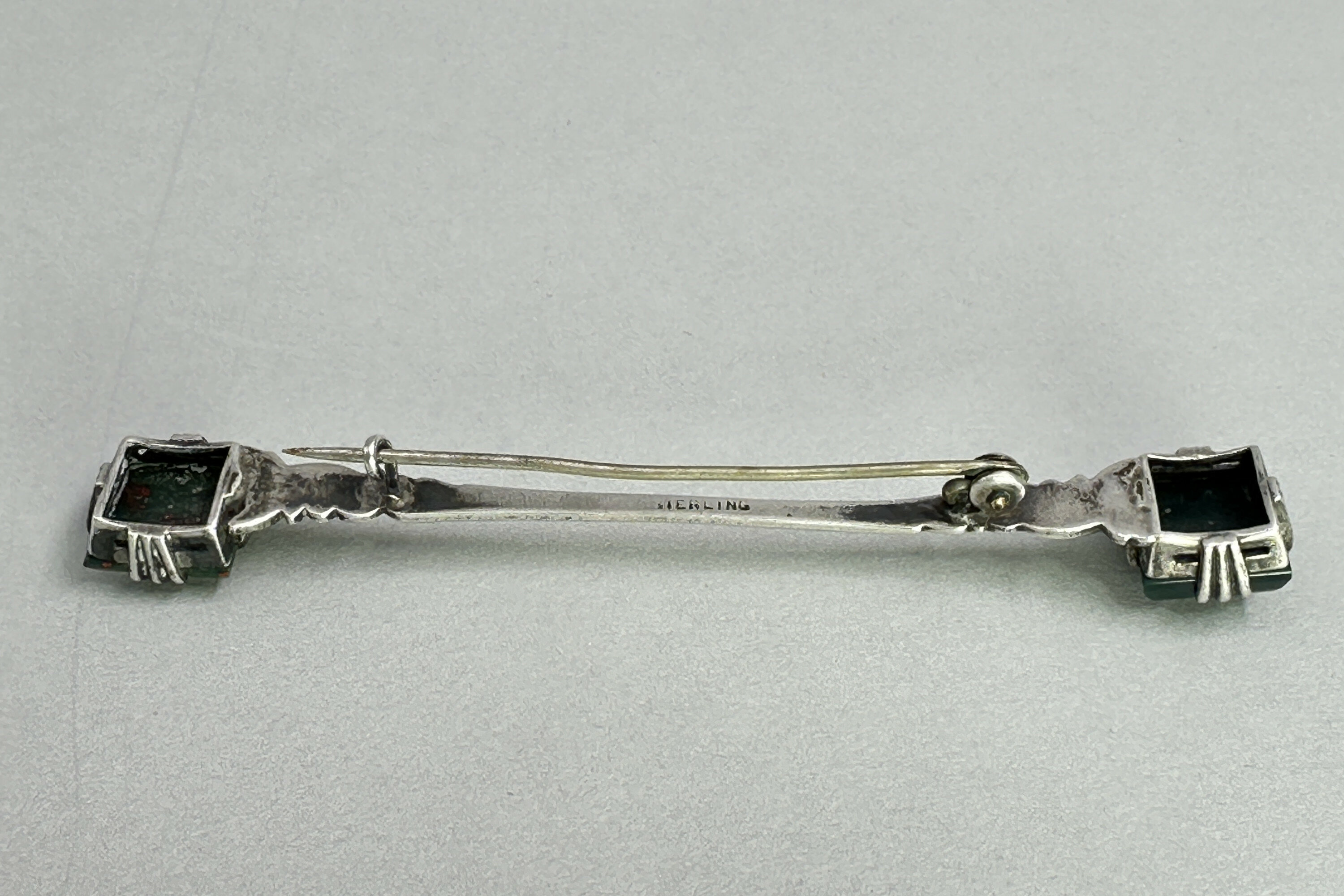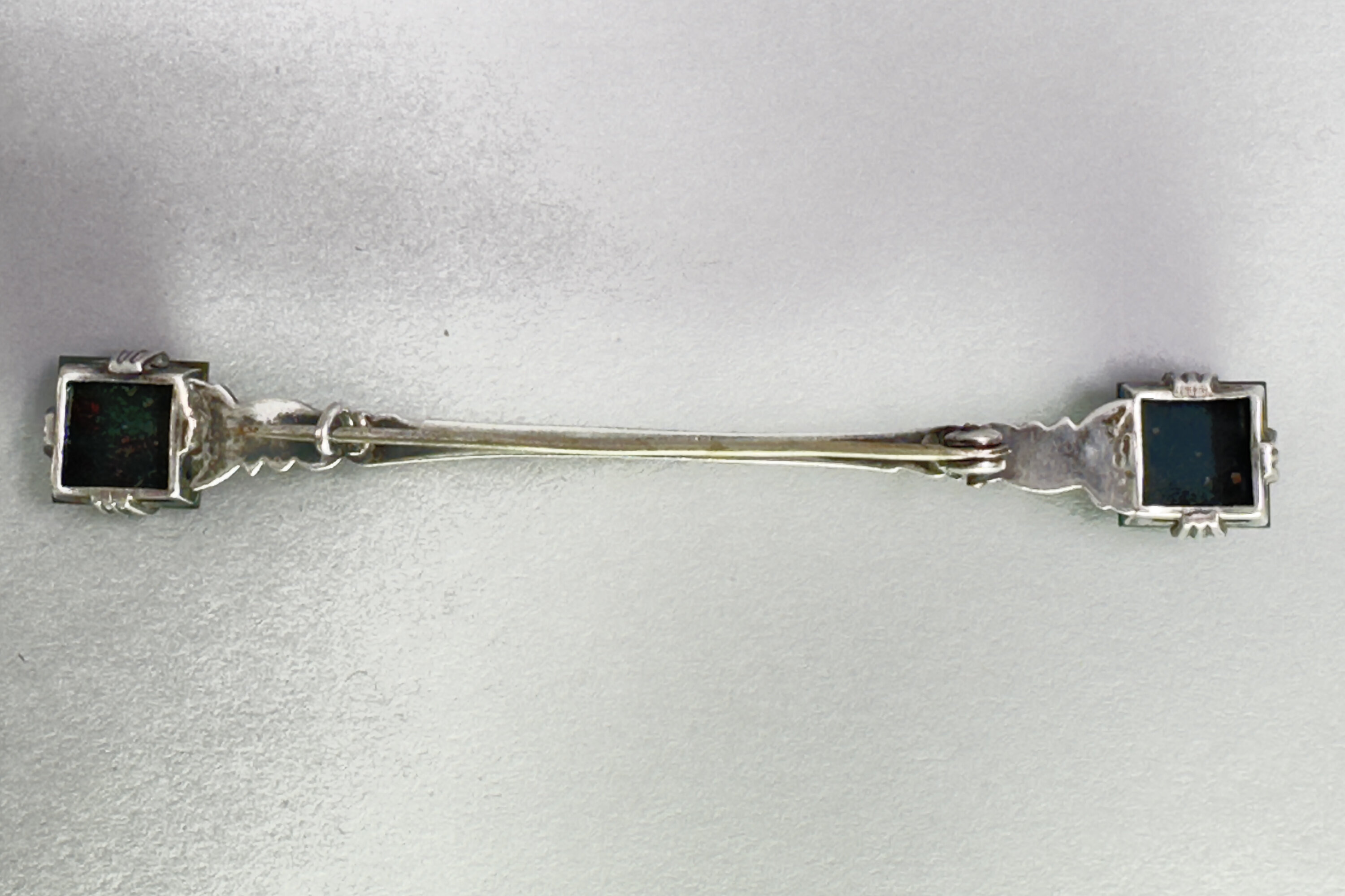 This is a very striking brooch that comprises a silver bar with two square domed Scottish bloodstone. This would have been used as part of a Scottish woman's traditional clothing to hold their cloak in place. Still lovely today! Marked Sterling.| Size: | 8.3 x 1.1 cm |