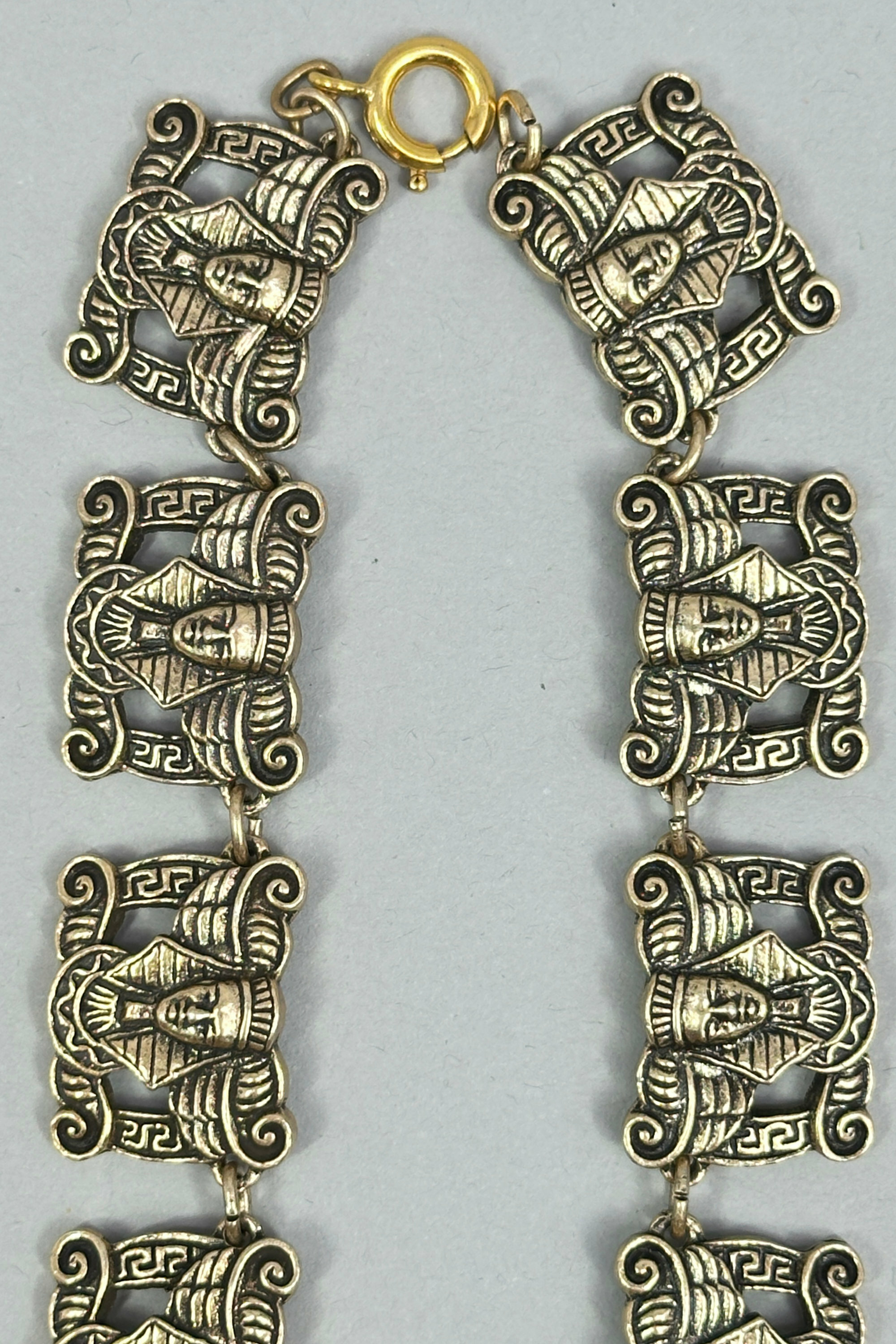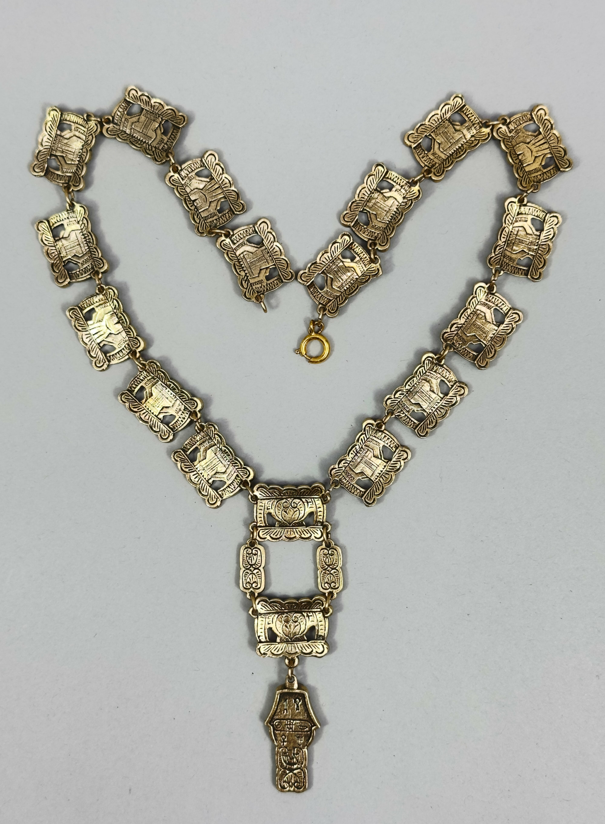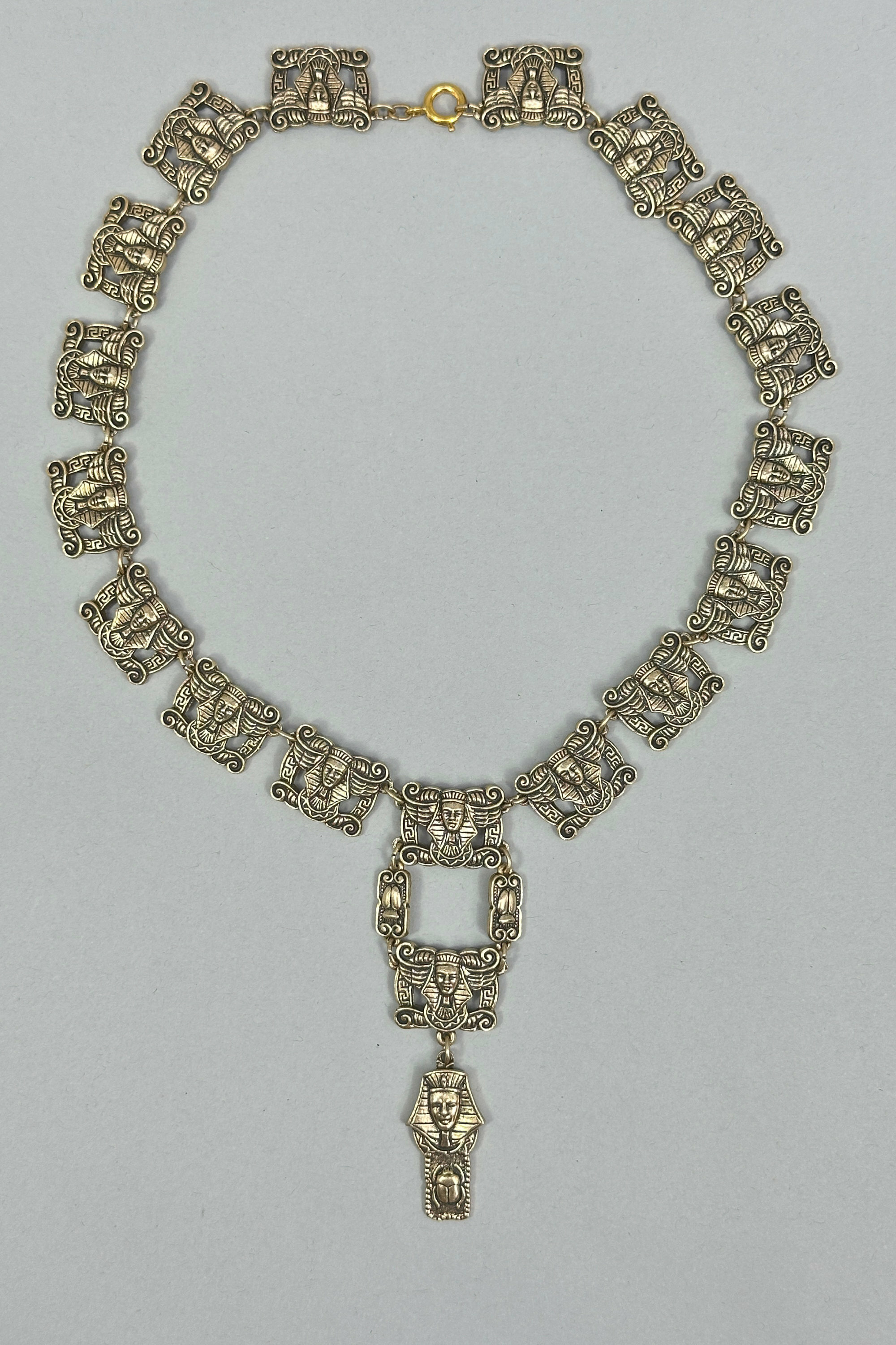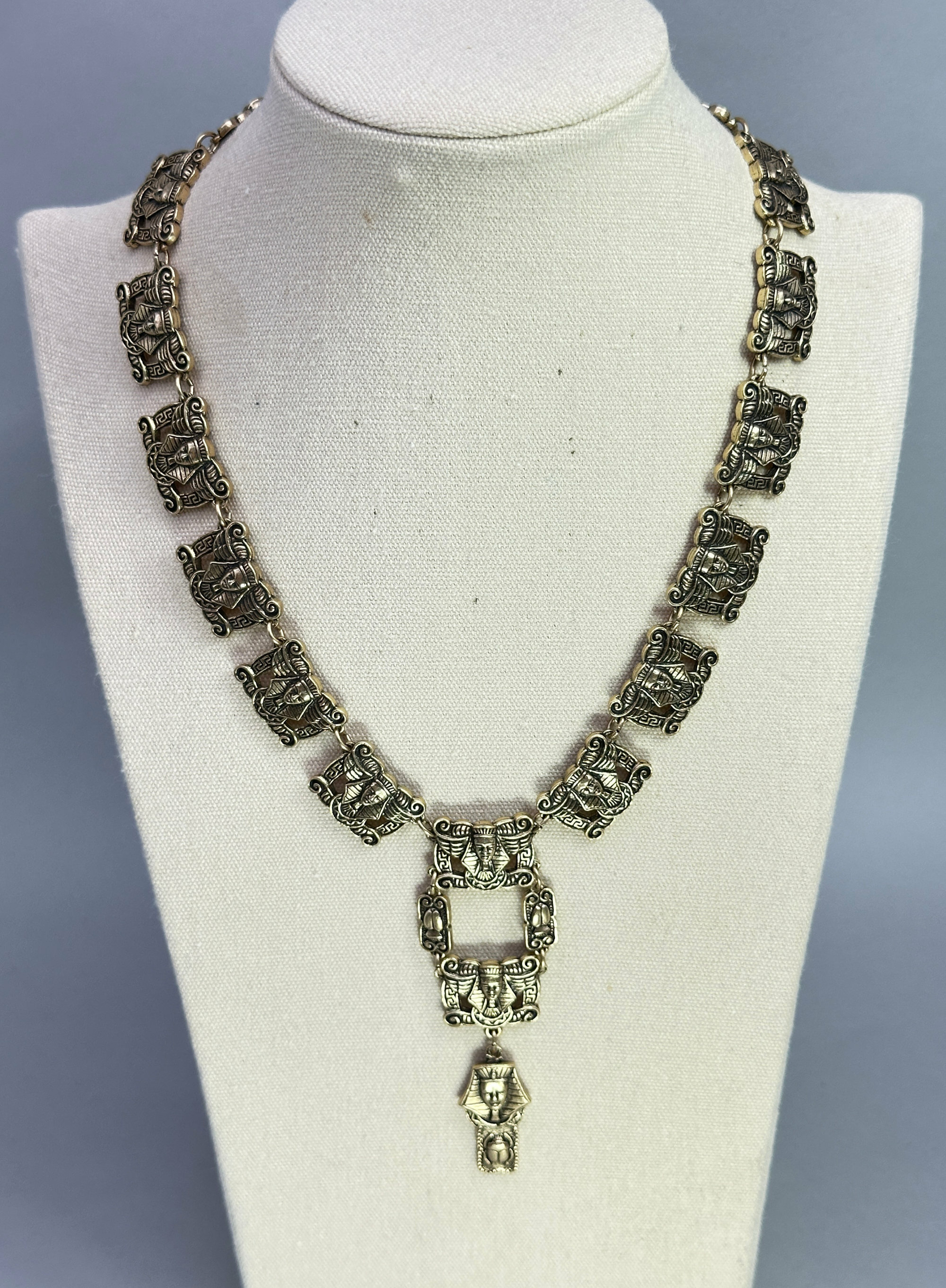 This is a a dramatic necklace in the Egyptian Revival style. It has a large central pendant with three drops with stations all the way around depicting Tutankhamun in a rather humorous way. This necklace appears to be a museum edition from possibly the British Museum or the Met in New York. The reverse of the stations and pendant are also finished with Egyptian designs. A very well thought out and finished piece.| Size: | 8.68 cm central drop, stations are 1.89 x 1.53 cm and the length is 42 cm |